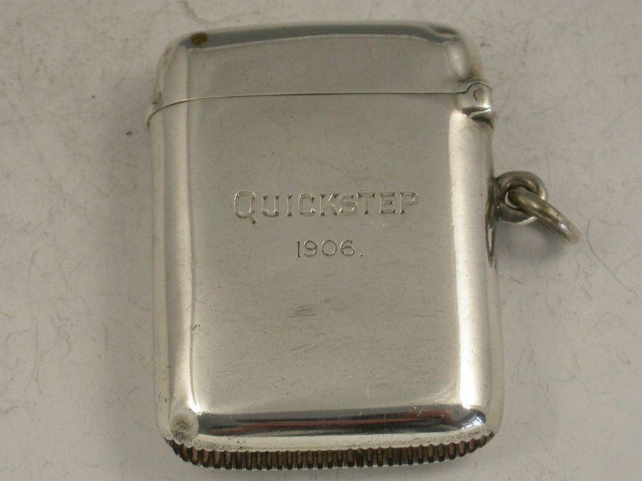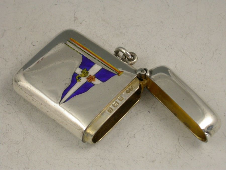 A good Edwardian silver Vesta Case of rounded rectangular form with hinged flip top cover, the face enamelled with the burgee of the Royal Western Yacht Club, the reverse engraved 'QUICKSTEP' 1906.