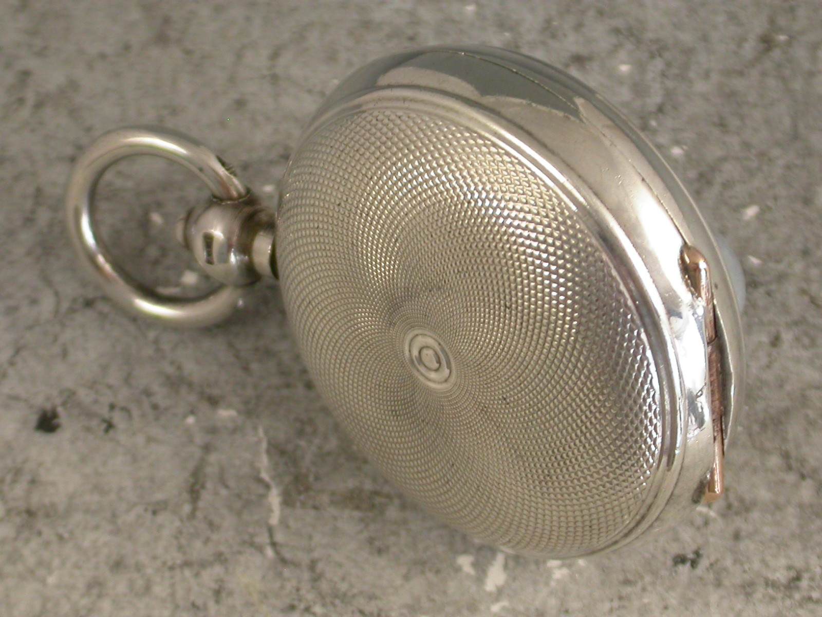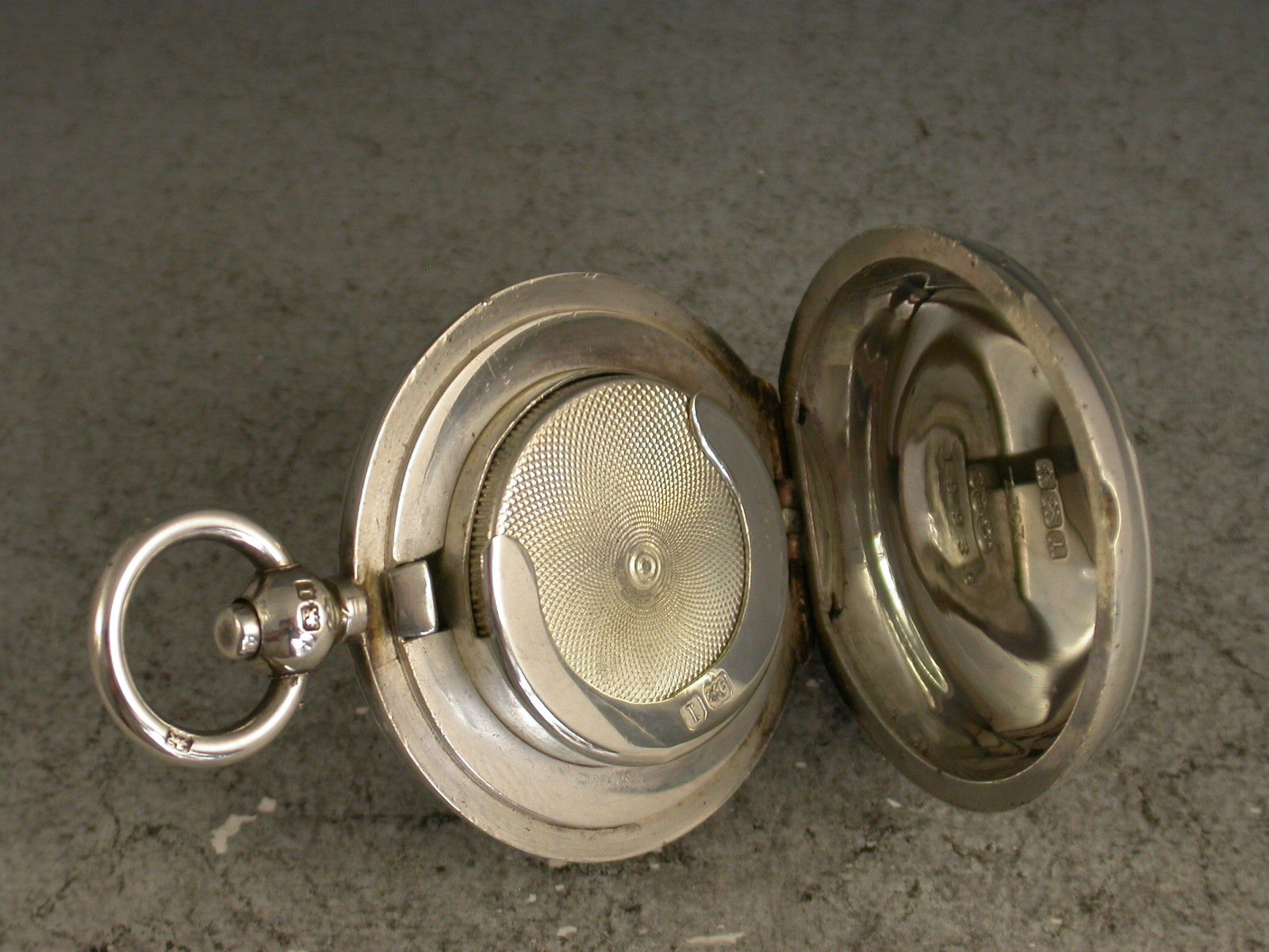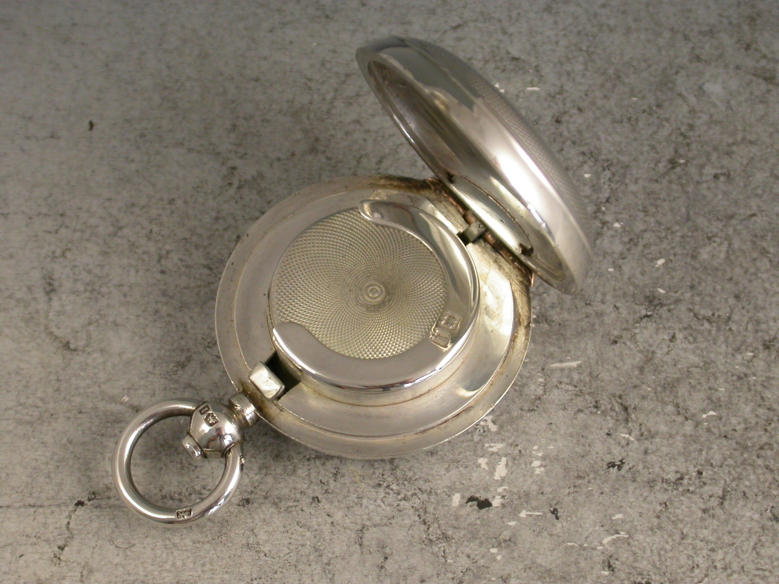 A good quality Edwardian circular silver 'fob' Sovereign Case with push button catch and swivel ring, engine turned decoration to the top and bottom. Complete with gold hinge and sprung sovereign compartment.
