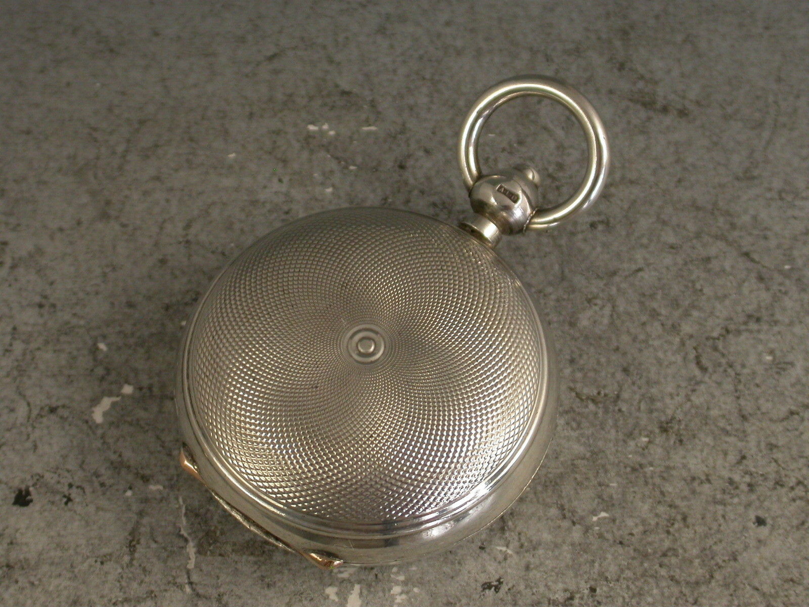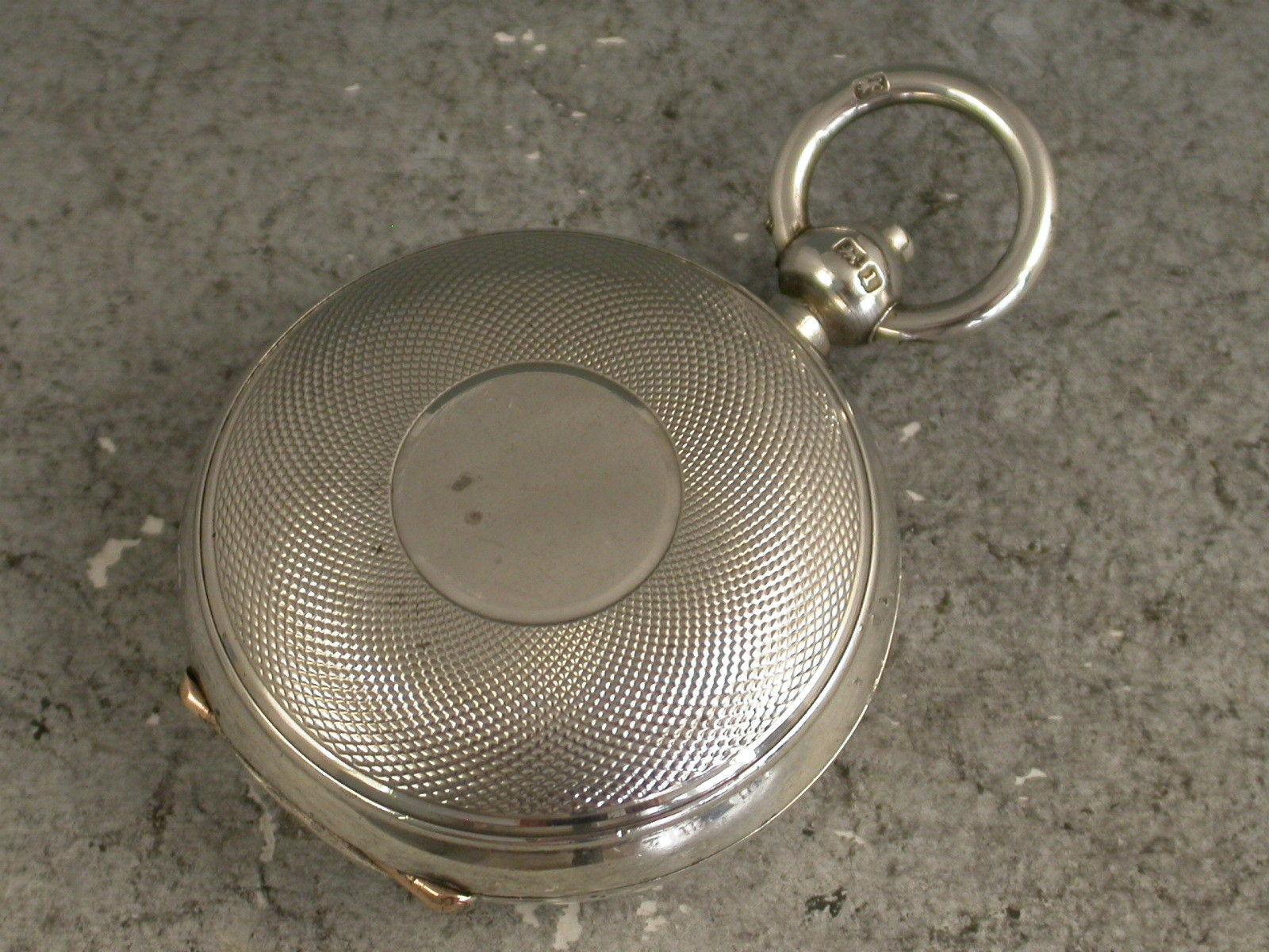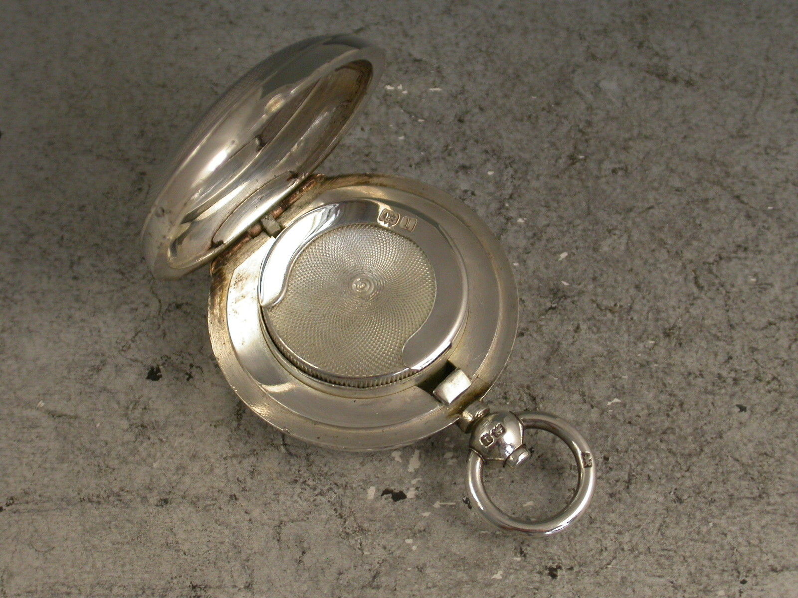 A good quality Edwardian circular silver 'fob' Sovereign Case with push button catch and swivel ring, engine turned decoration to the top and bottom. Complete with gold hinge and sprung sovereign compartment.