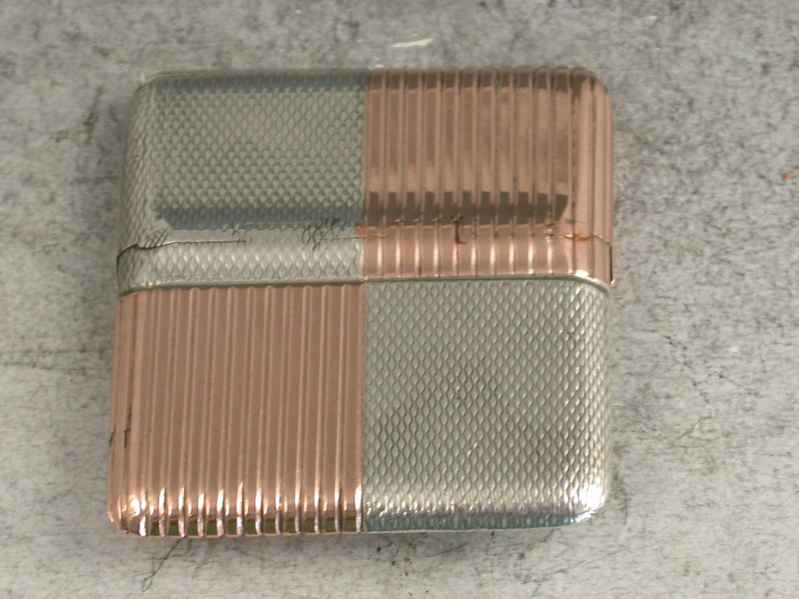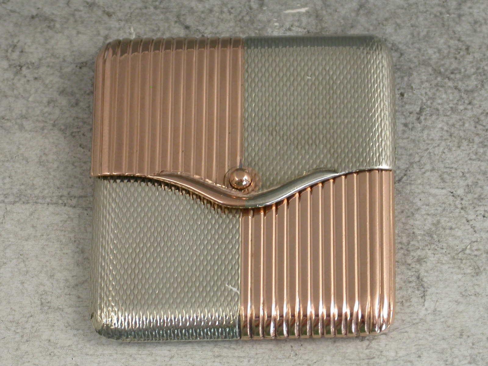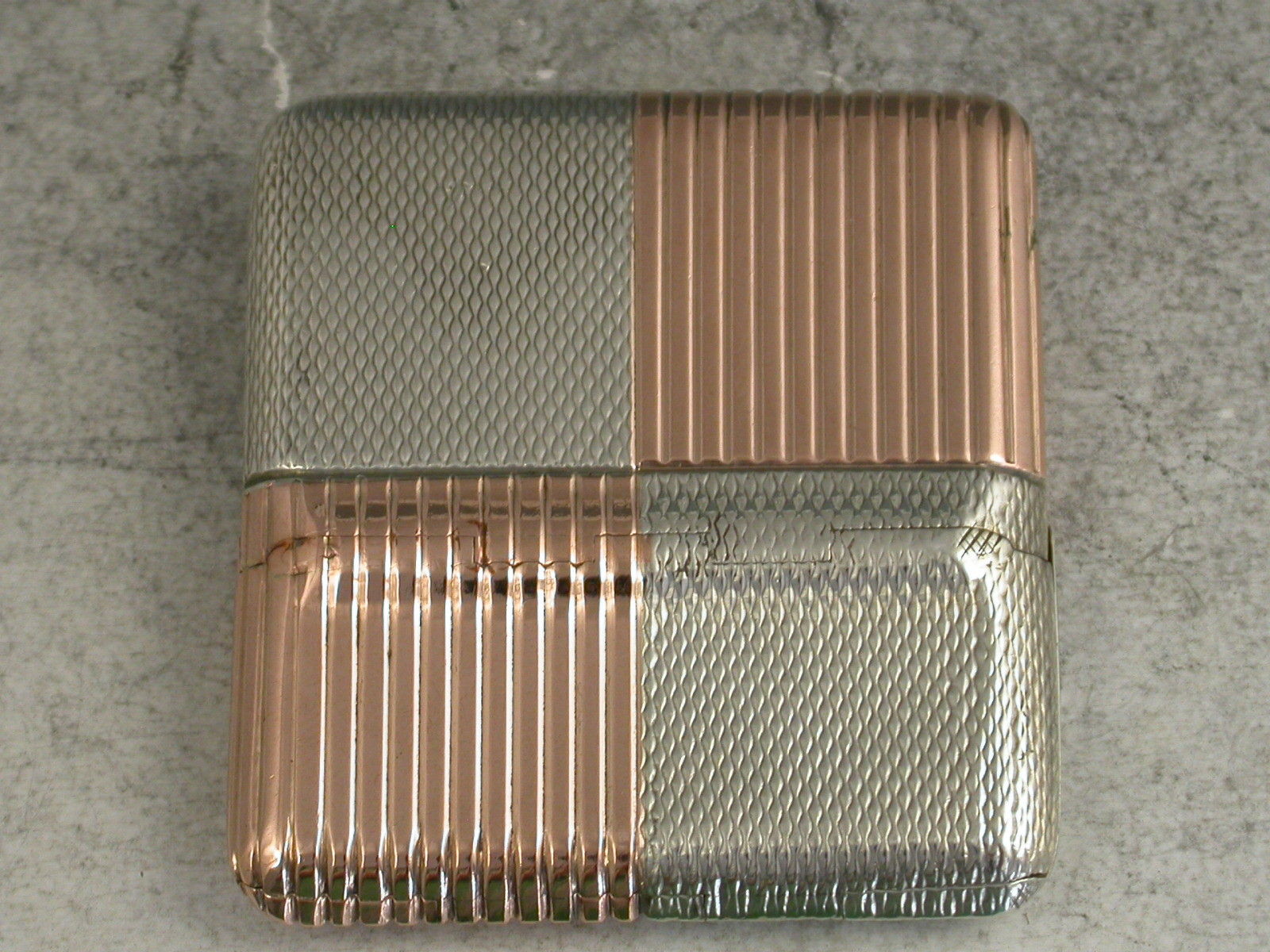 A fine quality Edwardian mixed metal rose gold and silver Vesta Case of slim square shape divided into quarters, four of engine turned silver and four of reeded rose gold, with an unusual and fine quality double hinged opening mechanism.