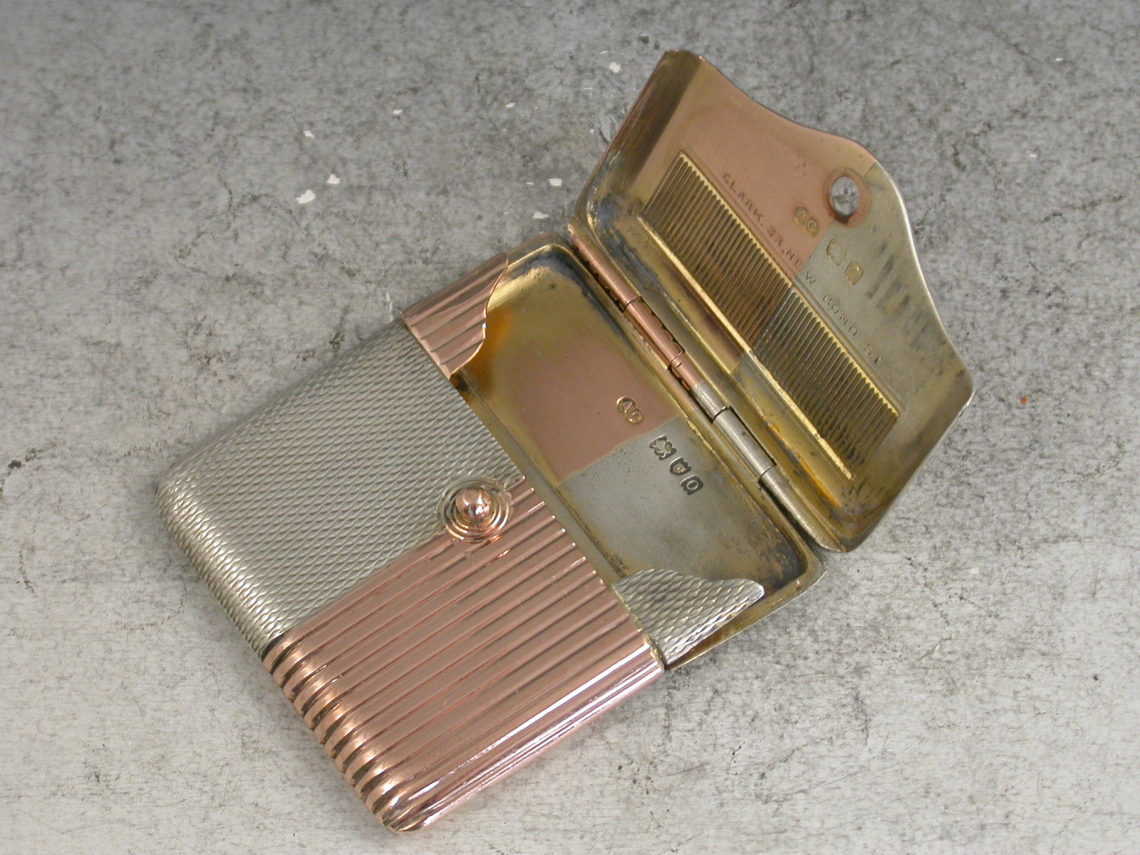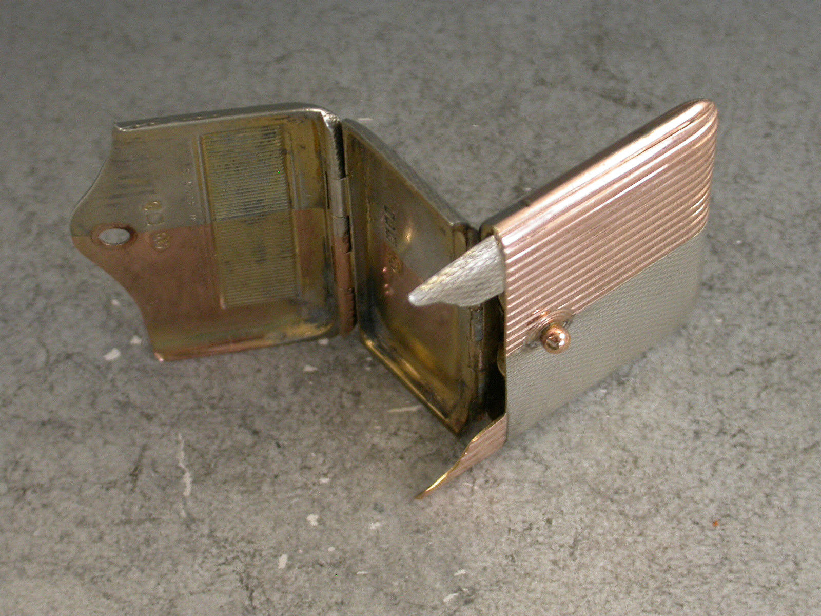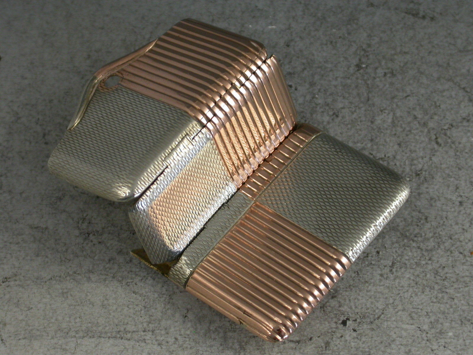 A fine quality Edwardian mixed metal rose gold and silver Vesta Case of slim square shape divided into quarters, four of engine turned silver and four of reeded rose gold, with an unusual and fine quality double hinged opening mechanism.