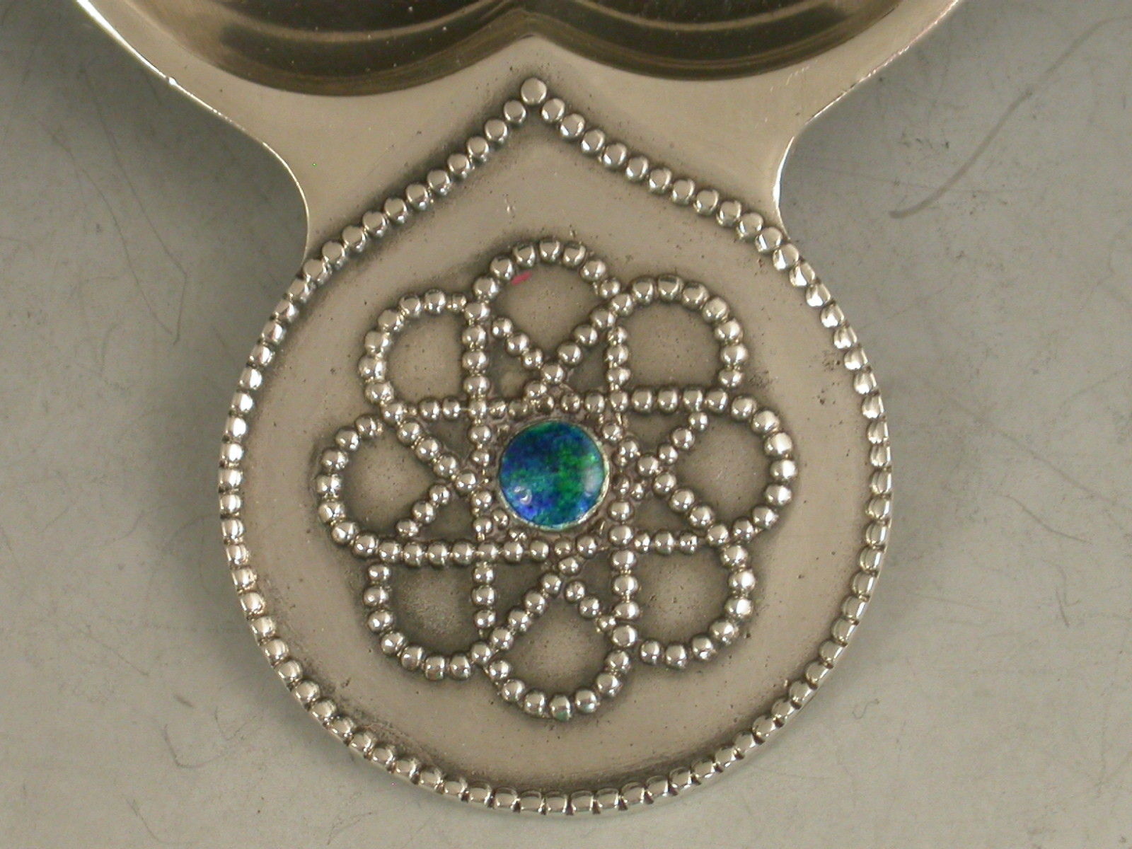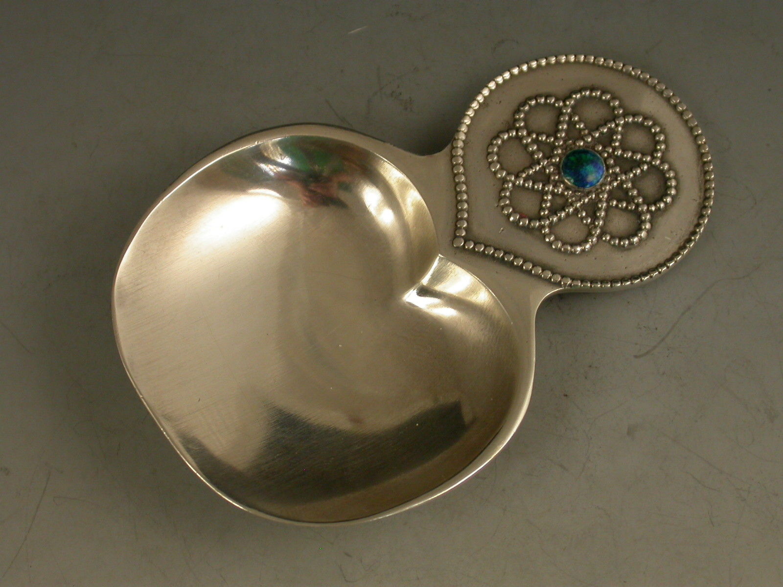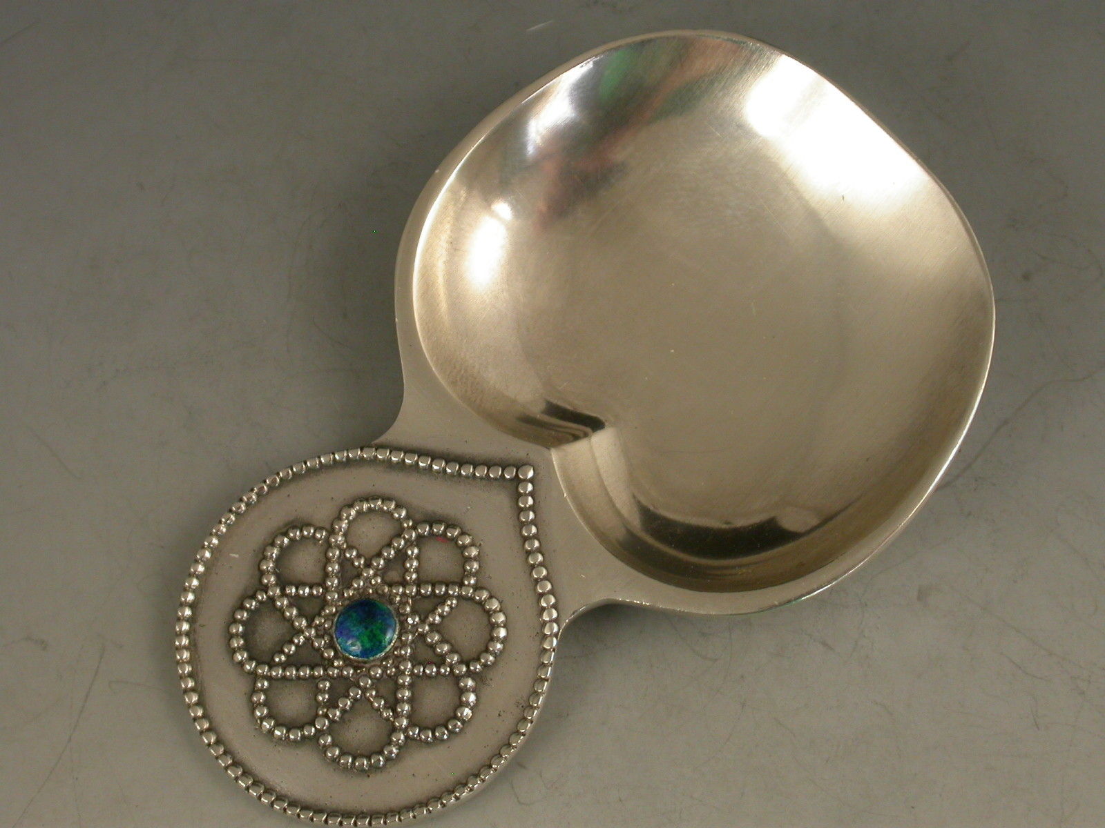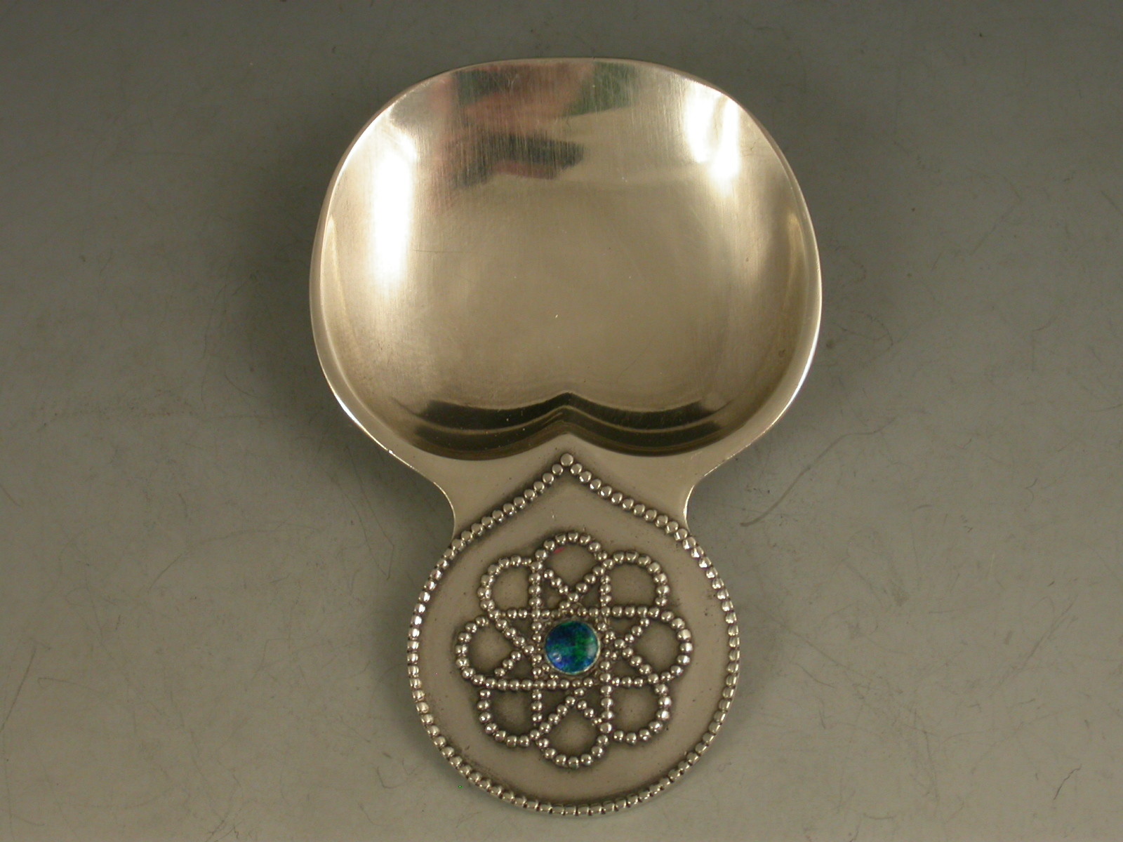 A good early 20th century silver Caddy Spoon made in the Arts & Crafts style with broad 'cheeked' bowl, the circular handle with beaded border and Celtic knot decoration centered by a blue/green enamel boss.