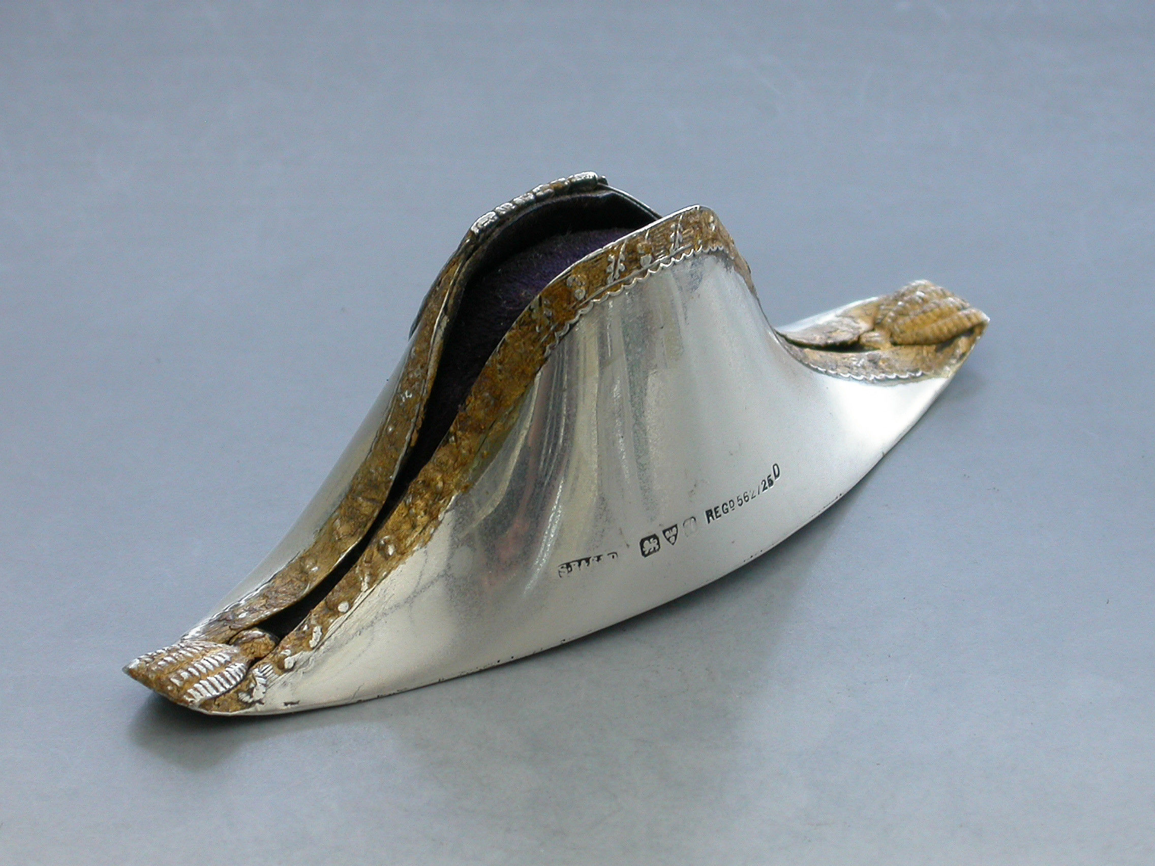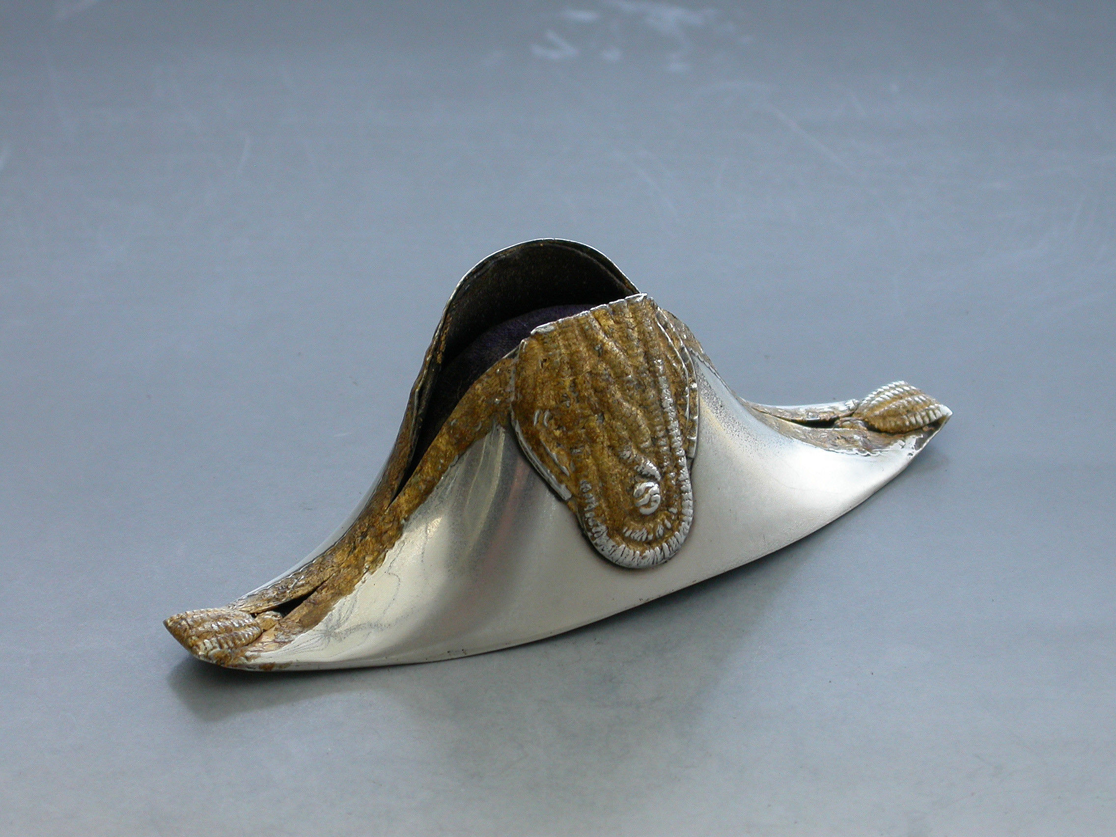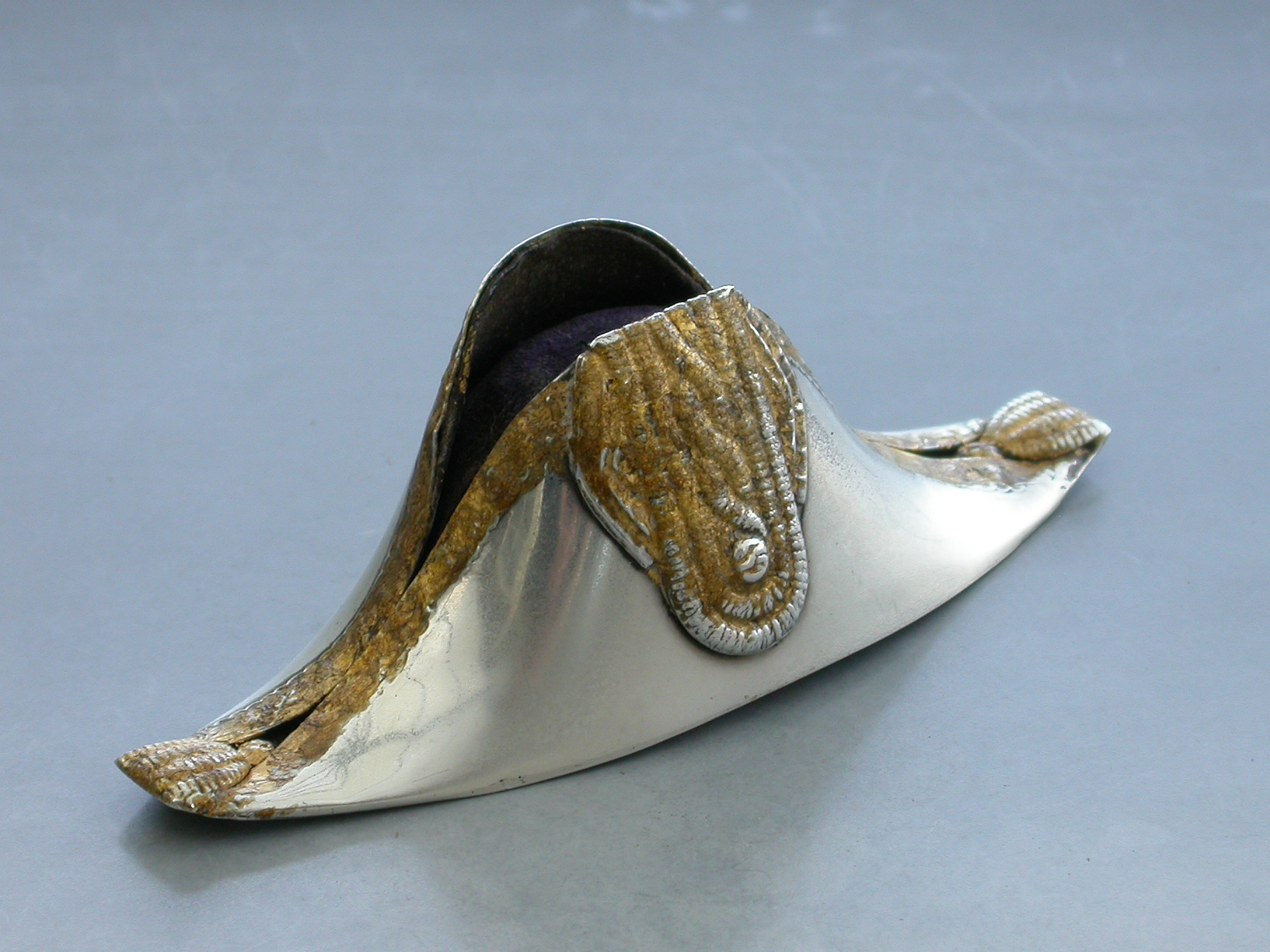 An Edwardian novelty silver Pin Cushion made in the form of a Bicorn or Cocked Hat, the raised decoration highlighted with gold leaf to simulate the original lace and tassel adornments.