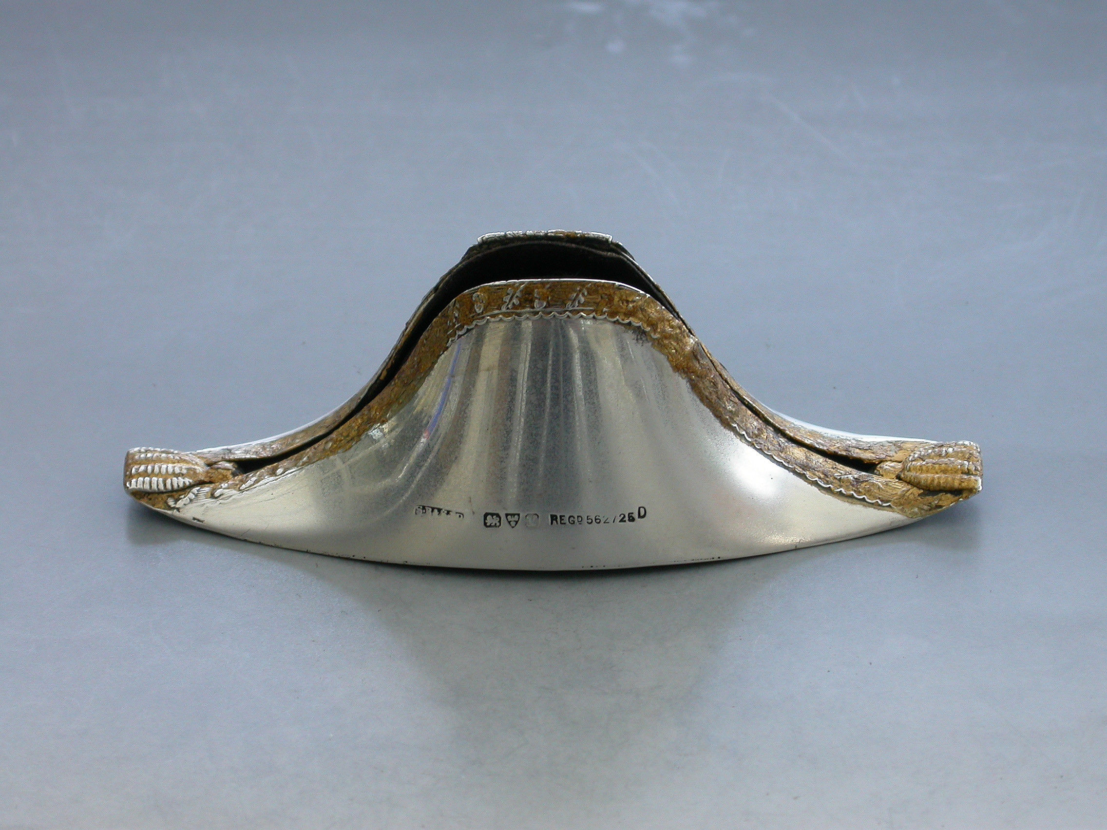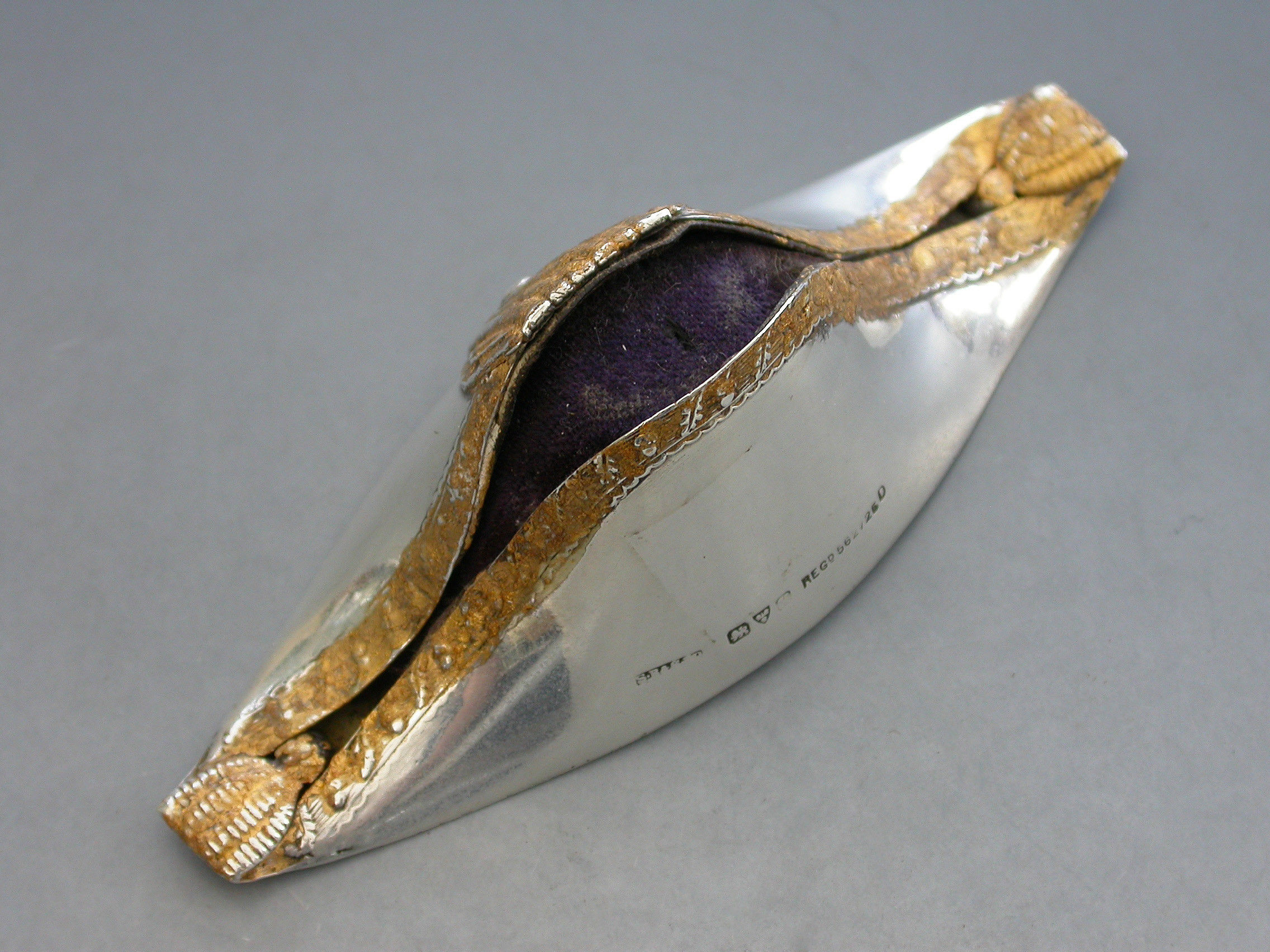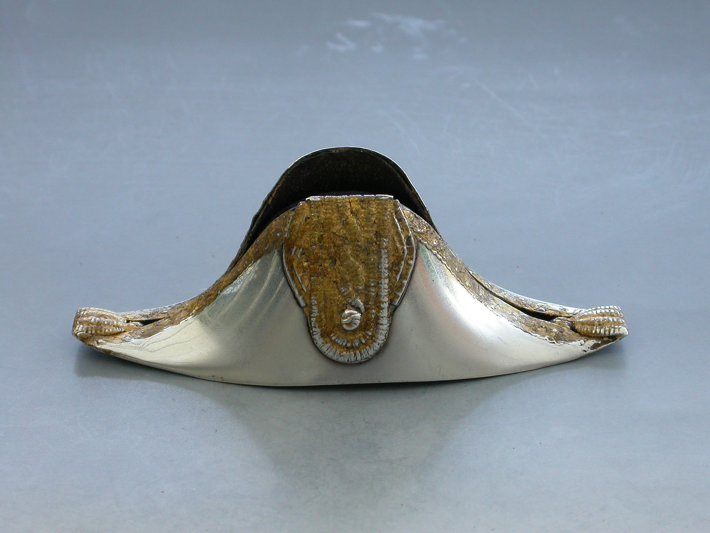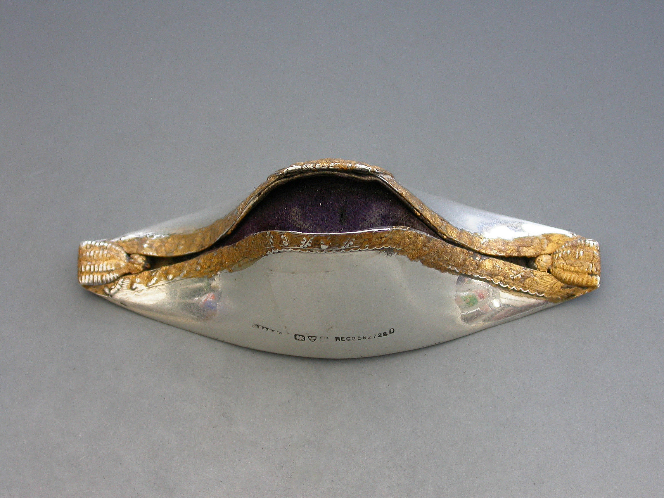 An Edwardian novelty silver Pin Cushion made in the form of a Bicorn or Cocked Hat, the raised decoration highlighted with gold leaf to simulate the original lace and tassel adornments.