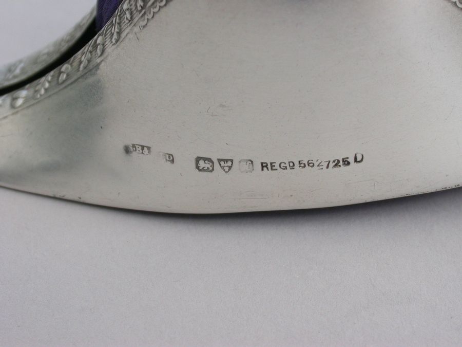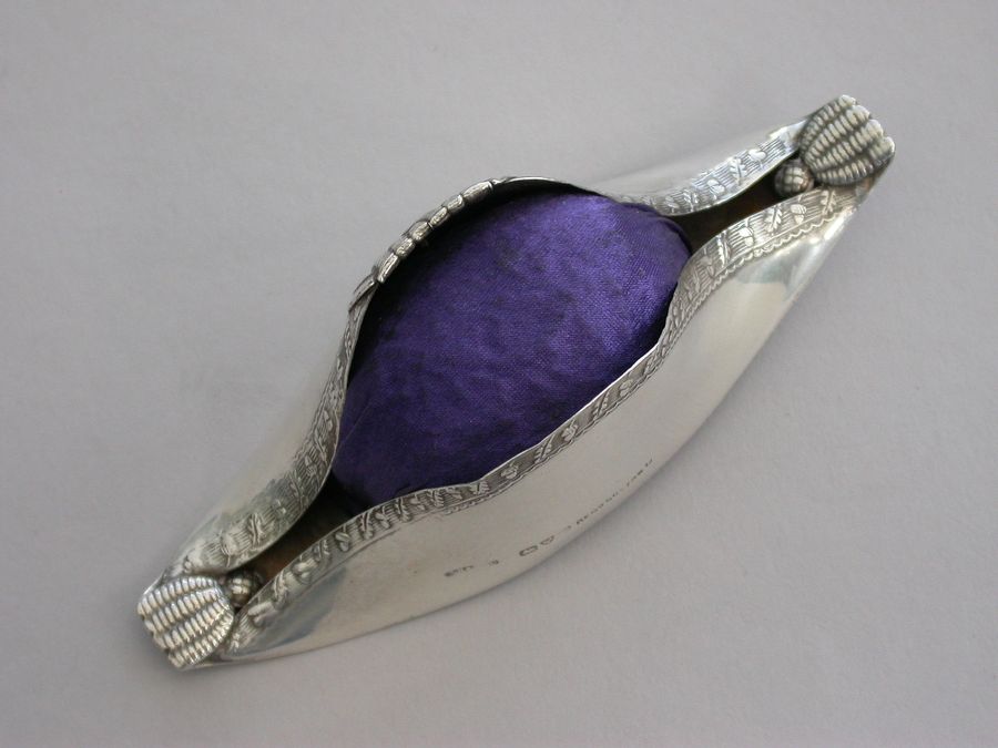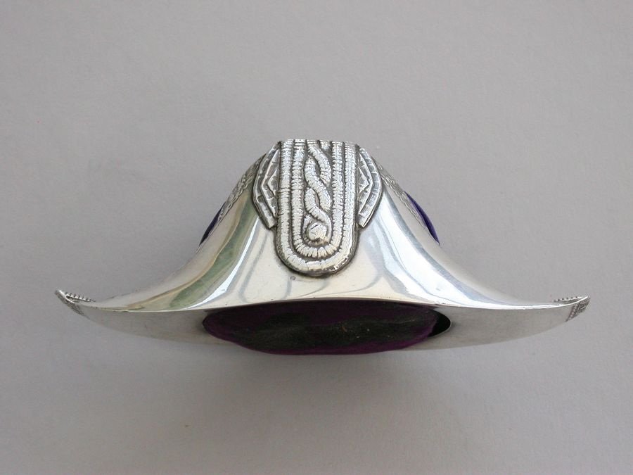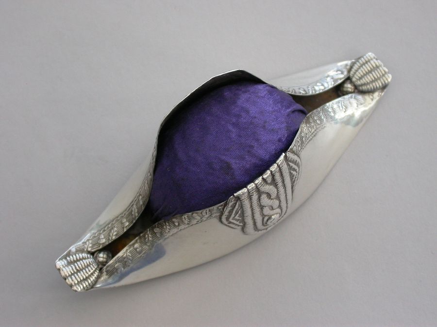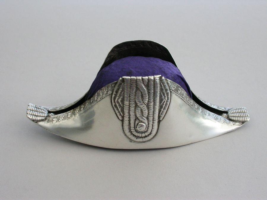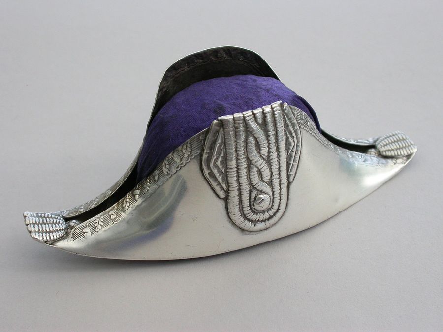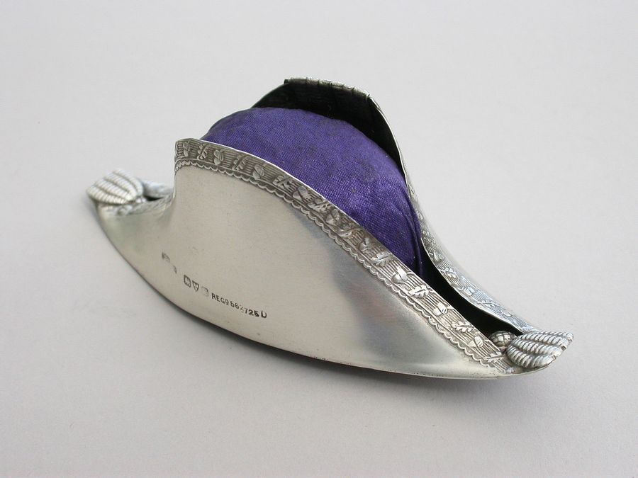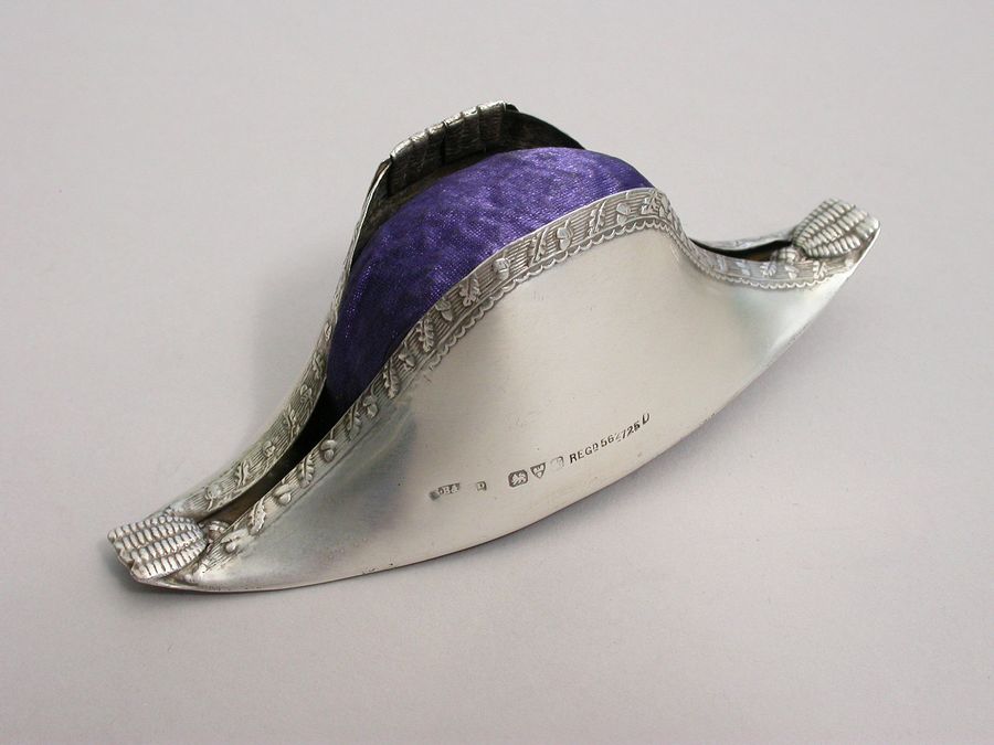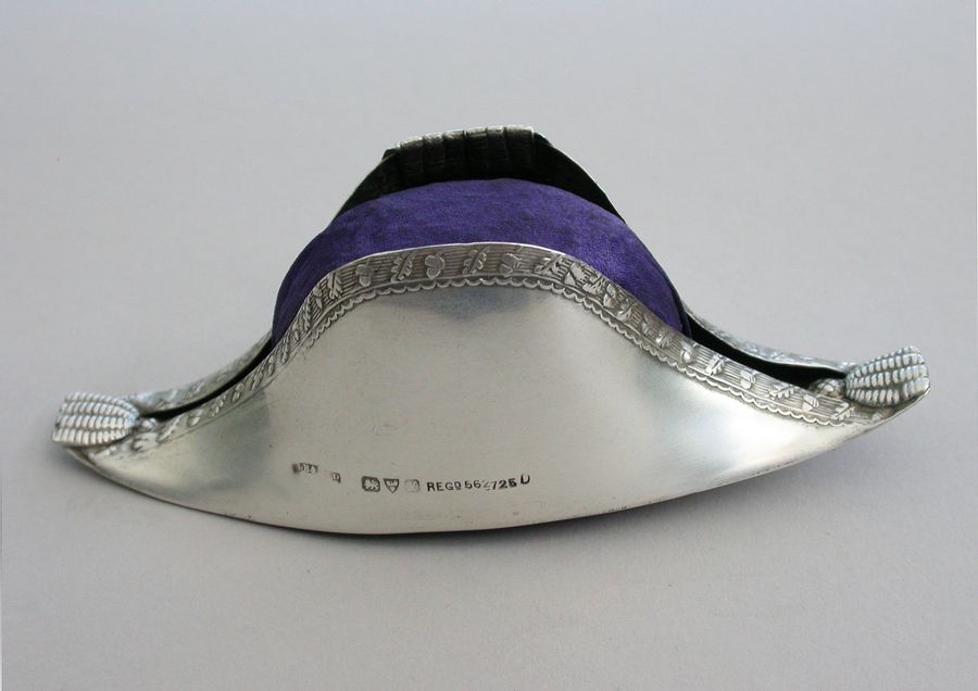 An Edwardian novelty silver Pin Cushion made in the form of a Bicorn or Cocked Hat (as worn by George V, Admiral of the Fleet), raised decoration to simulate the original lace and tassel adornments.
