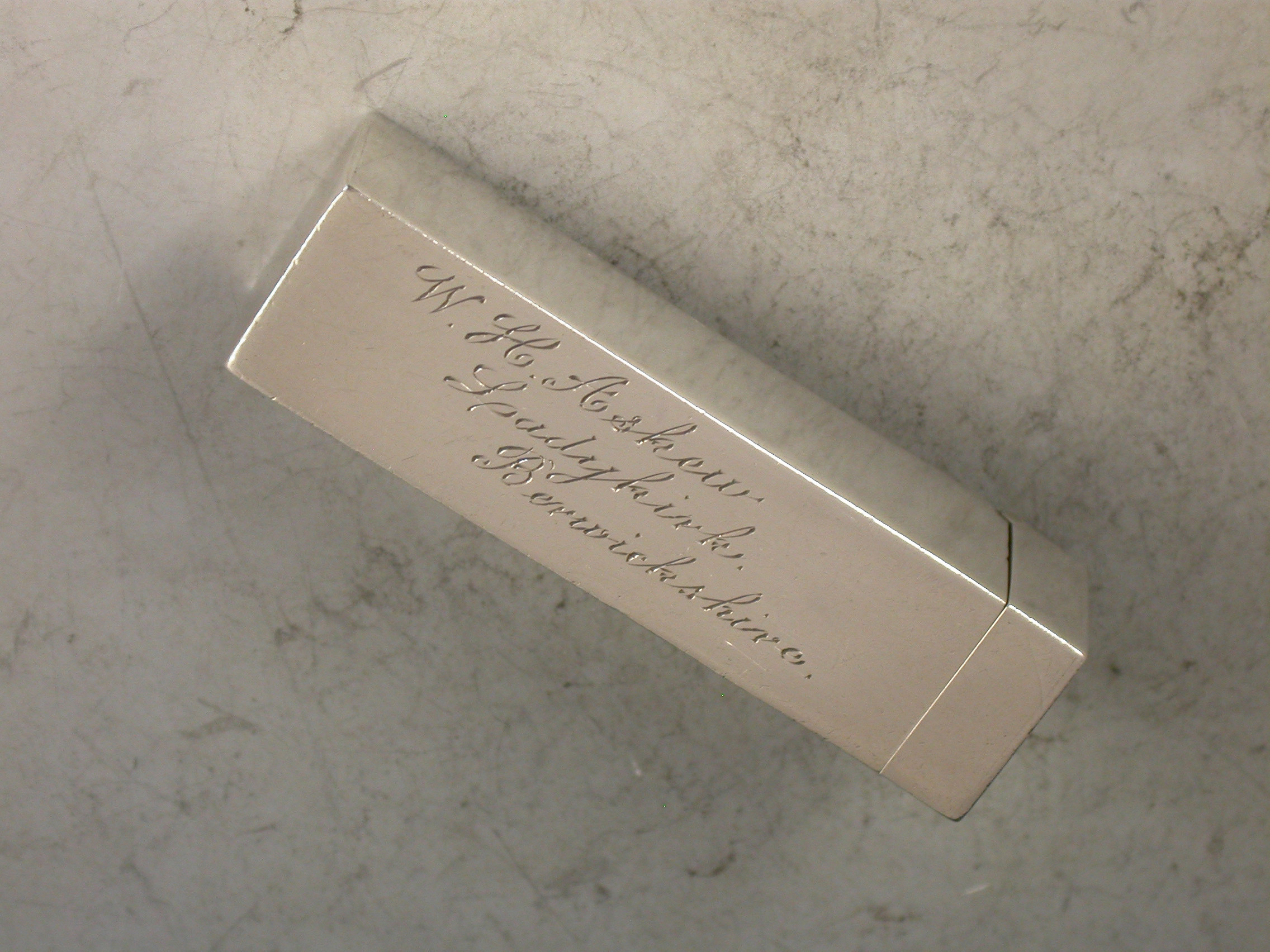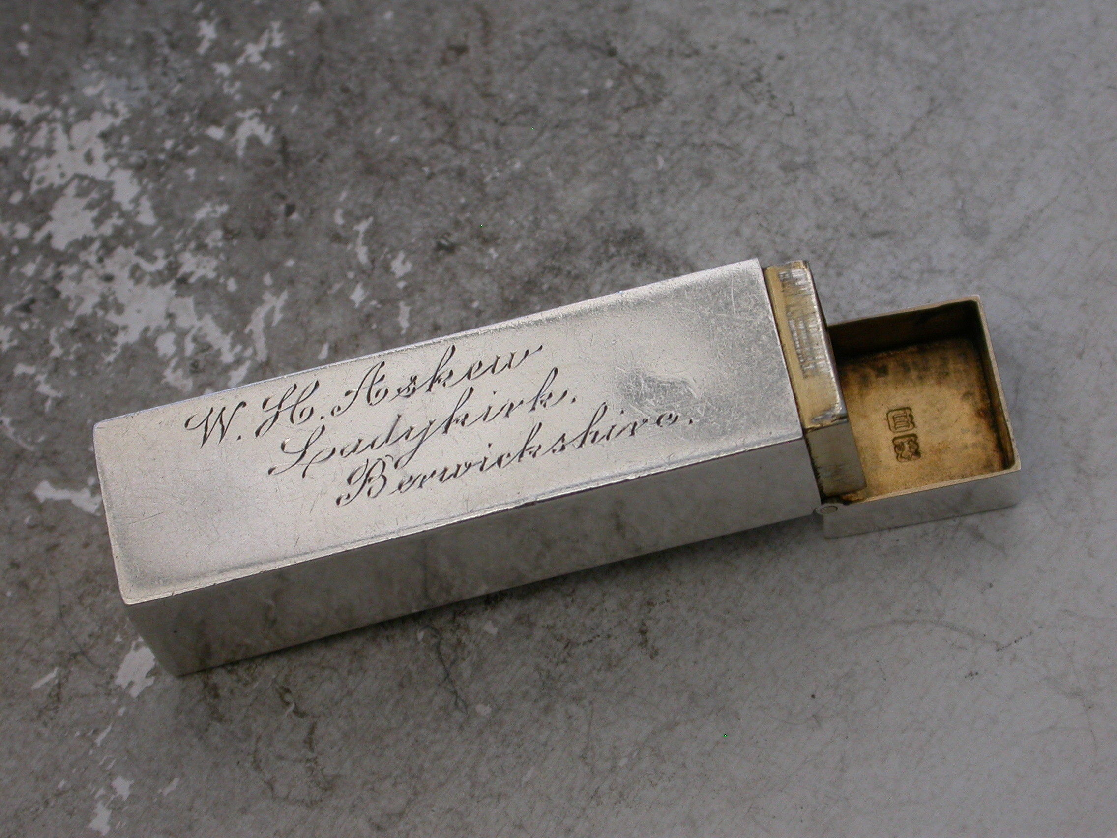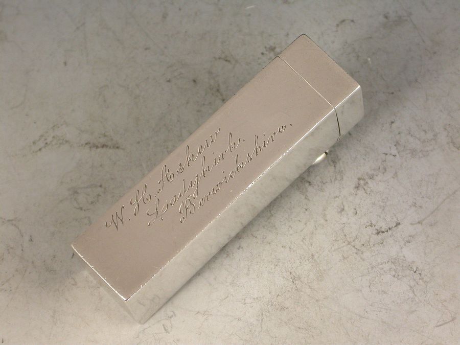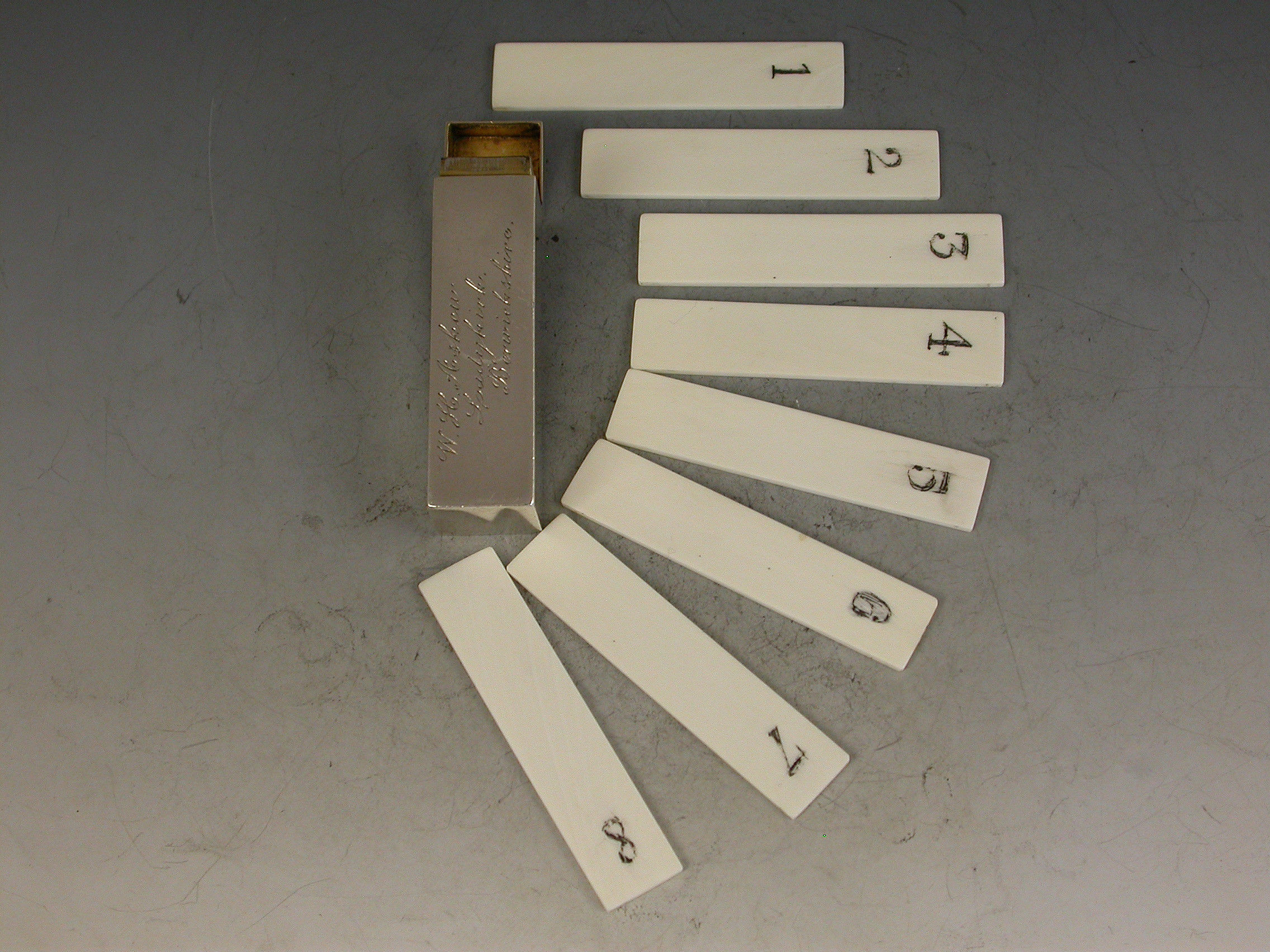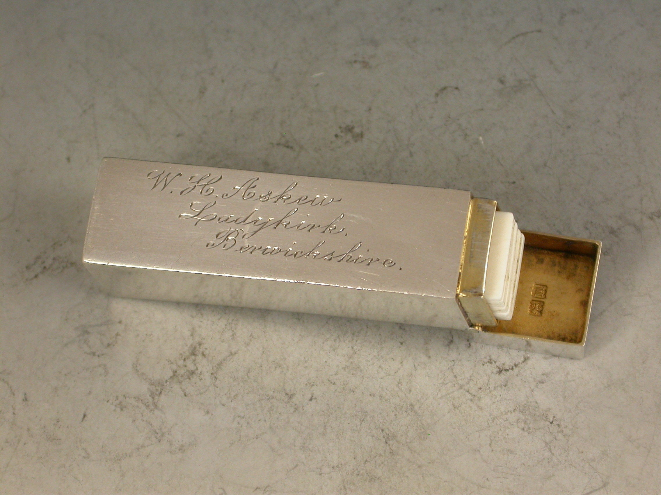 A good Edwardian silver Butt Marker of plain rectangular form with hinged lid and attached suspension ring, the silver gilt interior containing 8 numbered pegs. The case engraved for W.H.Askew, the Laird of the Ladykirk Estate, Berwickshire, Scotland.