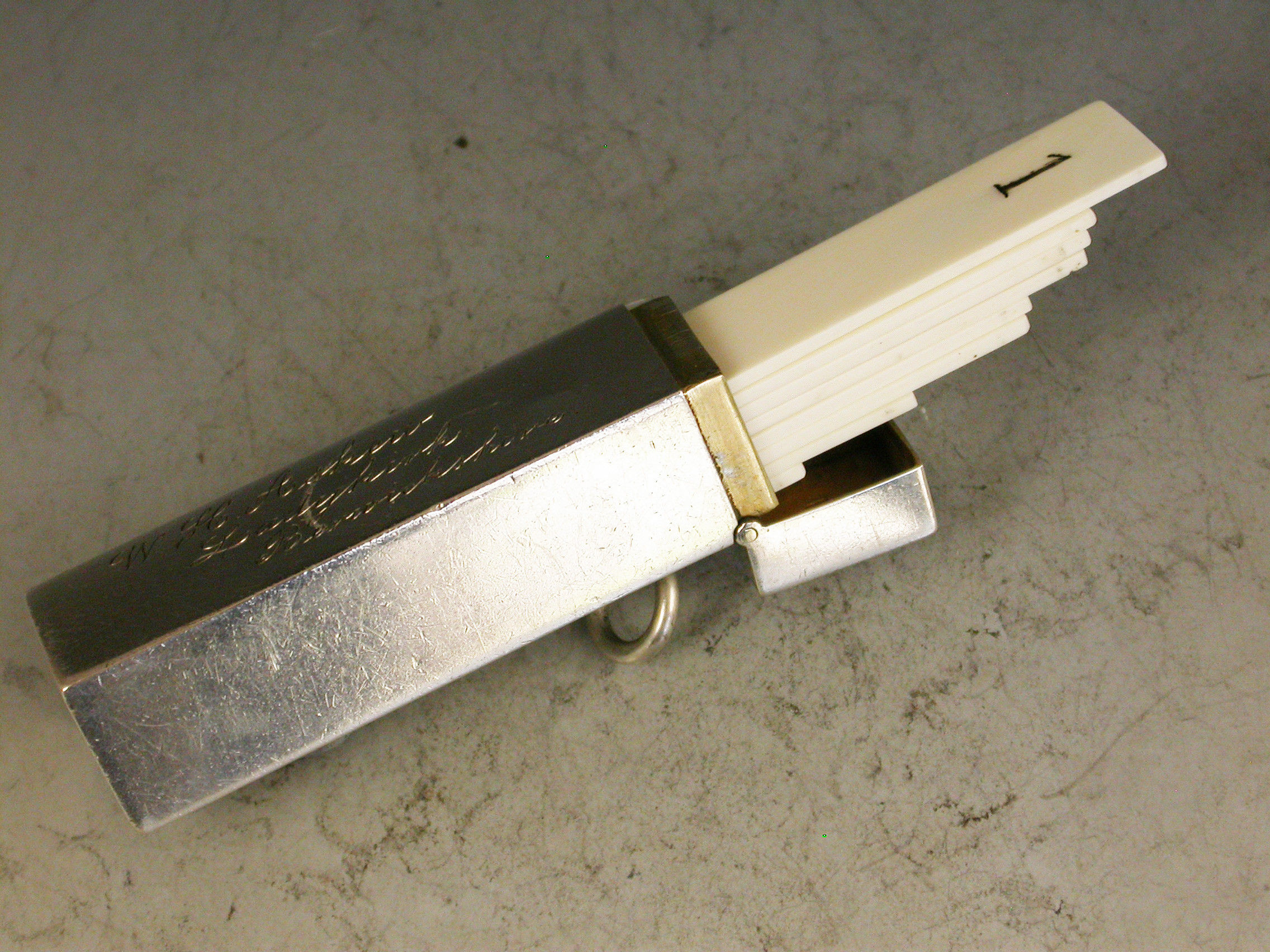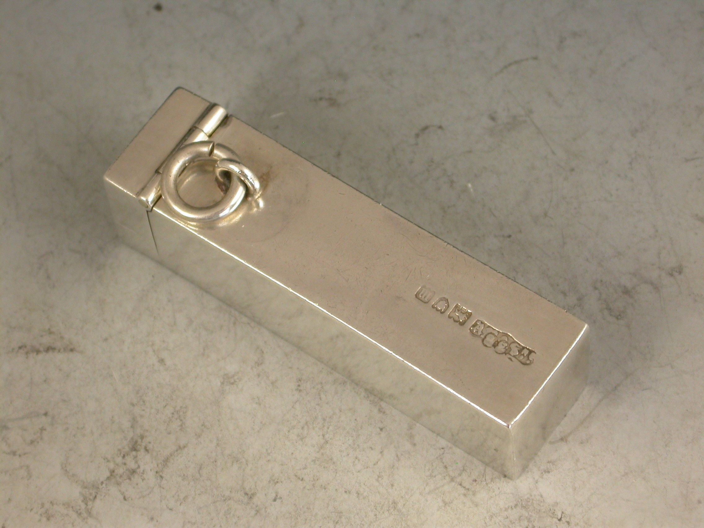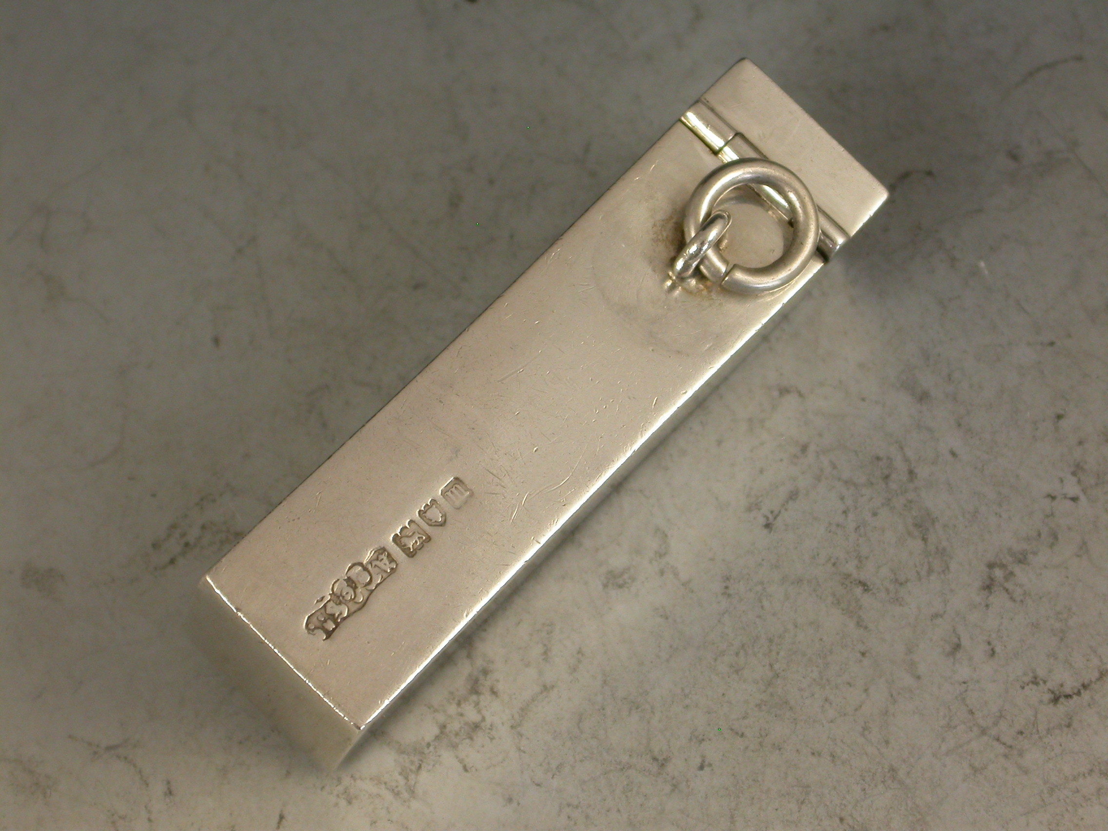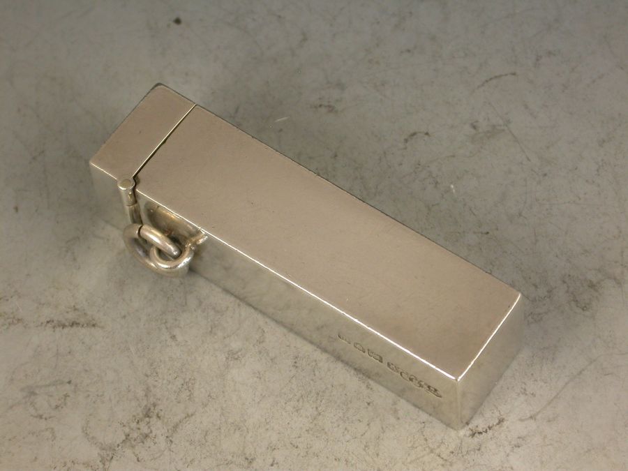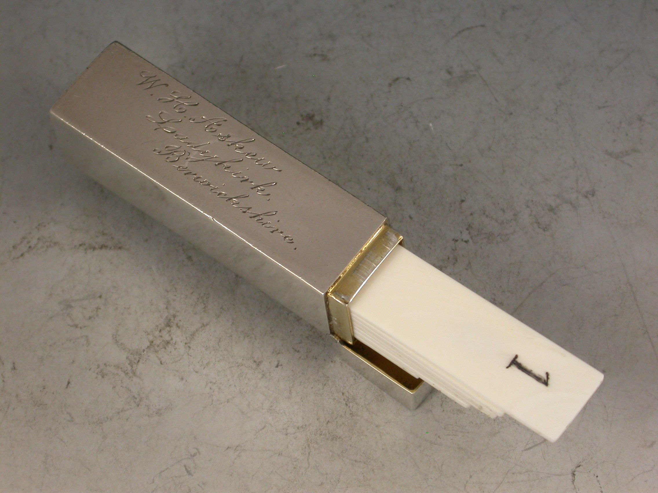 A good Edwardian silver Butt Marker of plain rectangular form with hinged lid and attached suspension ring, the silver gilt interior containing 8 numbered pegs. The case engraved for W.H.Askew, the Laird of the Ladykirk Estate, Berwickshire, Scotland.