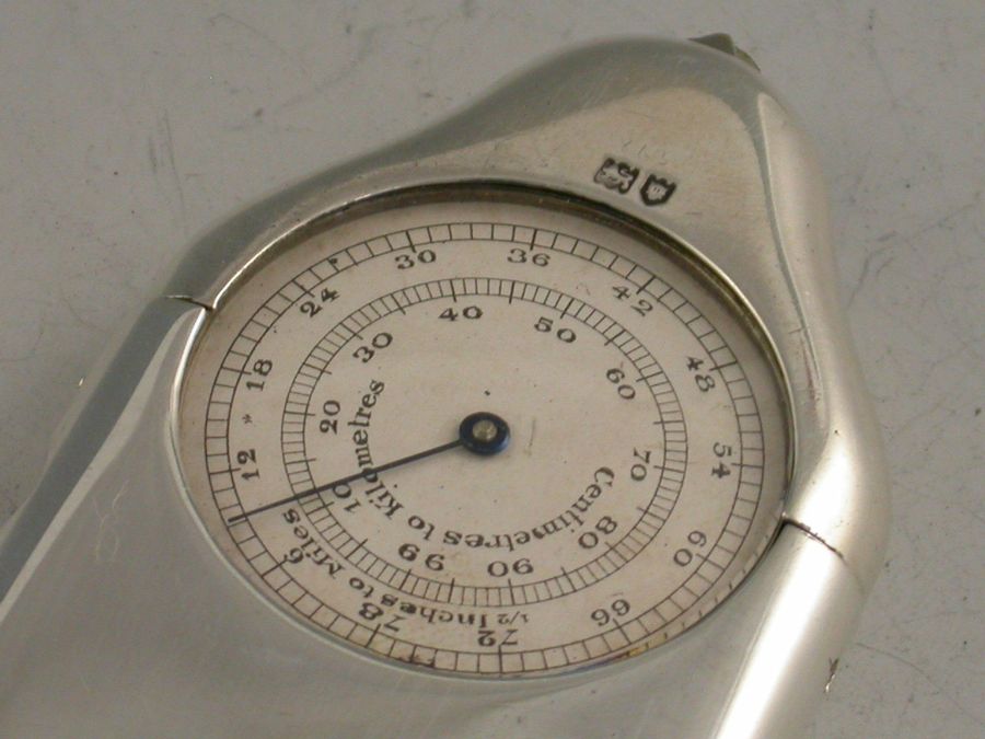 A rare Edwardian silver combination Vesta Case, Cigar Cutter and Map Measuring Tool with sprung hinged lid and attached suspension ring, a circular enamelled dial to each side covered with curved glass lenses.