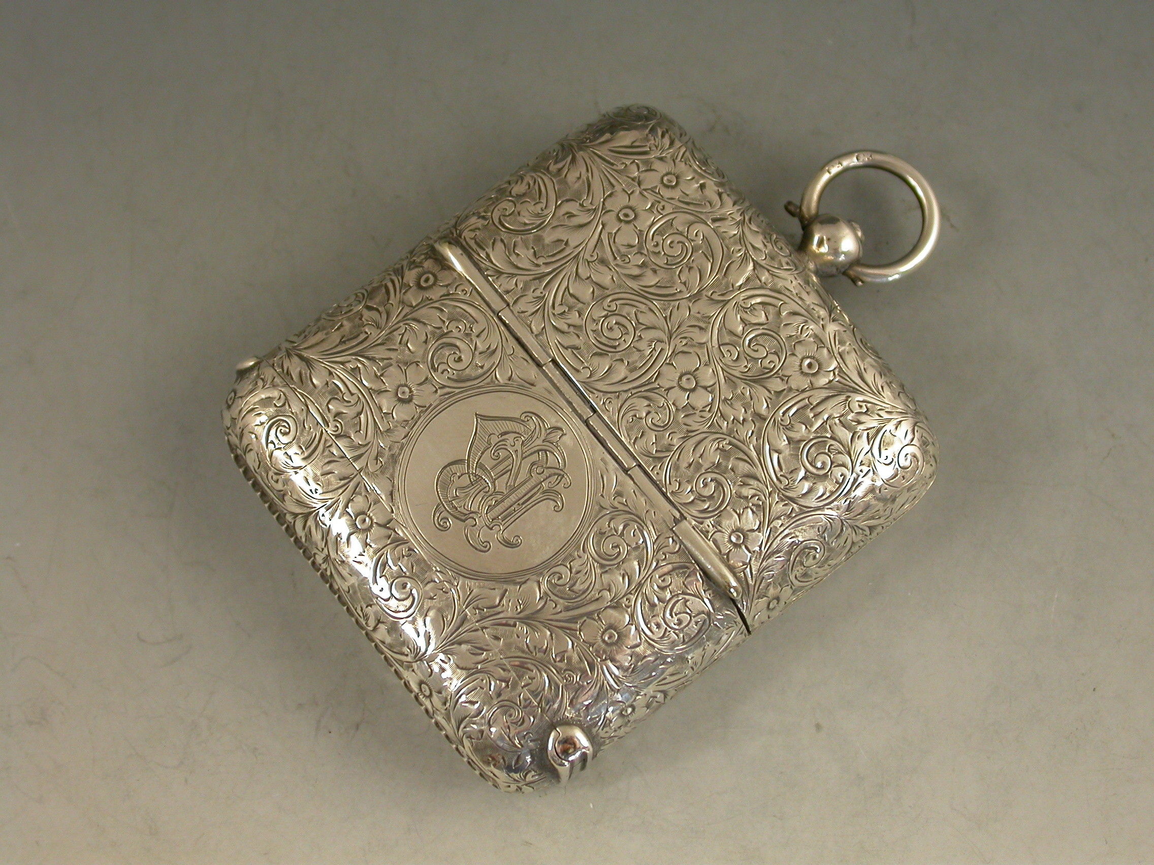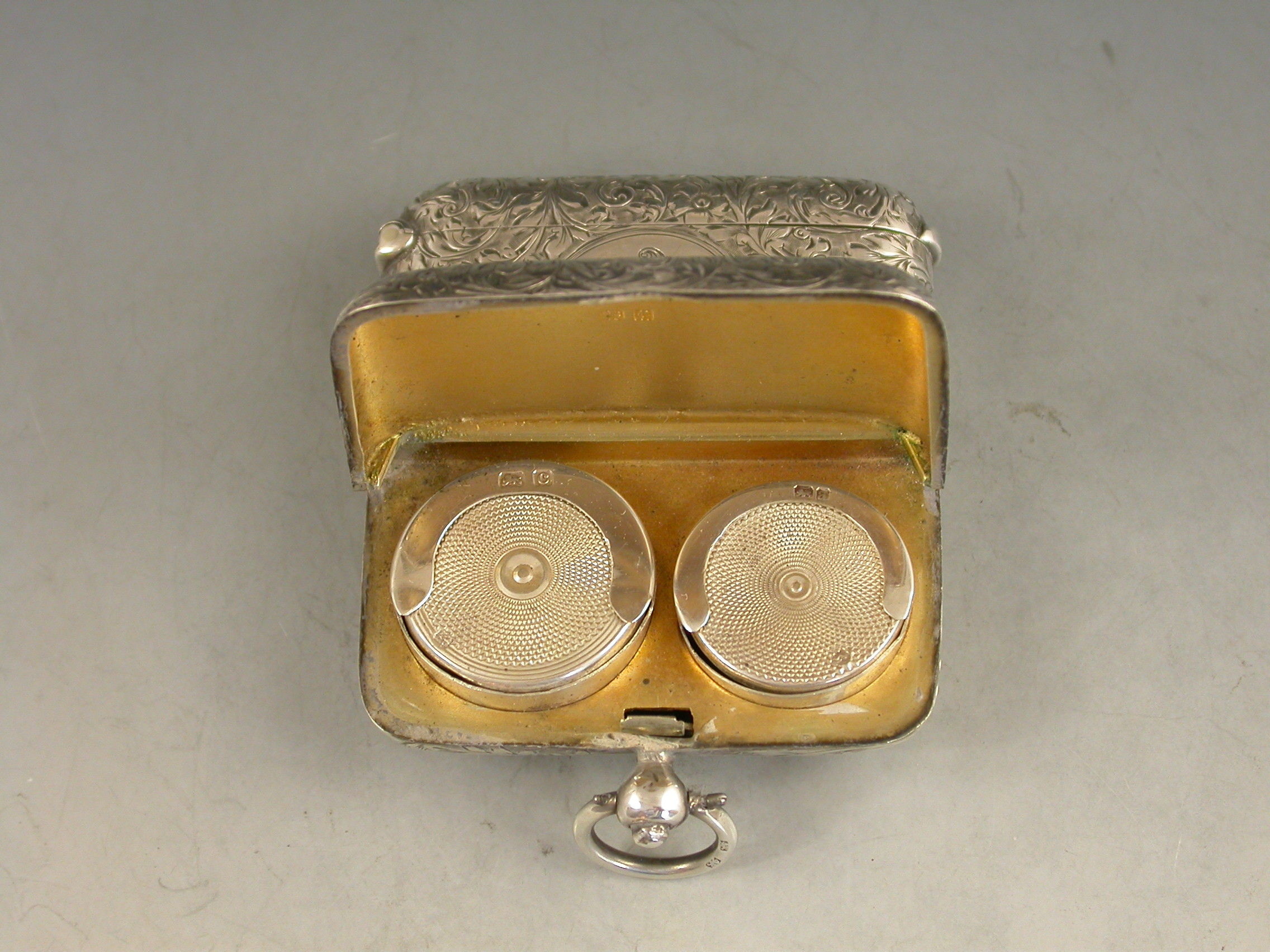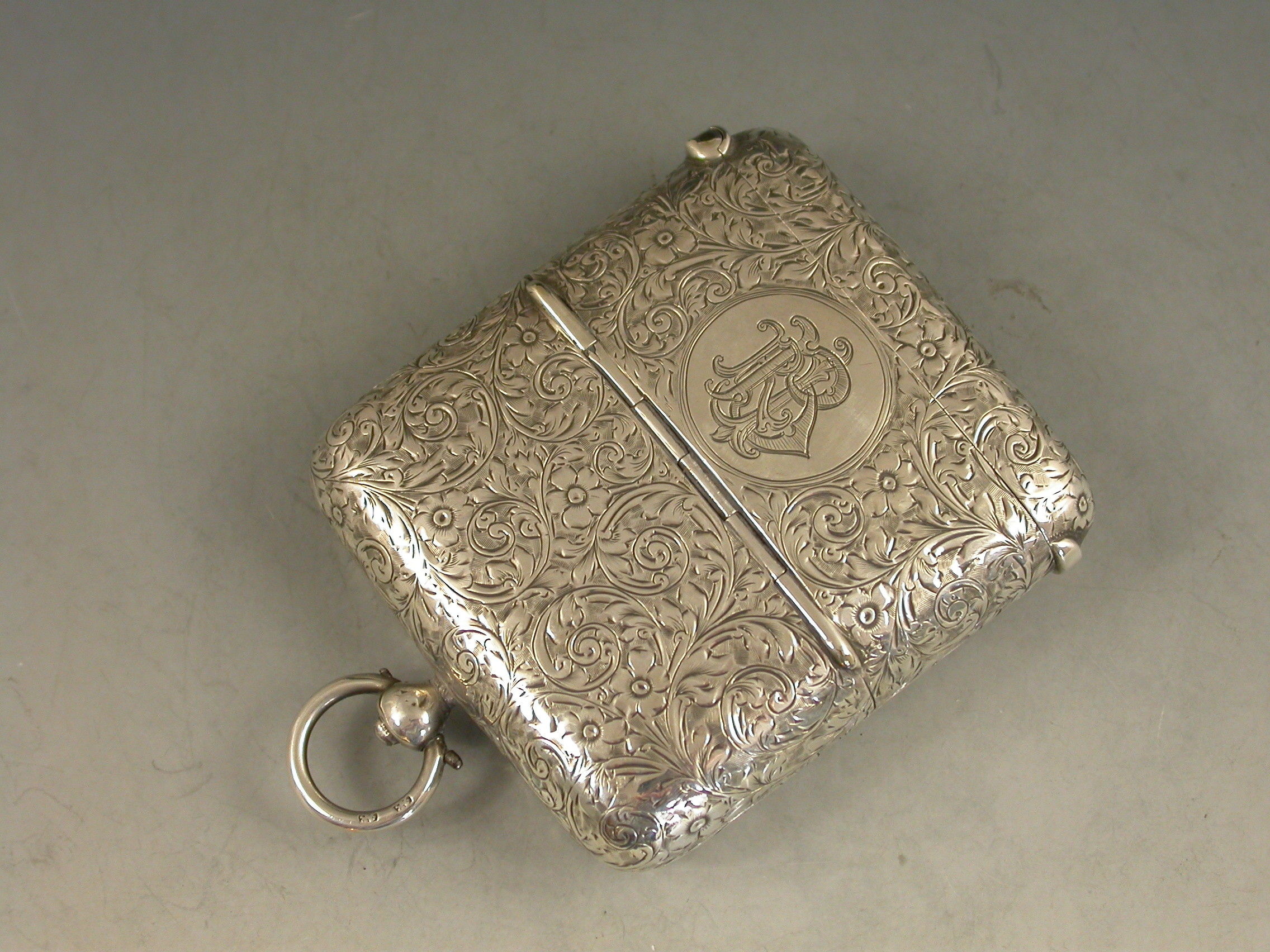 A good Edwardian silver combined double Sovereign and Vesta Case of large rounded rectangular form with all over foliate scroll engraved decoration, a circular cartouche engraved with contemporary initials. The two sprung hinges opening to reveal silver gilt interiors and sprung full and half sovereign compartments.