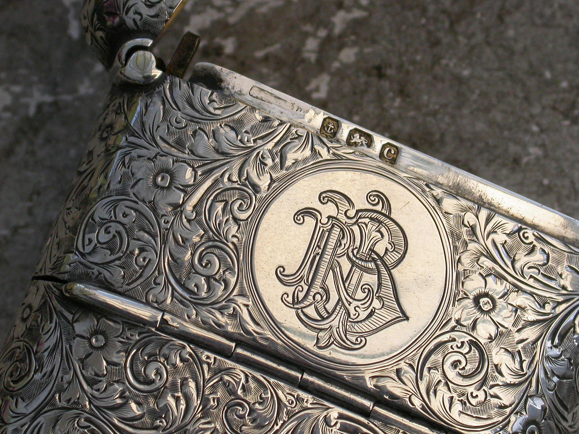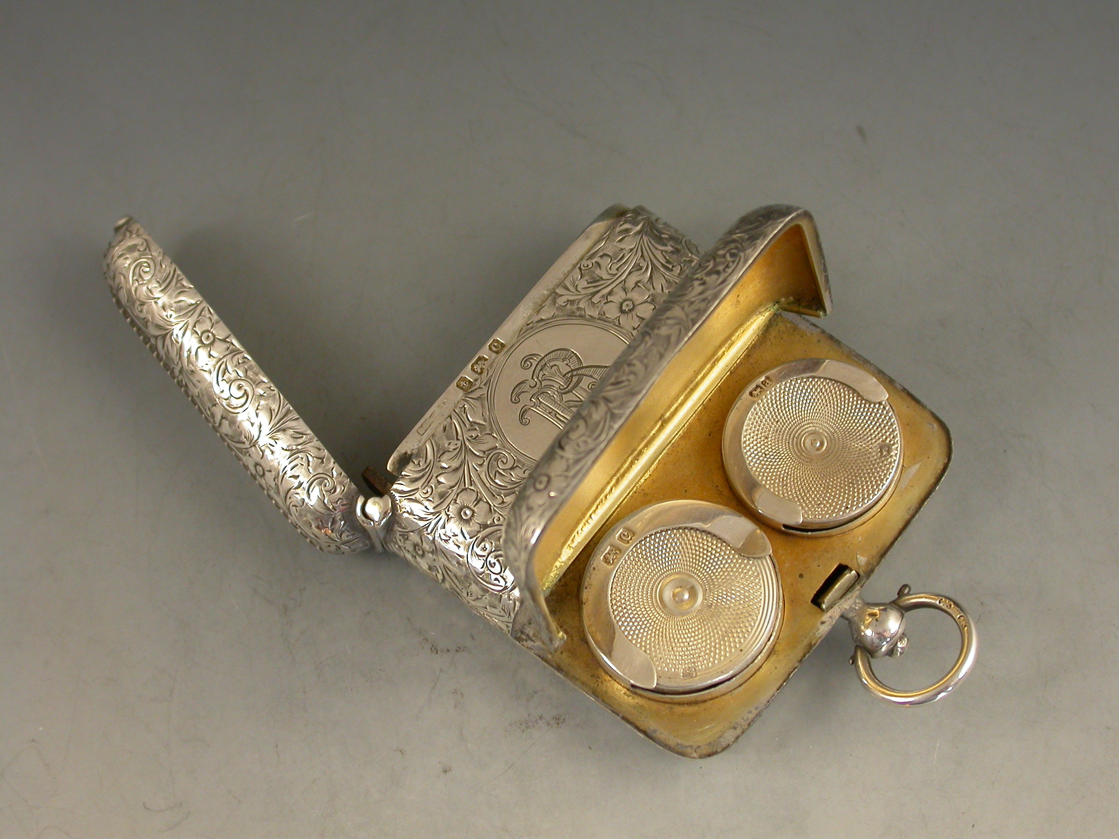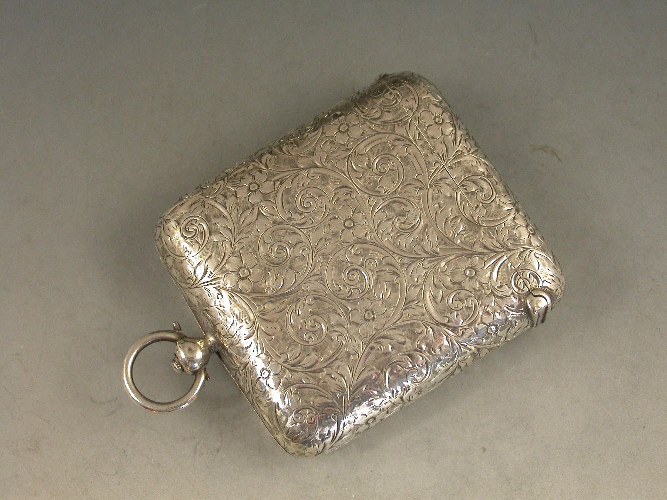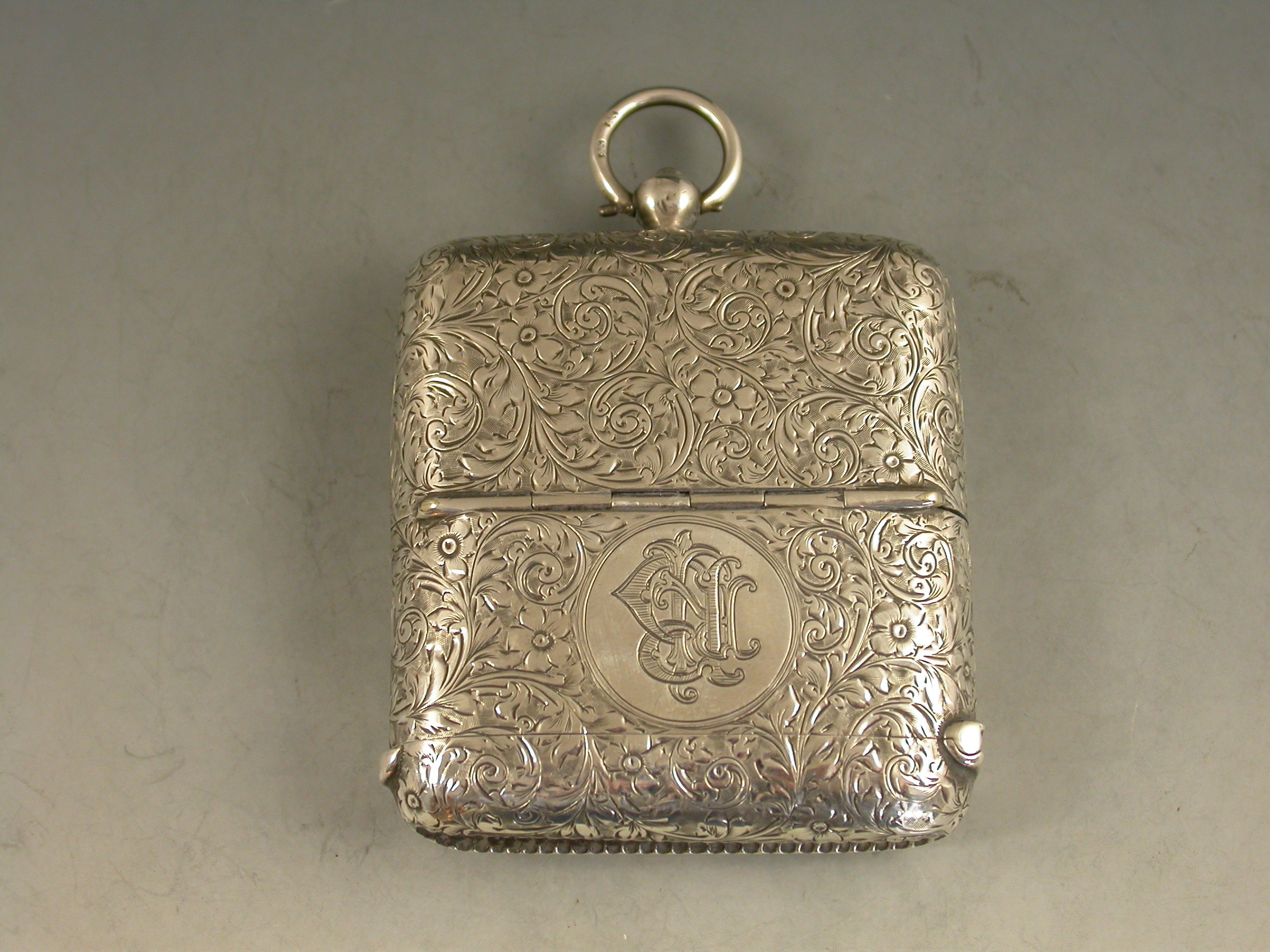 A good Edwardian silver combined double Sovereign and Vesta Case of large rounded rectangular form with all over foliate scroll engraved decoration, a circular cartouche engraved with contemporary initials. The two sprung hinges opening to reveal silver gilt interiors and sprung full and half sovereign compartments.