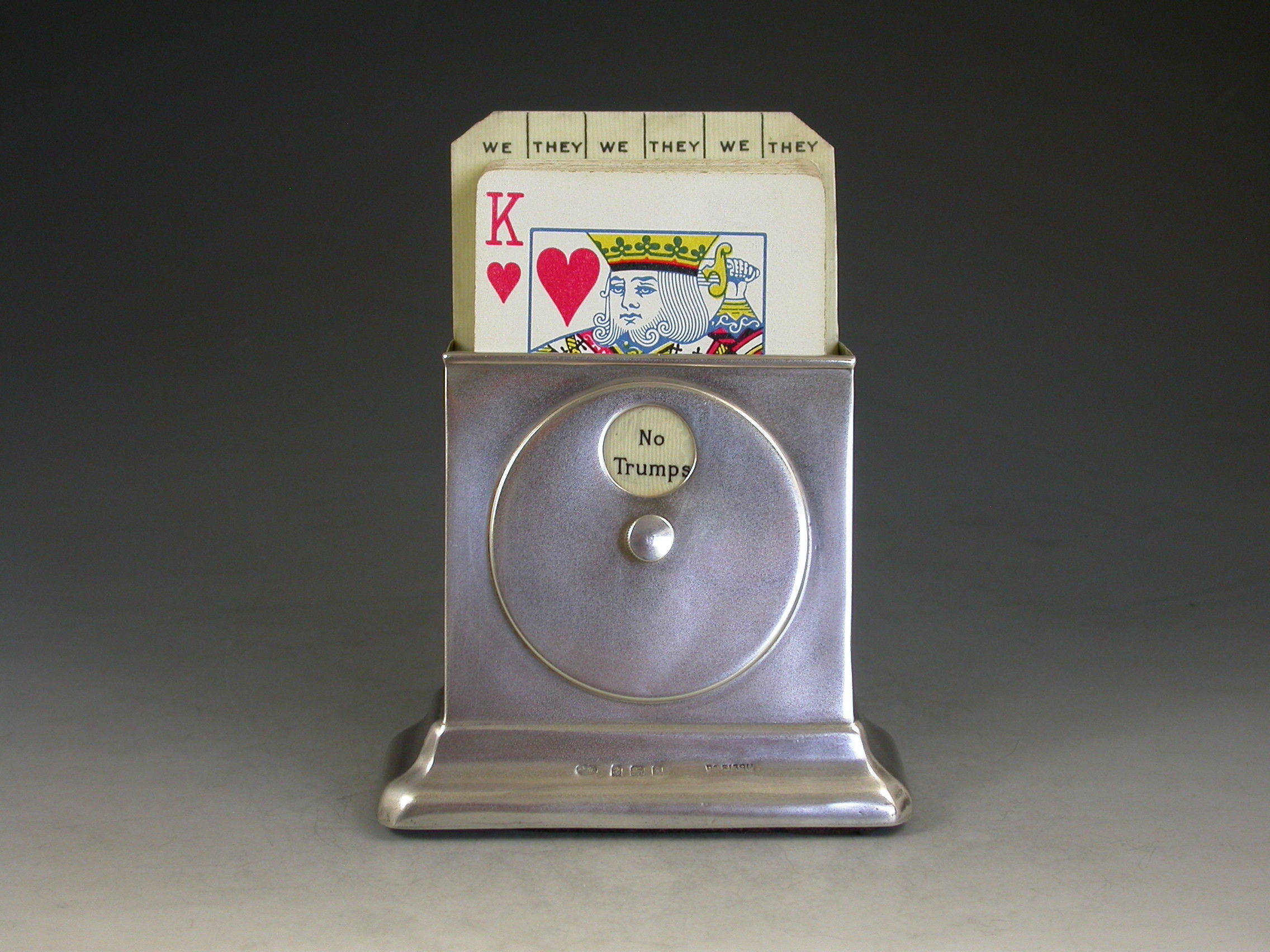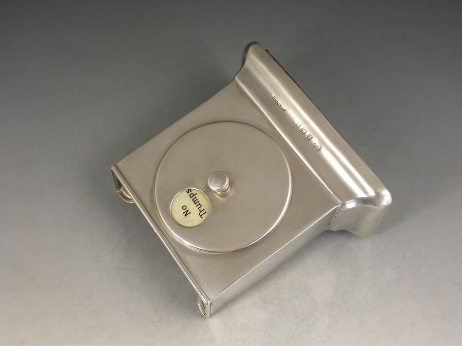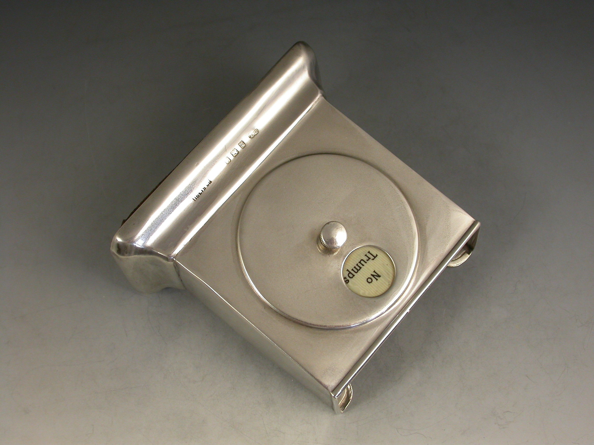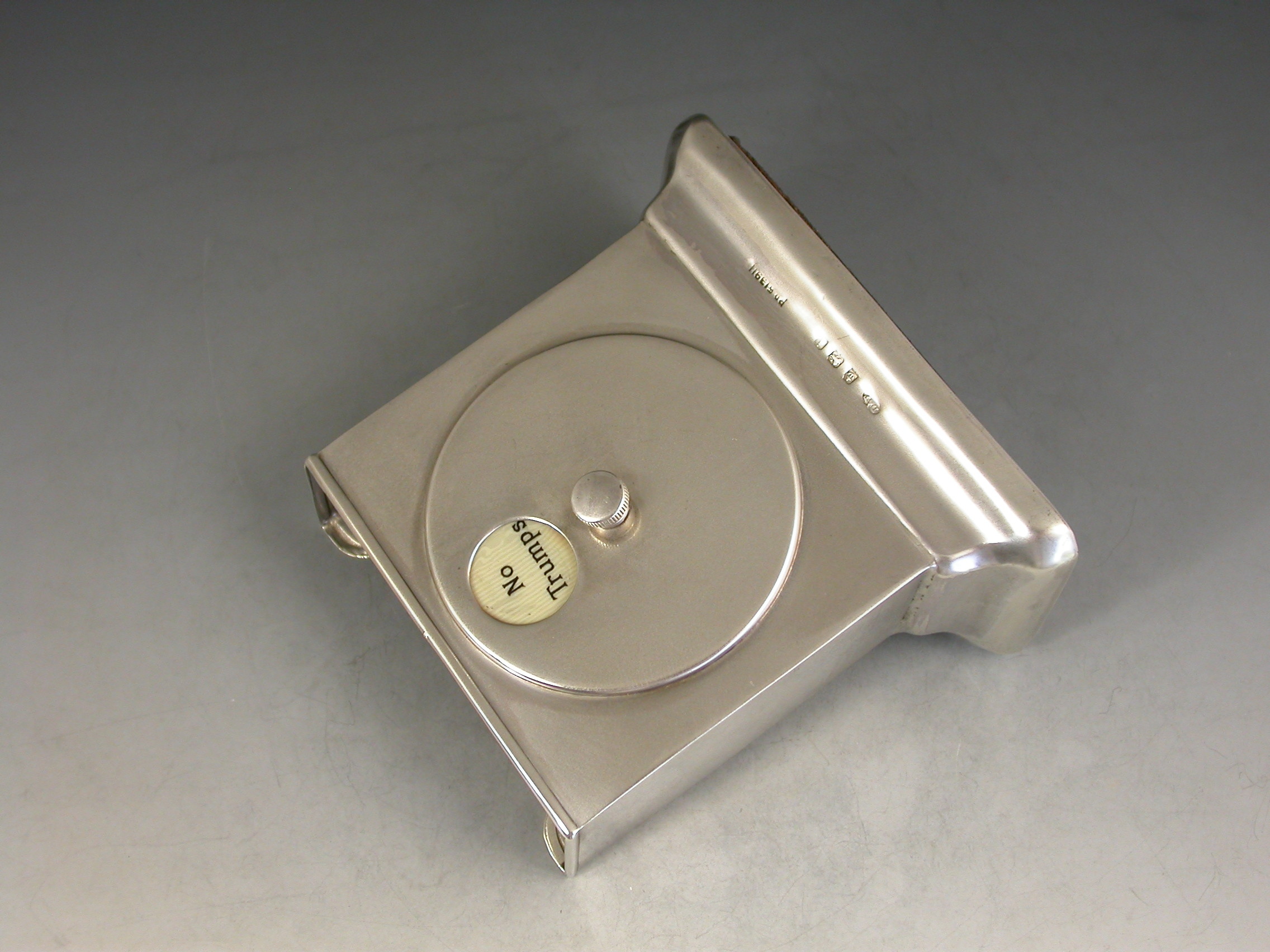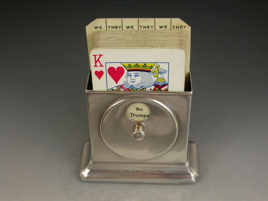 A good Edwardian silver combined Trumps Marker and Playing Cards Holder of sloped rectangular form supported by a rectangular pedestal base. A rotating celluloid disc indicates Trumps or No Trumps.