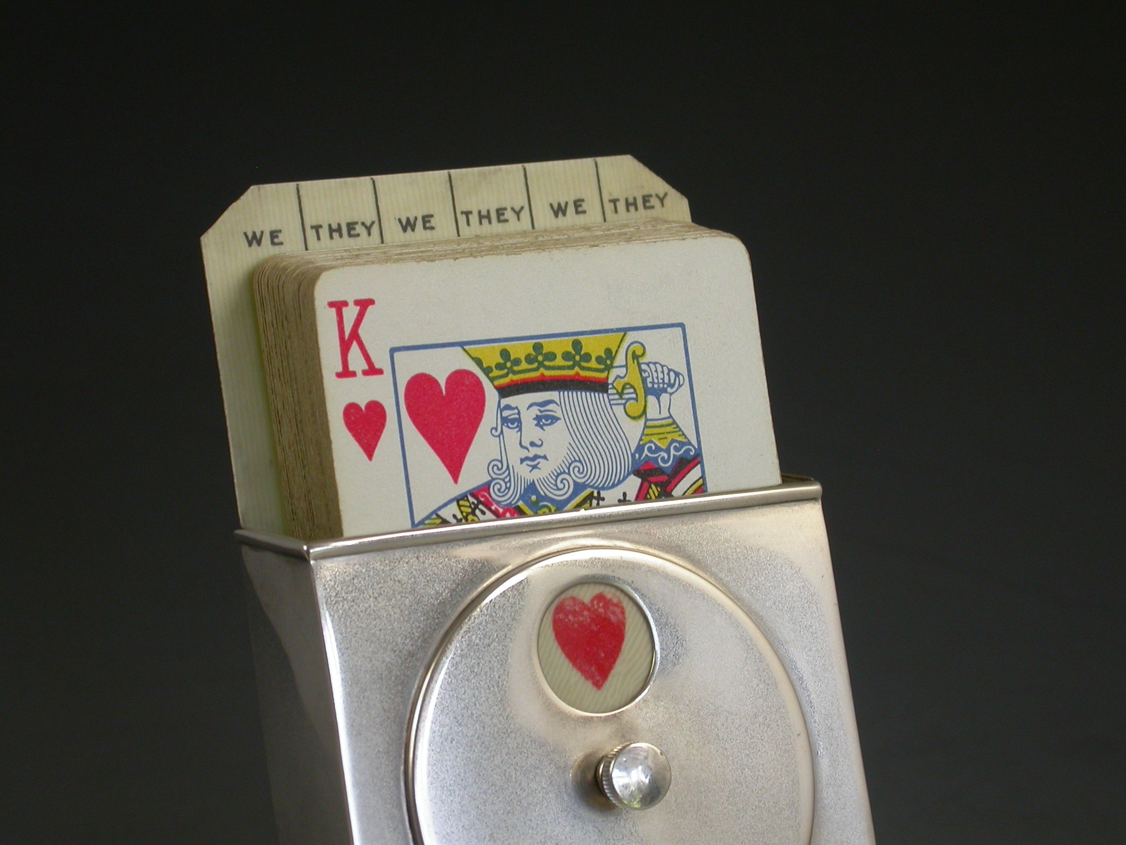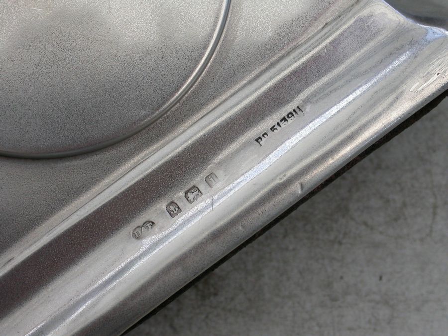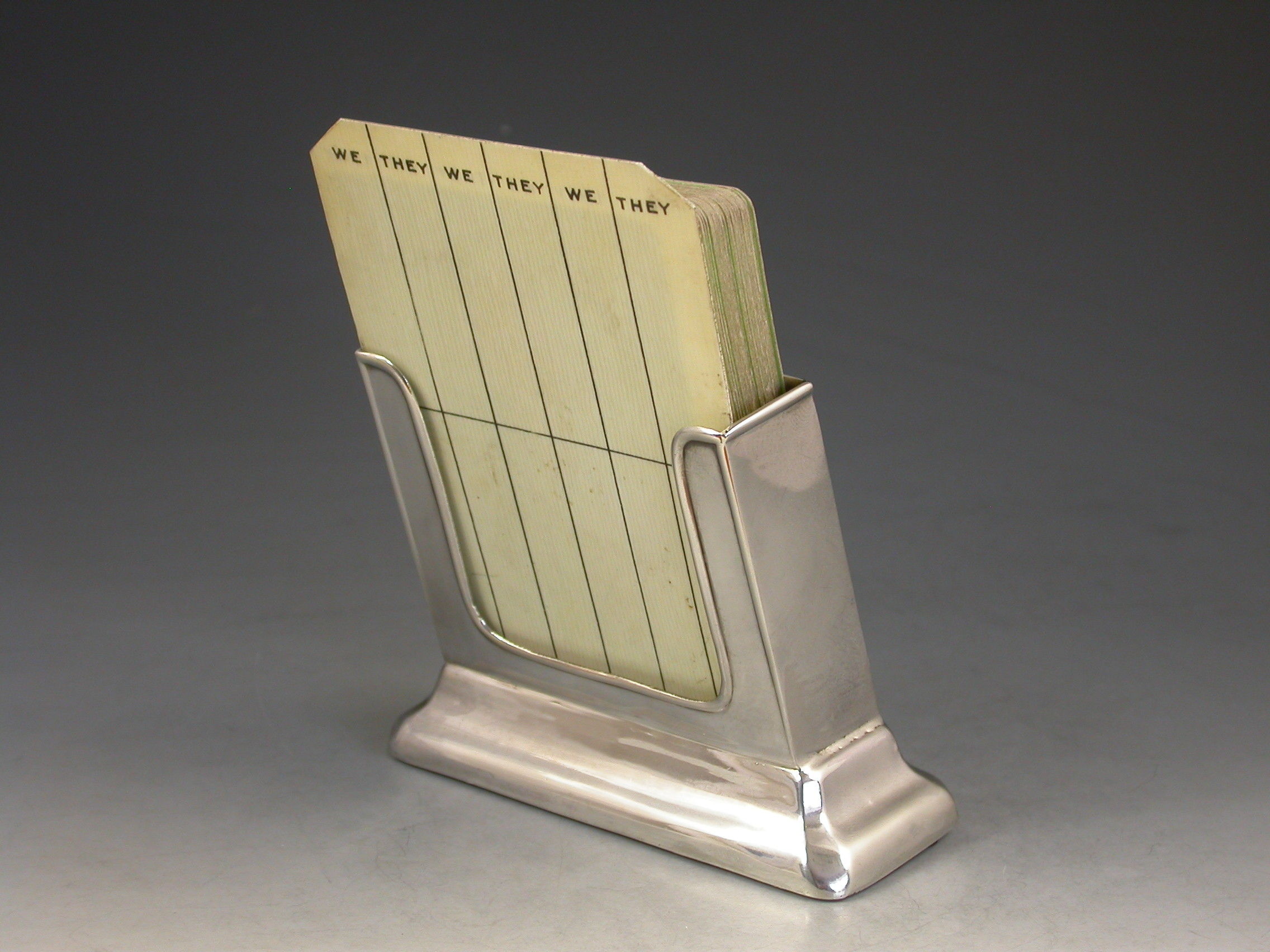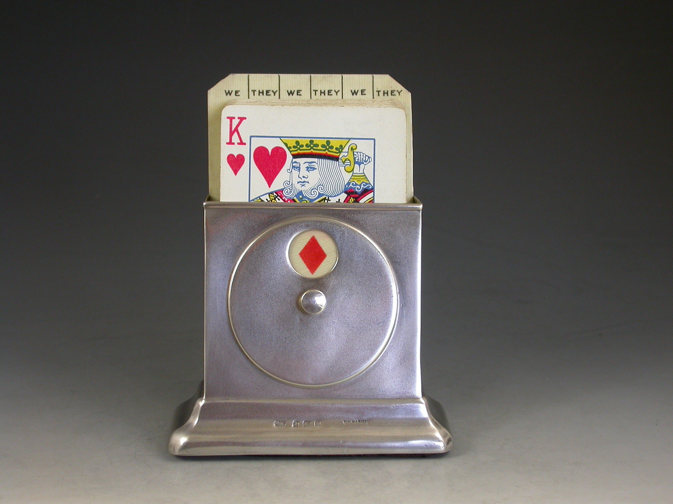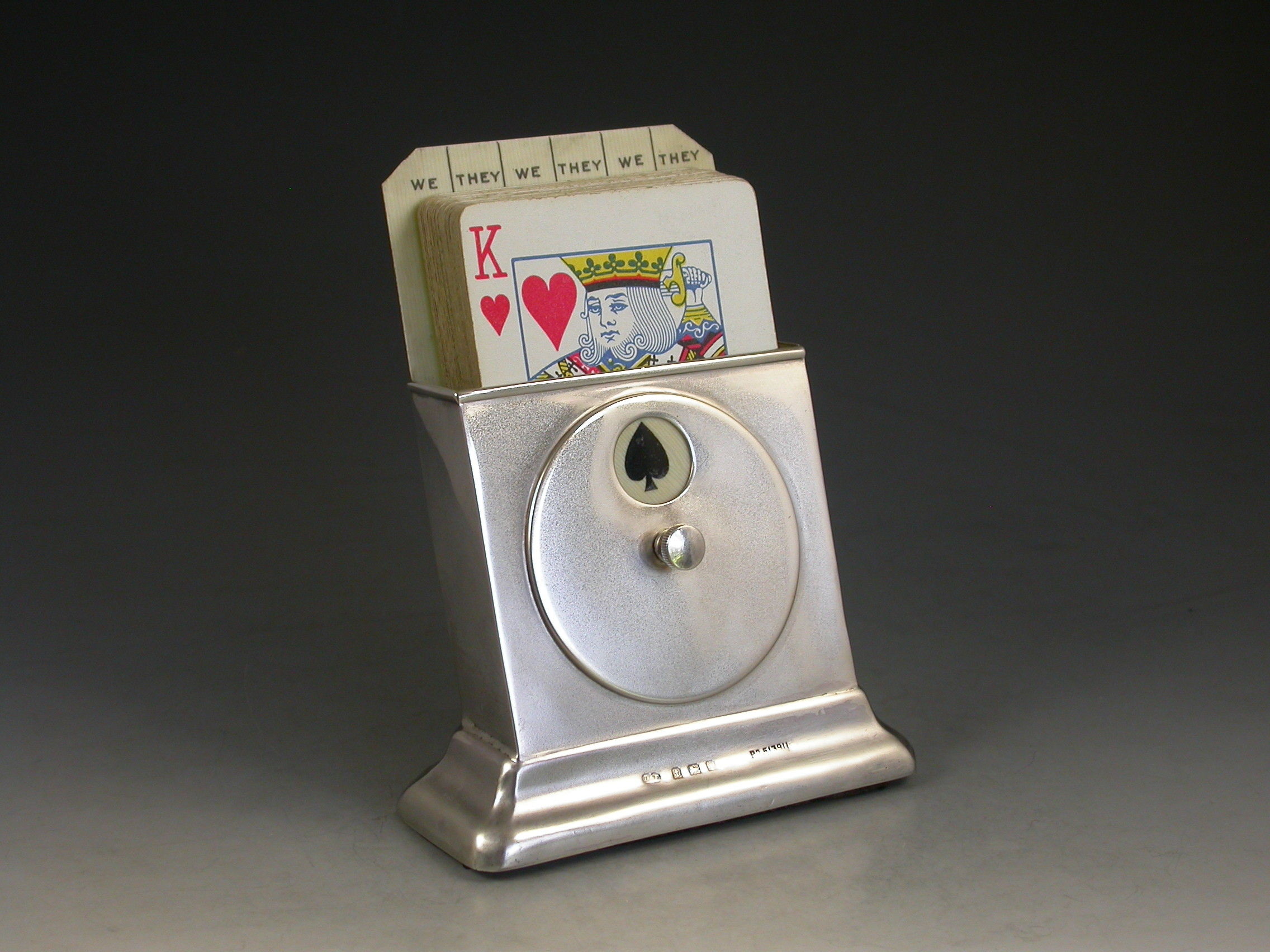 A good Edwardian silver combined Trumps Marker and Playing Cards Holder of sloped rectangular form supported by a rectangular pedestal base. A rotating celluloid disc indicates Trumps or No Trumps.