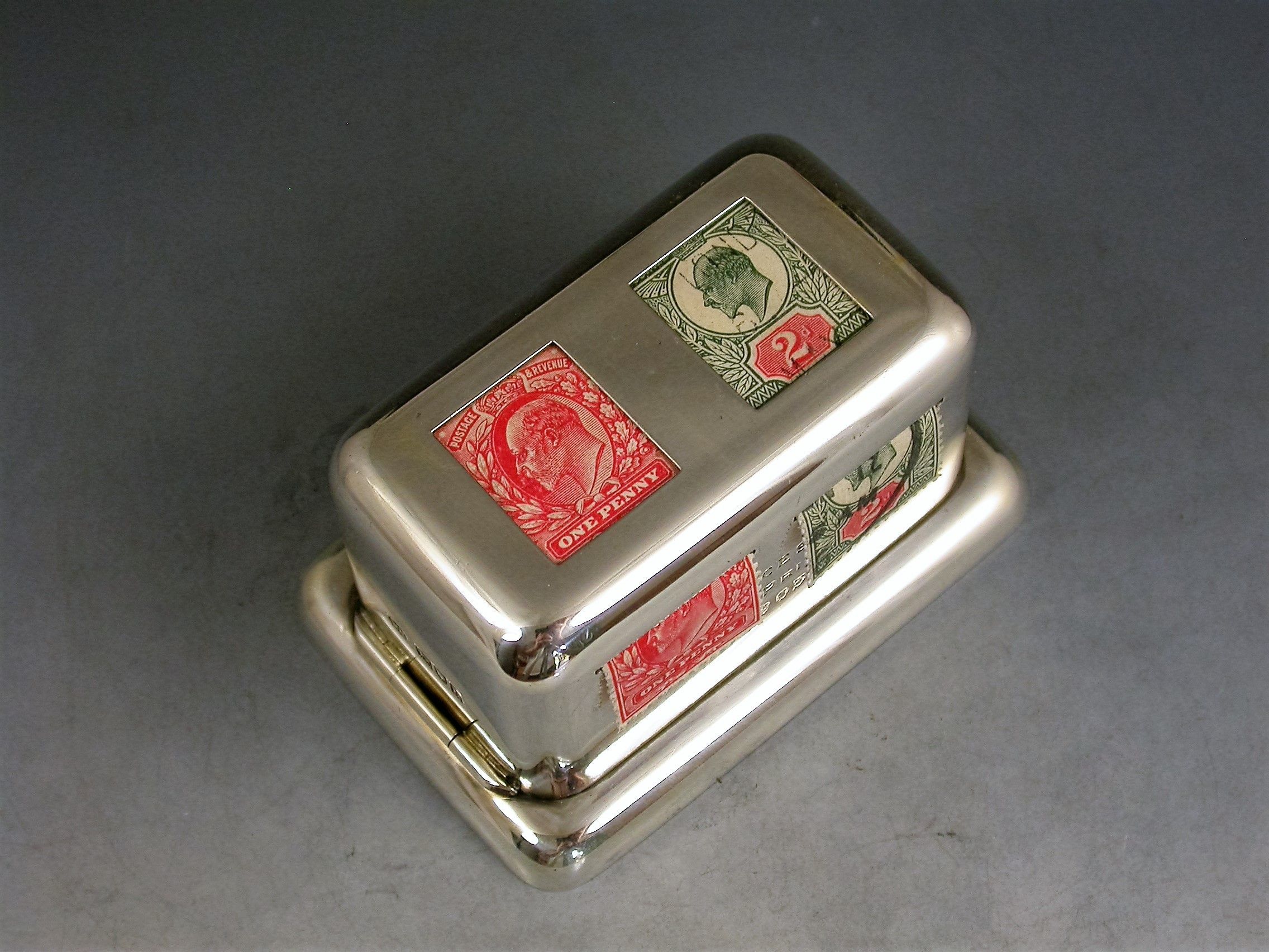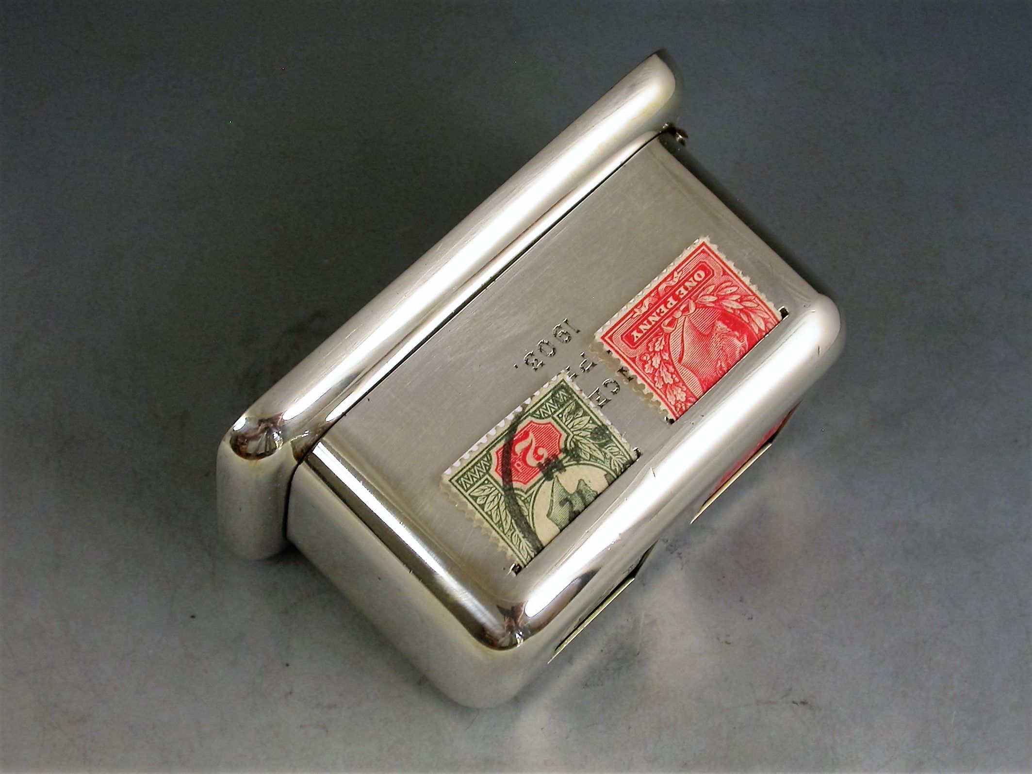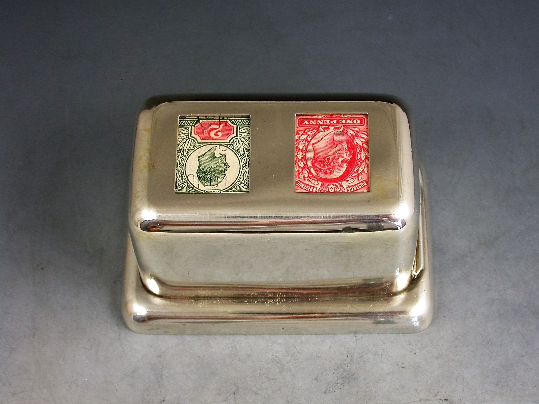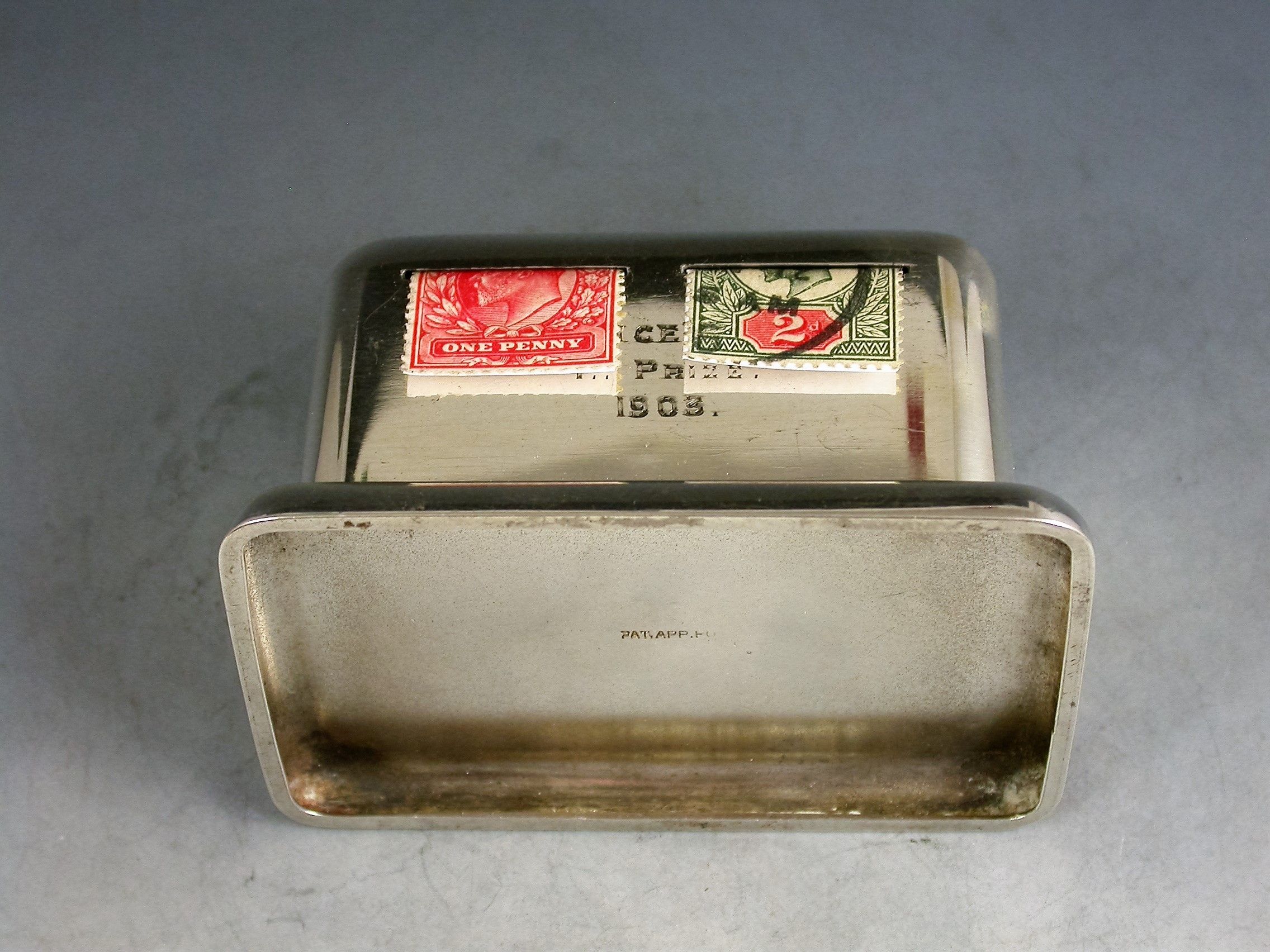 A rare Edwardian silver double coil dispenser Stamp Box of curved rectangular form on a pedestal base, the hinged box opening to reveal two gilded compartments that would have held coils of stamps dispensed through slots in the lid. The two windows to the lid now holding just a pair of Edwardian one penny and two penny stamps.
