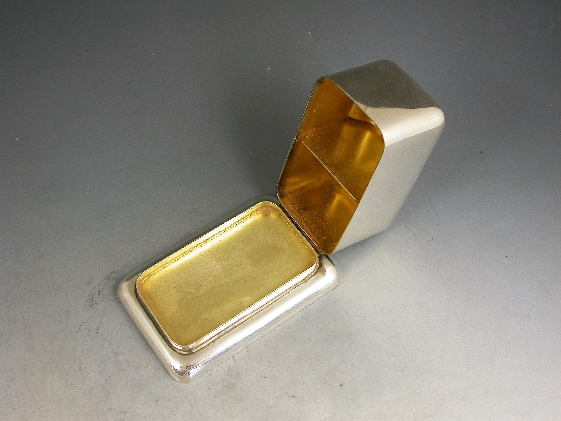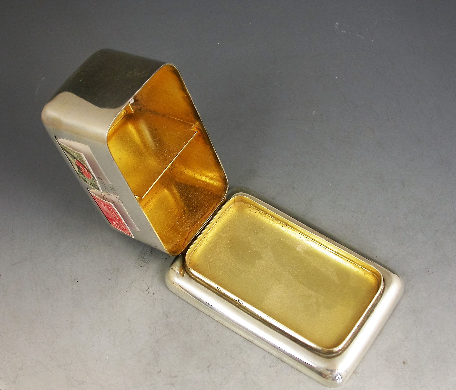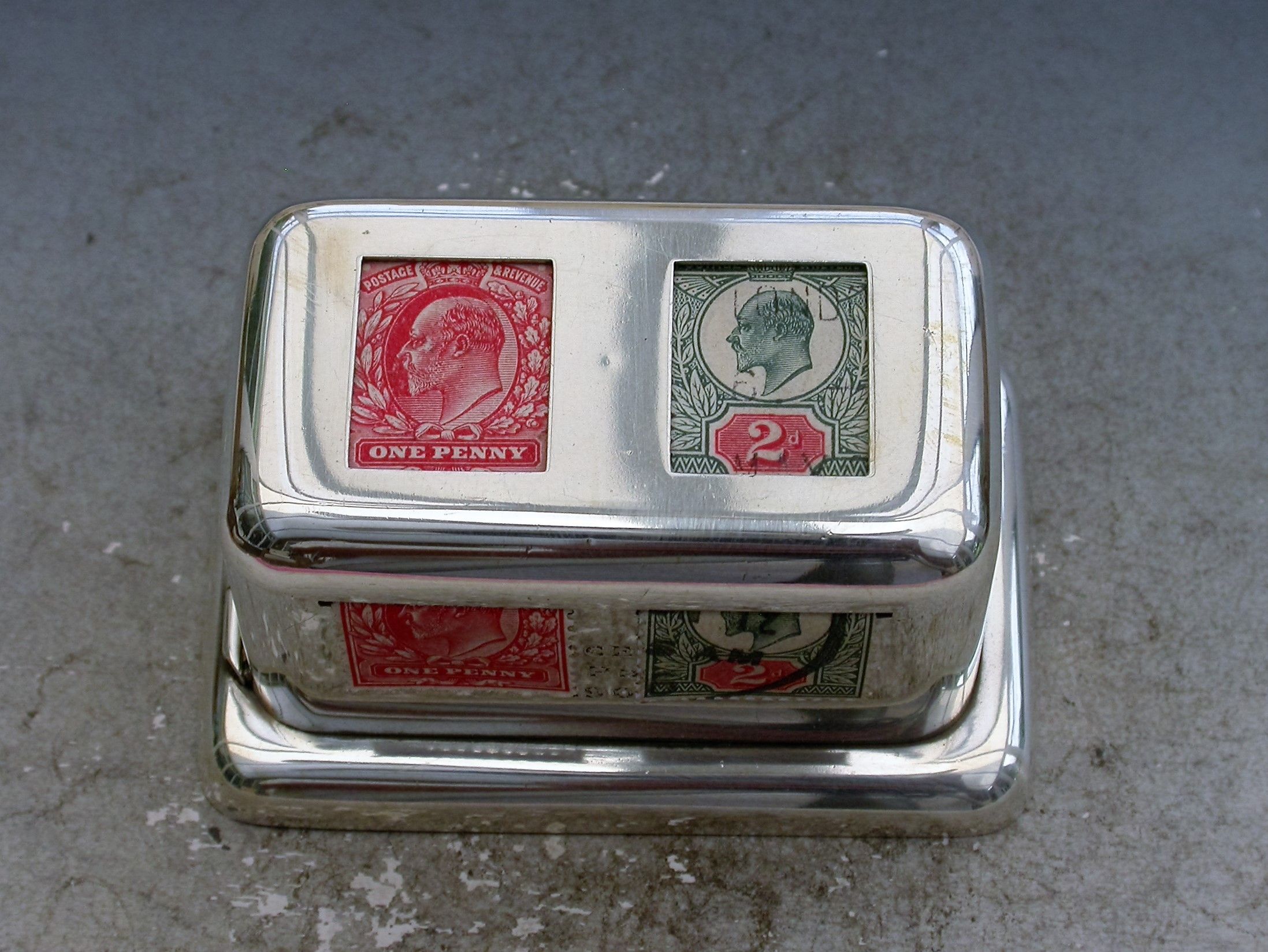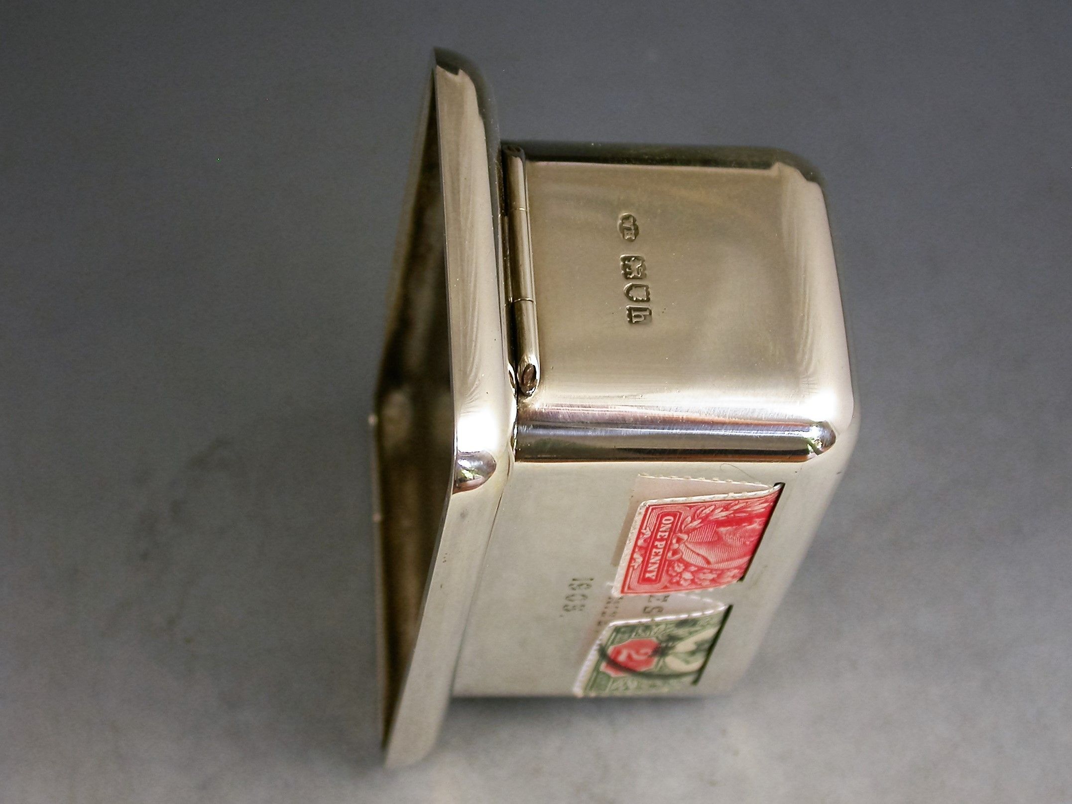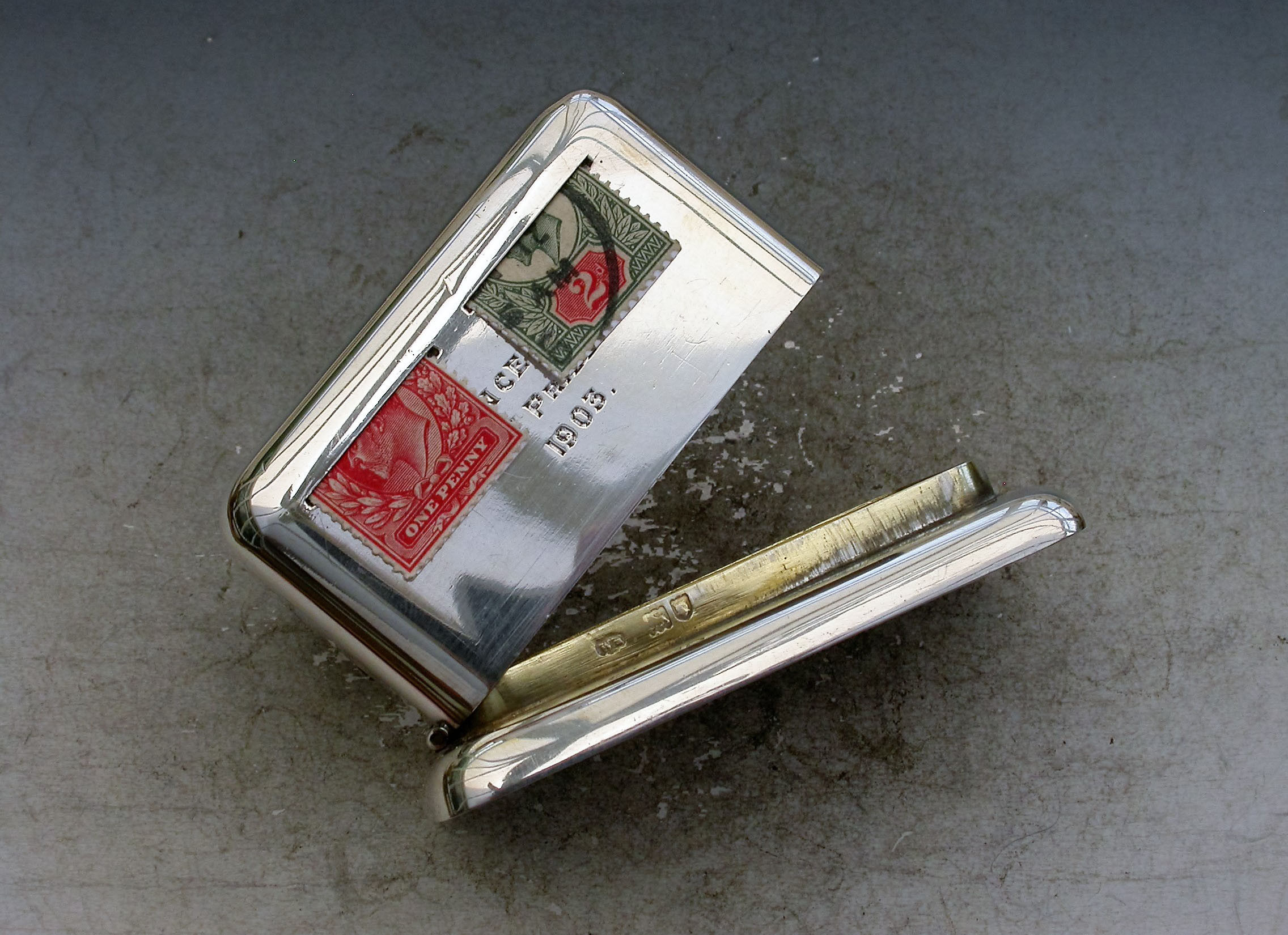 A rare Edwardian silver double coil dispenser Stamp Box of curved rectangular form on a pedestal base, the hinged box opening to reveal two gilded compartments that would have held coils of stamps dispensed through slots in the lid. The two windows to the lid now holding just a pair of Edwardian one penny and two penny stamps.