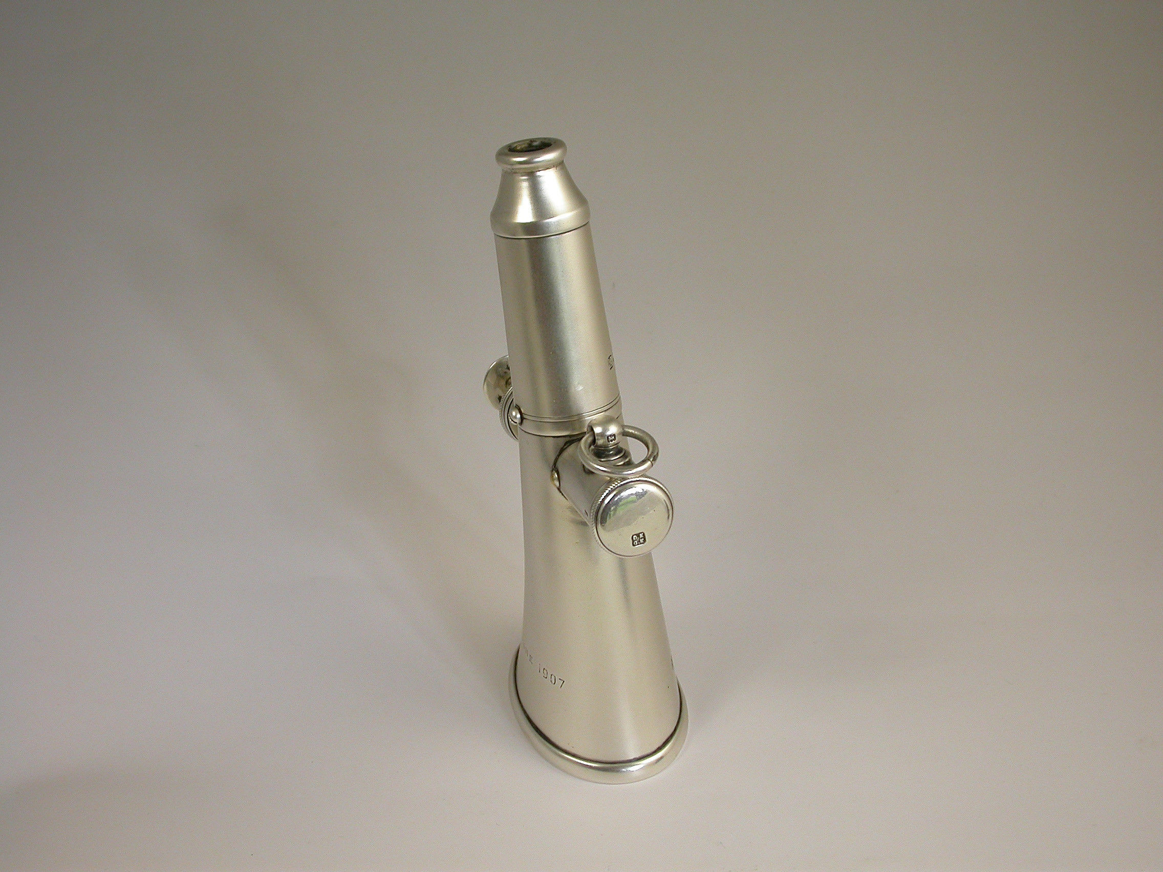 The “Signal Horn” was originally made by KOHLER & SON, Musical Instrument makers of Covent Garden and subsequently Piccadilly in London. It is most often seen in brass or nikel silver. It appears to be a “multi-purpose item” with several possible uses. It has a mouthpiece similar to a whistle and the body is slightly curved as it opens out into a flattened oval bell shaped mouth, half way along the barrel is a vertical cylindrical chamber with finger stop piston plunger similar to that on a trumpet, a suspension ring is located on the lower portion of the chamber for attachment to a lanyard or similar. It produces two distinct different notes.