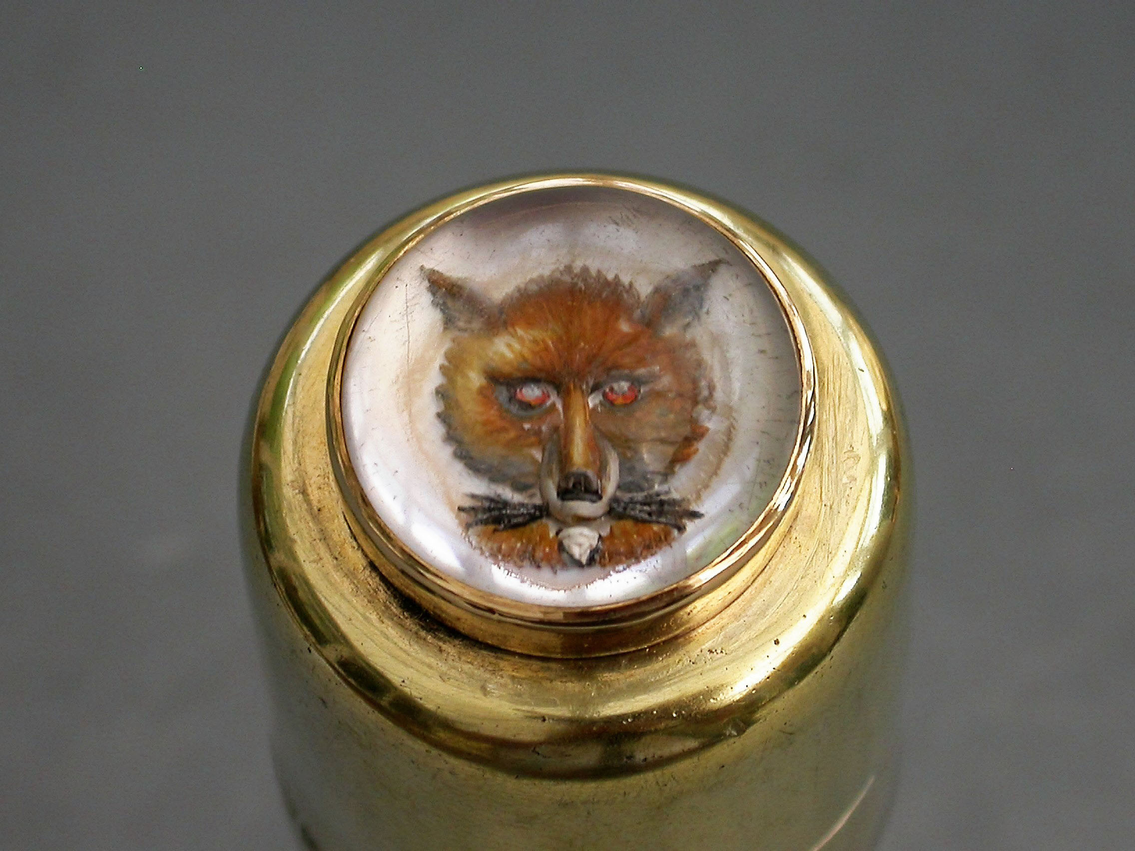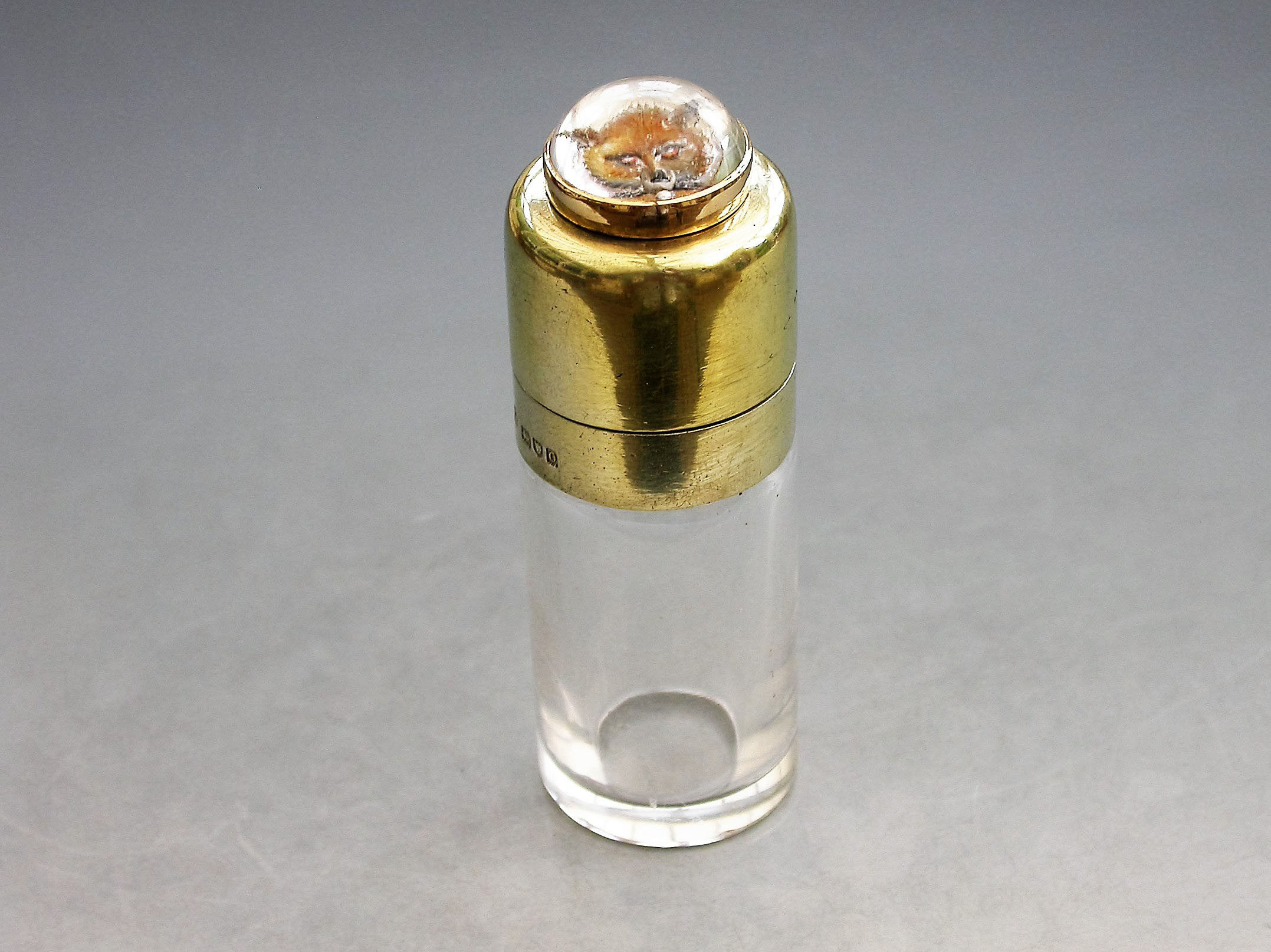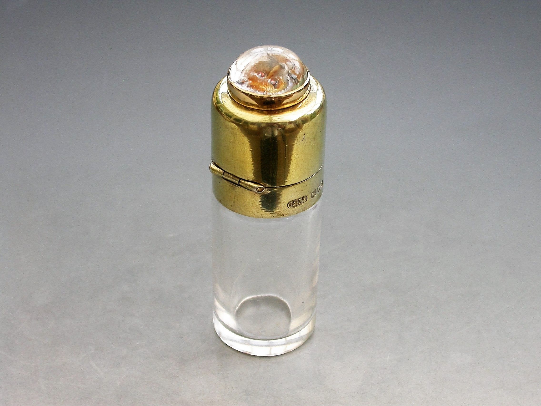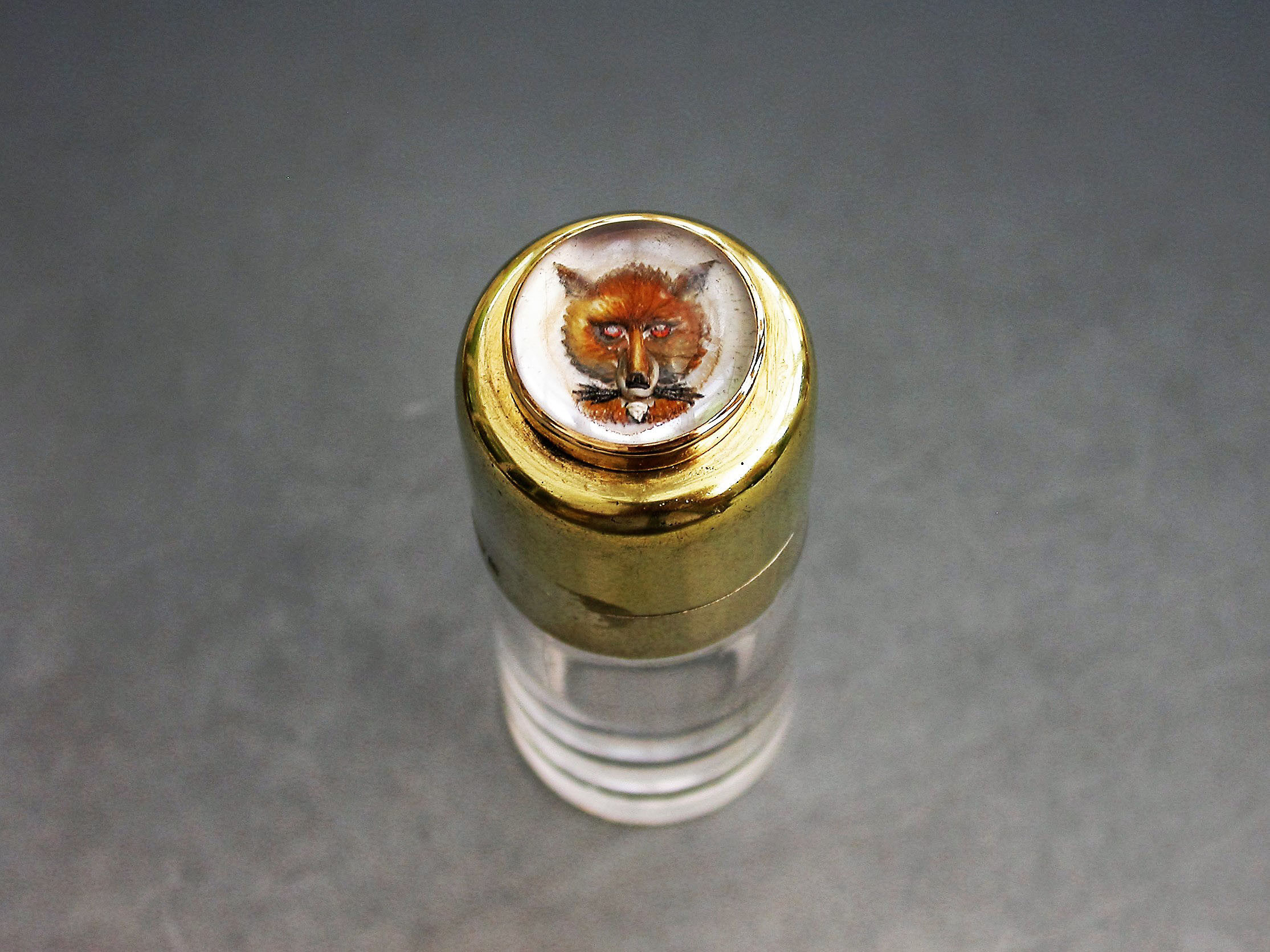 A fine quality Edwardian silver gilt and gold mounted glass Scent Bottle of plain cylindrical form, the hinged silver gilt lid set with a gold mounted hand carved and painted Essex crystal depicting a fox's head.