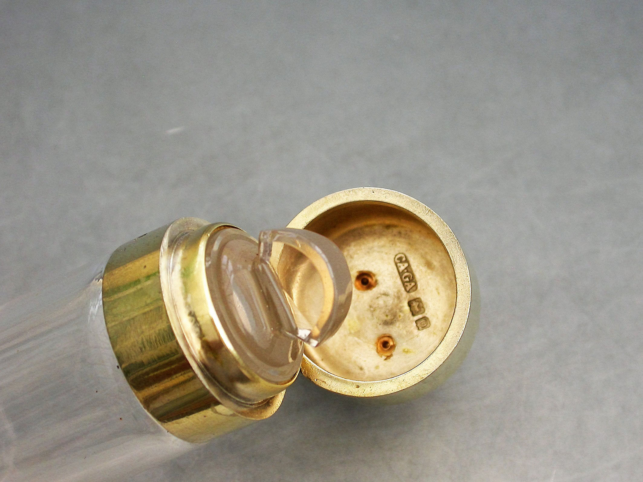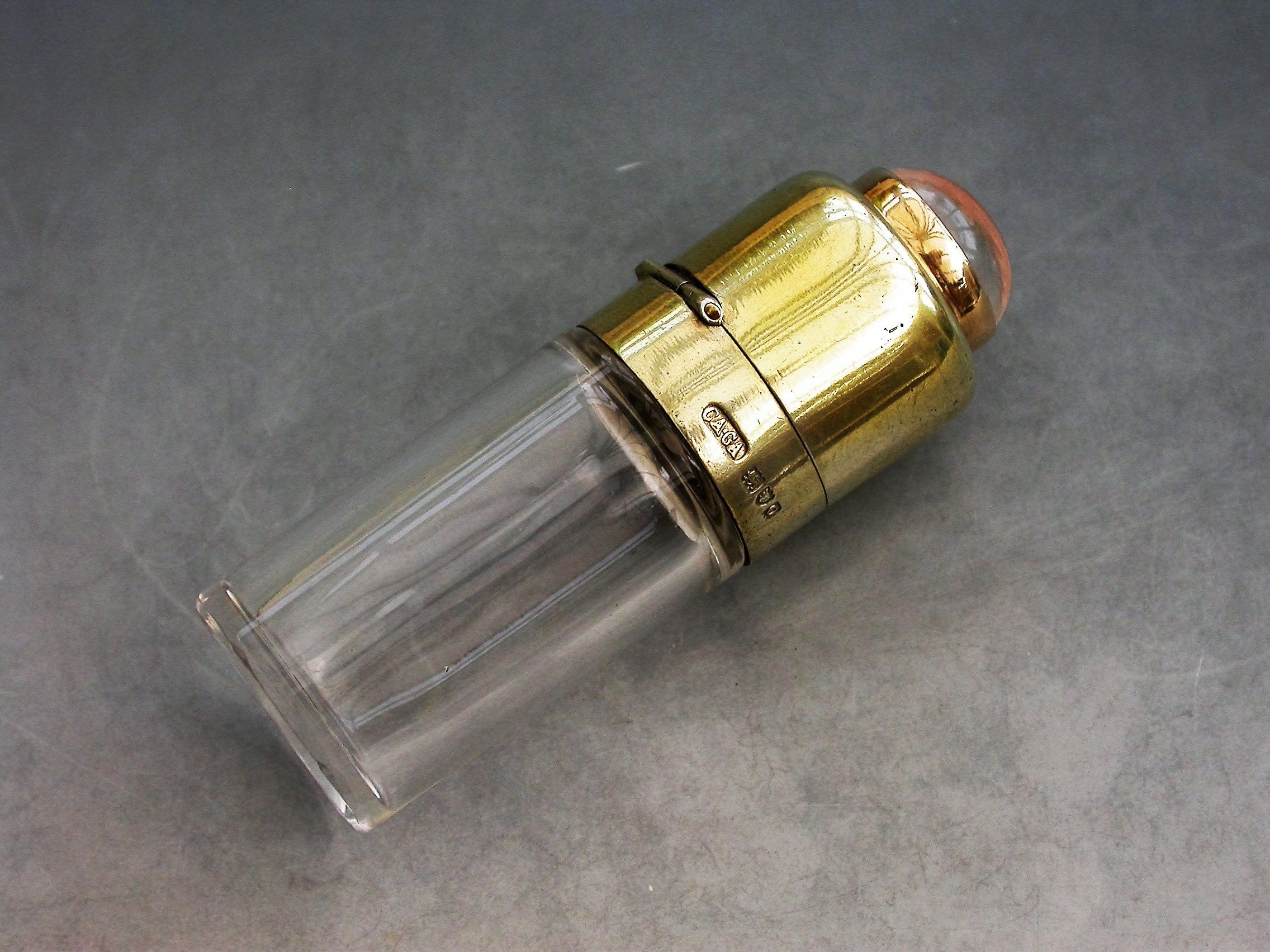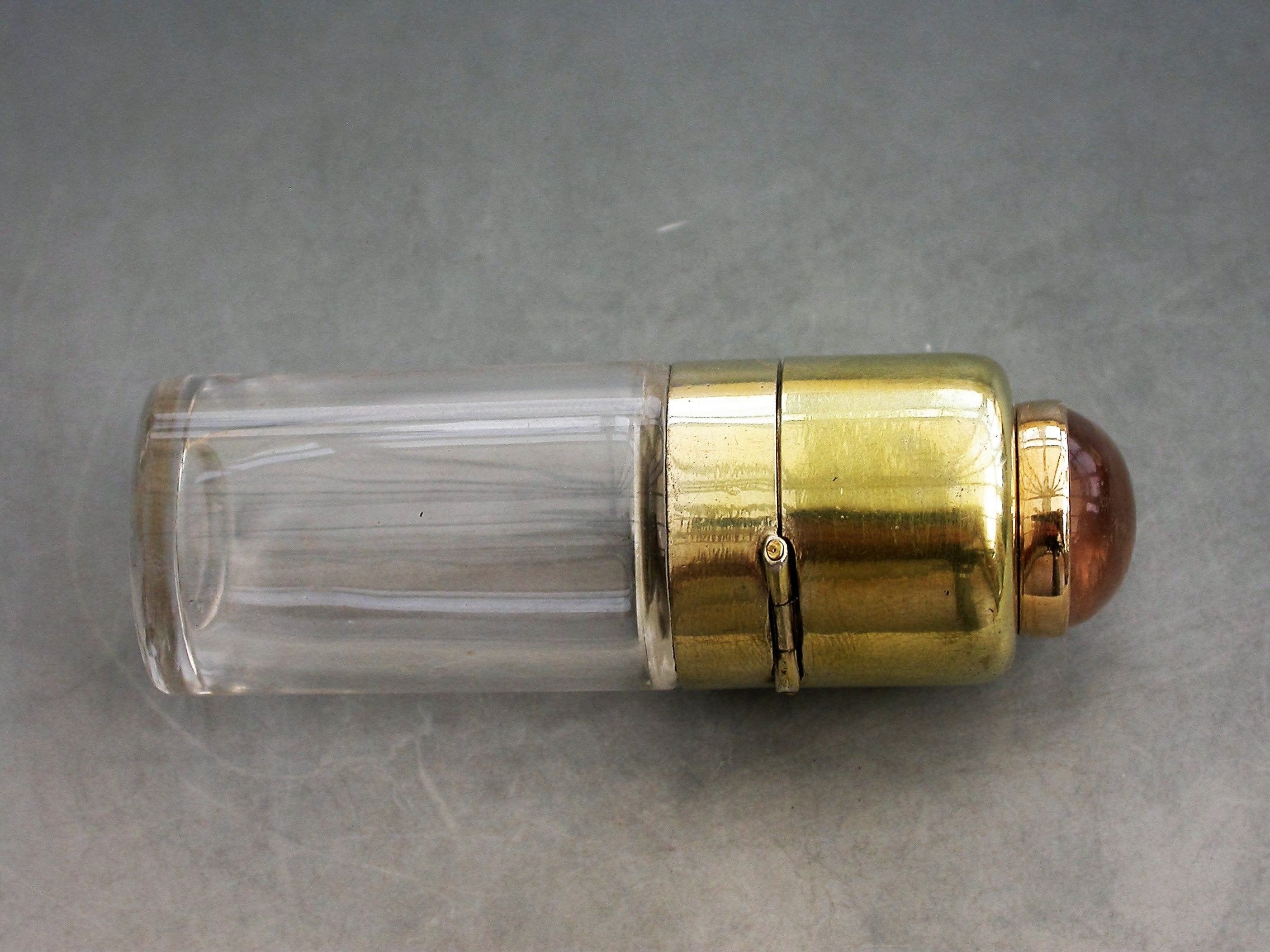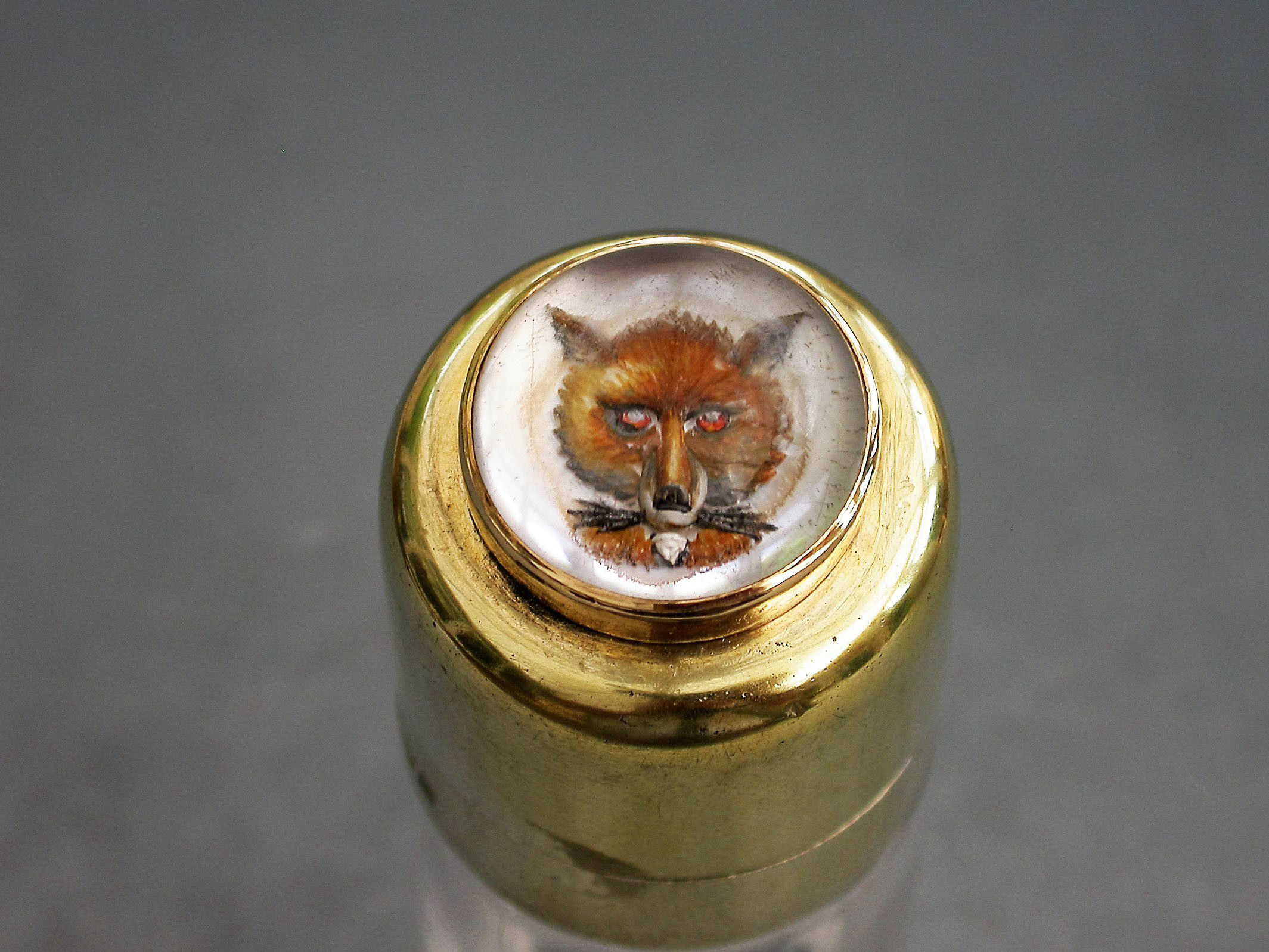 A fine quality Edwardian silver gilt and gold mounted glass Scent Bottle of plain cylindrical form, the hinged silver gilt lid set with a gold mounted hand carved and painted Essex crystal depicting a fox's head.