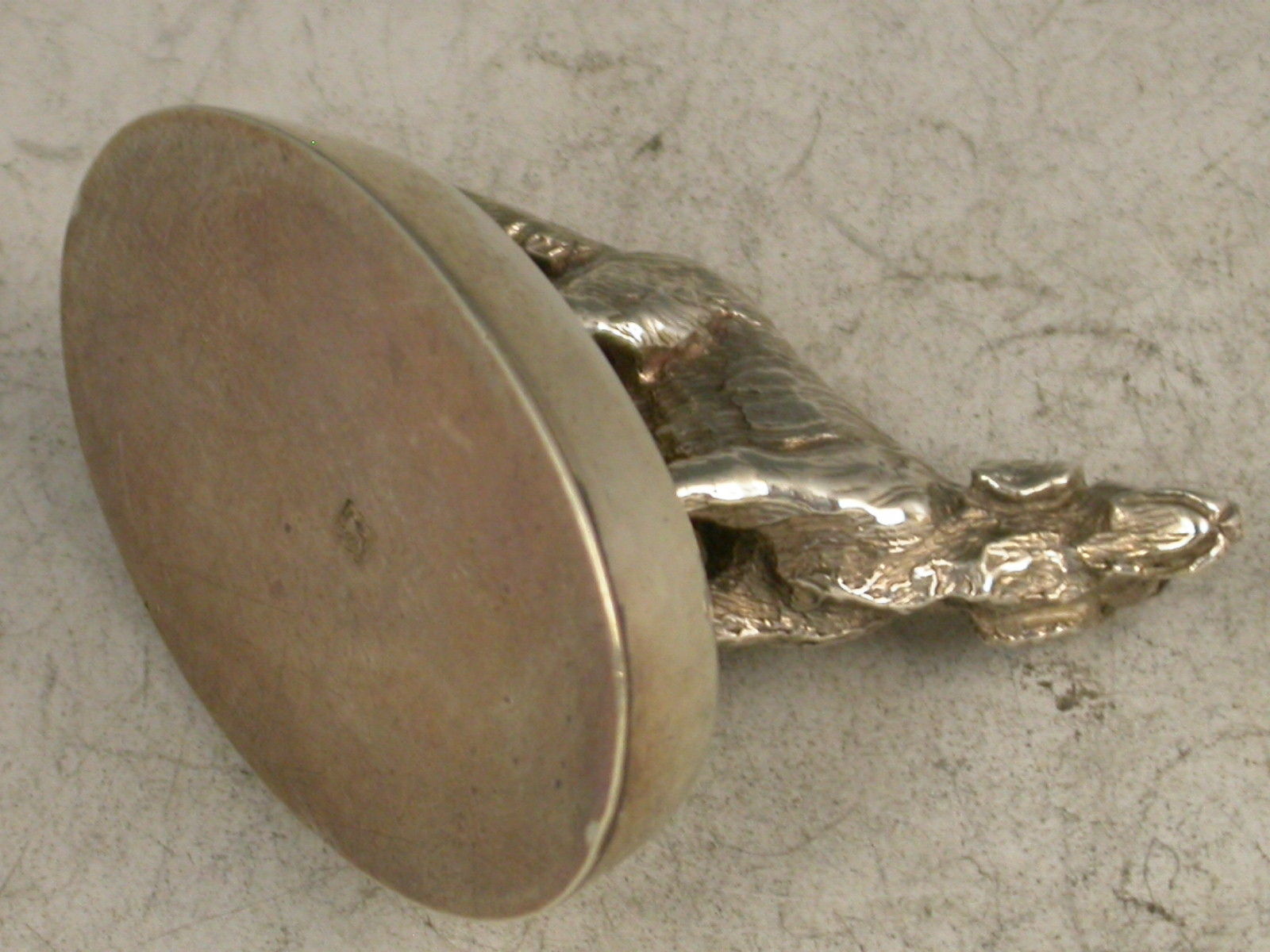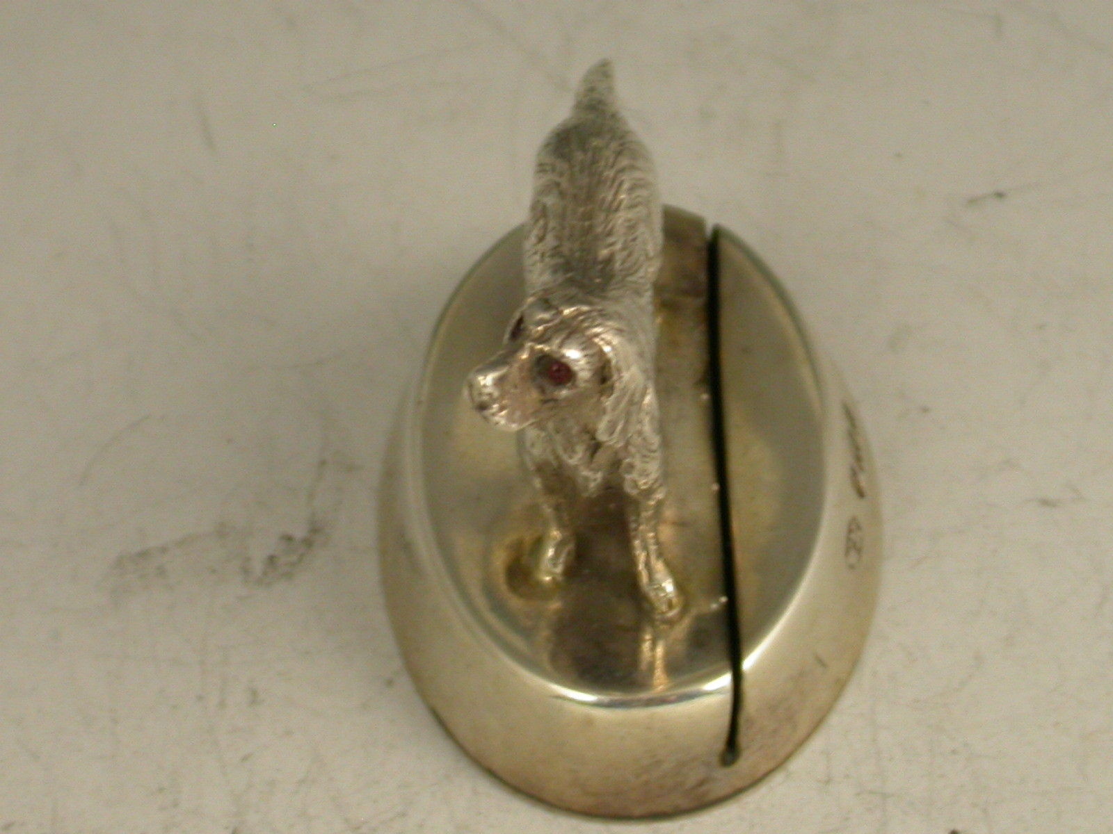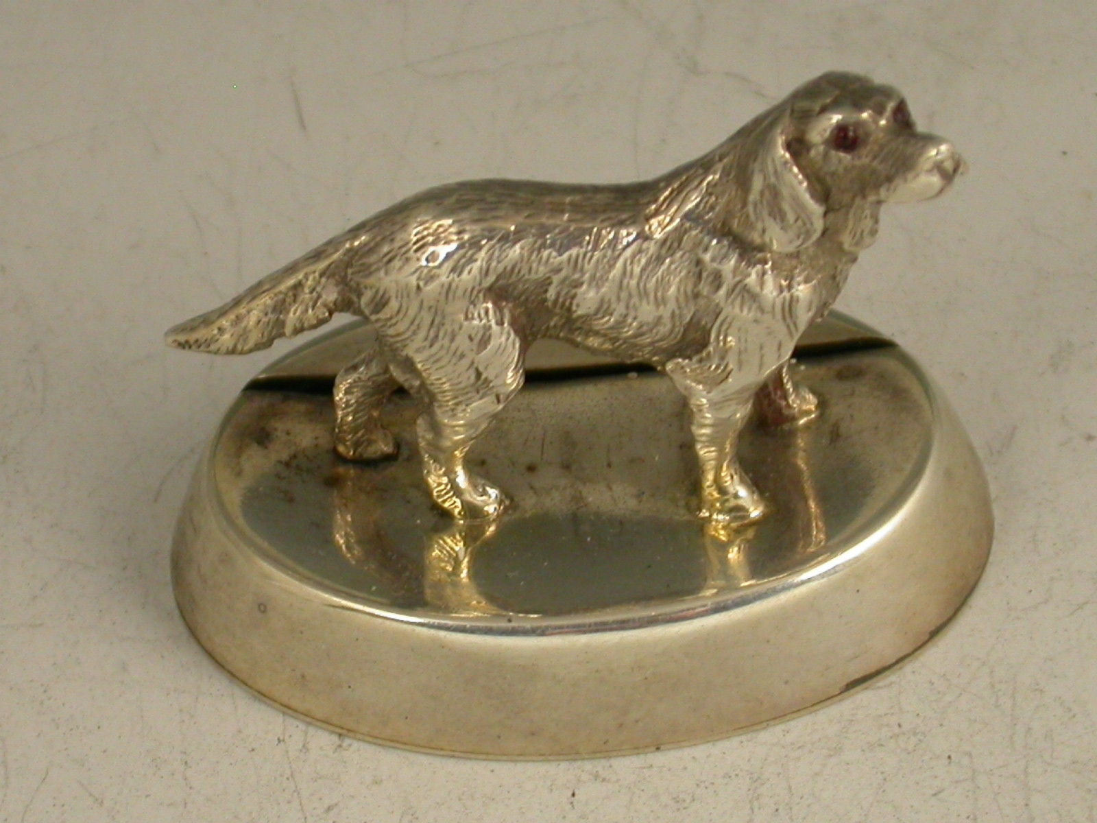 A fine quality Edwardian heavy cast silver Menu Holder, made in the form of a golden retriever dog, with red glass eyes, standing on a filled slotted oval base.
