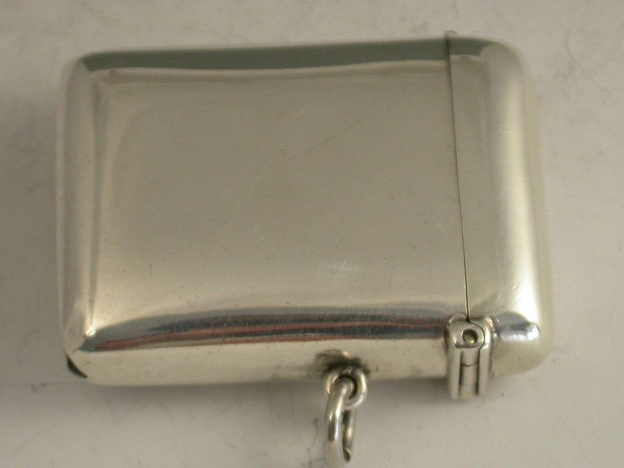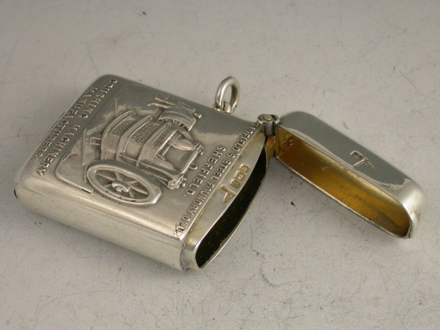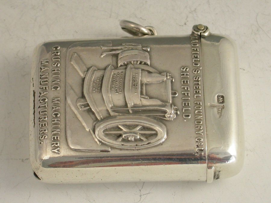 A rare Edwardian silver Vesta Case of rounded rectangular form with hinged flip top lid, the face embossed with a steel crushing machine and ""Hadfield's Steel Foundry Co Ltd, Sheffield, Crushing Machinery Manufacturers"".