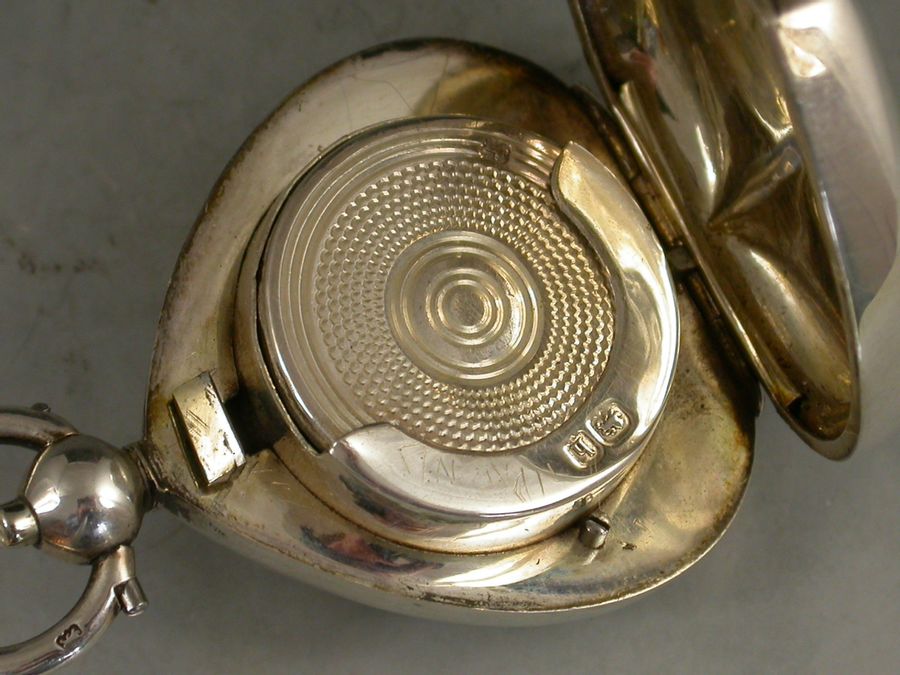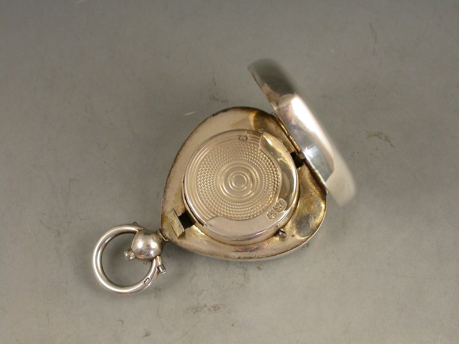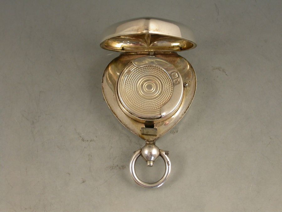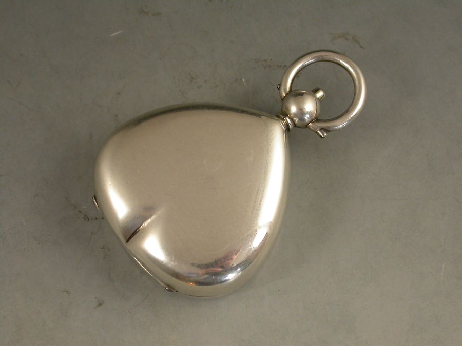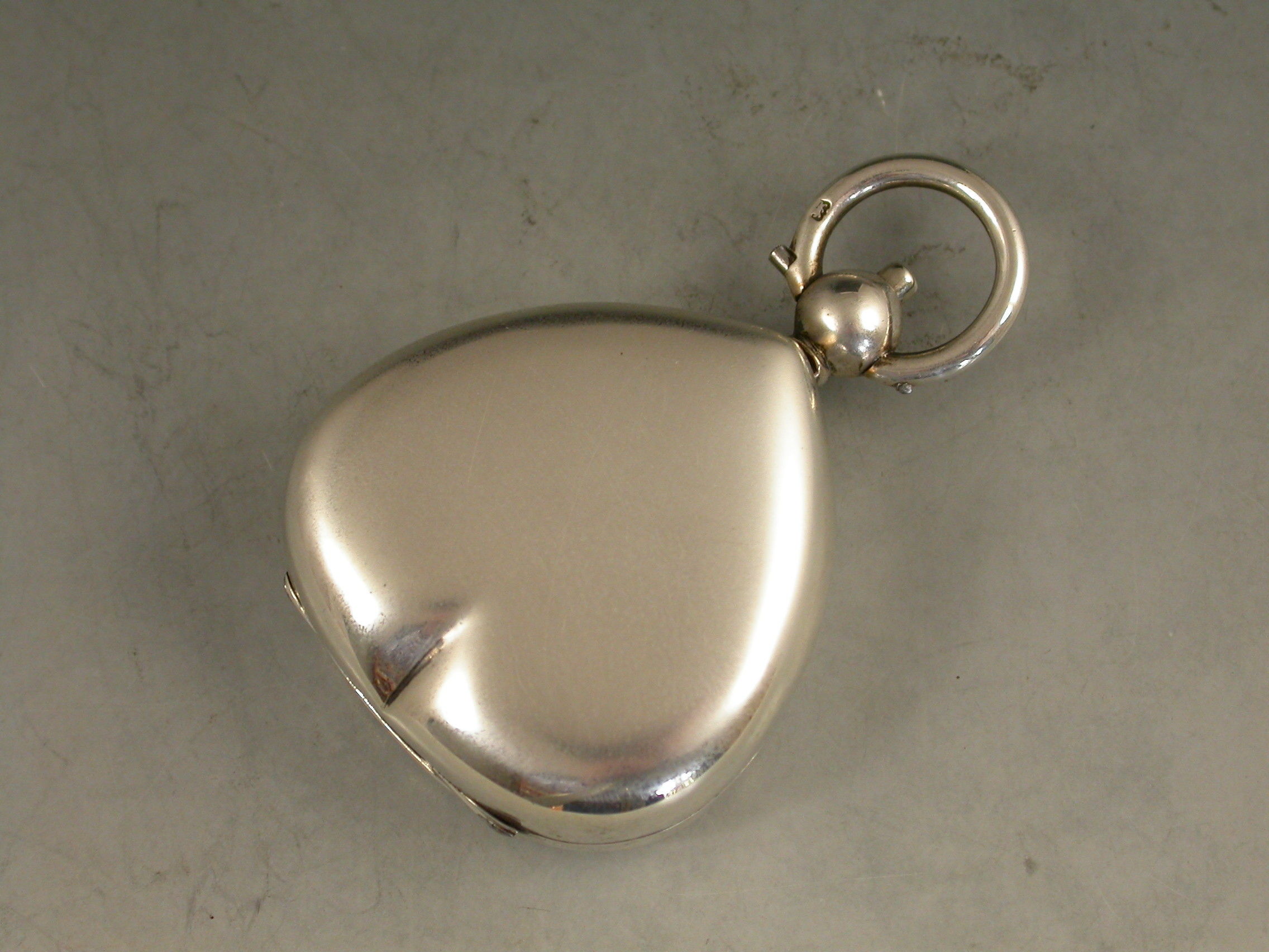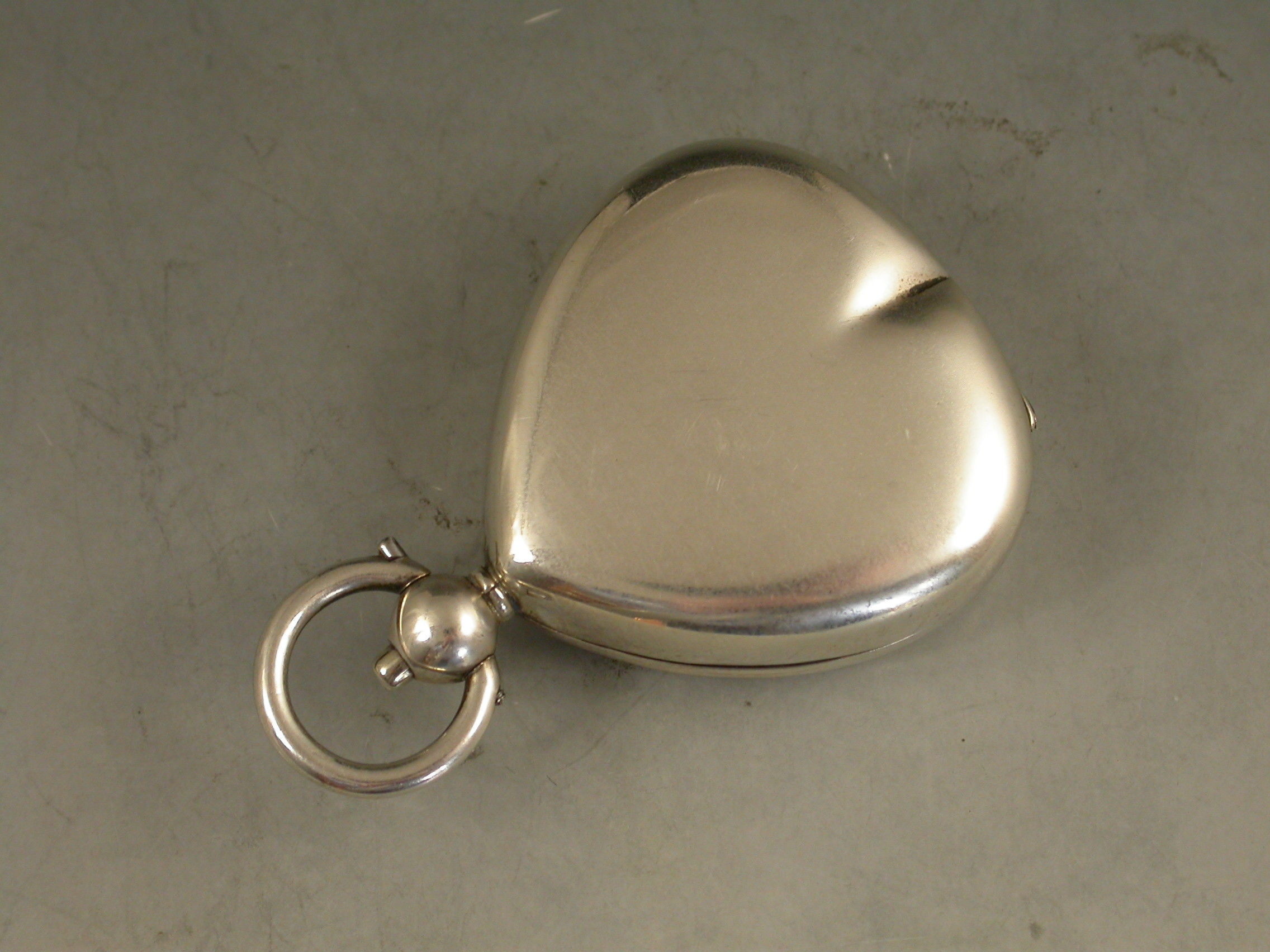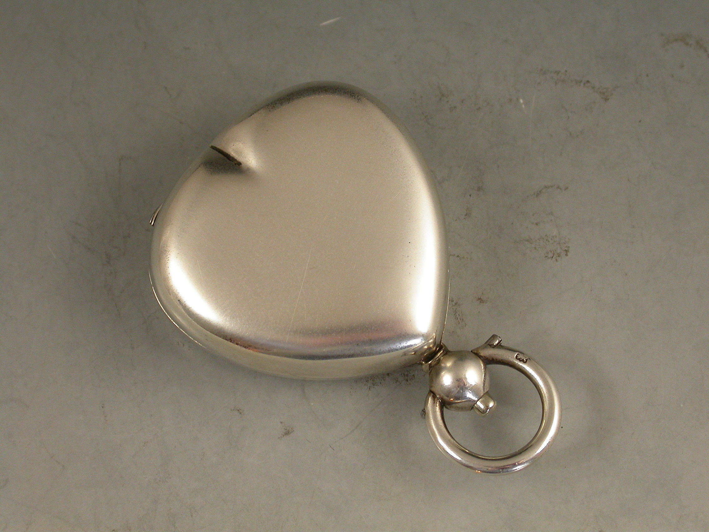A good Edwardian silver Sovereign Case of plain heart shaped form with attached suspension ring and push button opening mechanism. The interior with single sprung sovereign compartment.