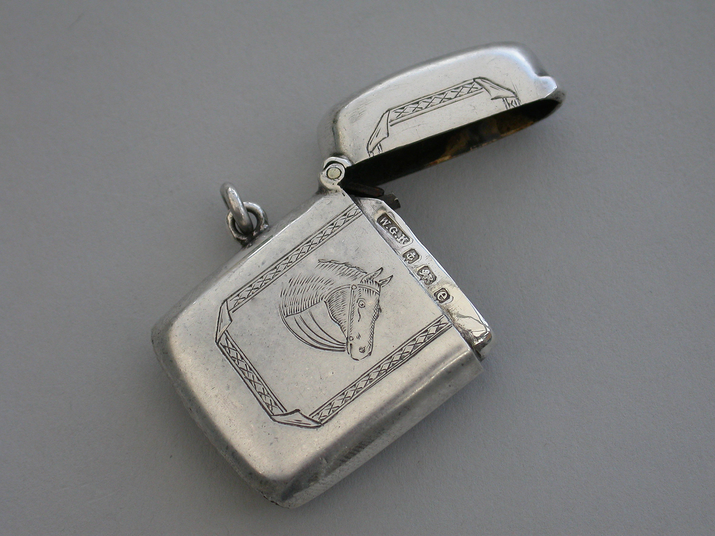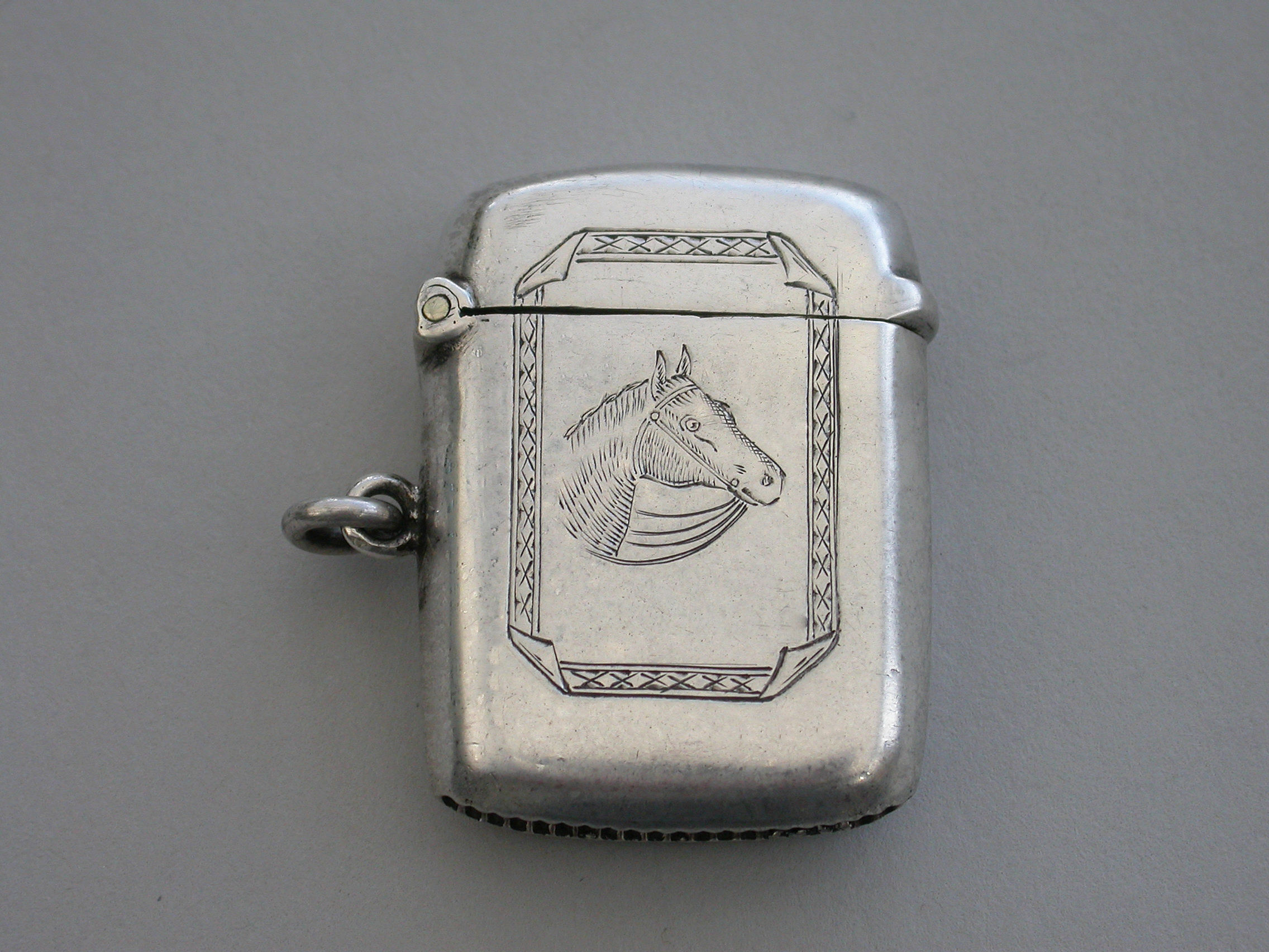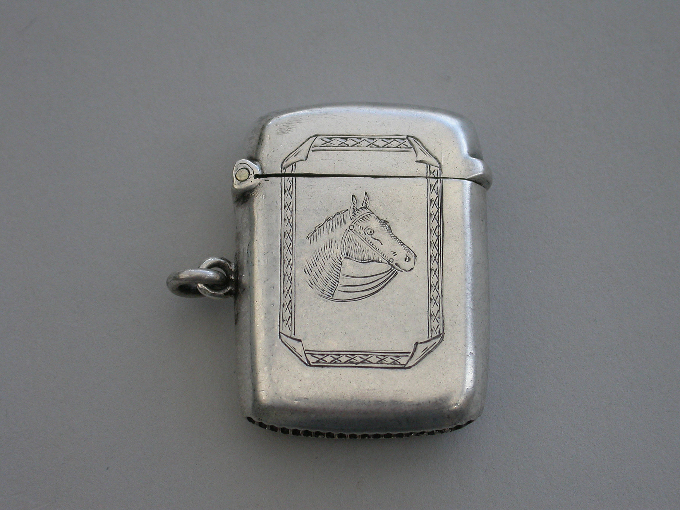 An Edwardian silver Vesta Case of plain rounded rectangular form with sprung hinged lid, the face engraved with a Horses Head within a picture frame border. Attached suspension ring.
