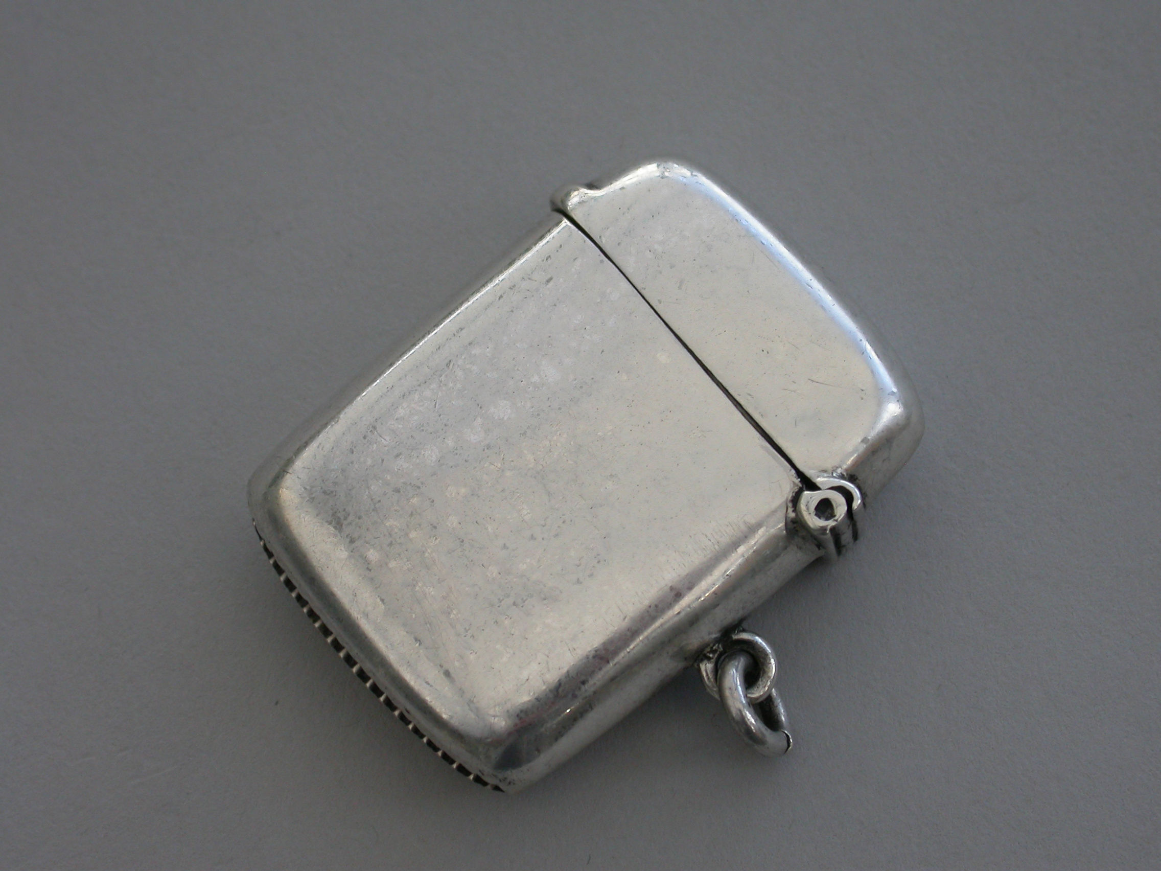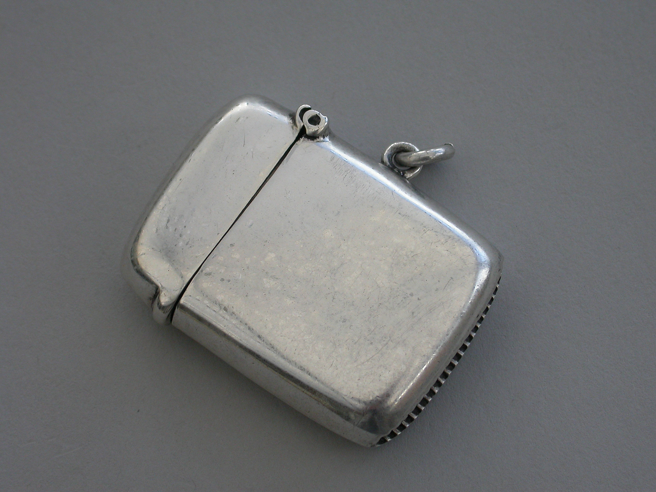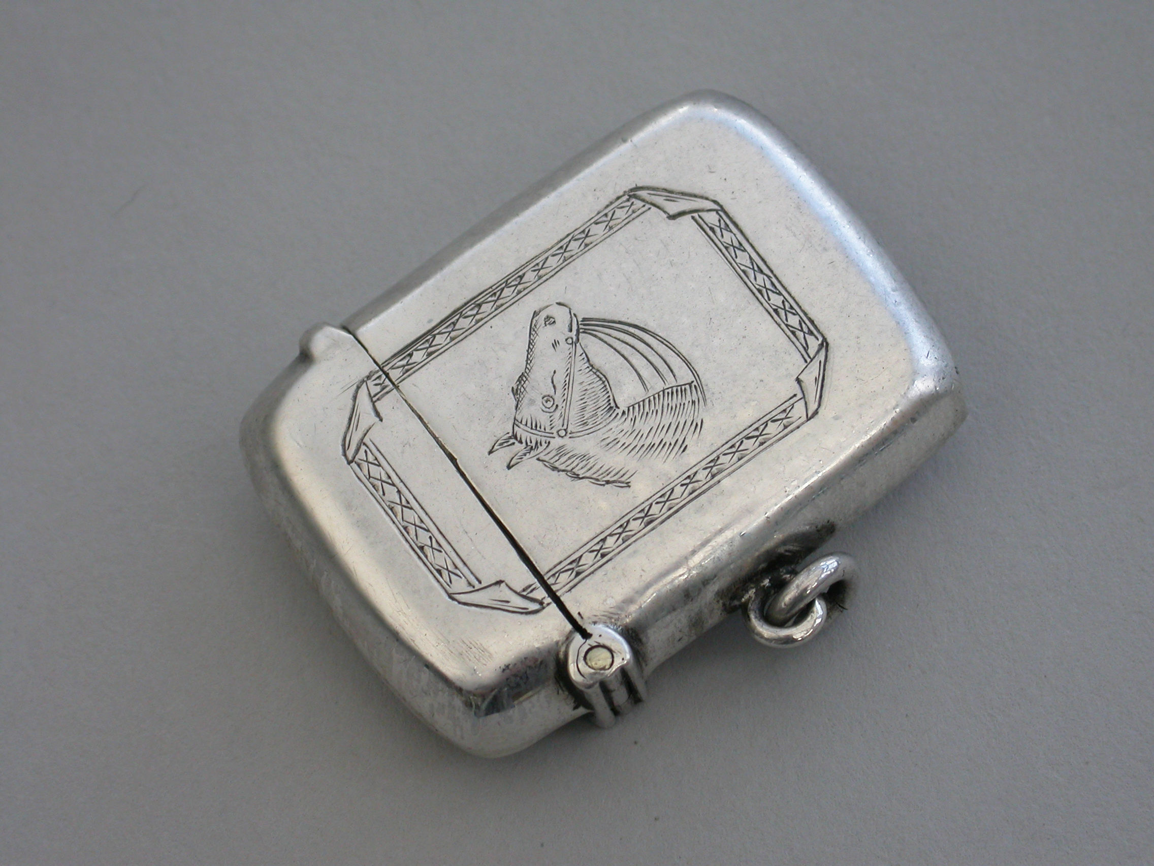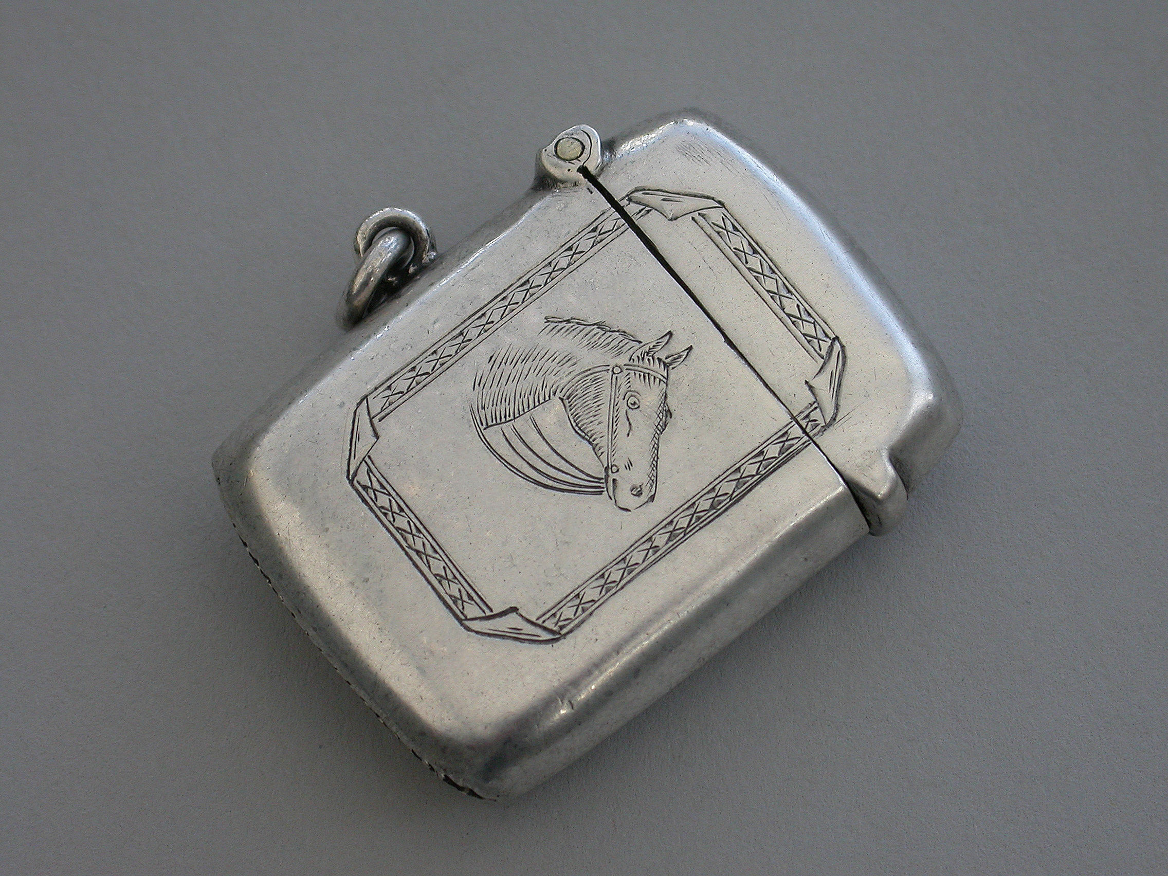 An Edwardian silver Vesta Case of plain rounded rectangular form with sprung hinged lid, the face engraved with a Horses Head within a picture frame border. Attached suspension ring.