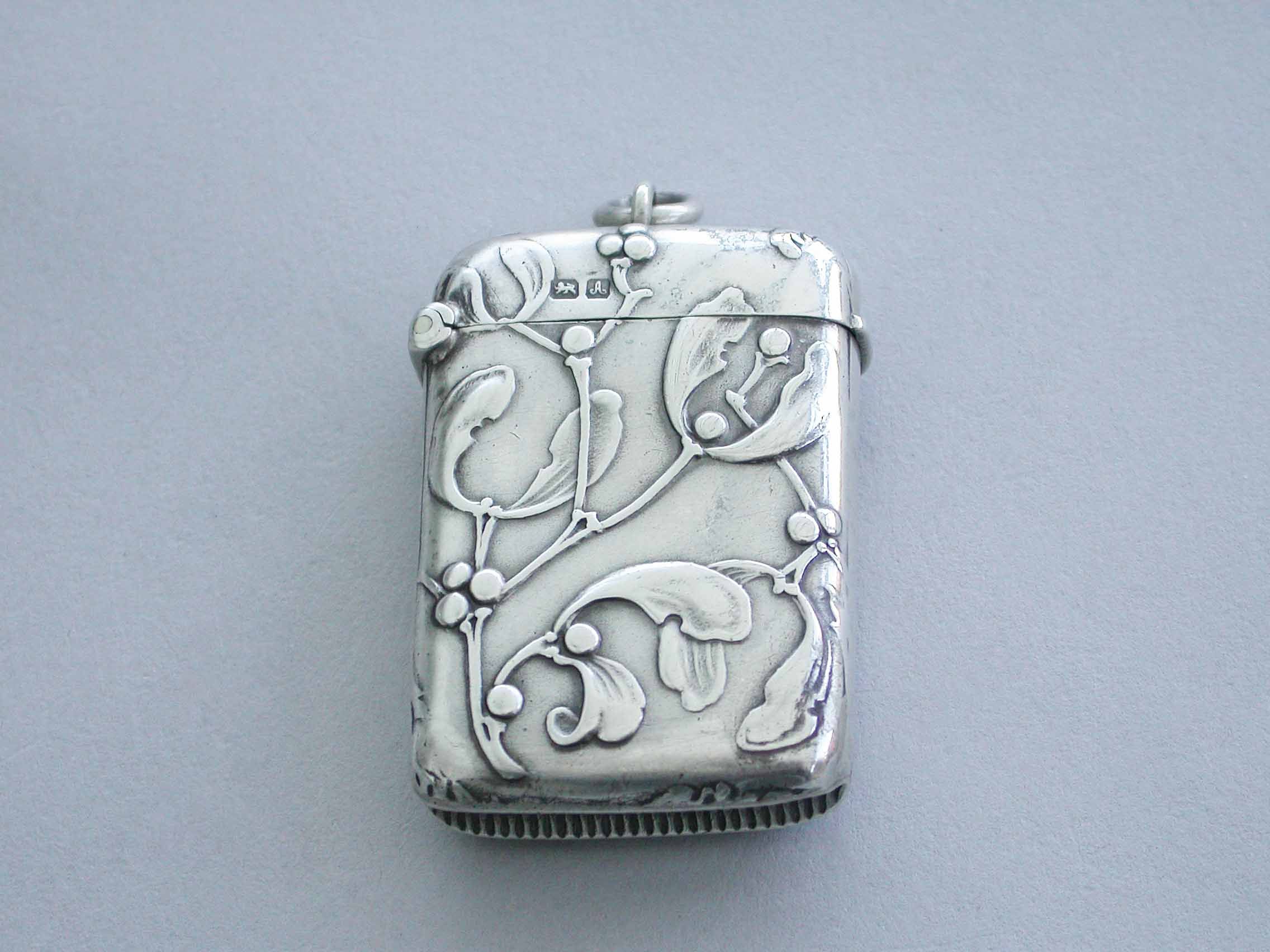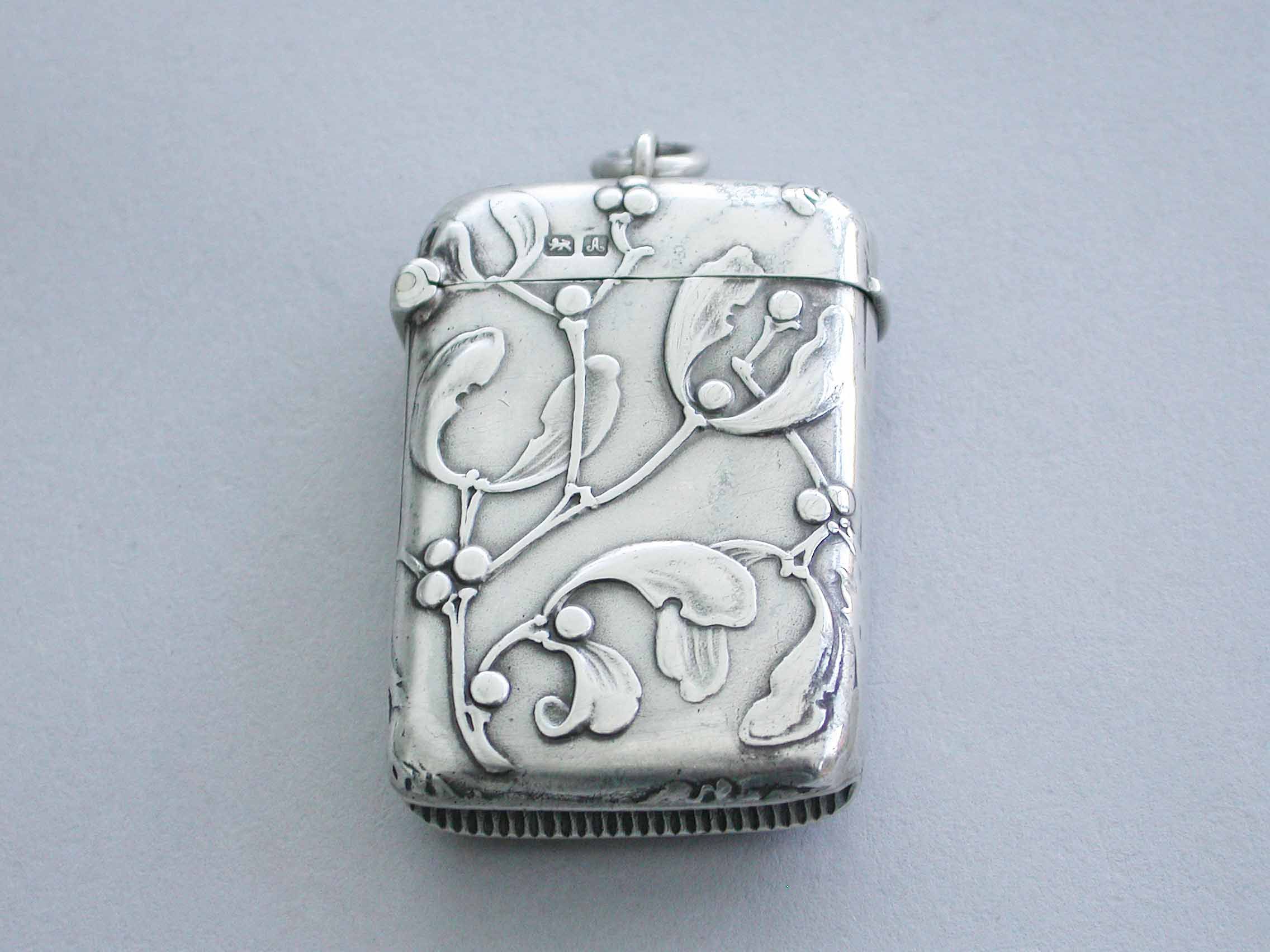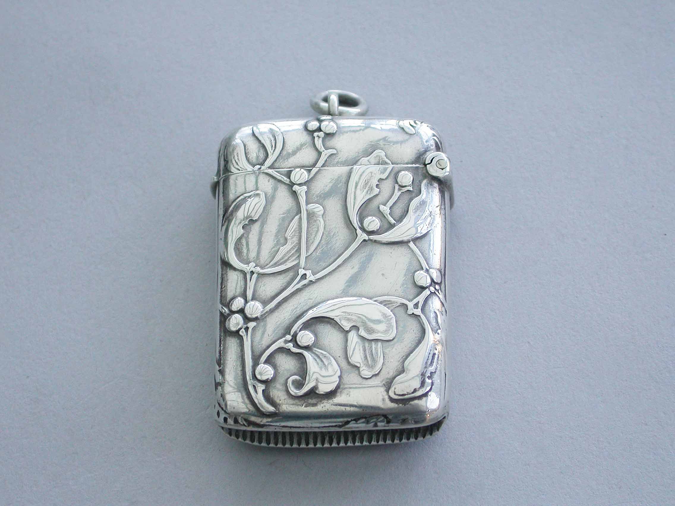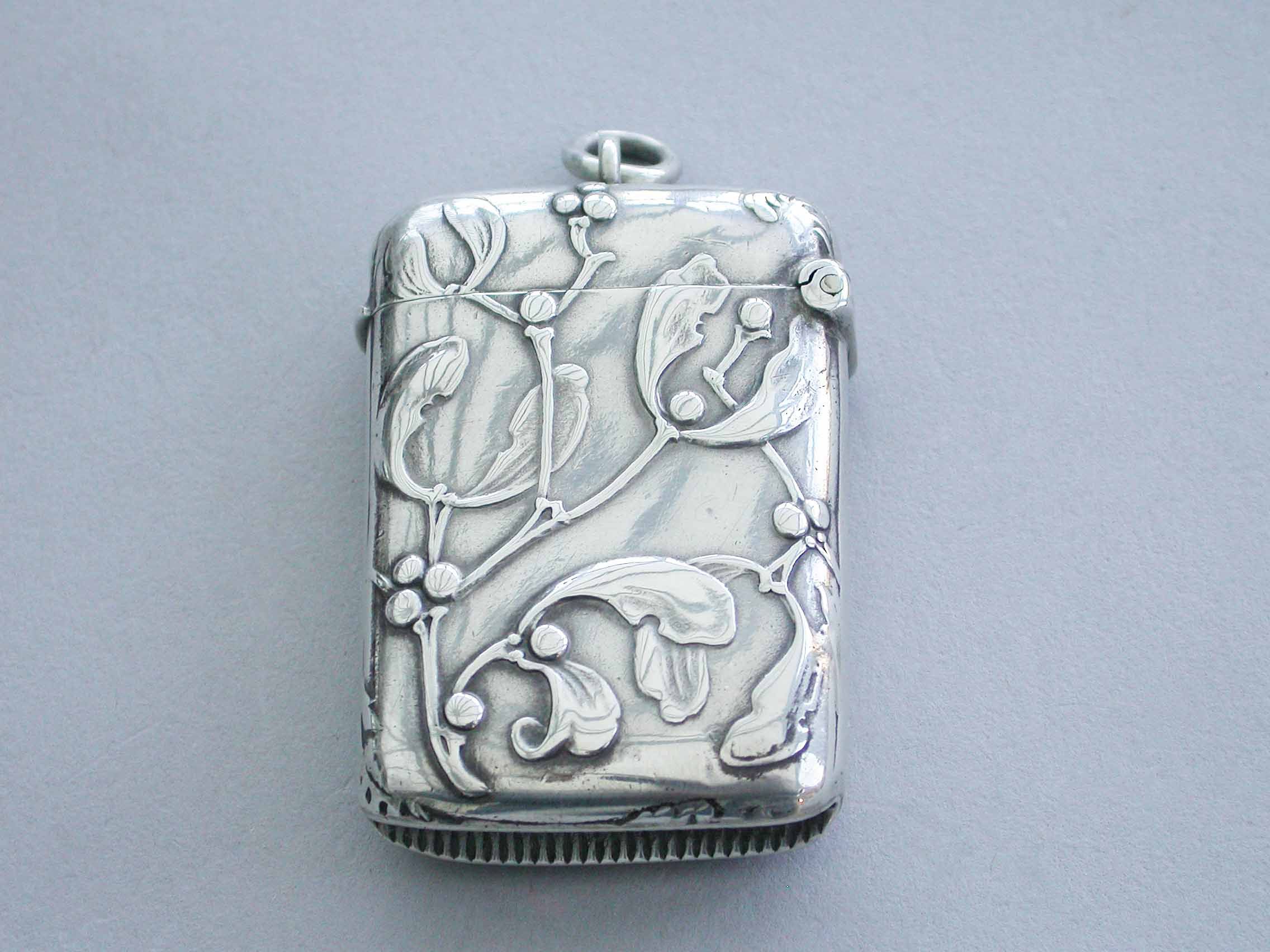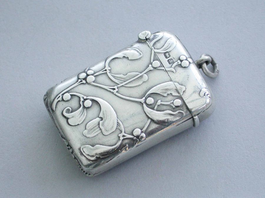 A good Edwardian silver Vesta Case of rounded rectangular form with sprung hinged lid and attached suspension ring, both sides with raised decoration depicting sprigs of mistletoe in the Art Nouveau style.