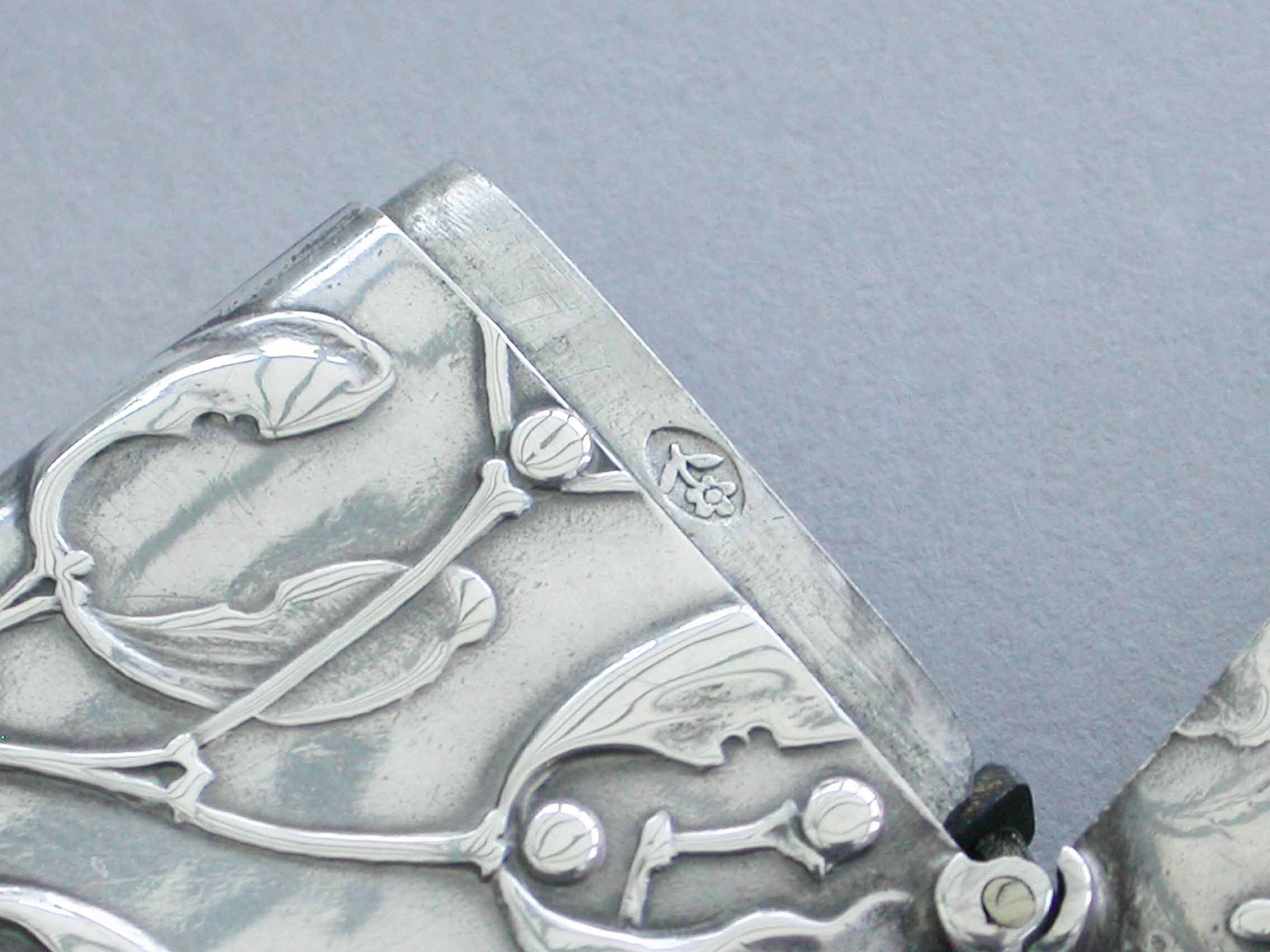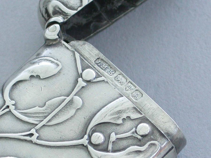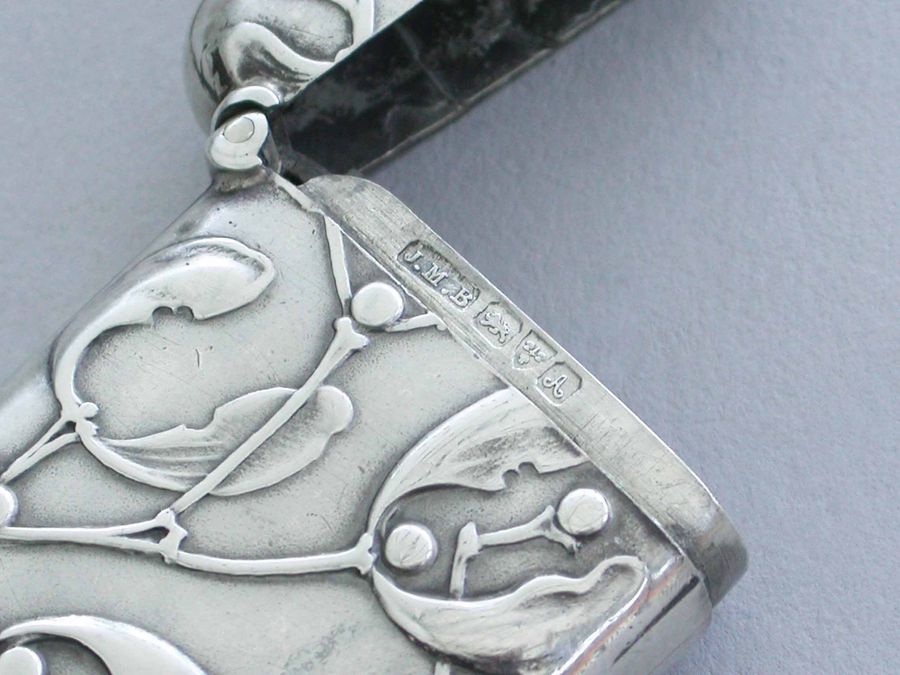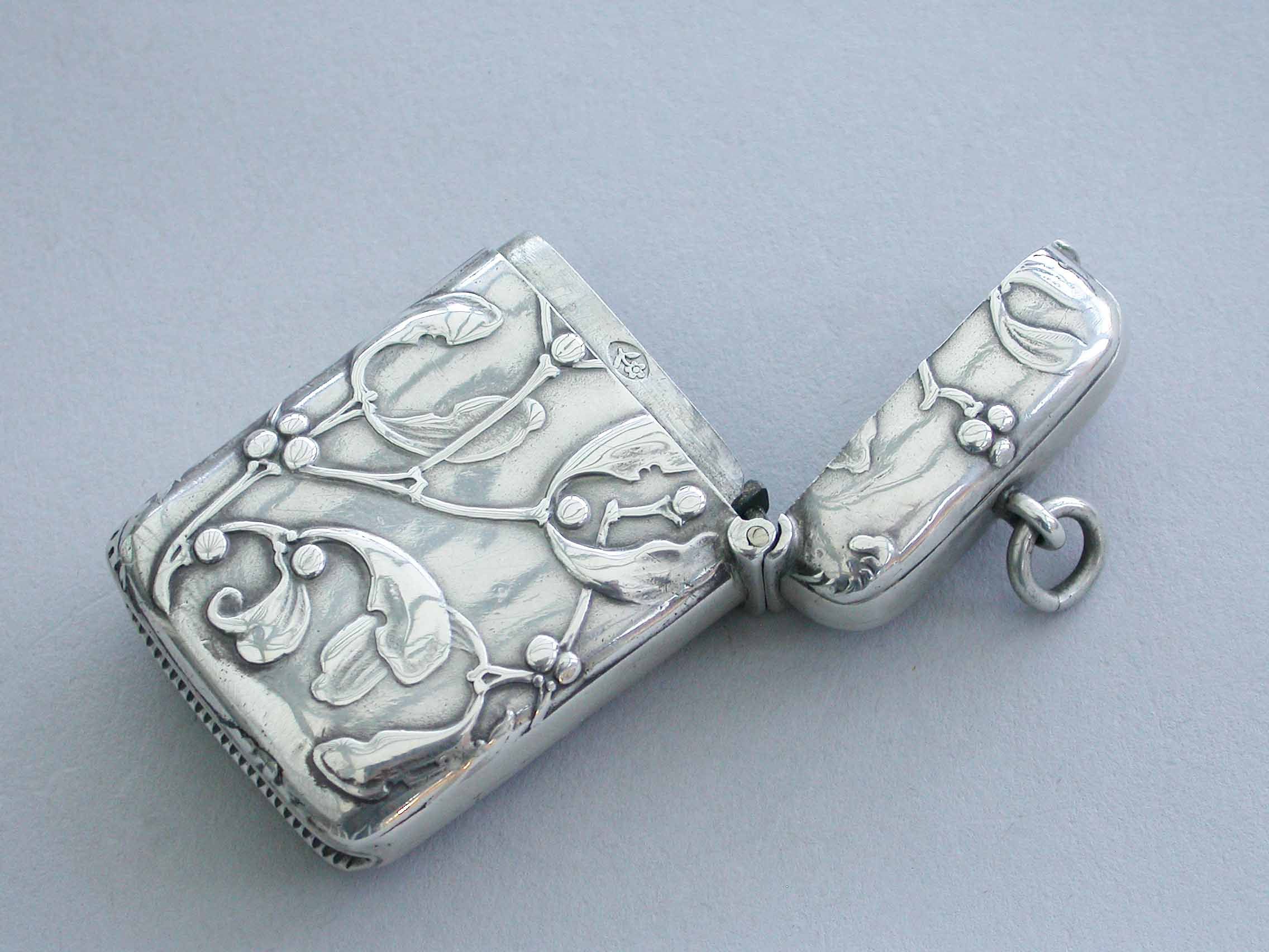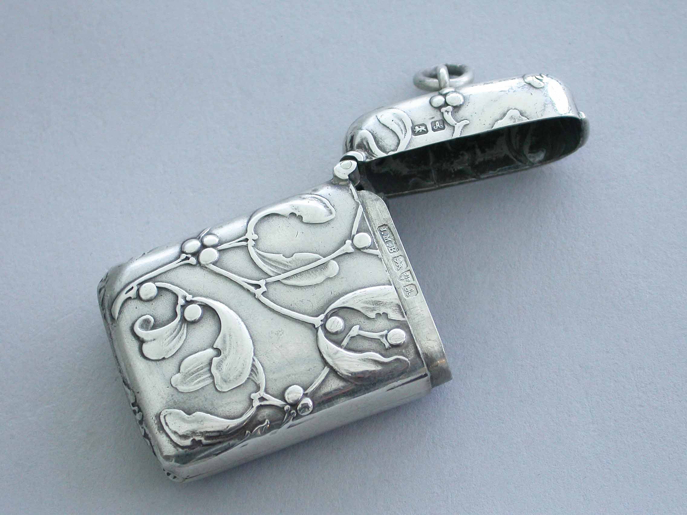 A good Edwardian silver Vesta Case of rounded rectangular form with sprung hinged lid and attached suspension ring, both sides with raised decoration depicting sprigs of mistletoe in the Art Nouveau style.