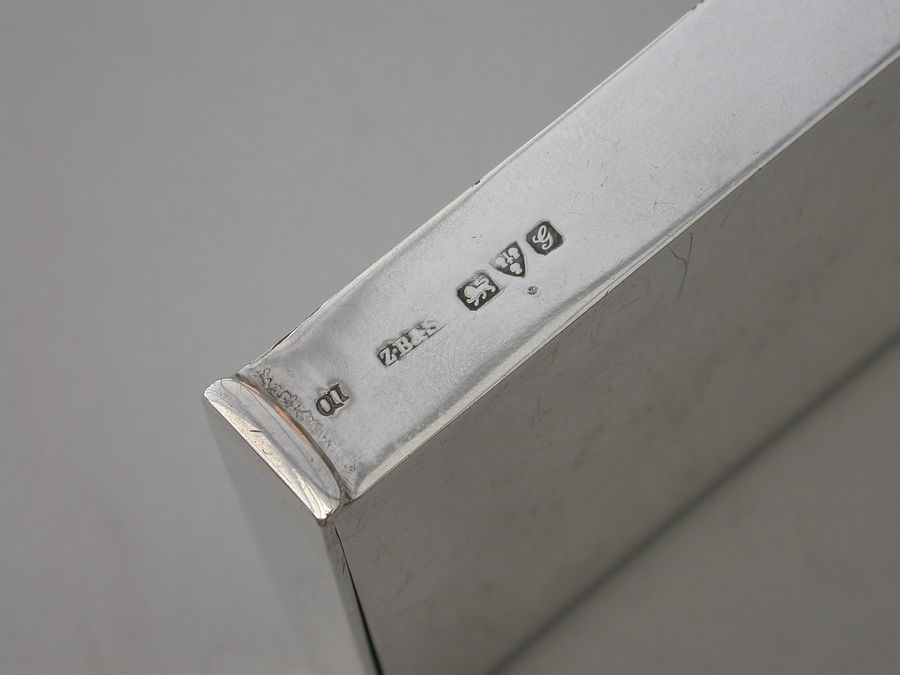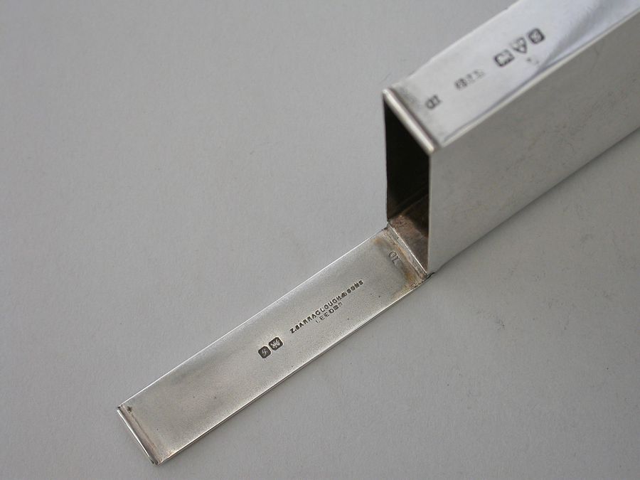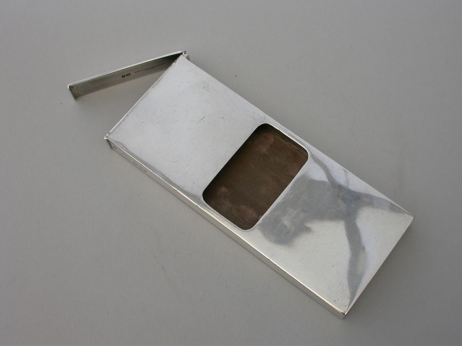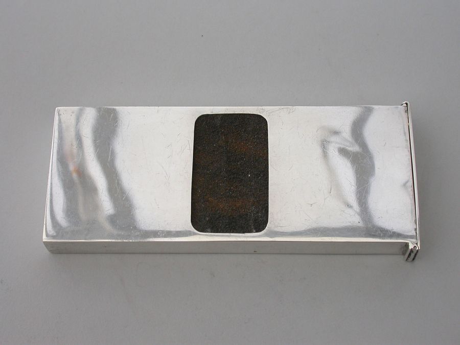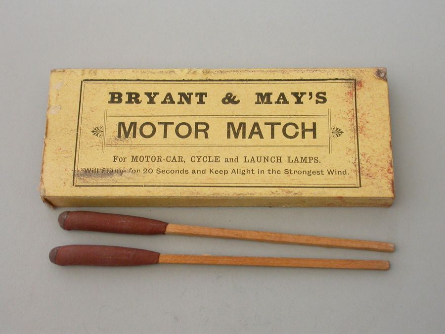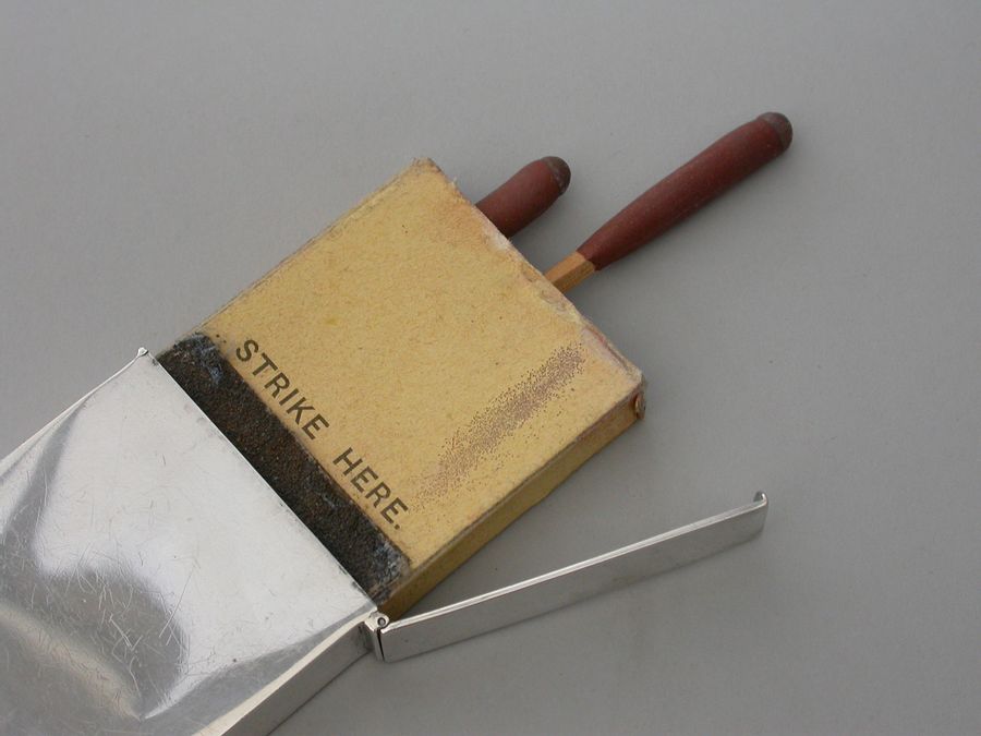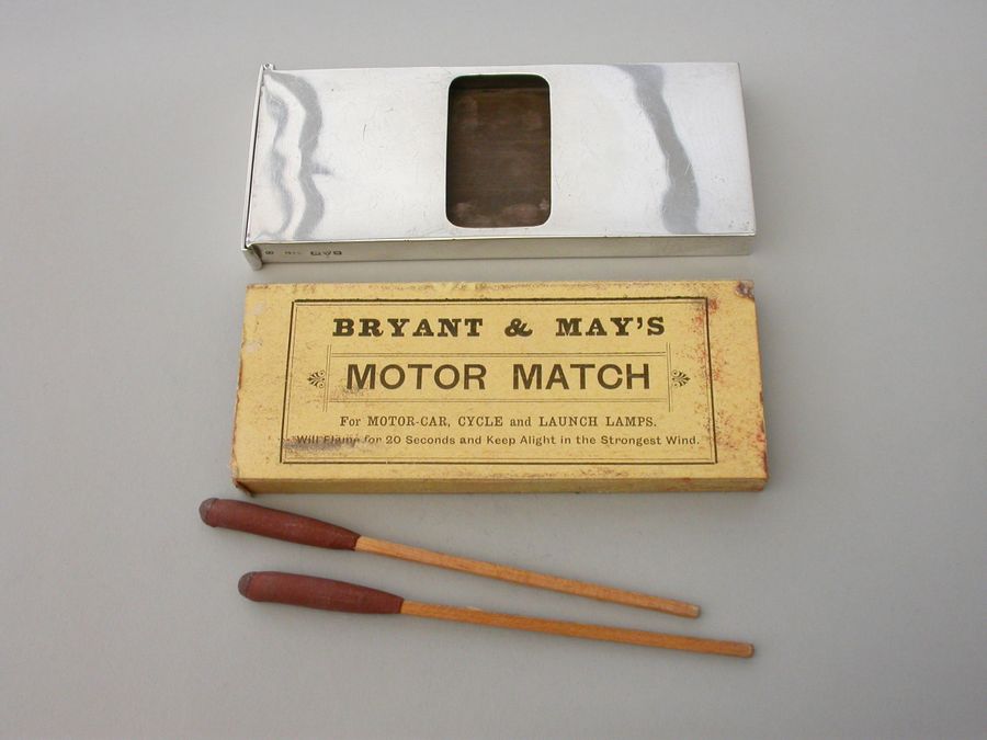 An unusual Edwardian large silver Matchbox Case of plain narrow rectangualr form with hinged lid and aperture for striking, containing an original box of Bryant & May's ""Motor Matches"", for motor-car, cycle and launch lamps. Will flame for 20 seconds and keep alight in the strongest wind. Complete with two original matches.