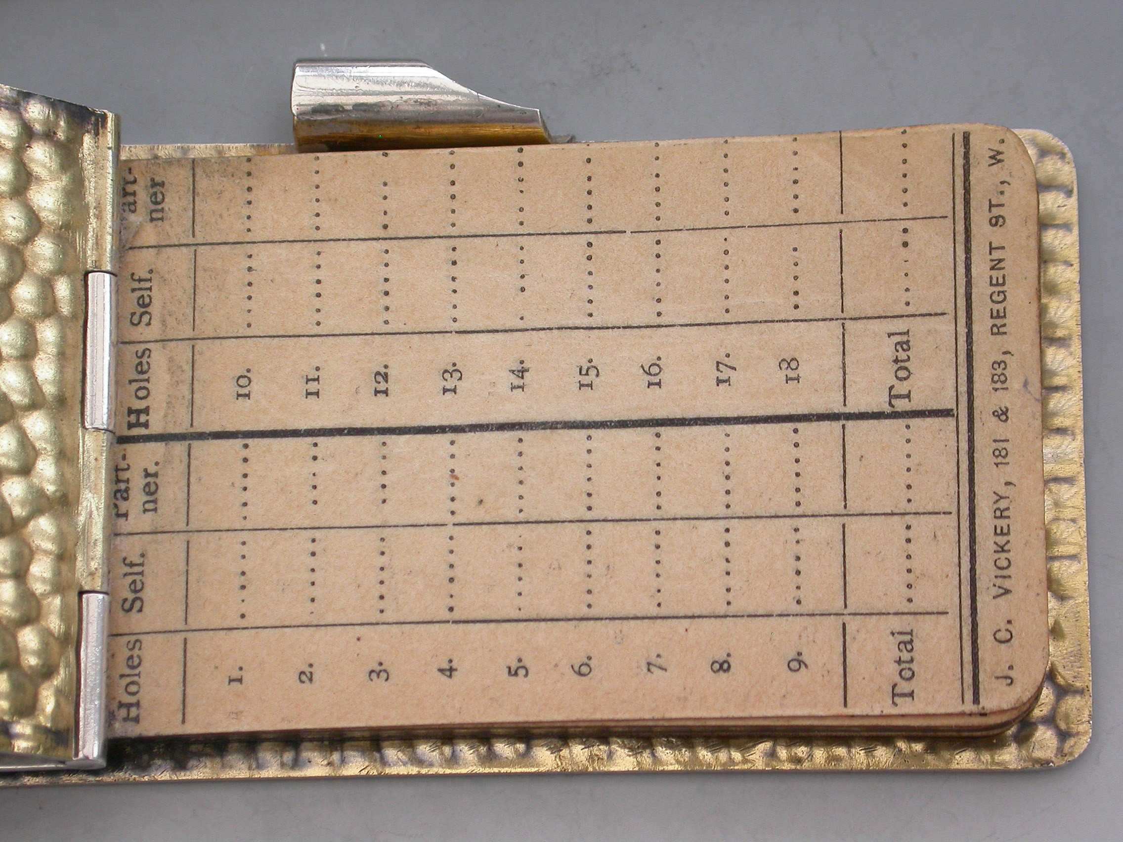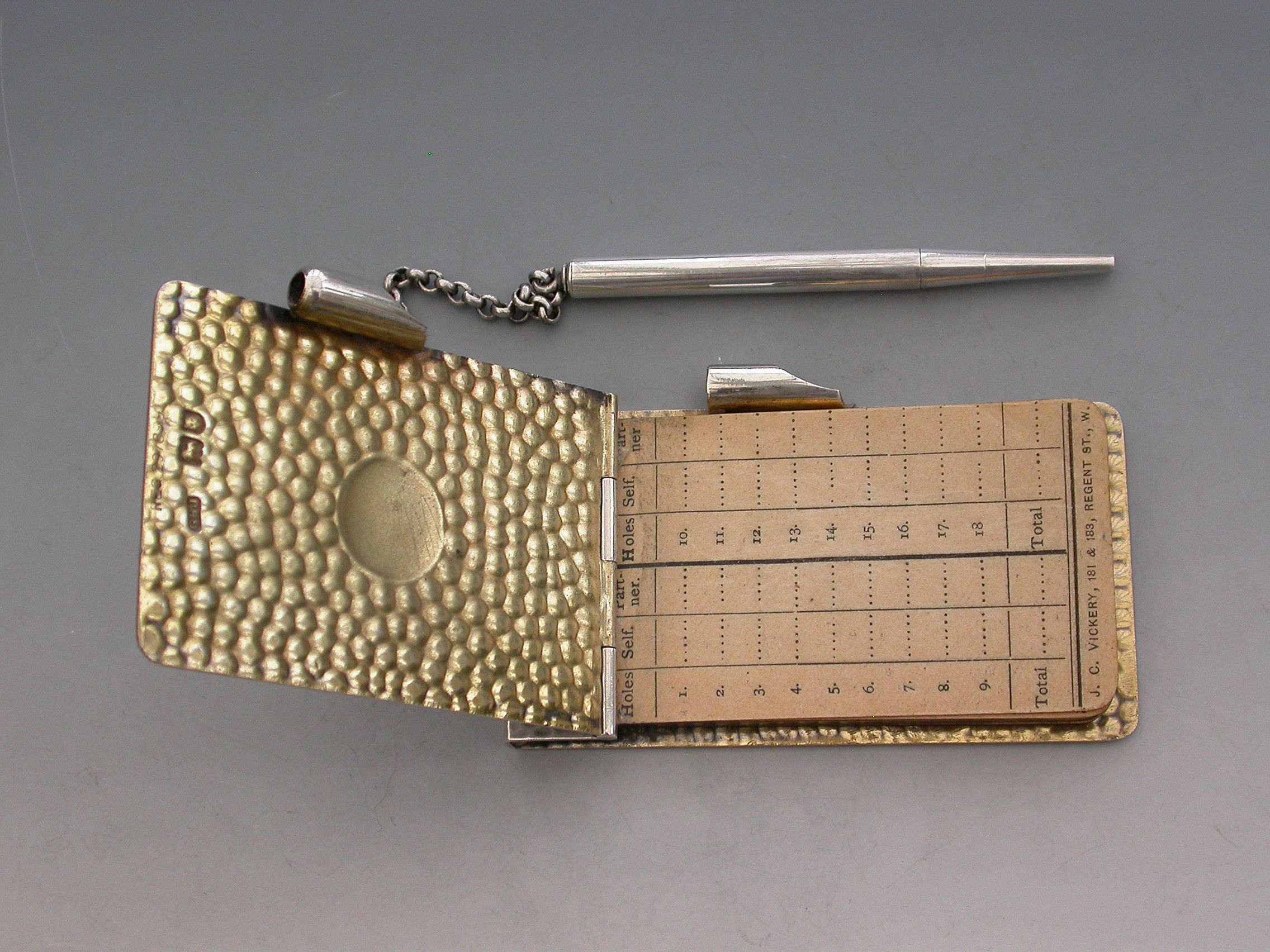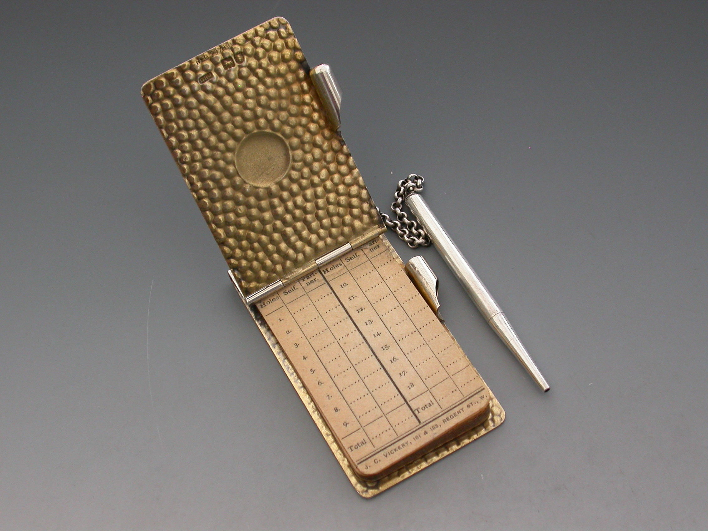 A good quality Edwardian silver mounted Golf Score Card of hinged rectangular note pad form, the silver covers with hammered decoration and a vacant circular cartouche, the card held closed with a silver Propelling Pencil attached to a chain with circular suspension ring, silver gilt interior and score cards marked from 1 - 18., by J C Vickery of Regent Street, London.
