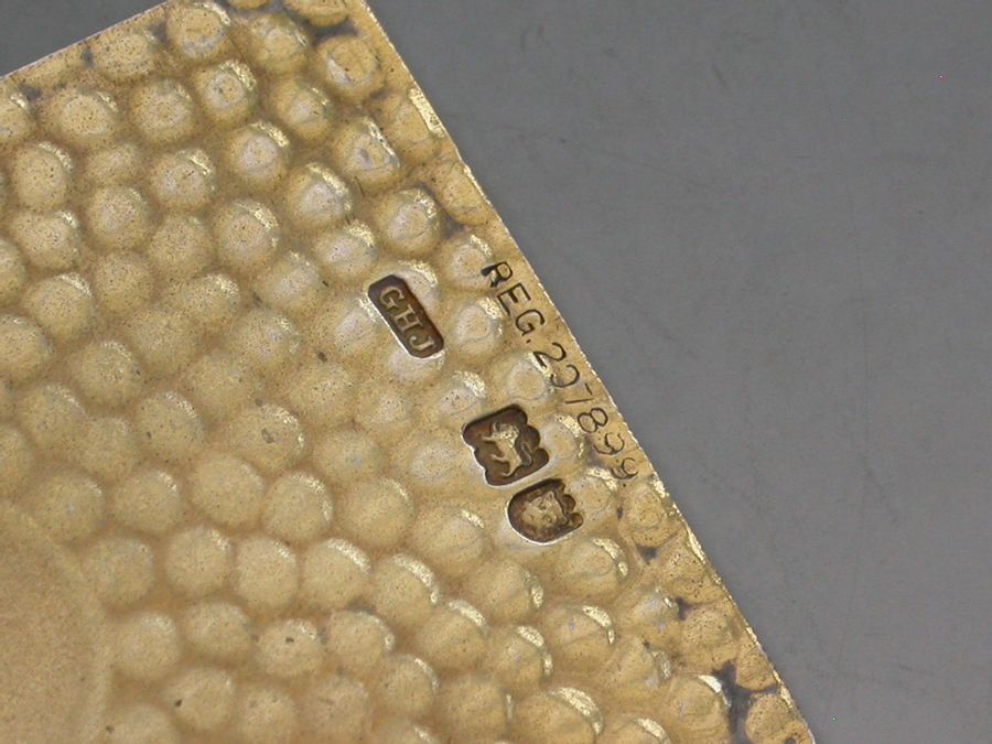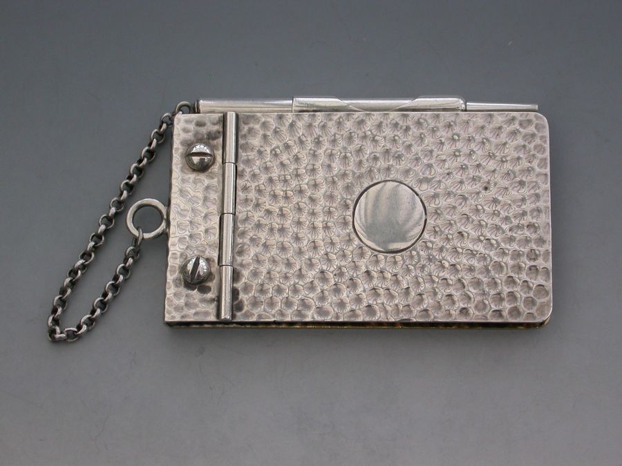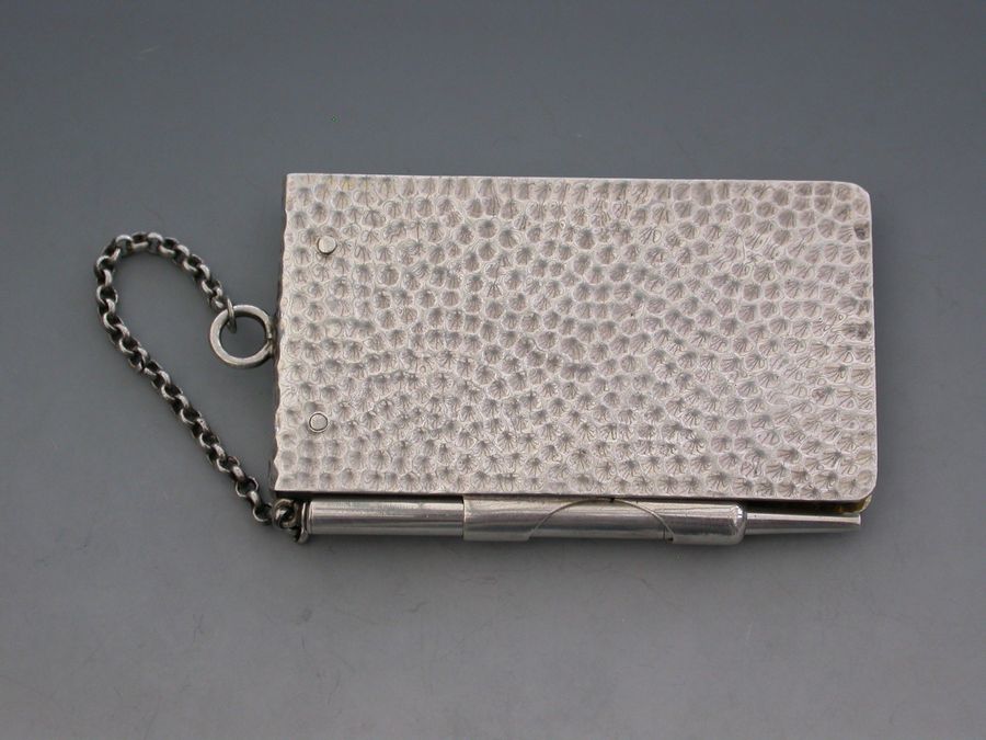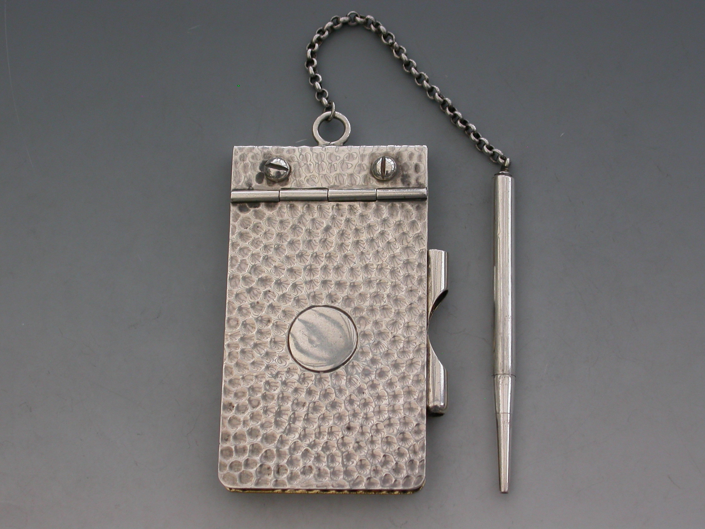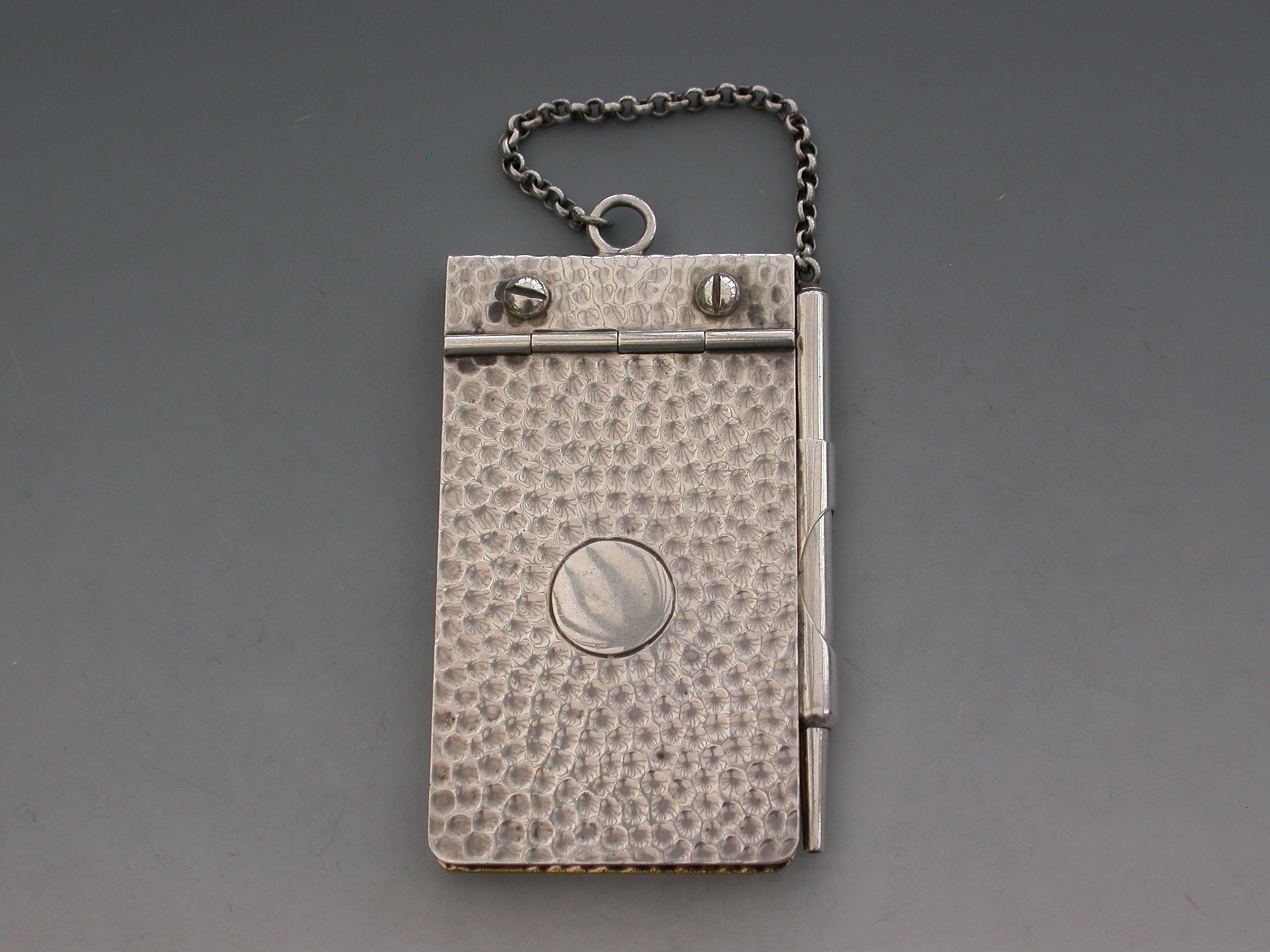 A good quality Edwardian silver mounted Golf Score Card of hinged rectangular note pad form, the silver covers with hammered decoration and a vacant circular cartouche, the card held closed with a silver Propelling Pencil attached to a chain with circular suspension ring, silver gilt interior and score cards marked from 1 - 18., by J C Vickery of Regent Street, London.