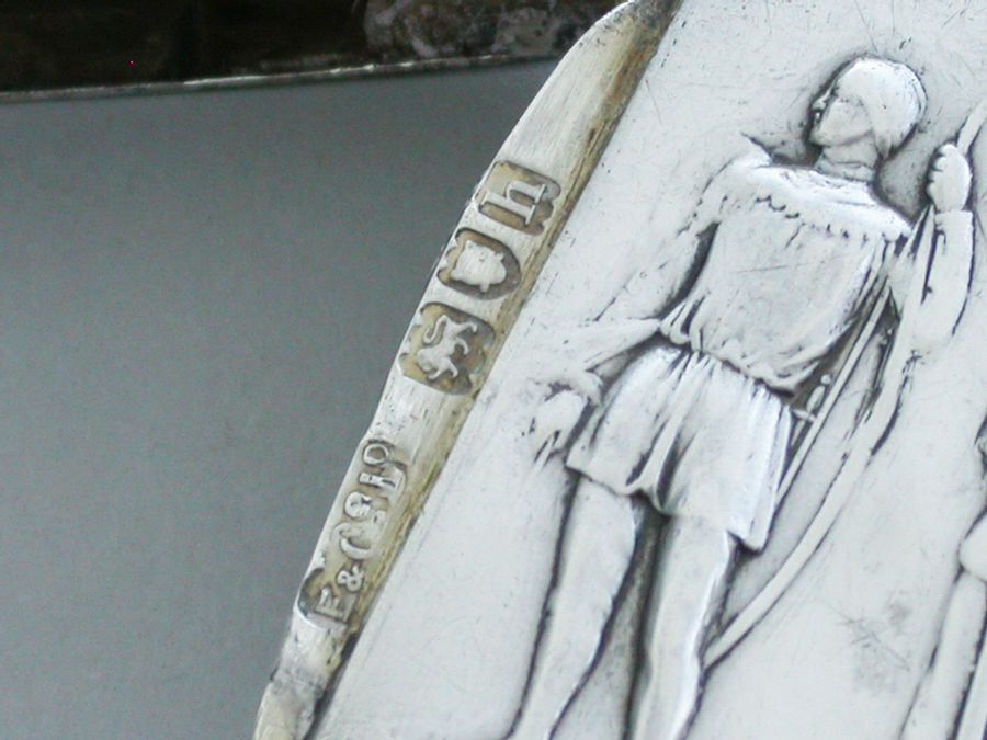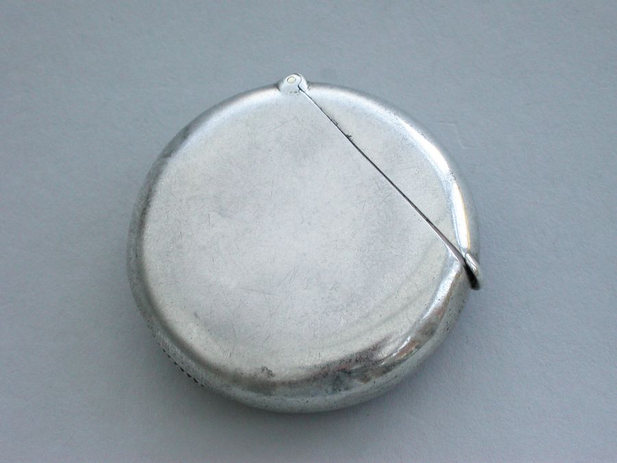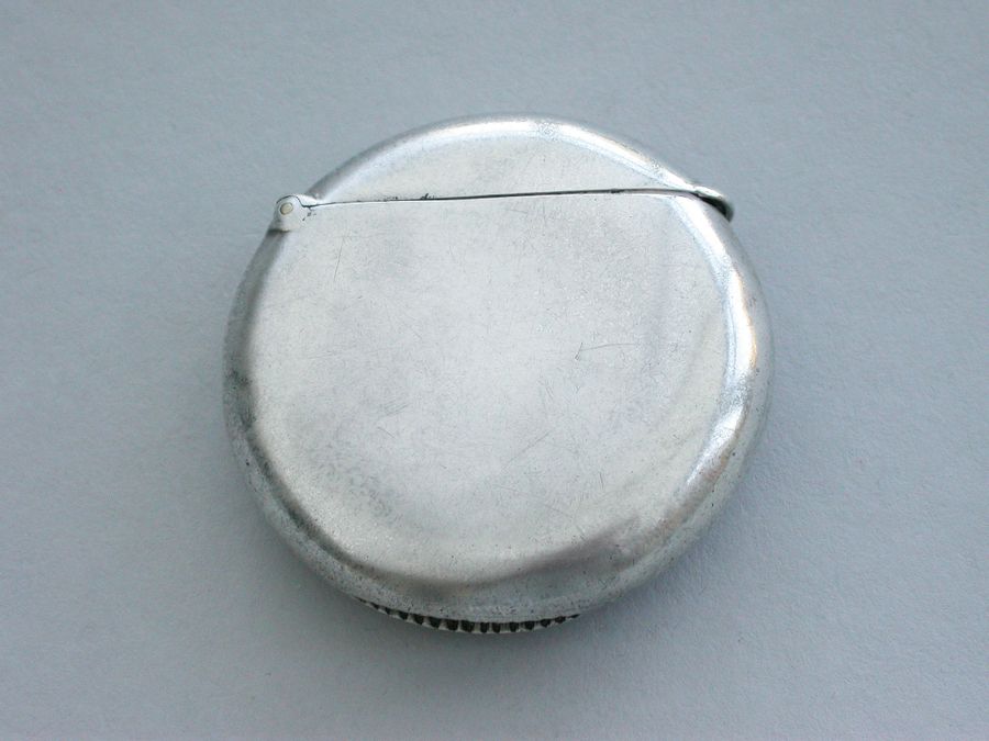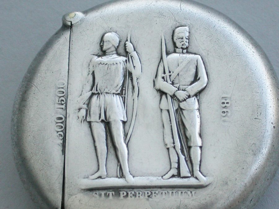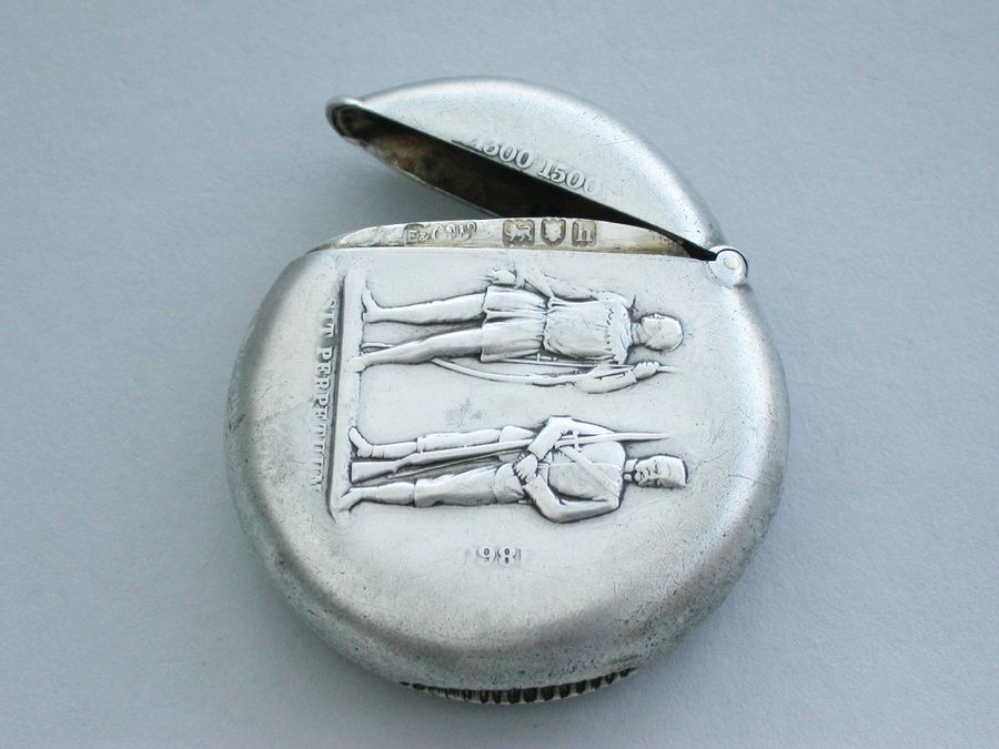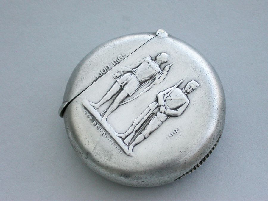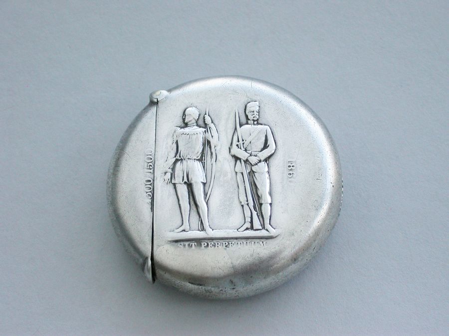 A rare Edwardian silver Vesta Case of circular form with hinged lid, the face embossed with the badge of The National Rifle Association of the United Kingdom, depicting a bowman and a rifleman standing next to each other above the motto 'Sit Perpetuum' (may it last forever).