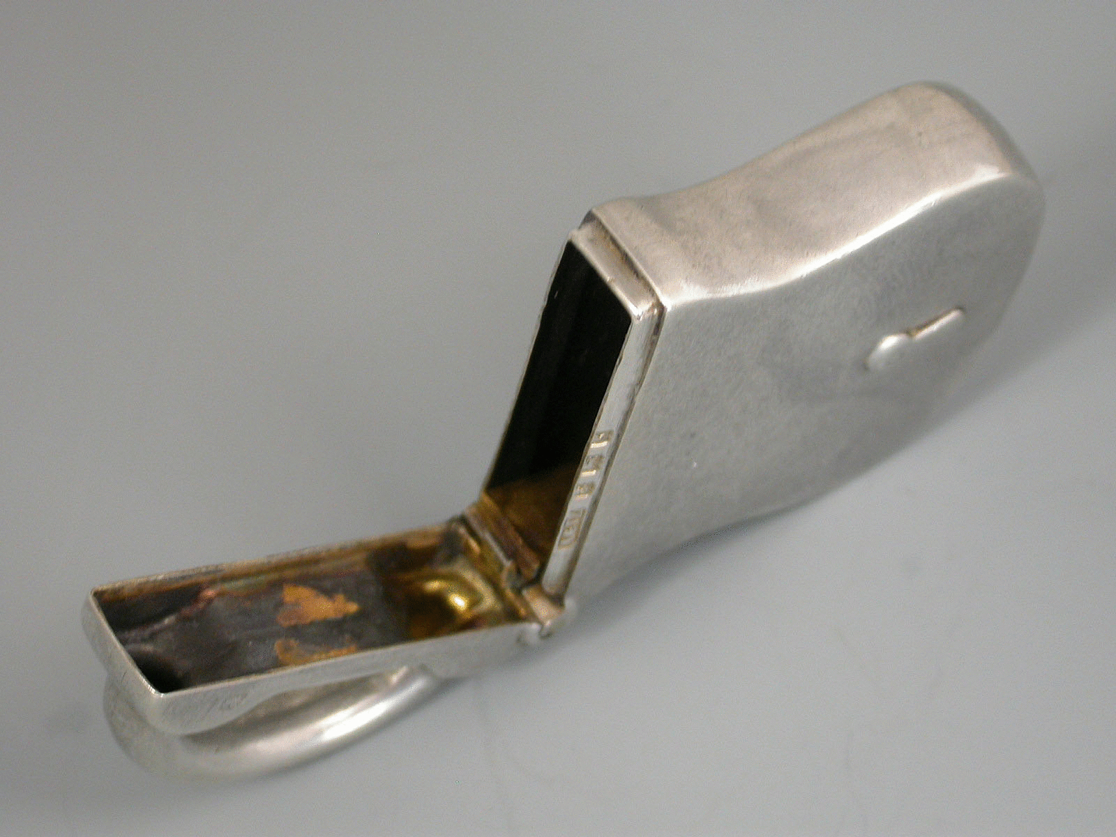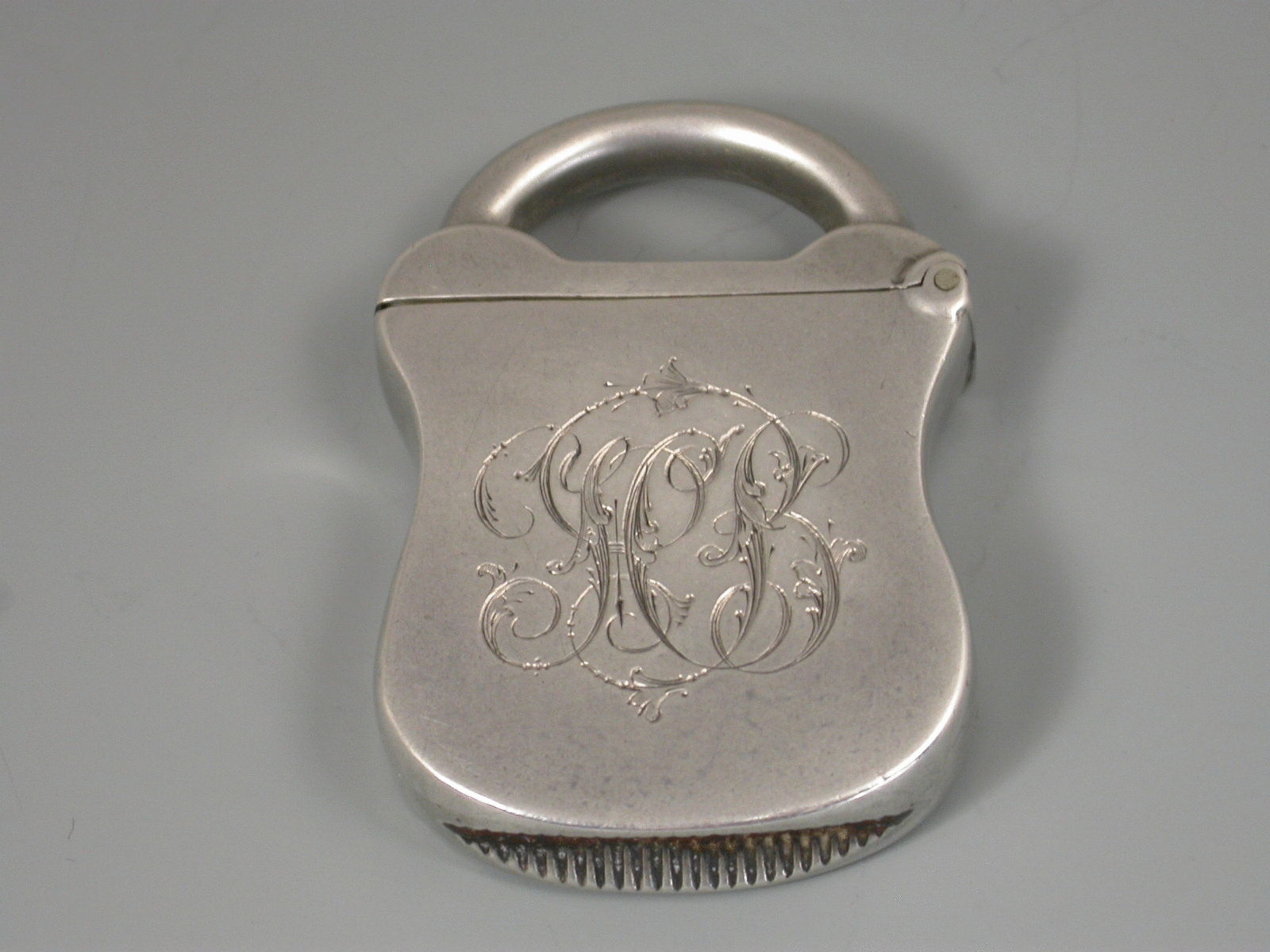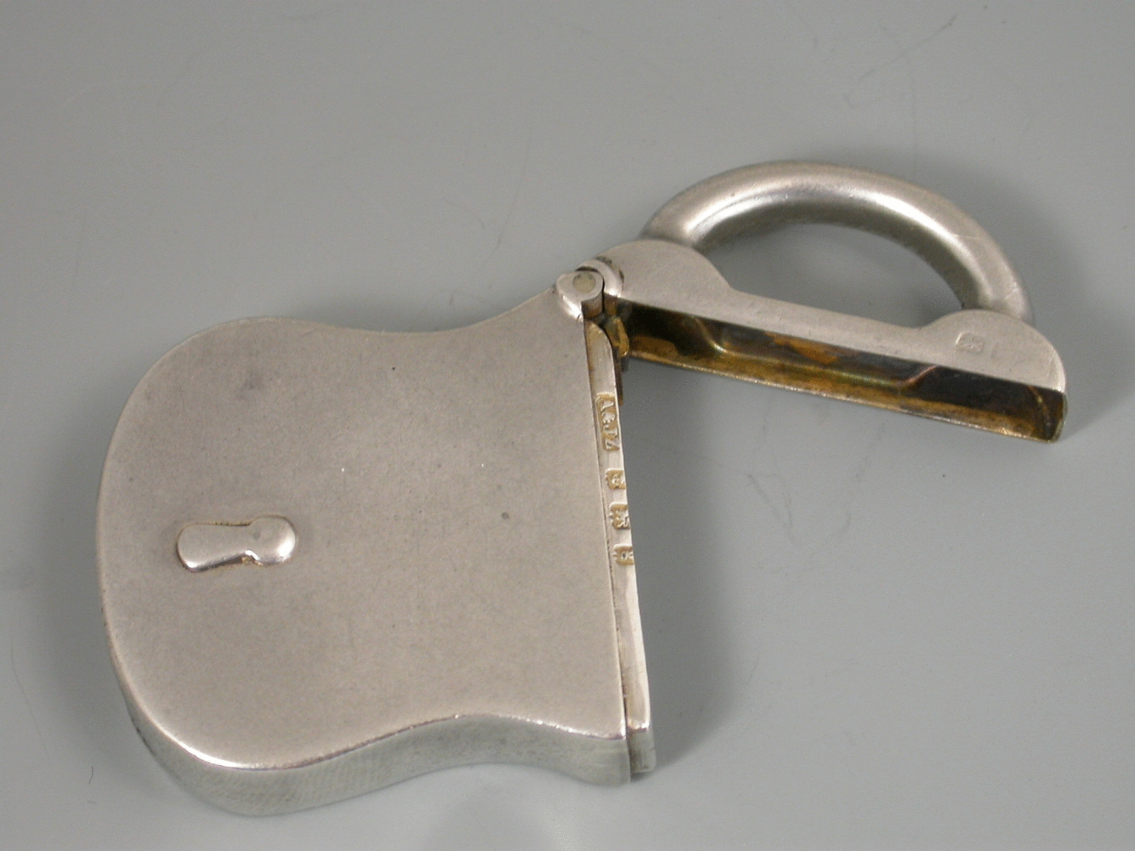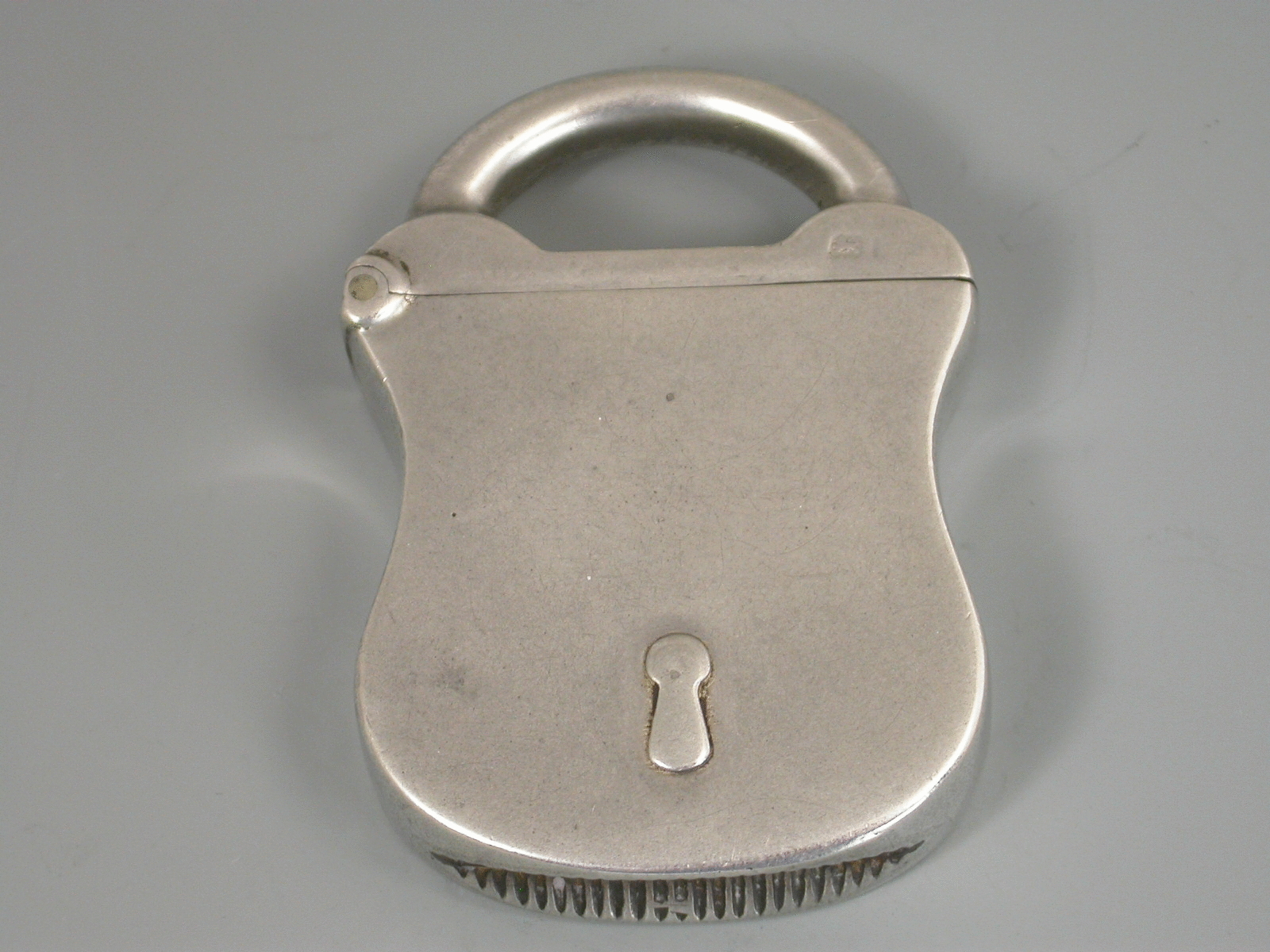 A rare Edwardian silver Vesta Case made in the form of a large padlock with sprung hinged flip top lid, the face engraved with contemporary initials 'HB'.