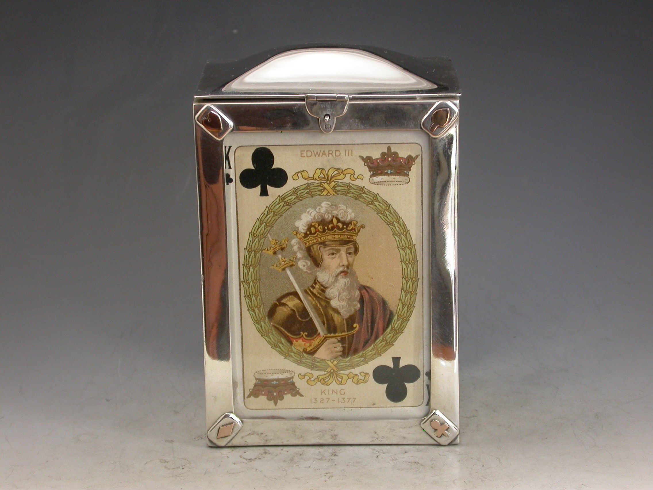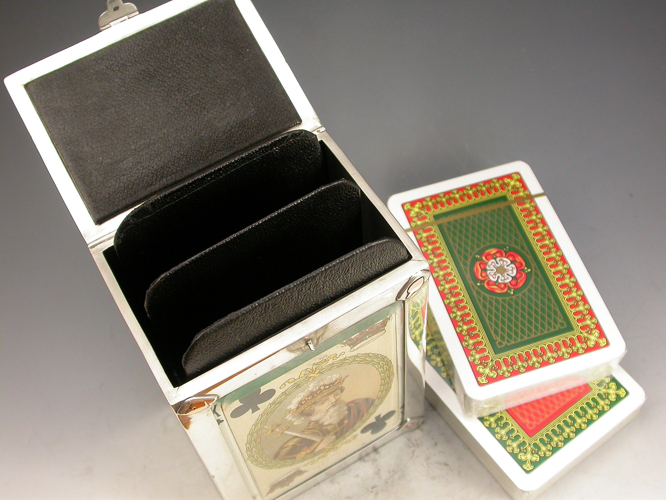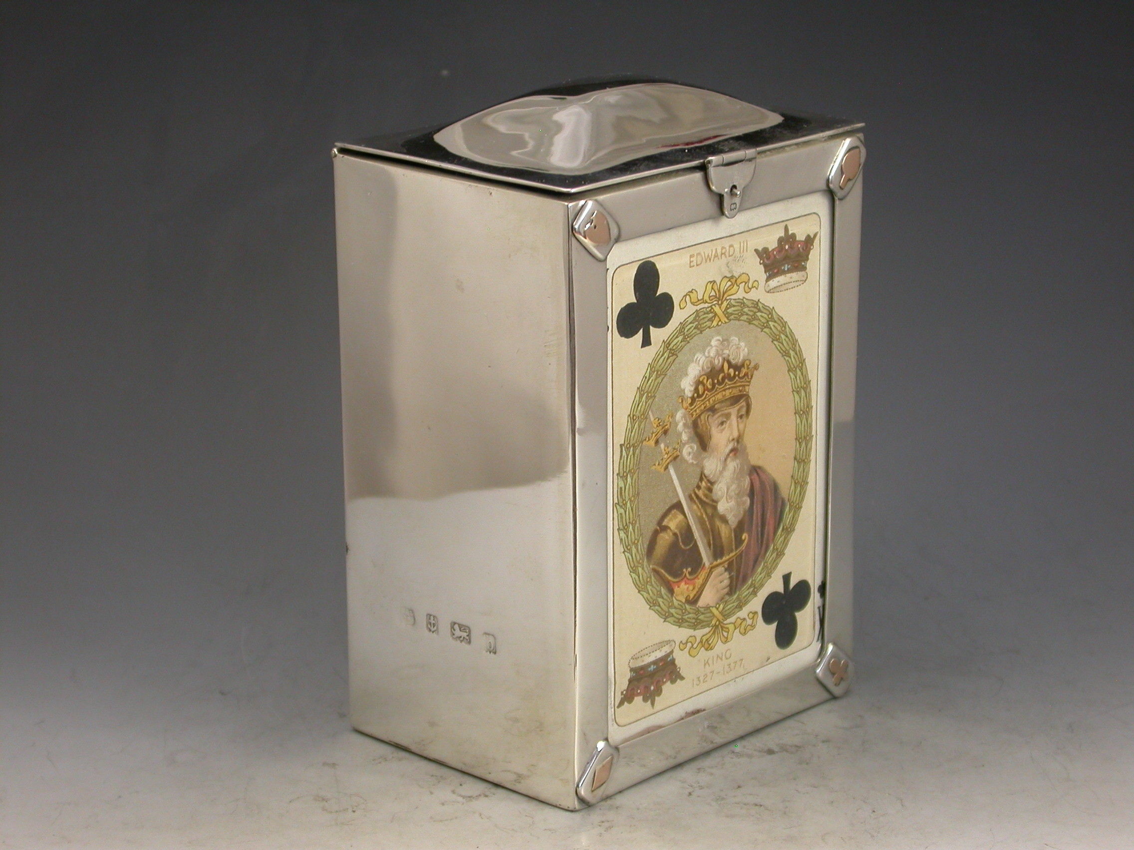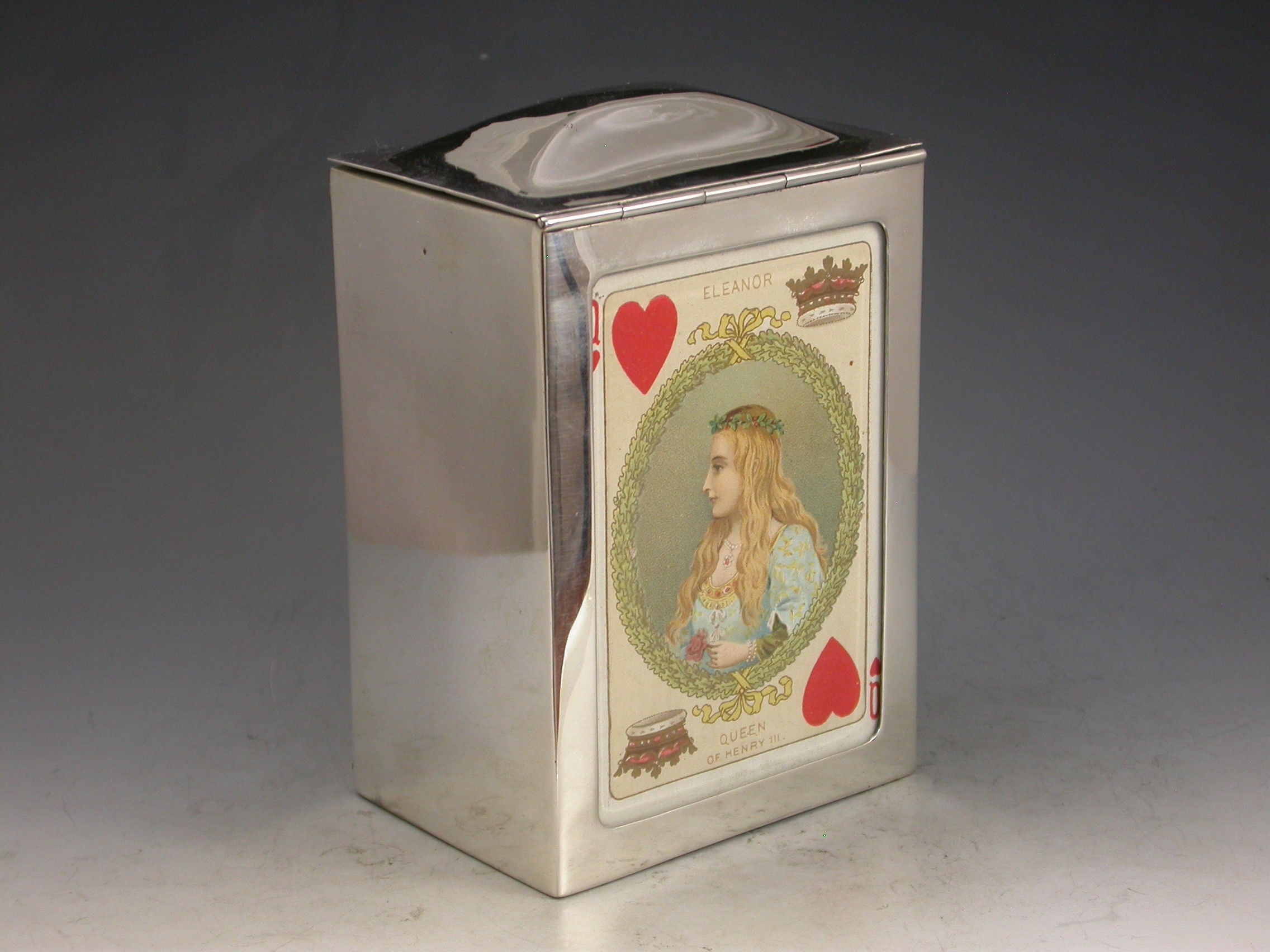 A good quality Edwardian silver twin-pack Card Box of rectangular form with hinged domed top, two glazed panels covering contemporary playing cards from a pack made to commemorate The Diamond Jubilee of Queen Victoria in 1897 depicting English Royals. An applied accent to each corner of the box depicting the four suits highlighted in gold. The internal leather covered sprung pop-up mechanism presents the two packs for use when the lid is opened.