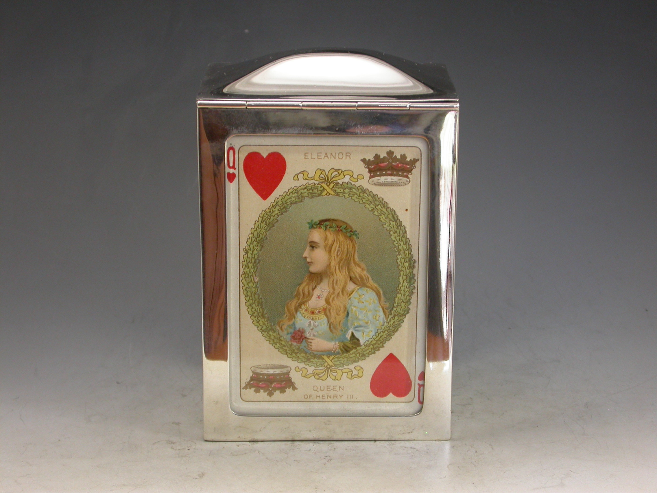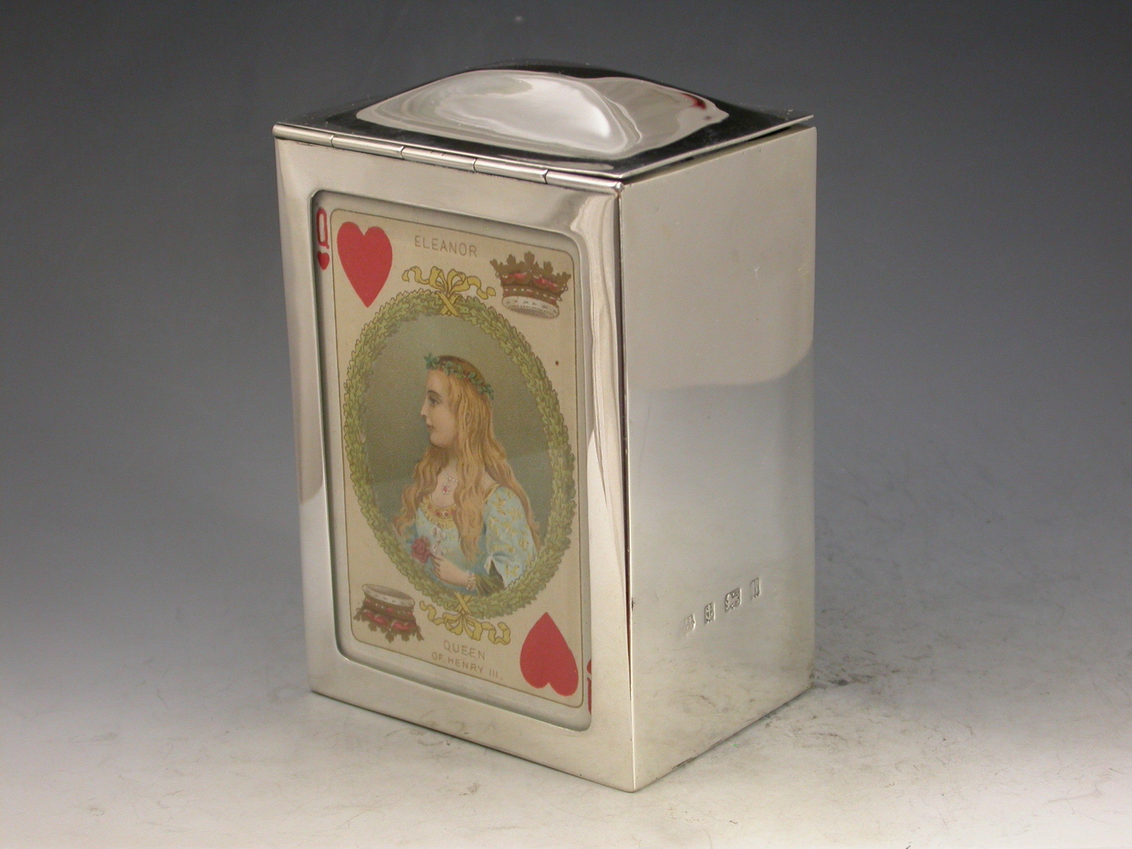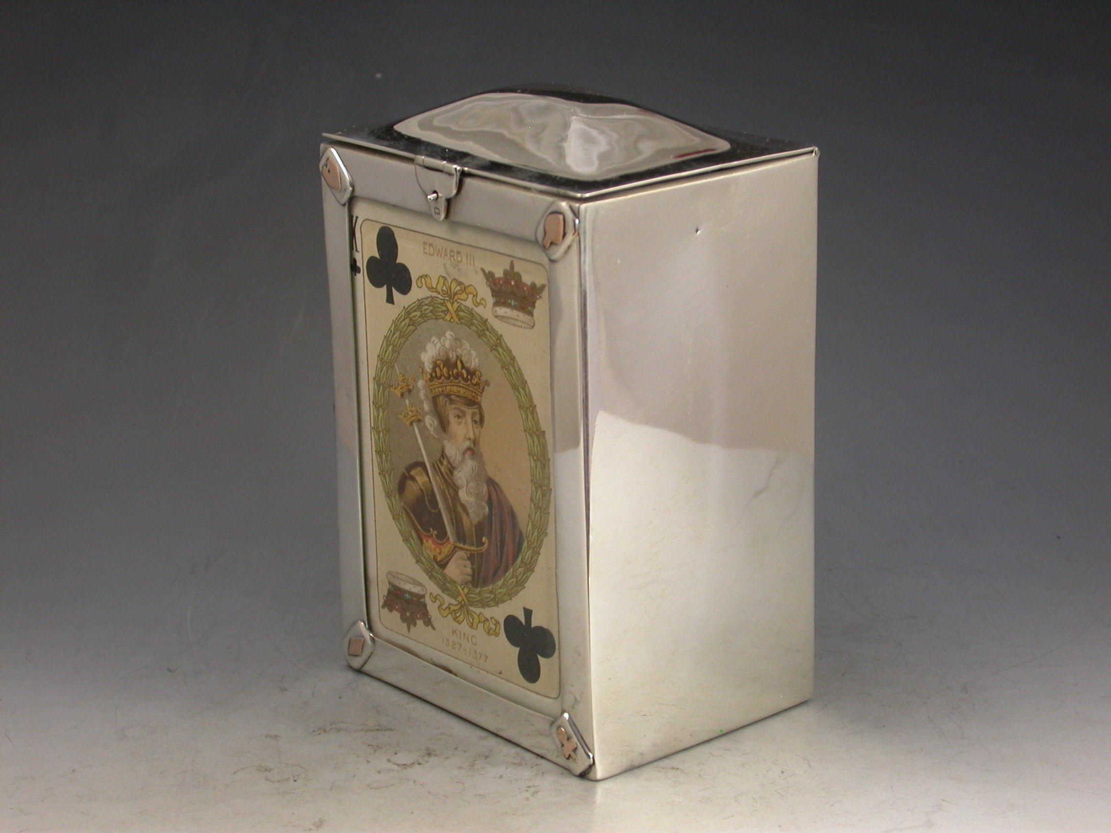 A good quality Edwardian silver twin-pack Card Box of rectangular form with hinged domed top, two glazed panels covering contemporary playing cards from a pack made to commemorate The Diamond Jubilee of Queen Victoria in 1897 depicting English Royals. An applied accent to each corner of the box depicting the four suits highlighted in gold. The internal leather covered sprung pop-up mechanism presents the two packs for use when the lid is opened.