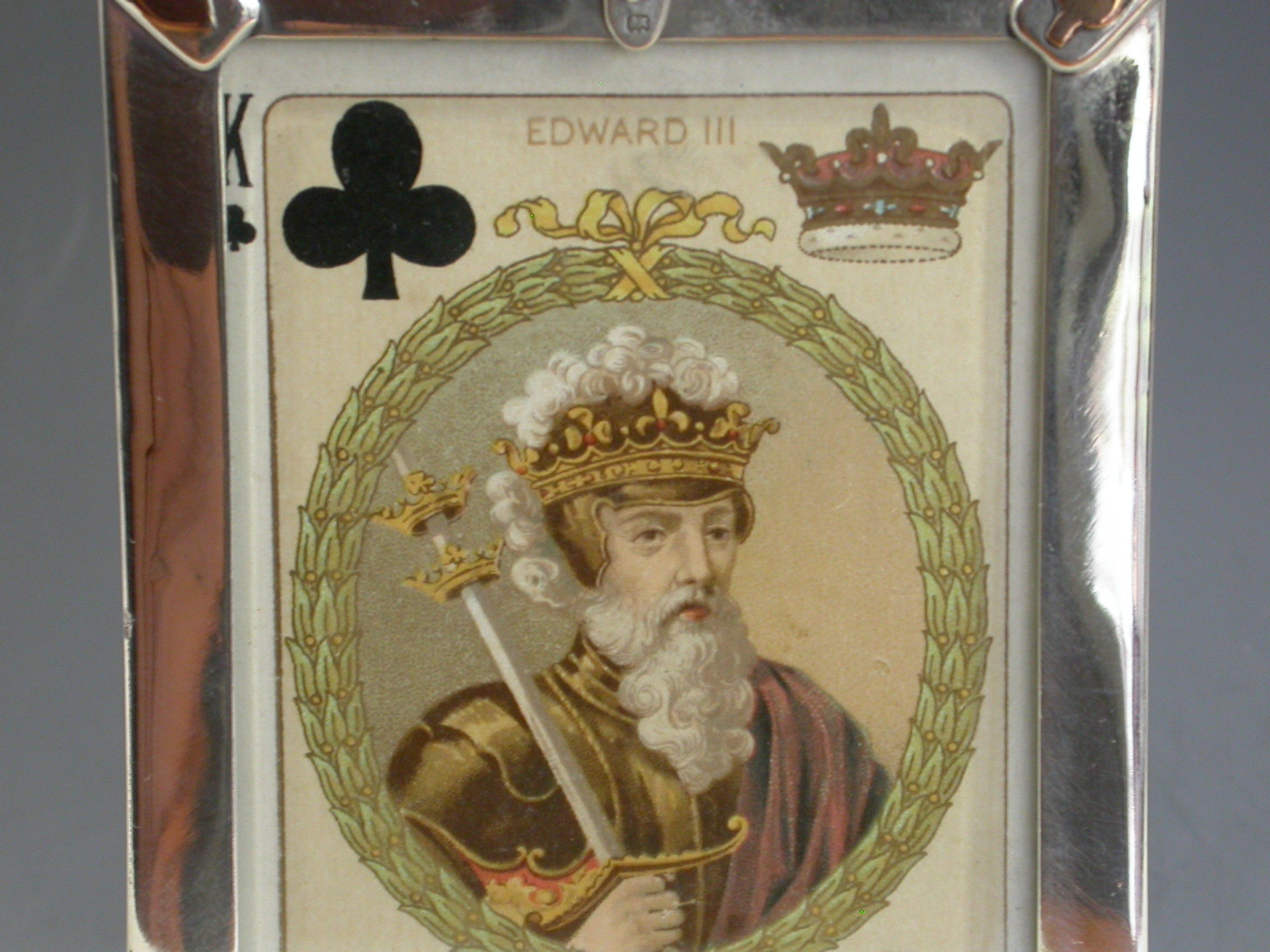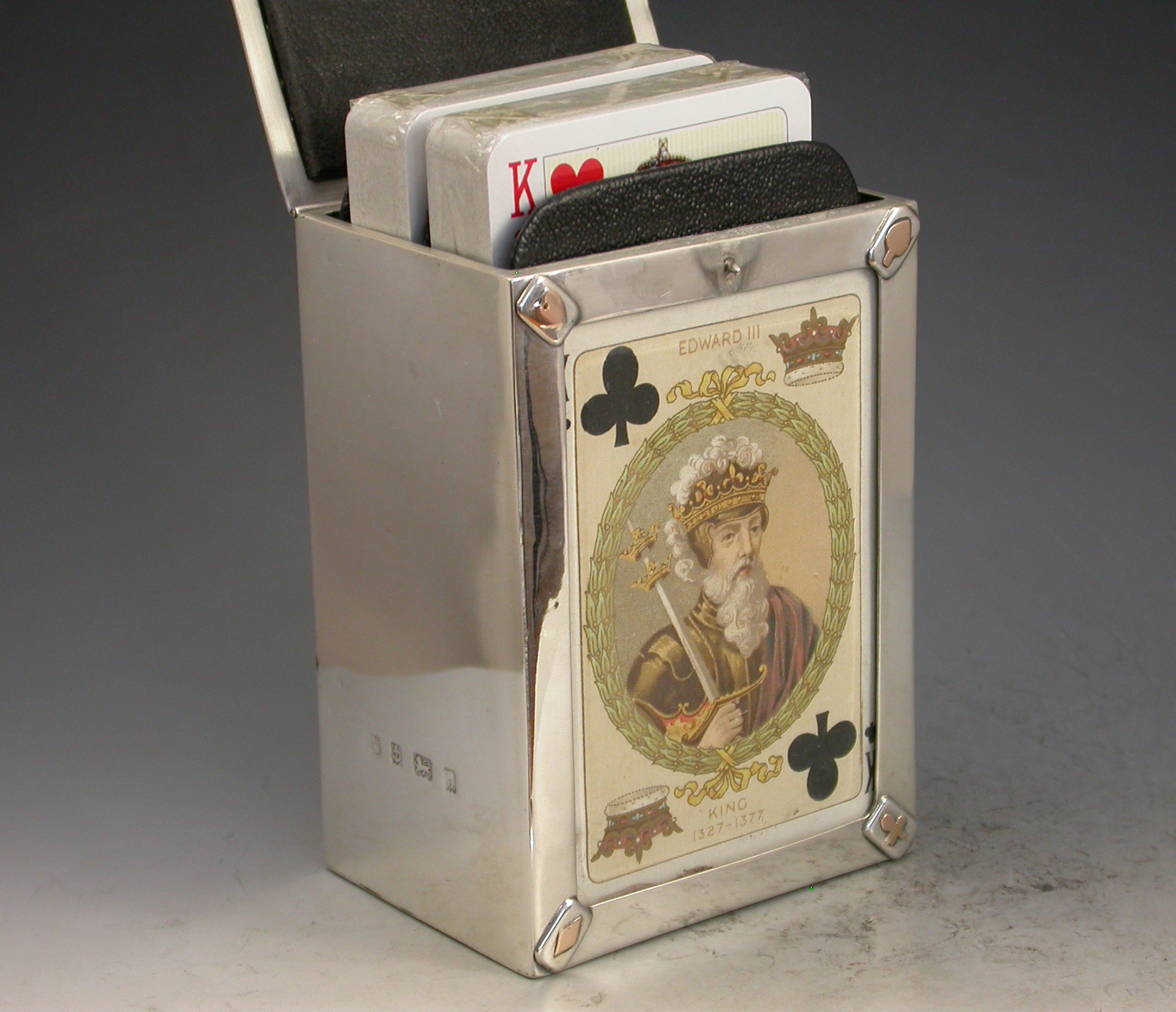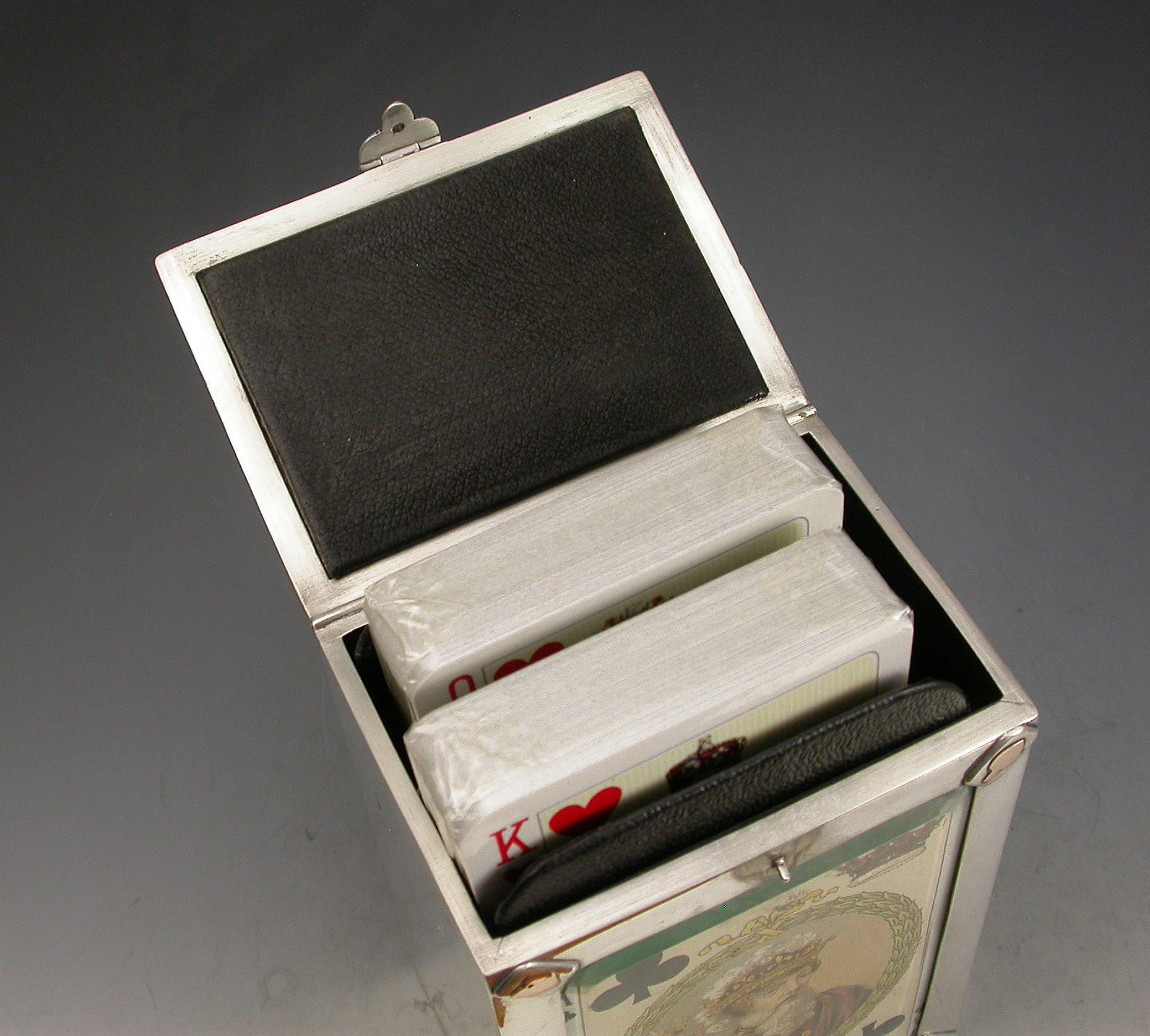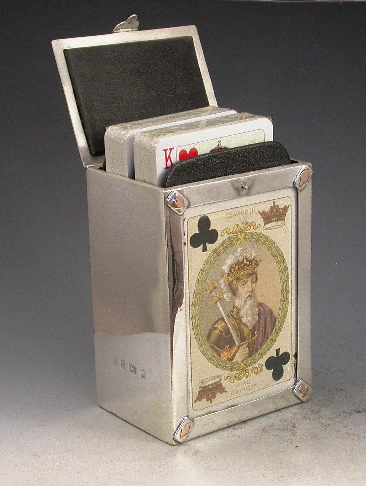 A good quality Edwardian silver twin-pack Card Box of rectangular form with hinged domed top, two glazed panels covering contemporary playing cards from a pack made to commemorate The Diamond Jubilee of Queen Victoria in 1897 depicting English Royals. An applied accent to each corner of the box depicting the four suits highlighted in gold. The internal leather covered sprung pop-up mechanism presents the two packs for use when the lid is opened.