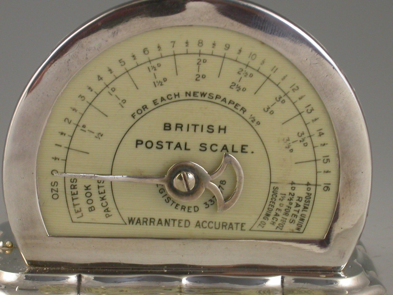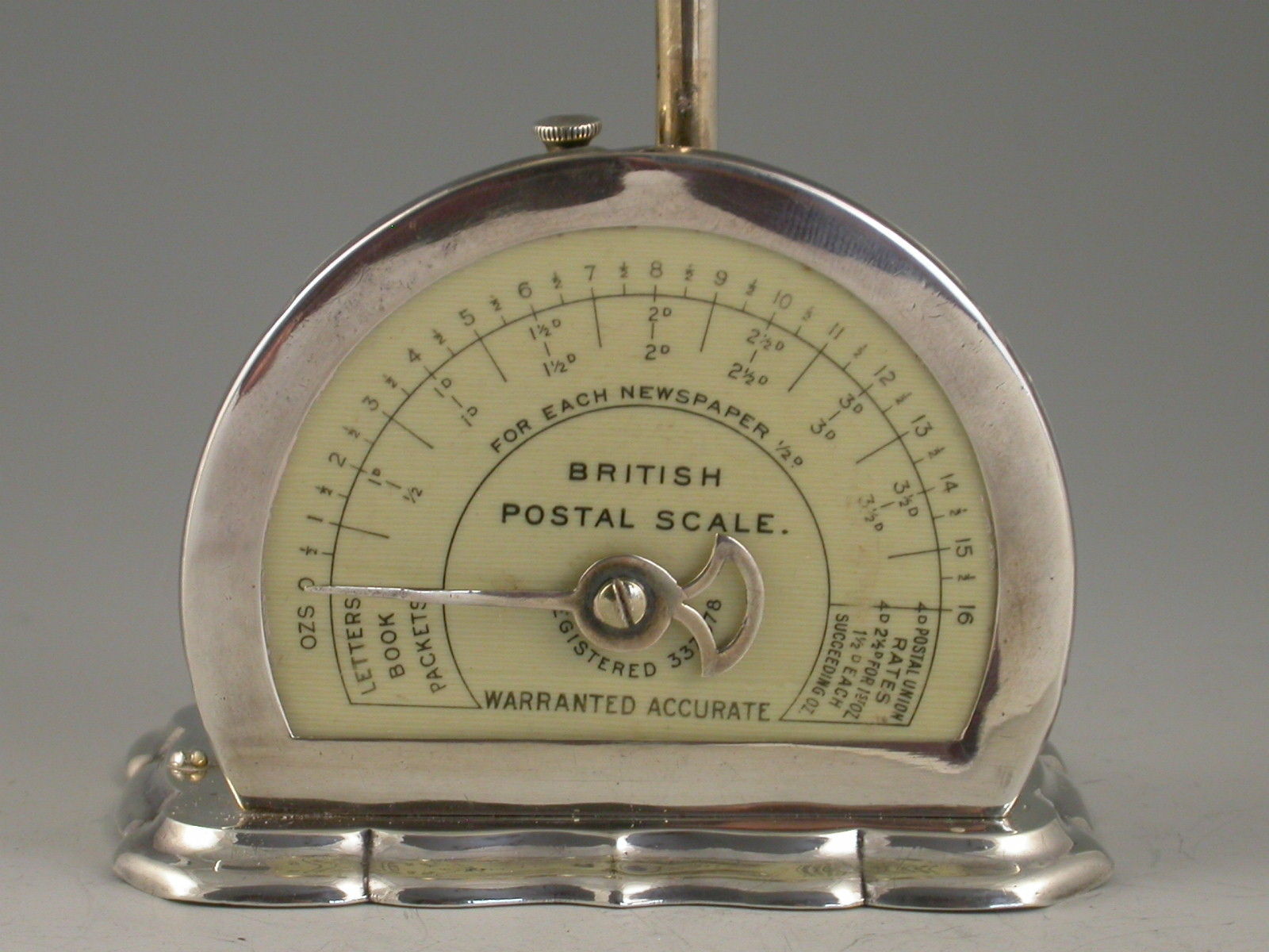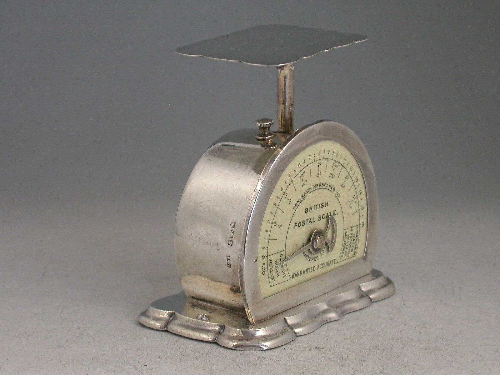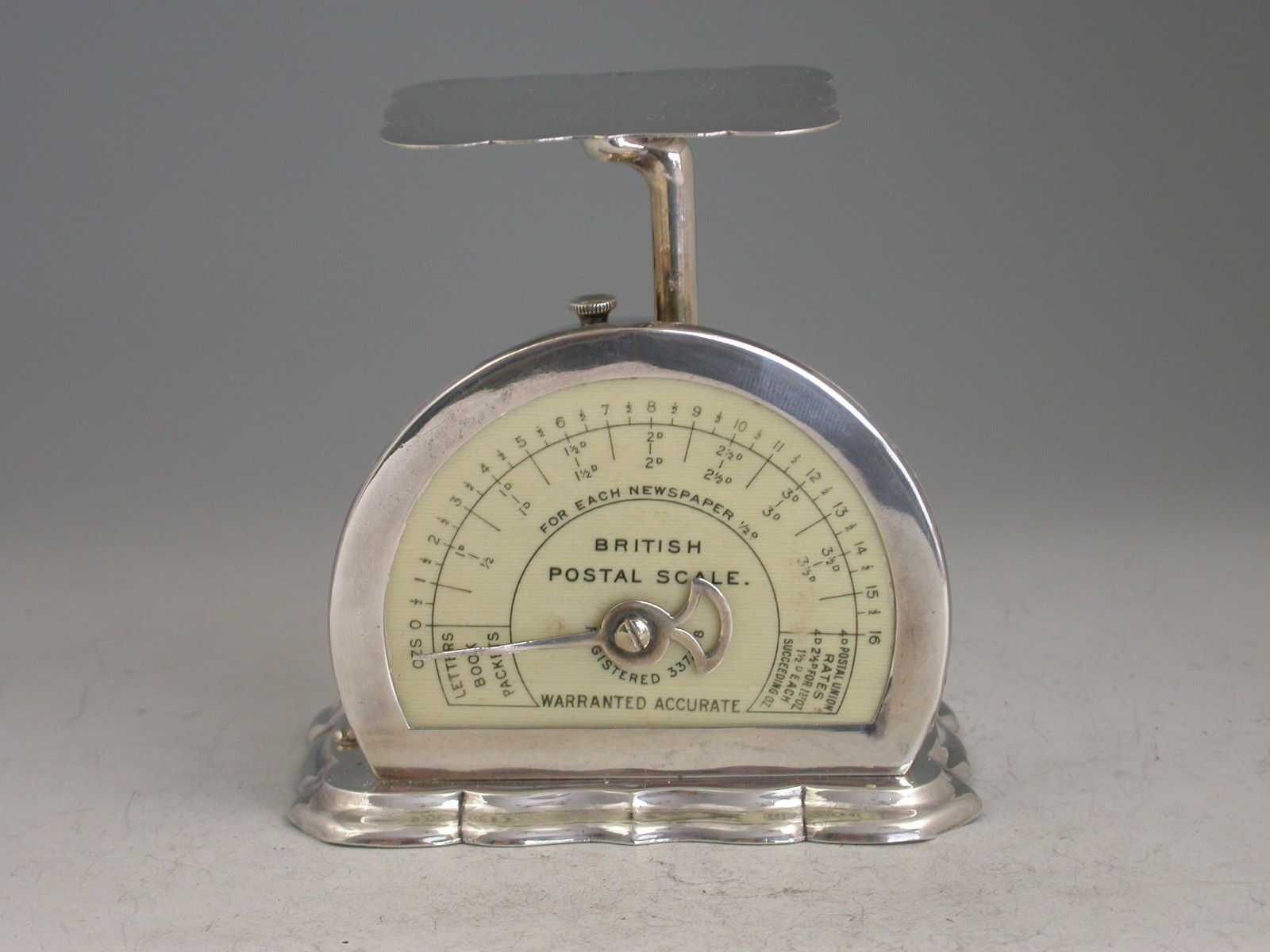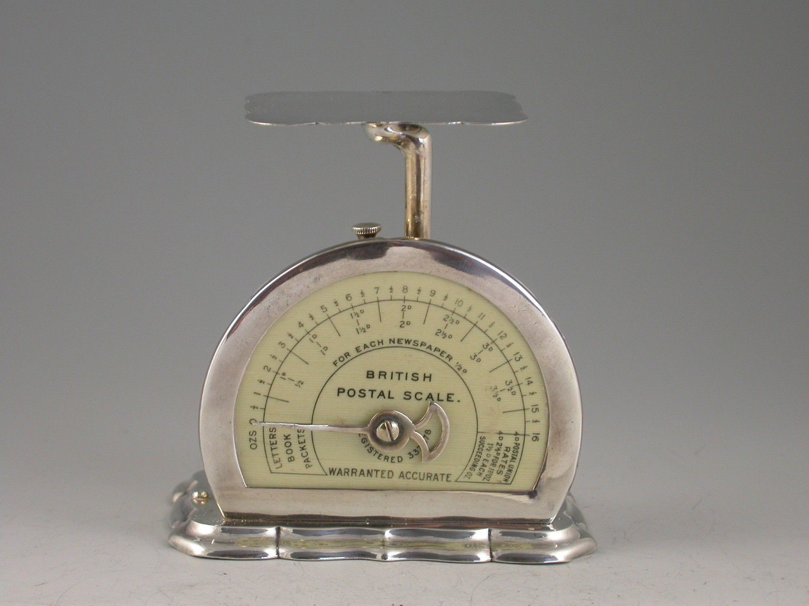 A rare Edwardian silver Postal Scale of Registered Design and fine quality, mounted on a weighted shaped silver base, a silver pan and pointer and silver framed scale graduated to 1lb by 1/2 oz and showing letter, newspaper and postal union rates.