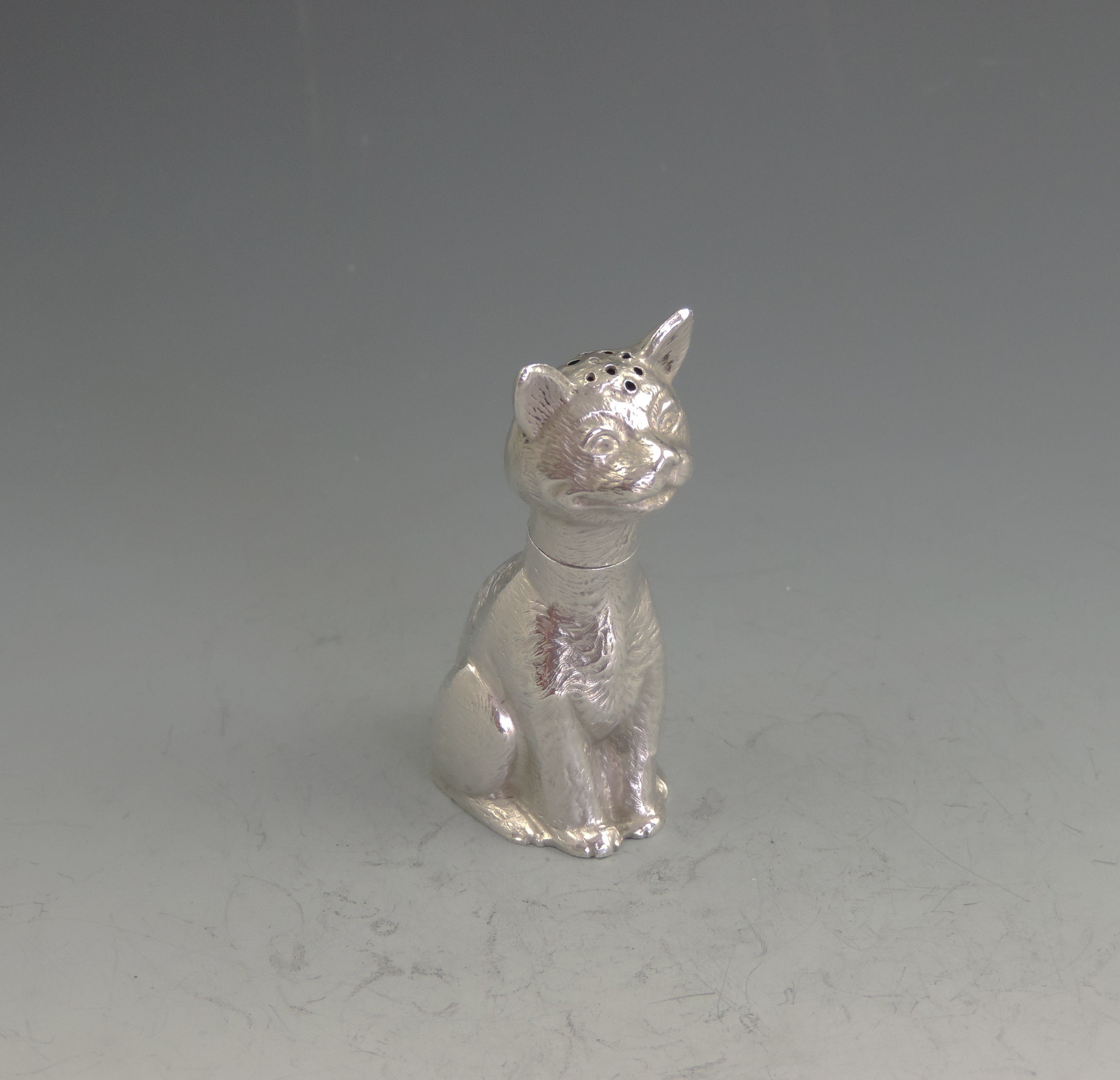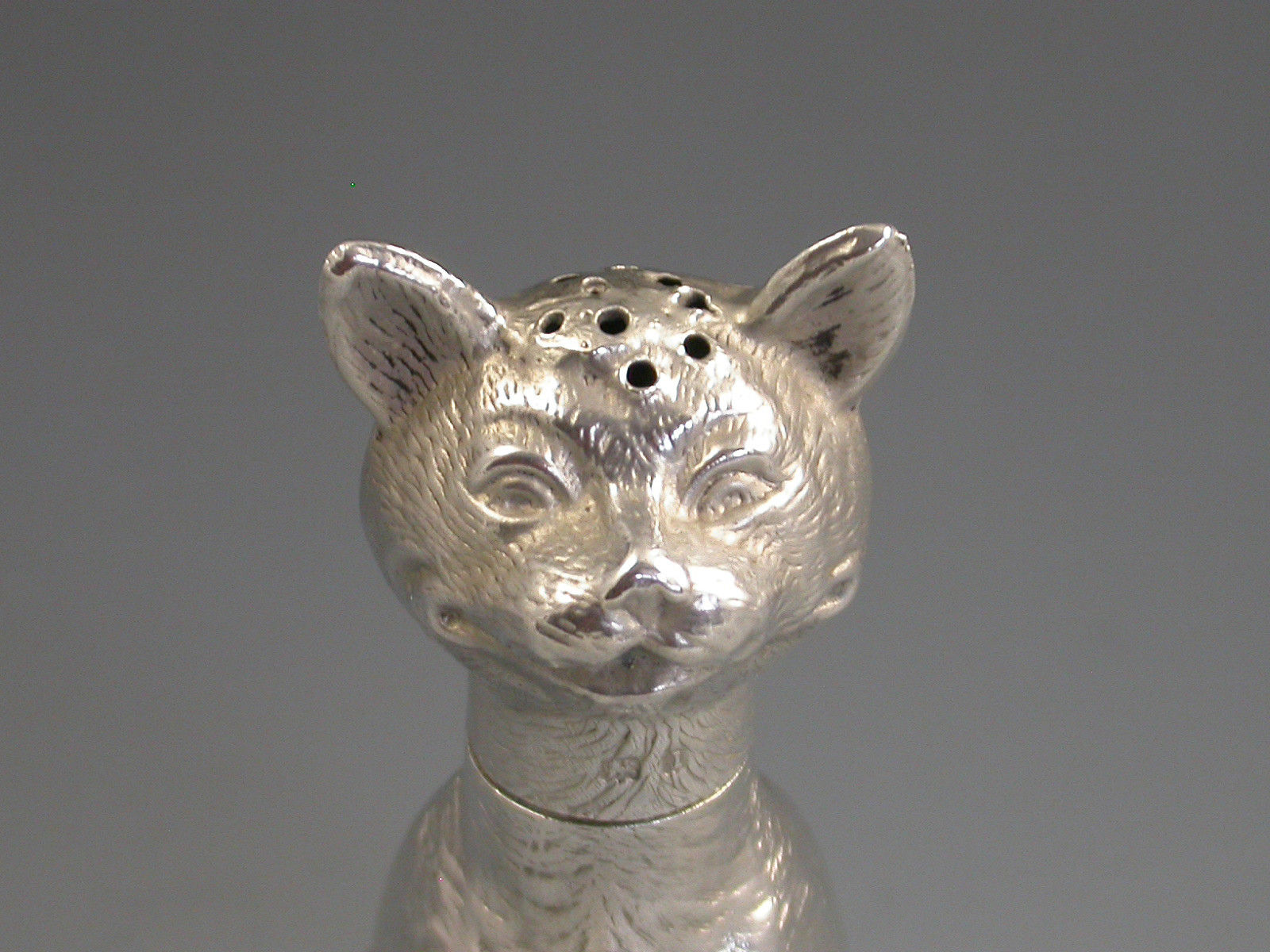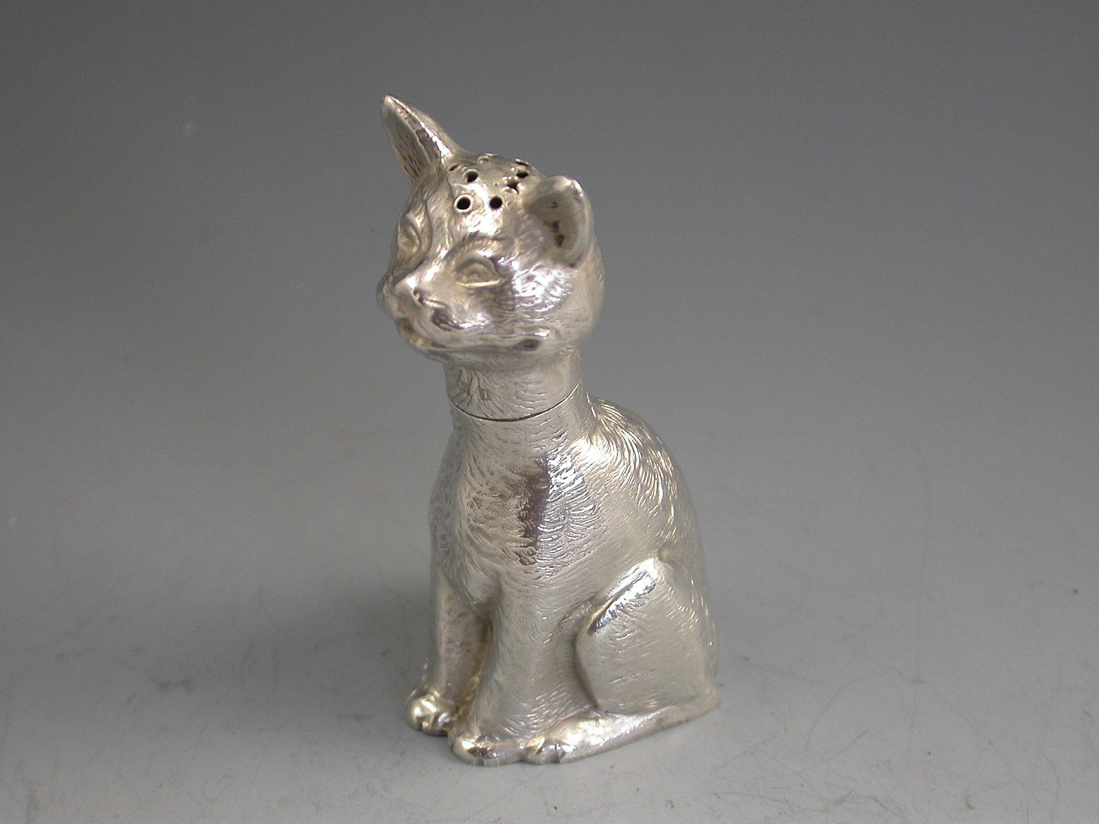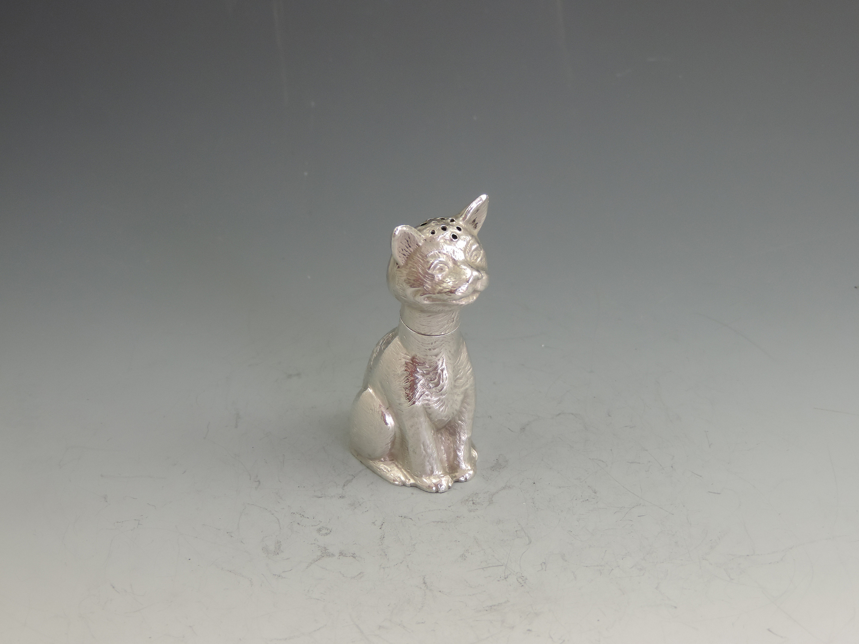A rare Victorian novelty die-stamped silver Pepper depicting a comical seated cat with a long neck and of a registered design. Pull-off head.