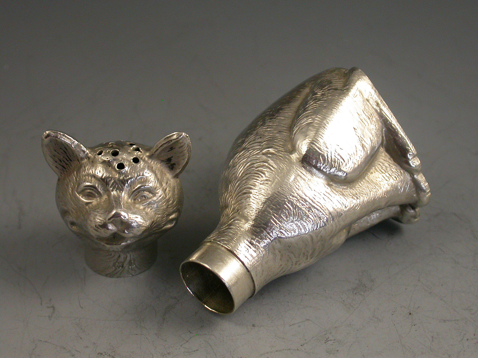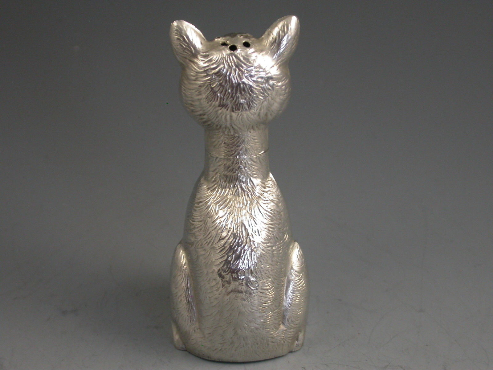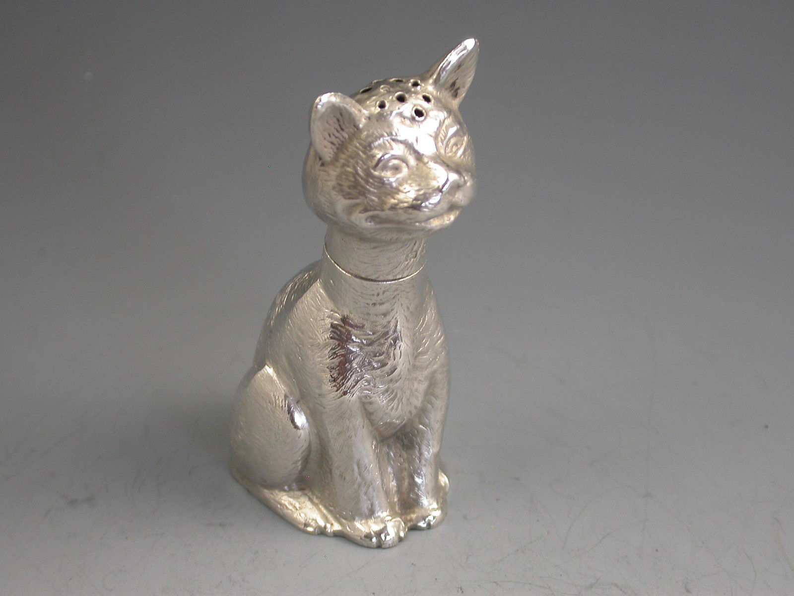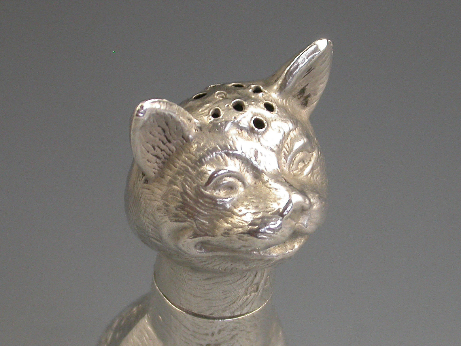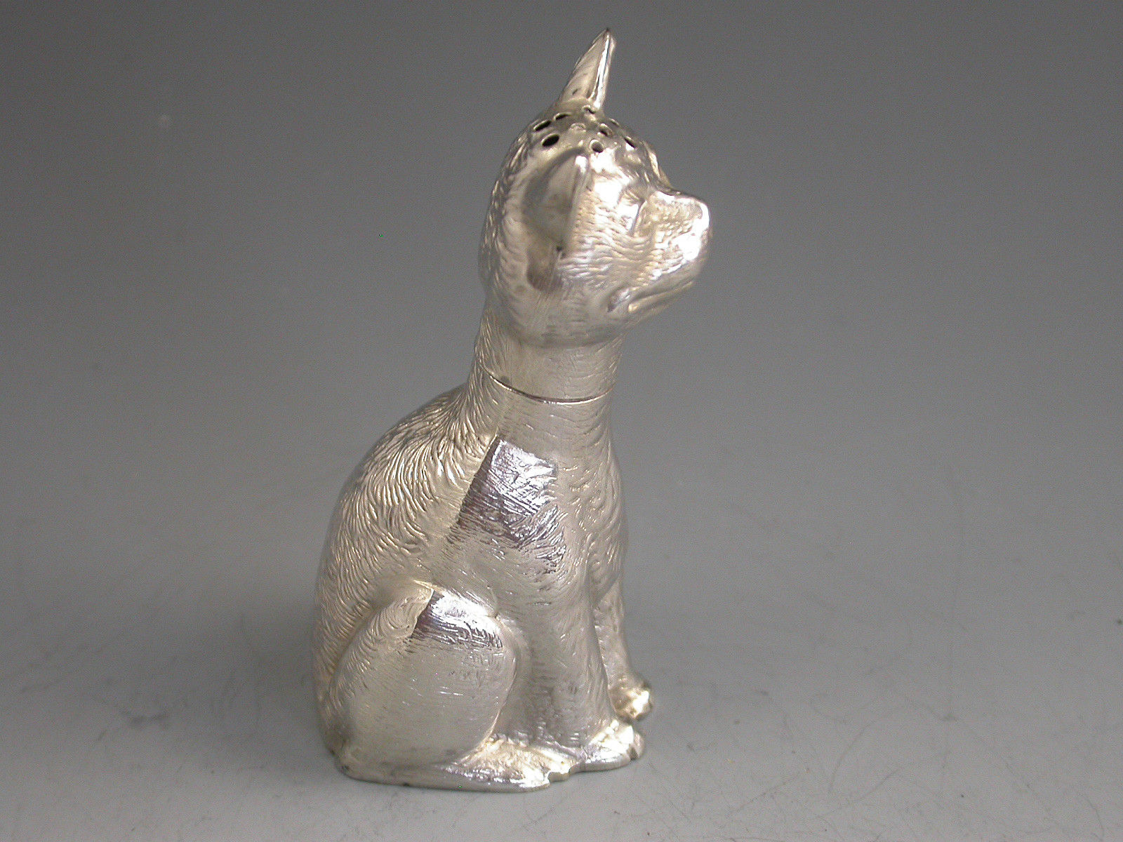 A rare Victorian novelty die-stamped silver Pepper depicting a comical seated cat with a long neck and of a registered design. Pull-off head.