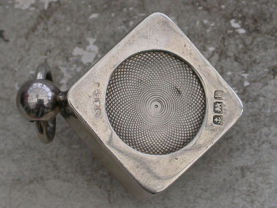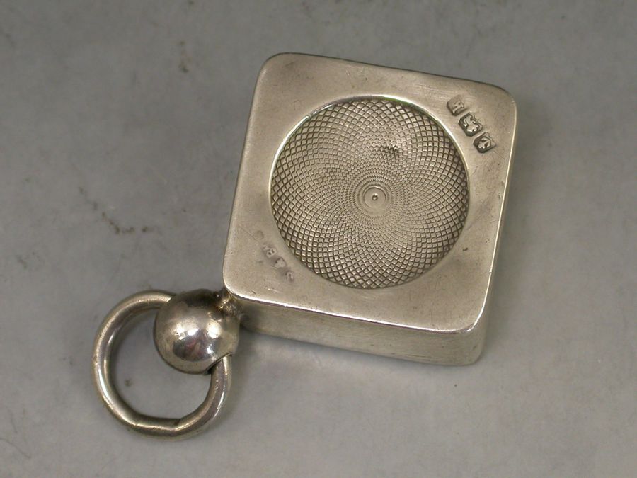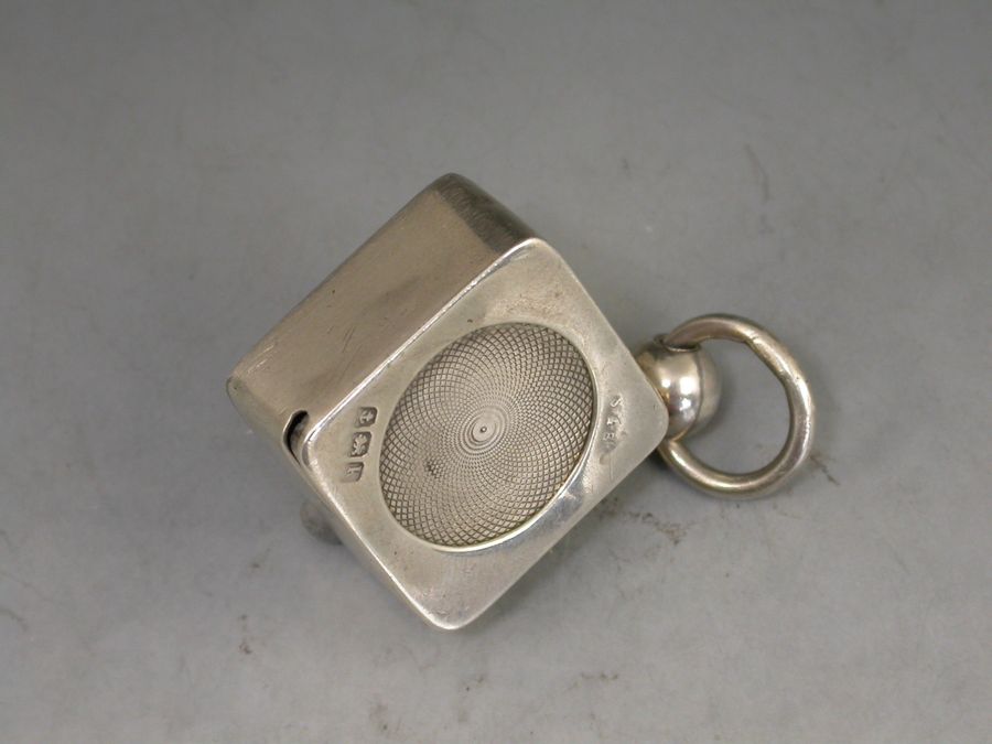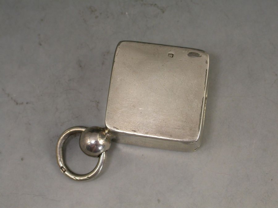 An unusual Edwardian silver Sovereign Case of cubed form with attached suspension ring, an open sprung sovereign compartment with side loading slot.