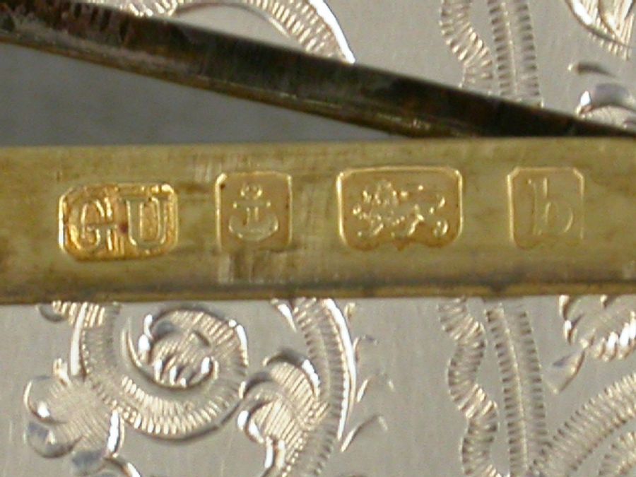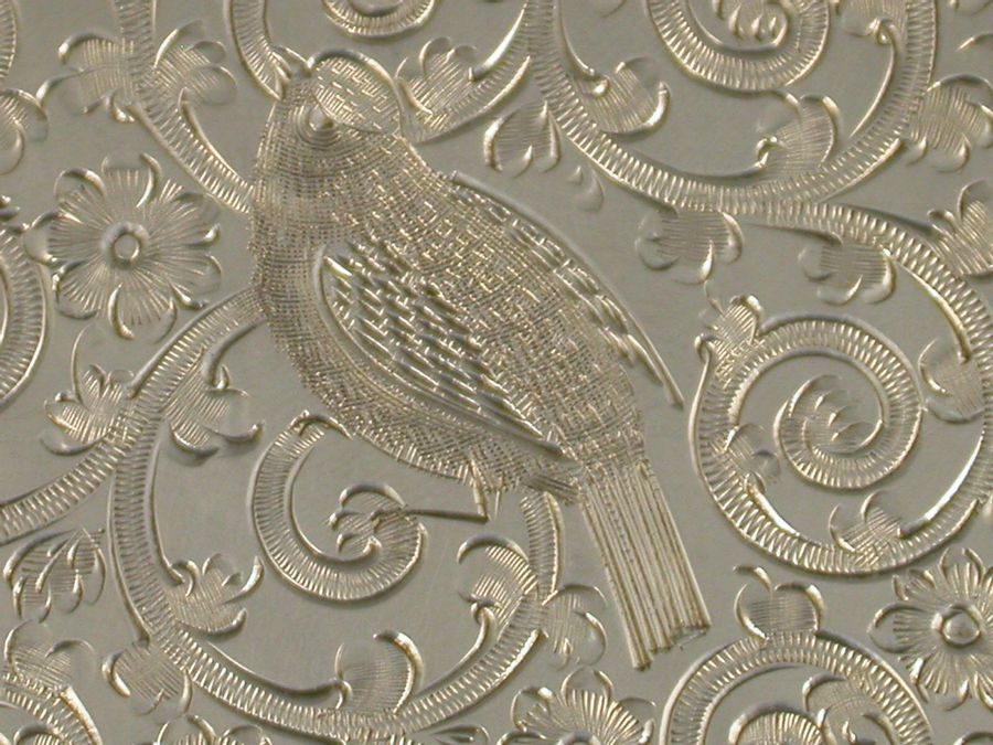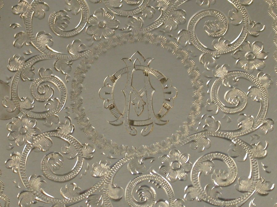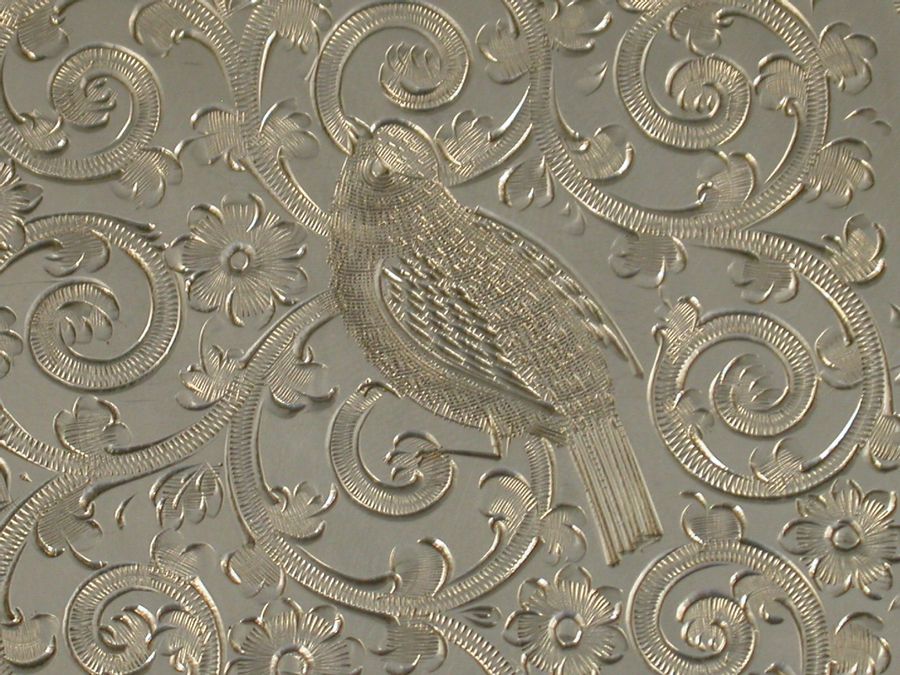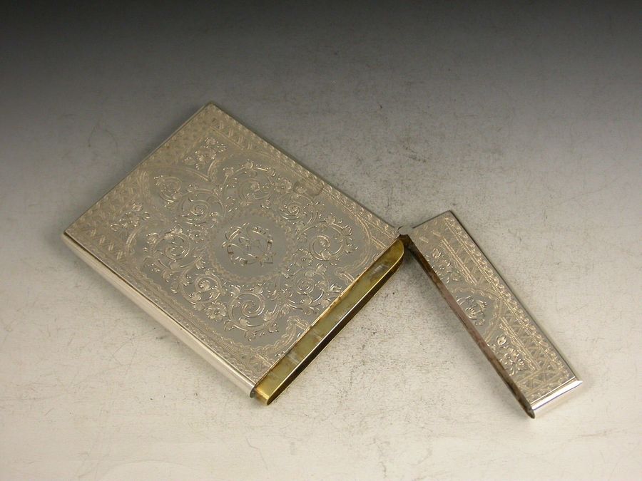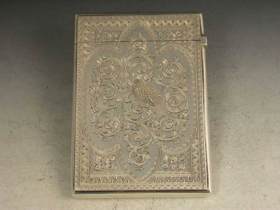 A very fine quality Edwardian silver Card Case of rectangular form with hinged lid and silver gilt interior, both sides superbly engraved with bright-cut foliate scroll decoration, a circular cartouche to the front engraved with contemporary initials and a song bird amongst the scrolls to the reverse.