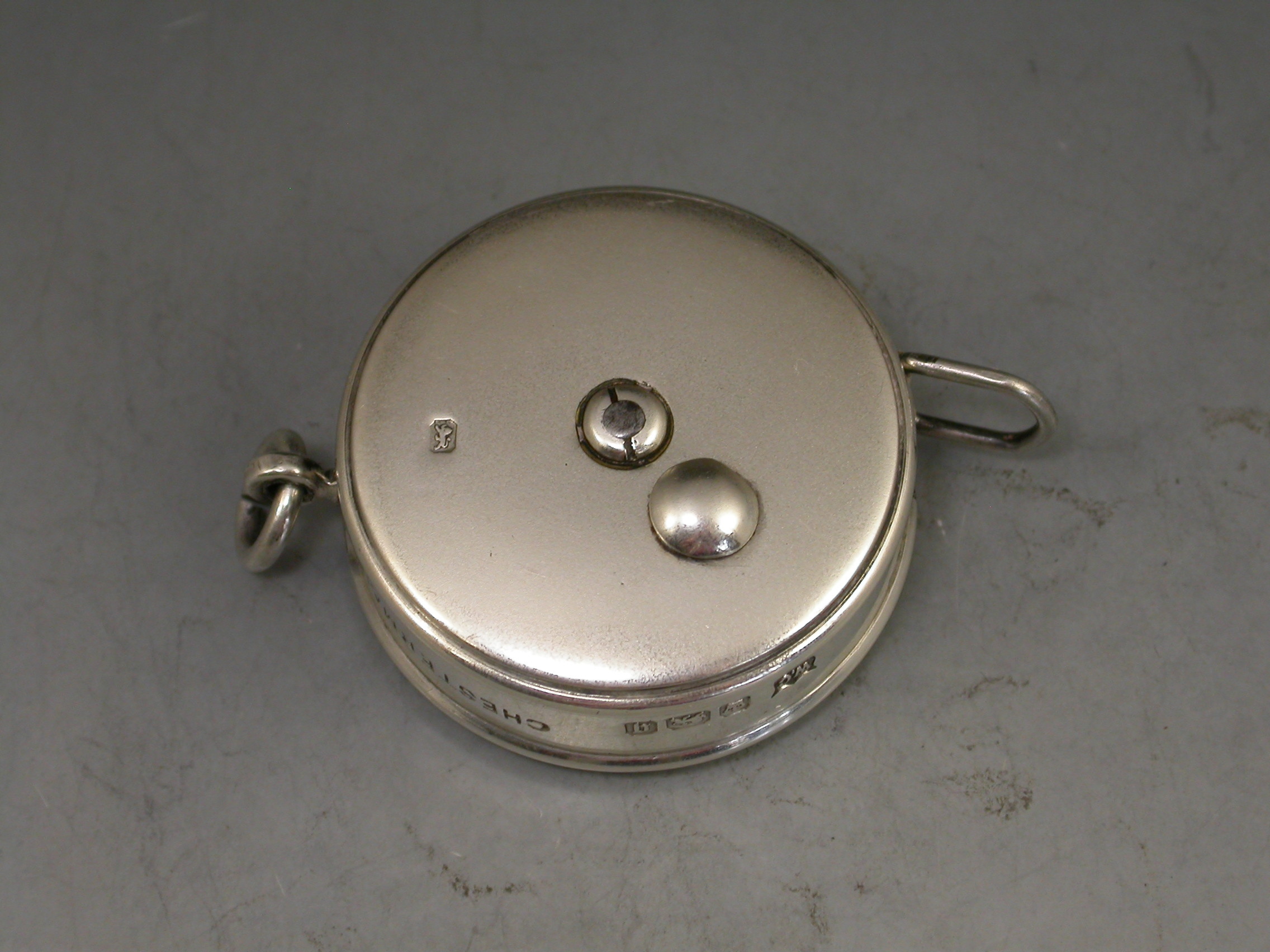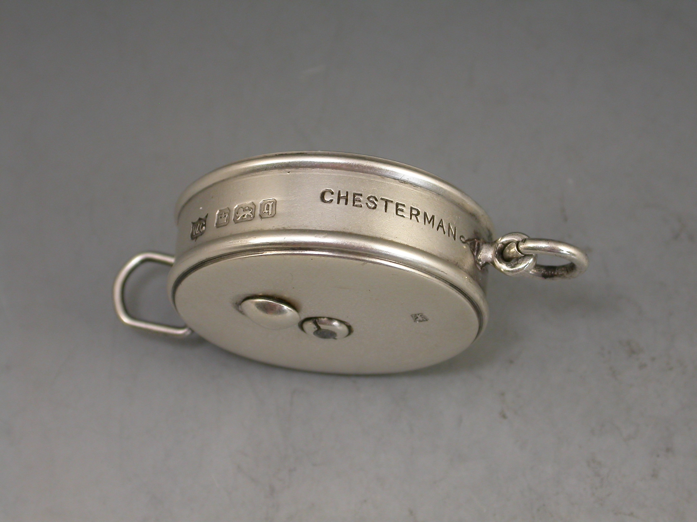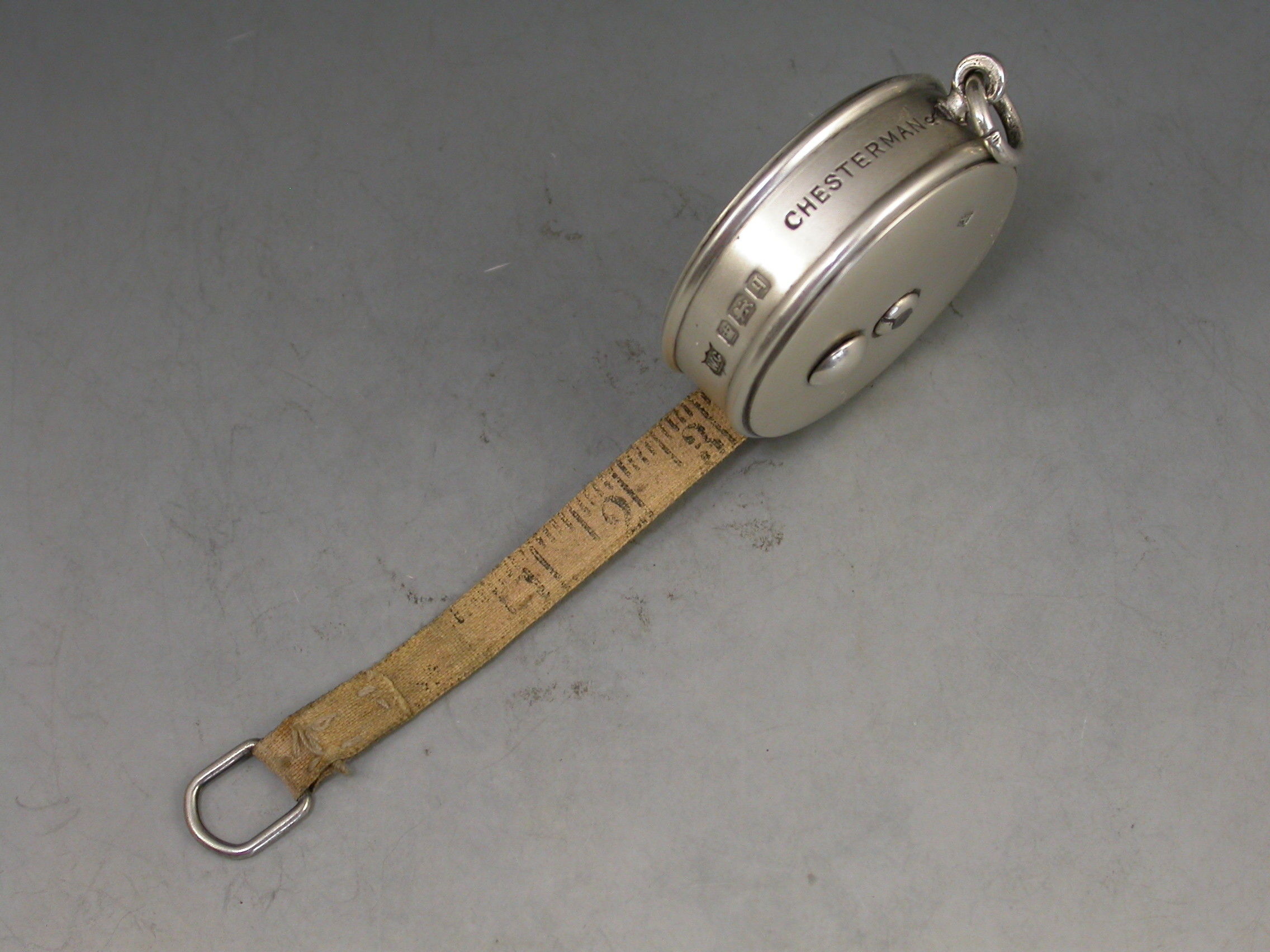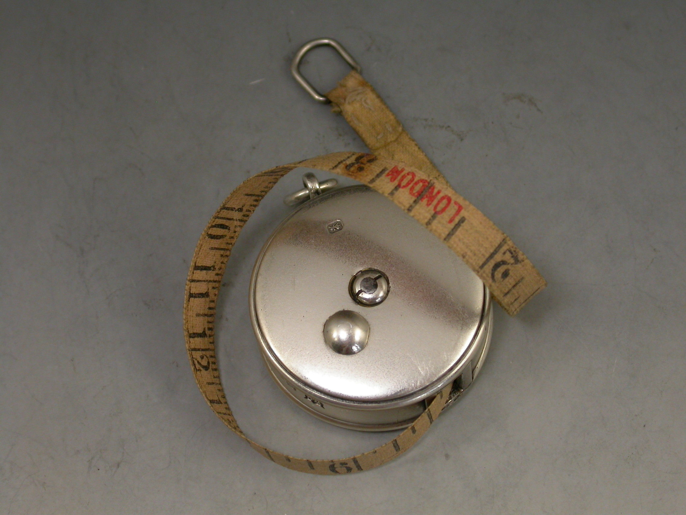 A good Edwardian circular silver Tape Measure with attached suspension ring. The sprung tape extending on a ratchet and retreating when the knob is pushed.