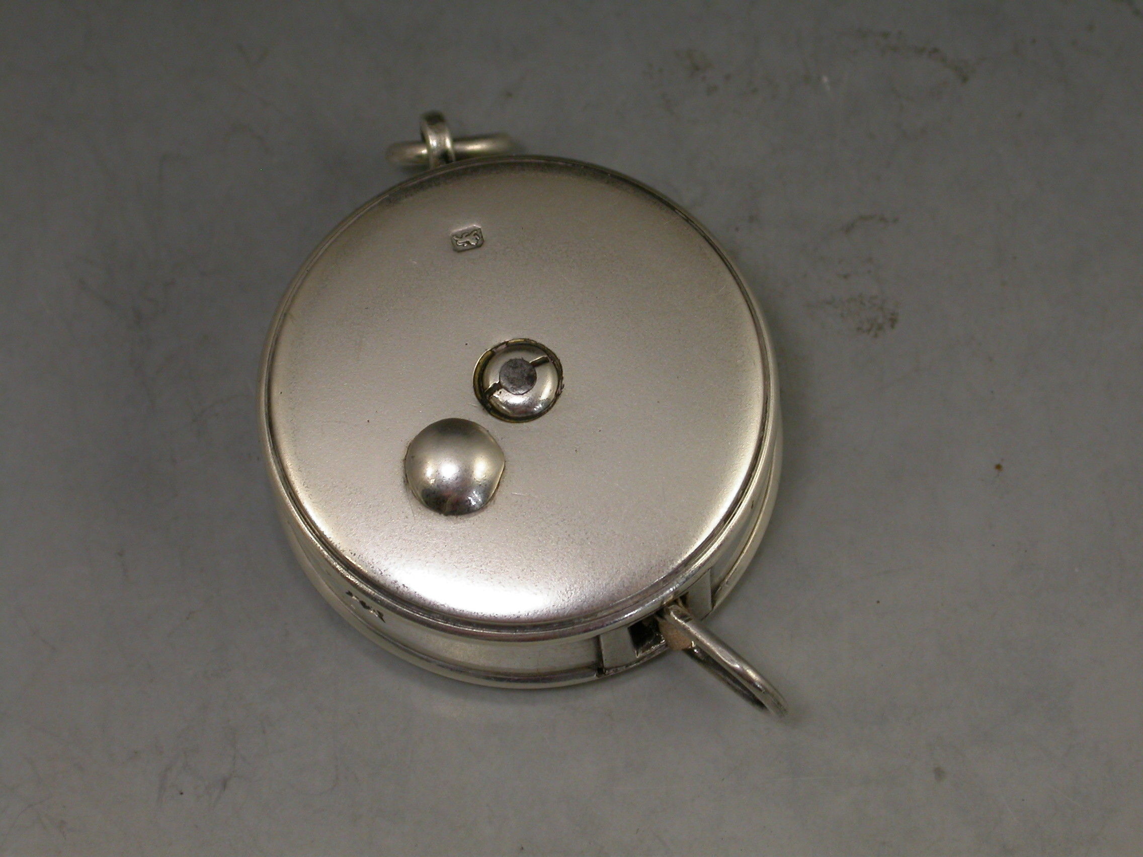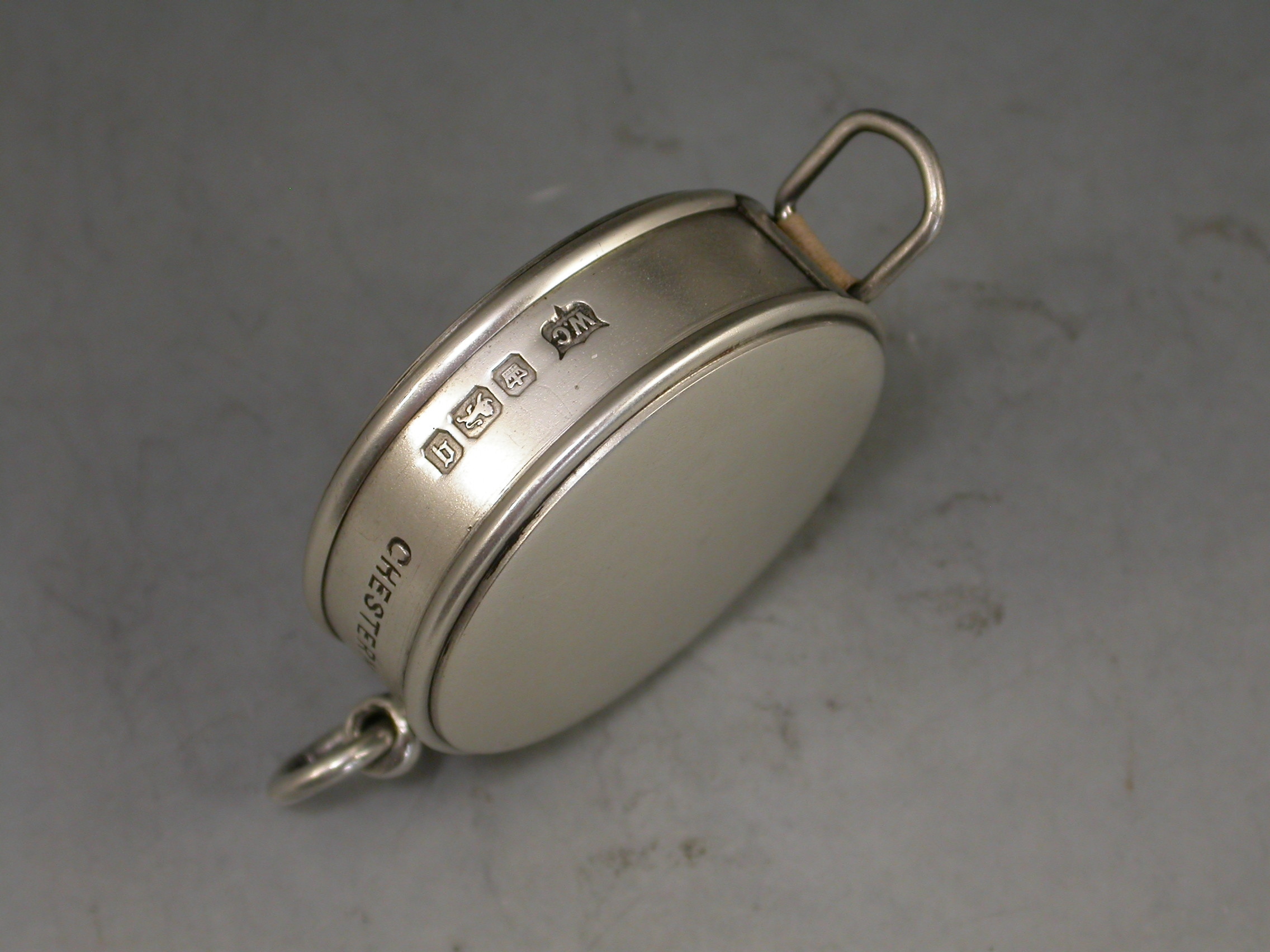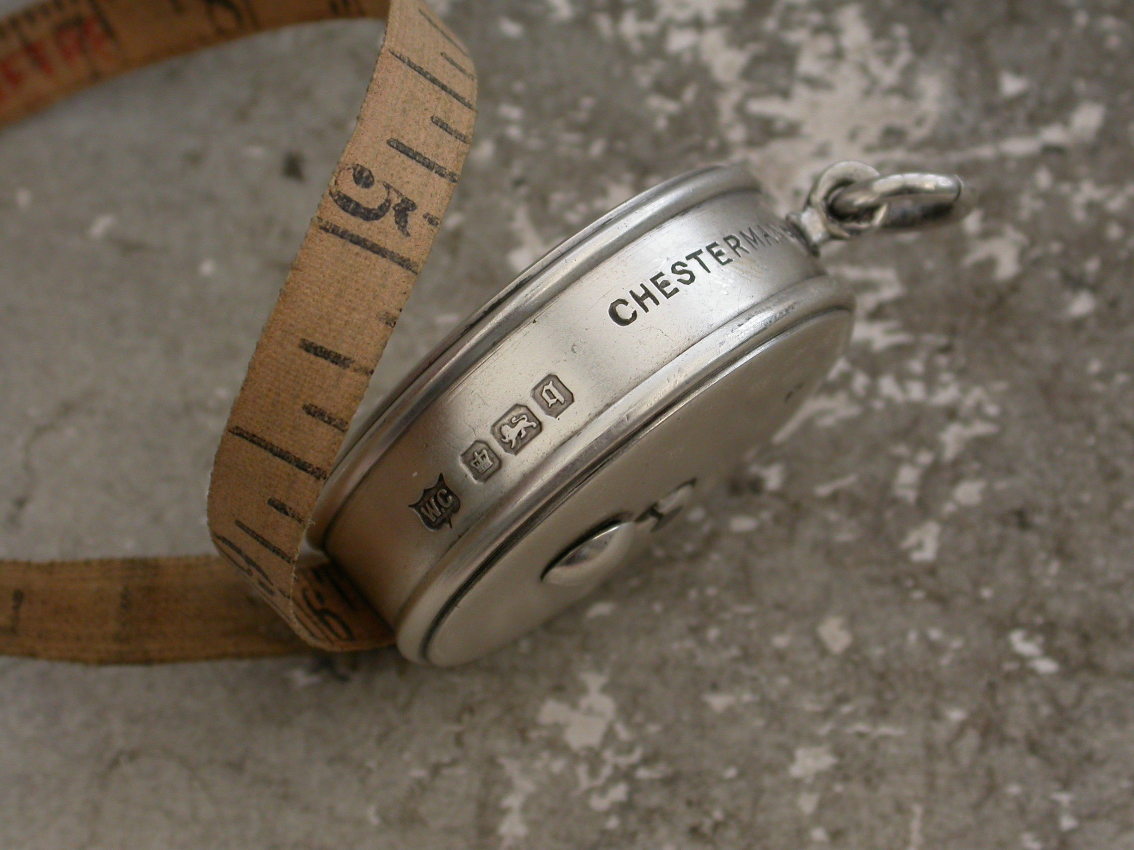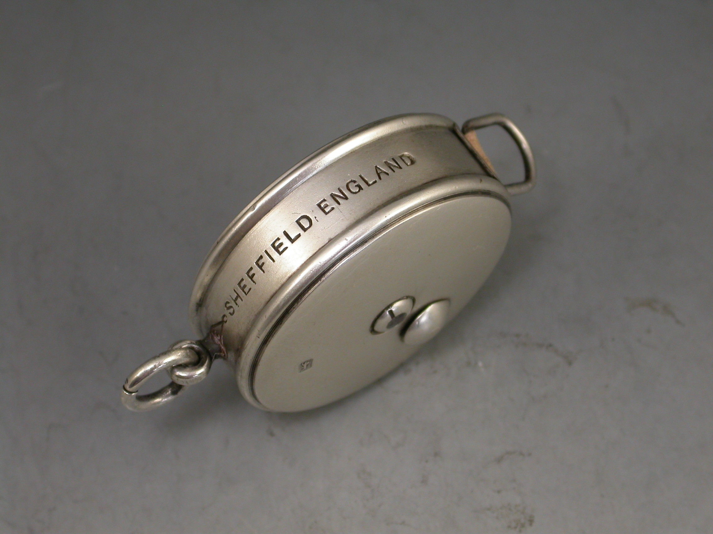 A good Edwardian circular silver Tape Measure with attached suspension ring. The sprung tape extending on a ratchet and retreating when the knob is pushed.