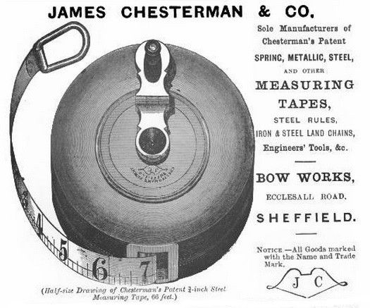 ames Chesterman had established his business with a Mr. Housfield in 1821, they were located at Nursery Street, Sheffield. The business specialised in making measuring tapes and instruments. In 1837 James Chesterman was listed as patentee of the spring tape measure and self rolling window blind. William Chesterman was elected Master Cutler in 1880.