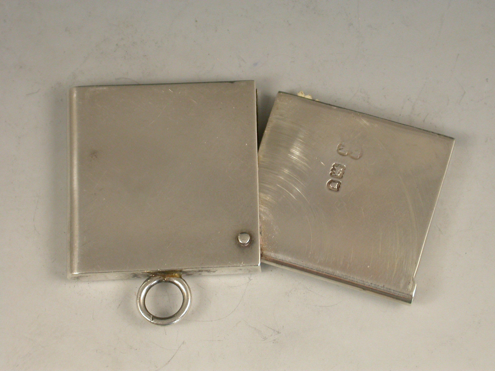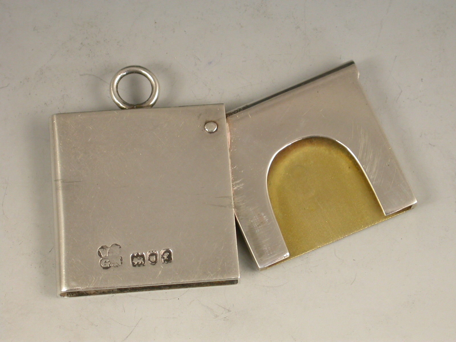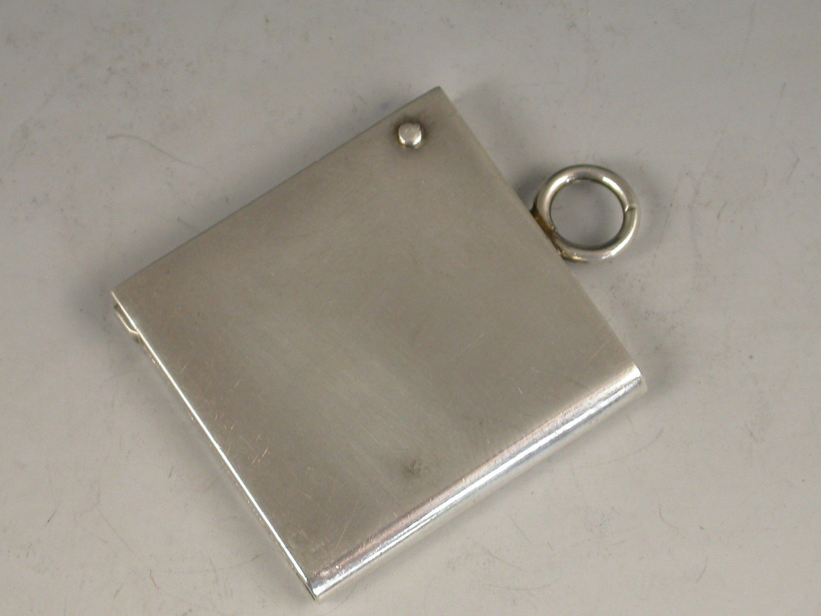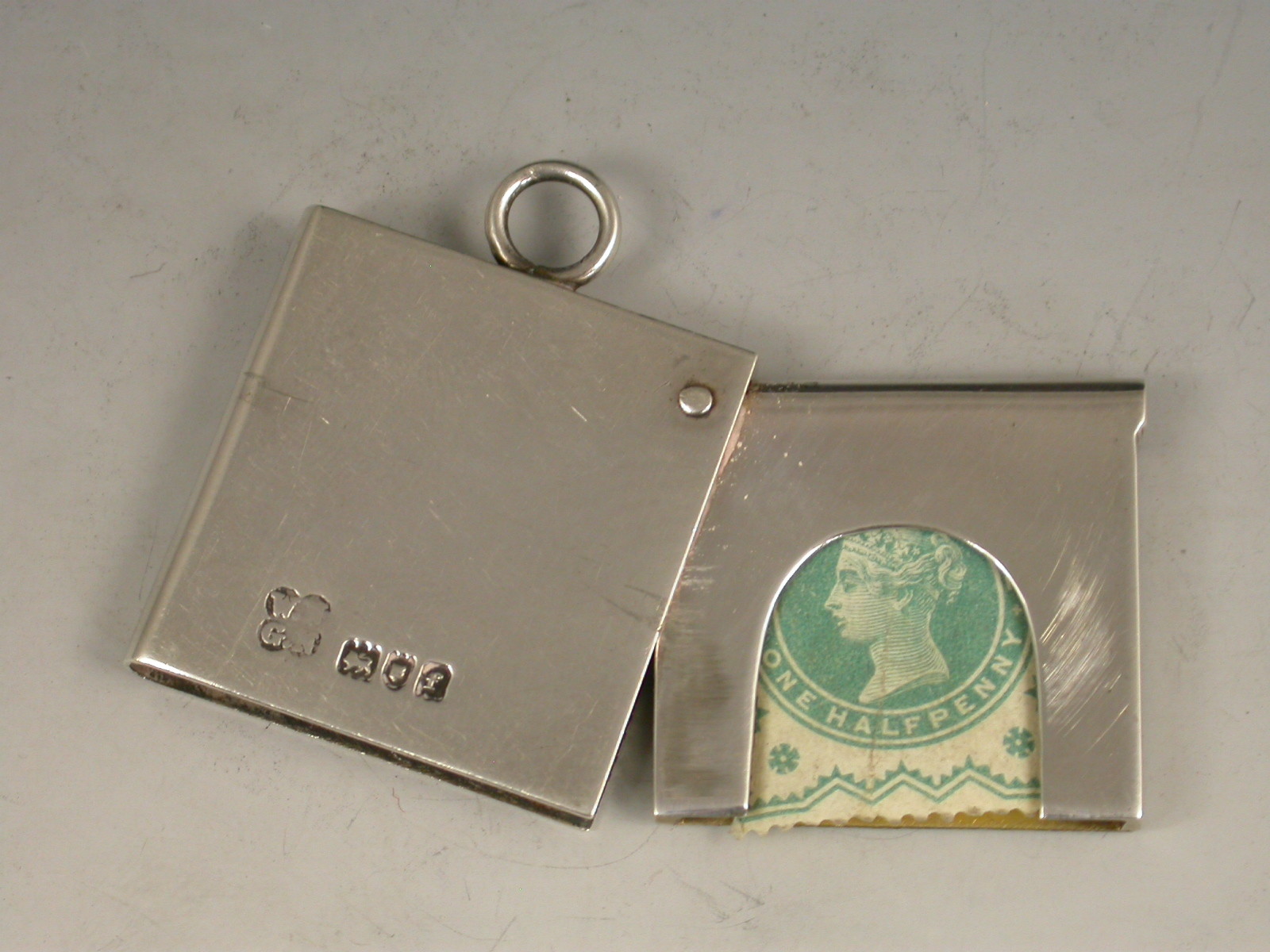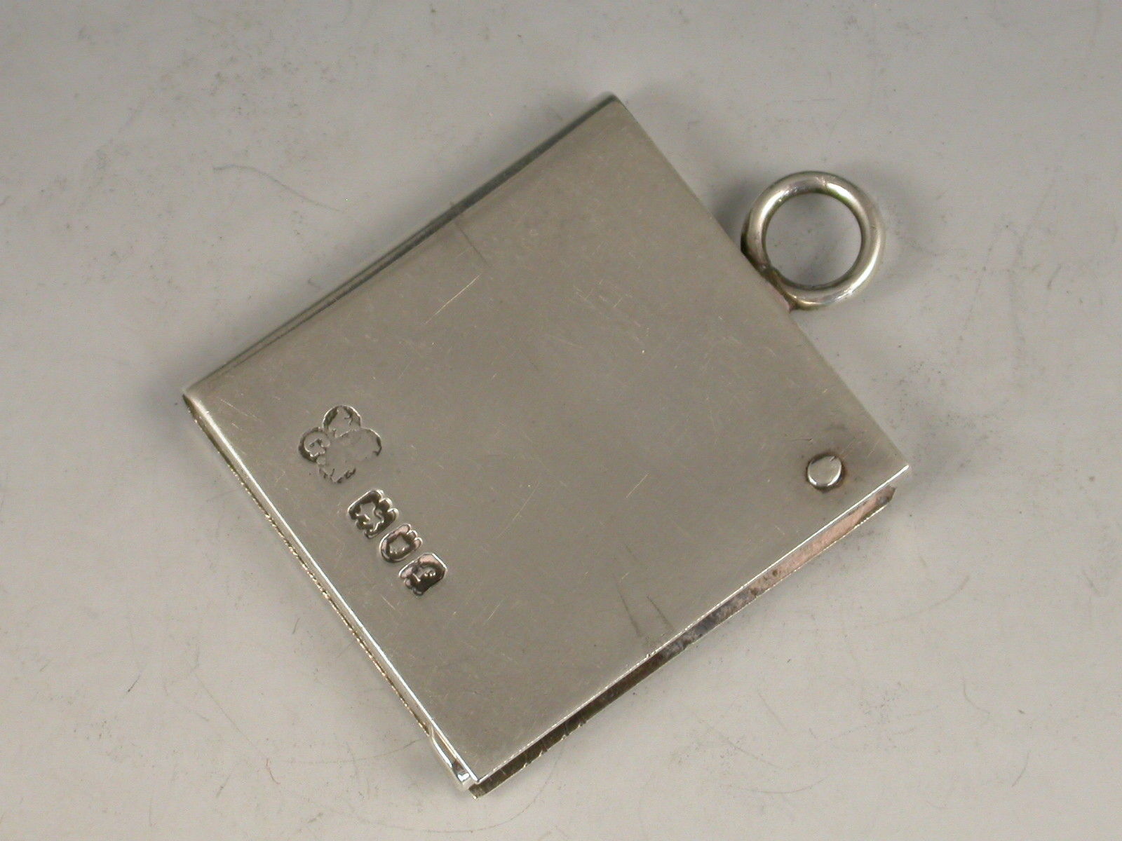 An Edwardian silver Stamp Case of plain square form with attached suspension ring, the central stamp compartment swivels open via a pin to one corner, silver gilt interior.
