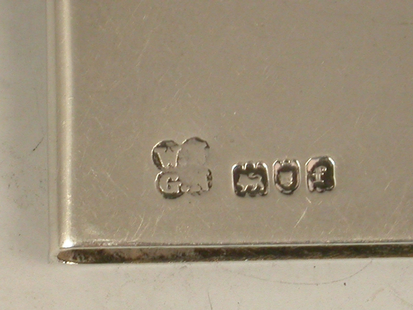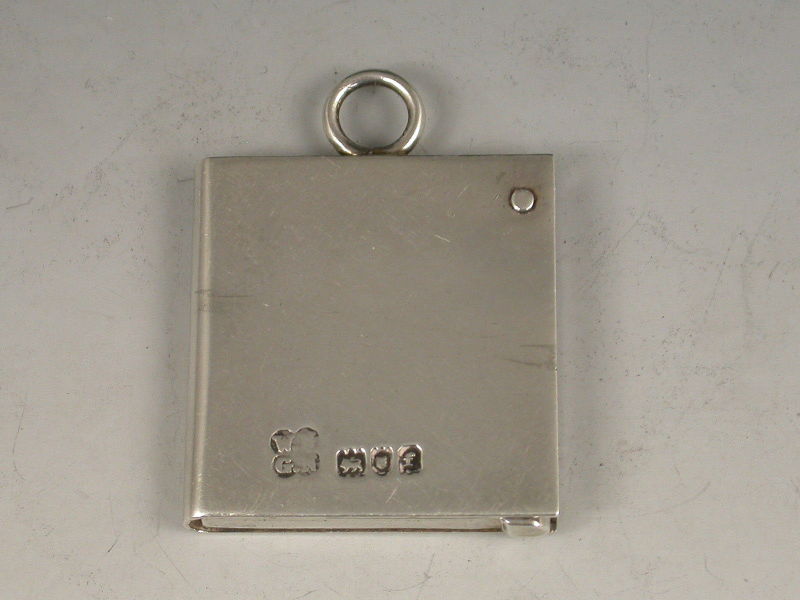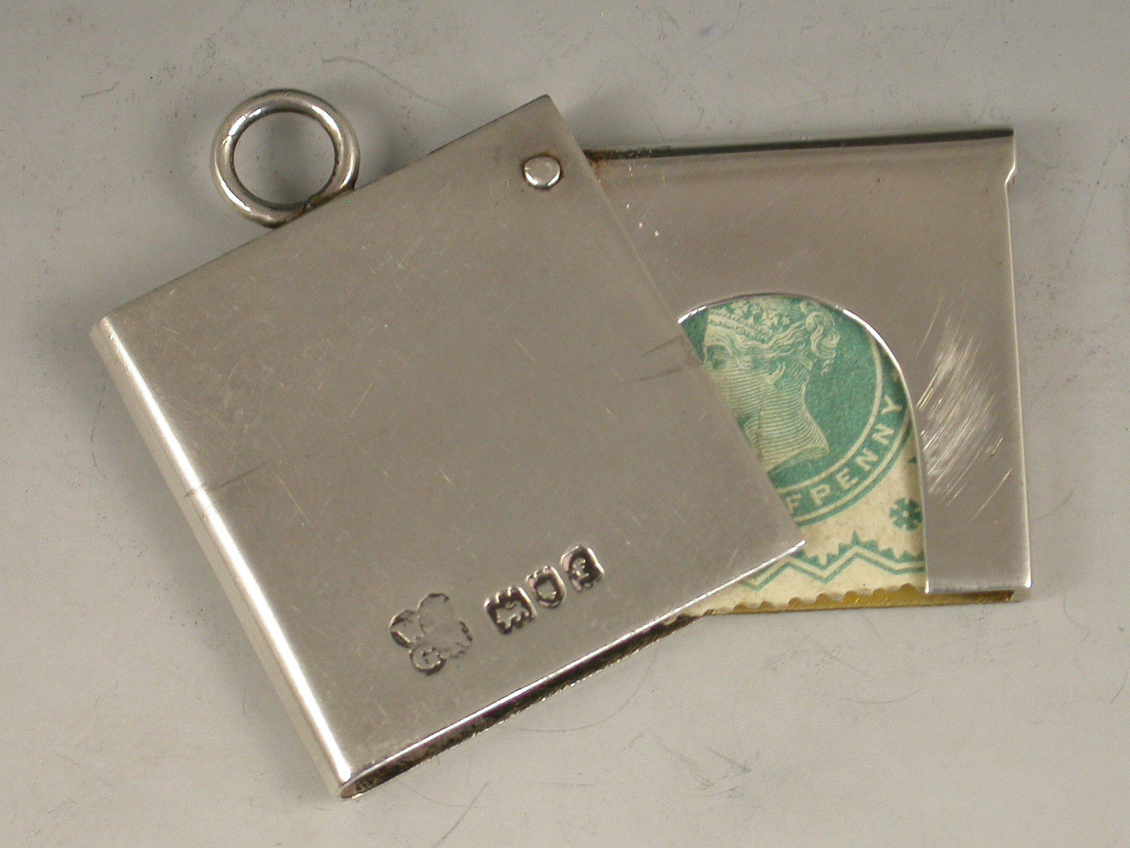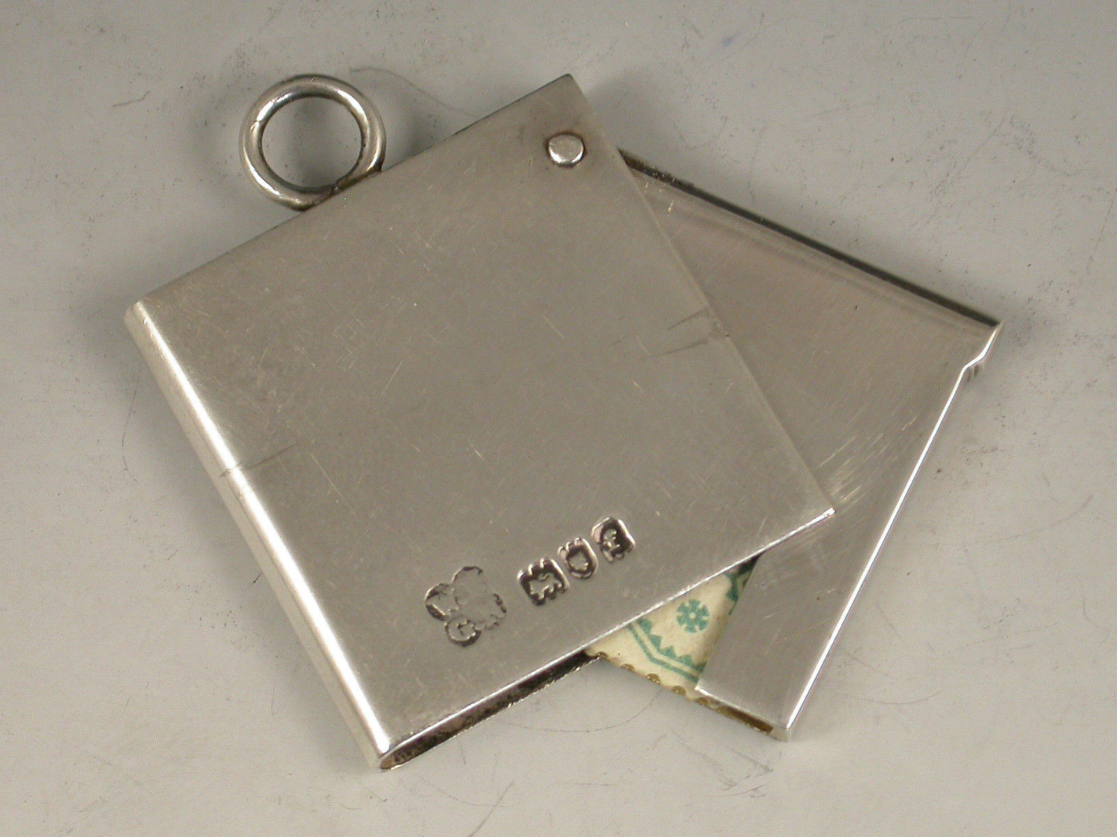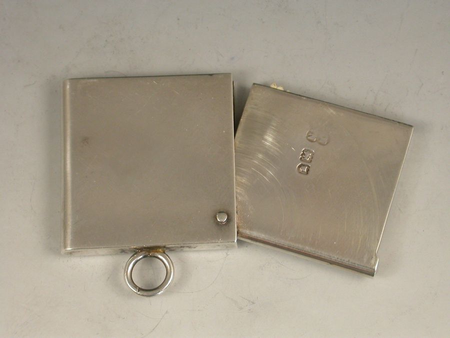 An Edwardian silver Stamp Case of plain square form with attached suspension ring, the central stamp compartment swivels open via a pin to one corner, silver gilt interior.