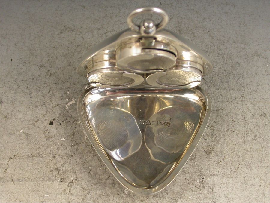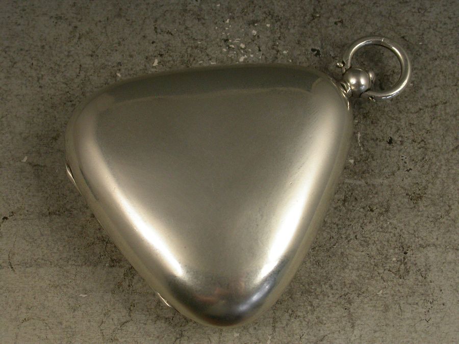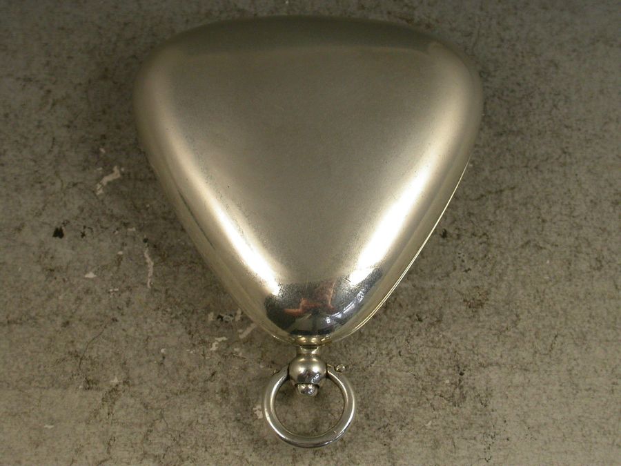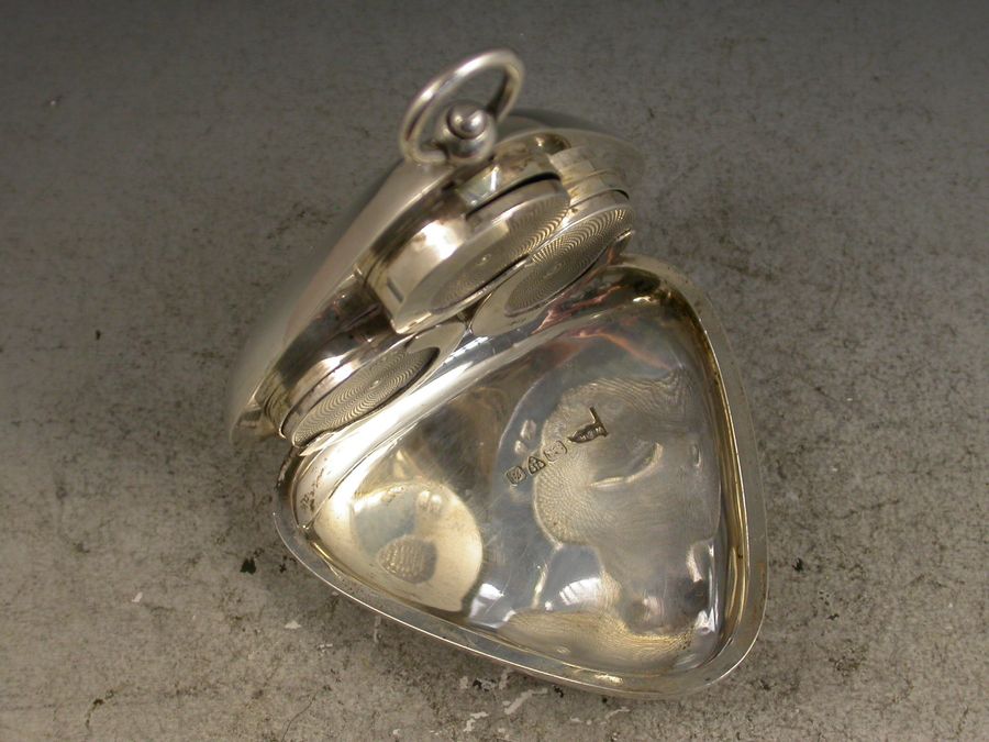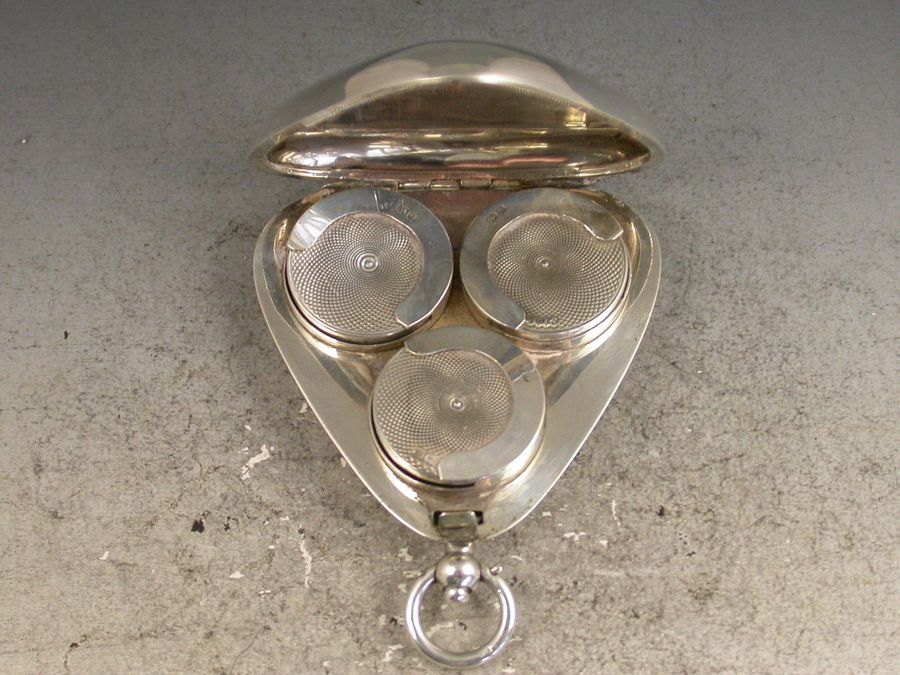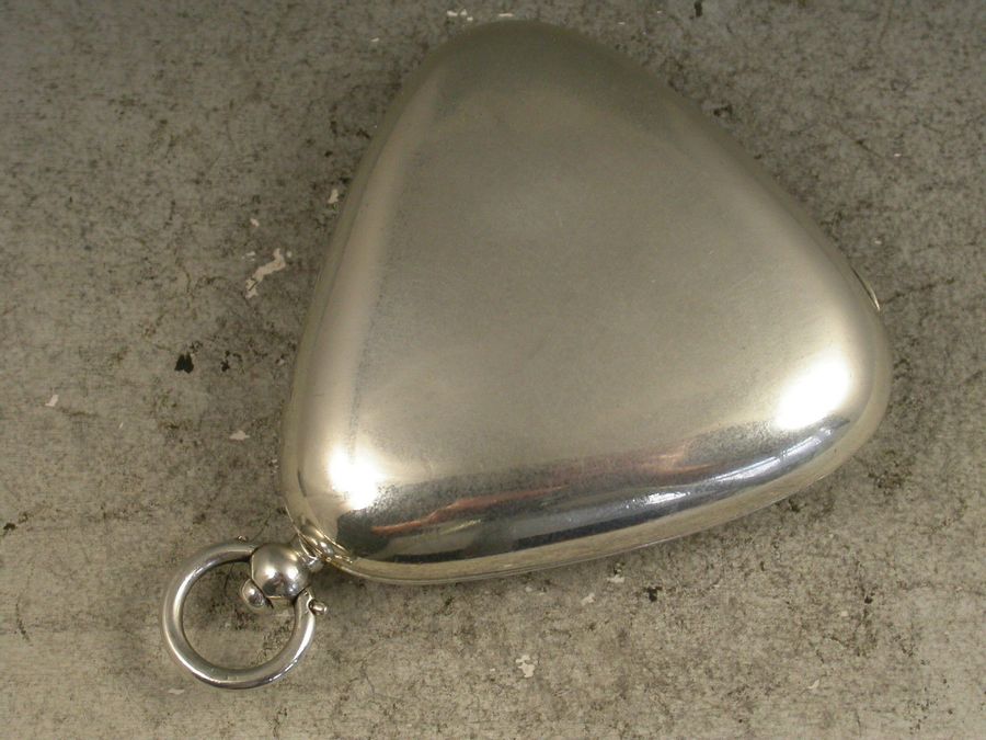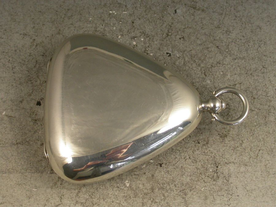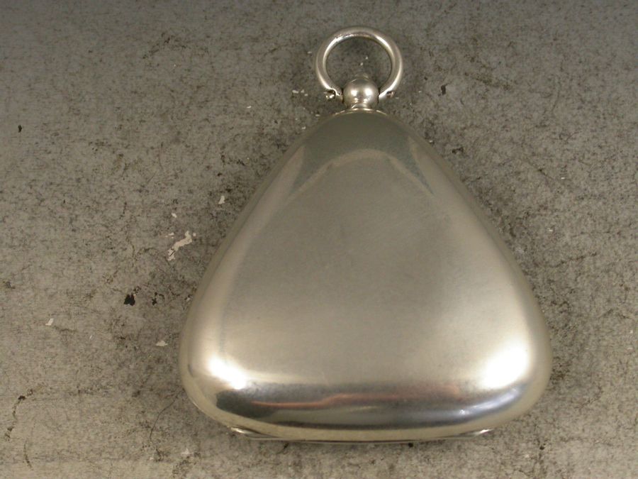 A rare Edwardian plain silver Sovereign Case of rounded triangular form, containing three circular sprung compartments for full sovereigns, push button sprung opening mechanism and attached suspension ring