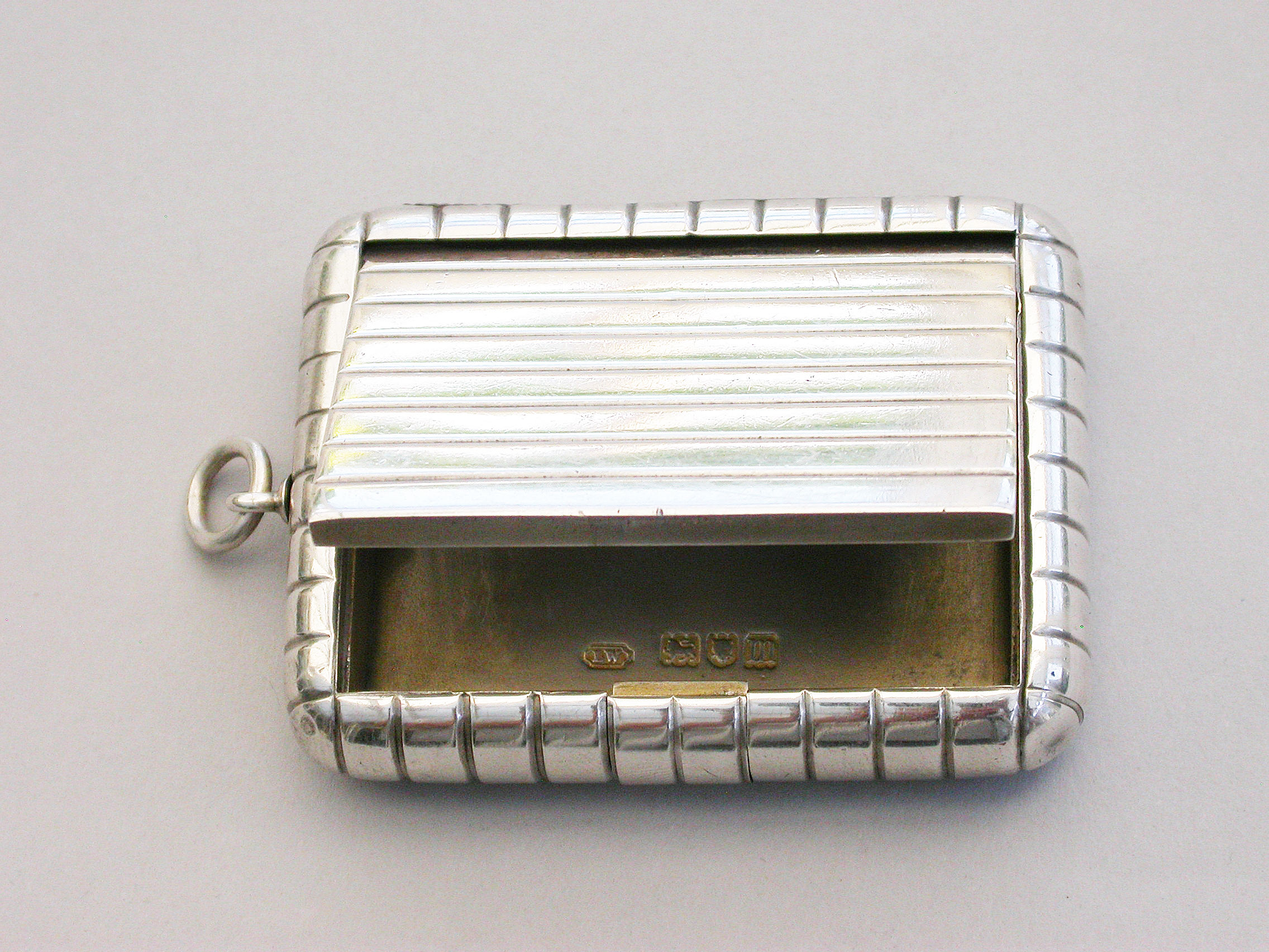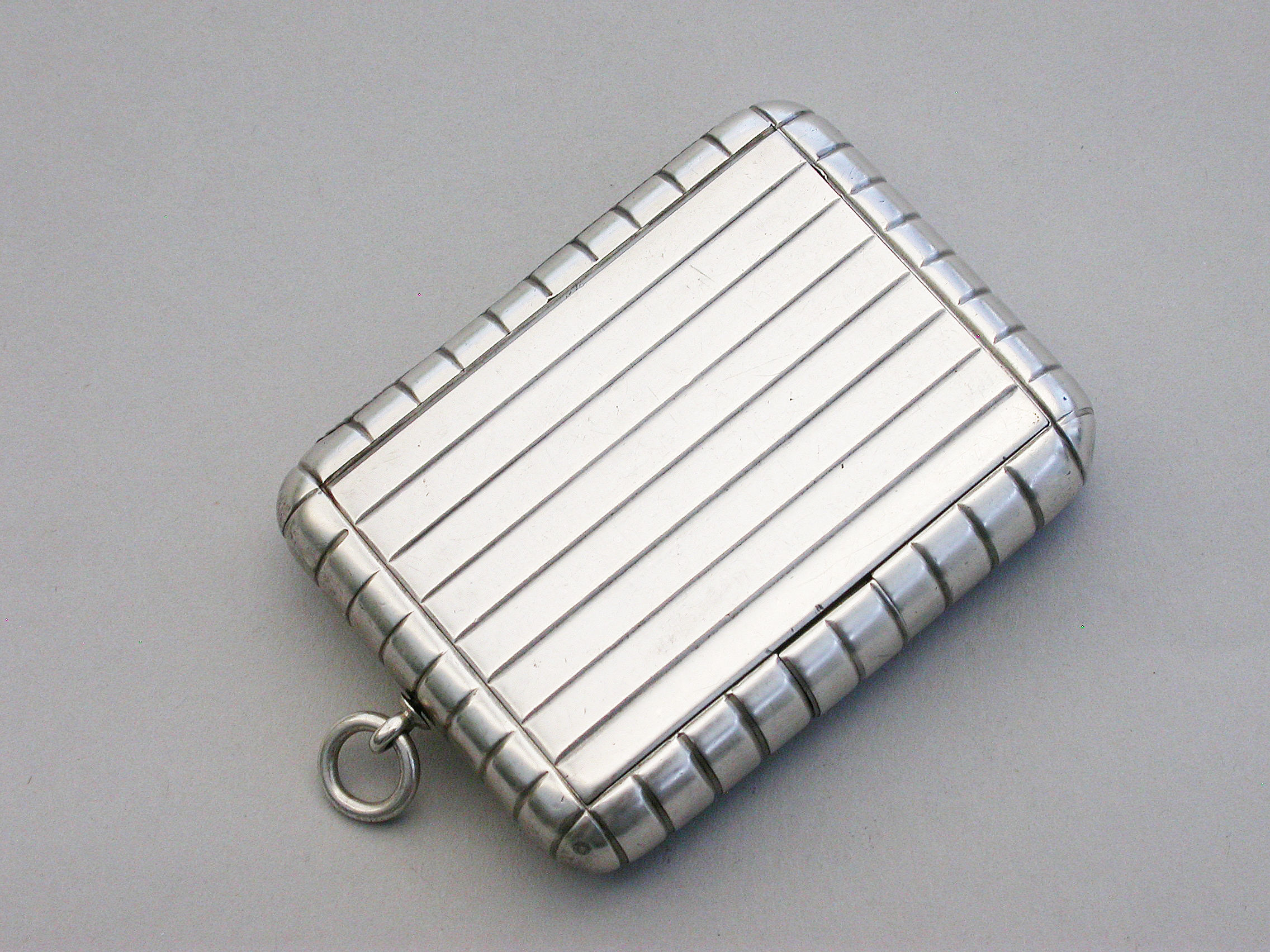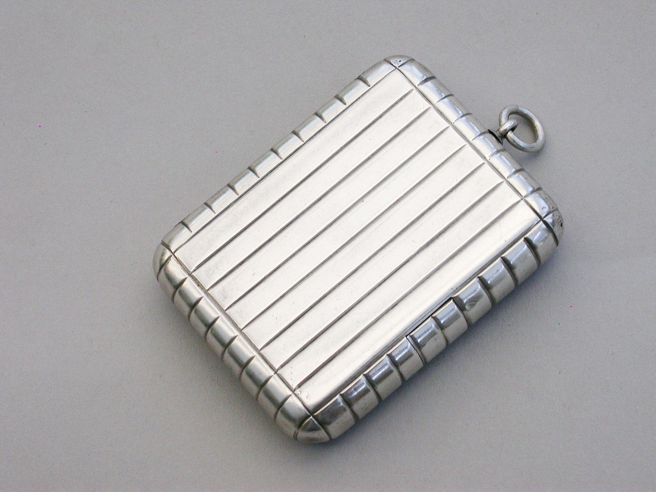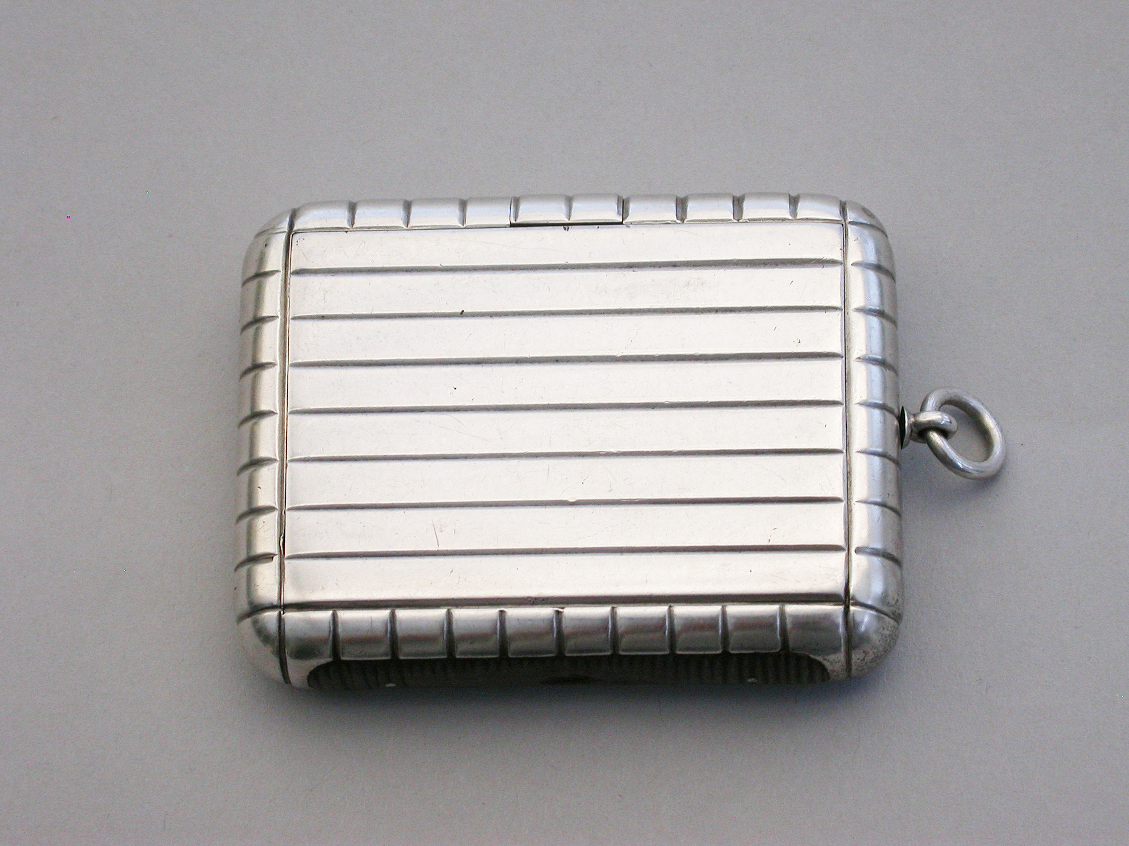 An unusual and good quality Edwardian silver Trick Opening Vesta Case, of plain rounded rectangular form with ribbed decoration and attached suspension ring. Initial inspection reveals no obvious opening device but there is a concealed sliding section to the middle of one side which pushes the lid partly open and reveals the interior. A metal striker to the opposite side.