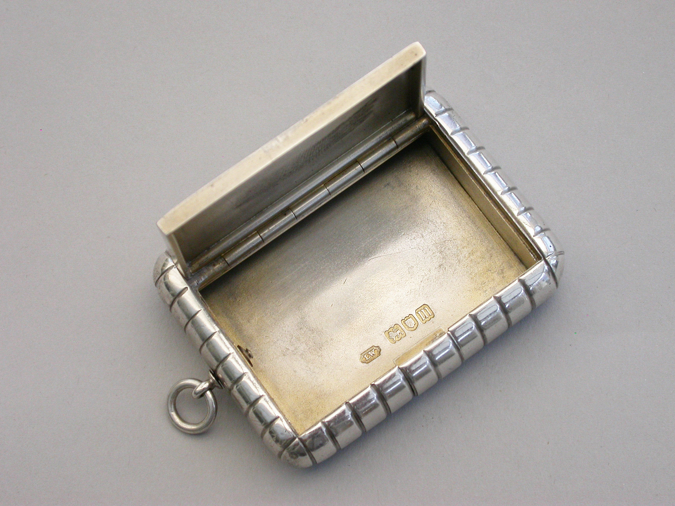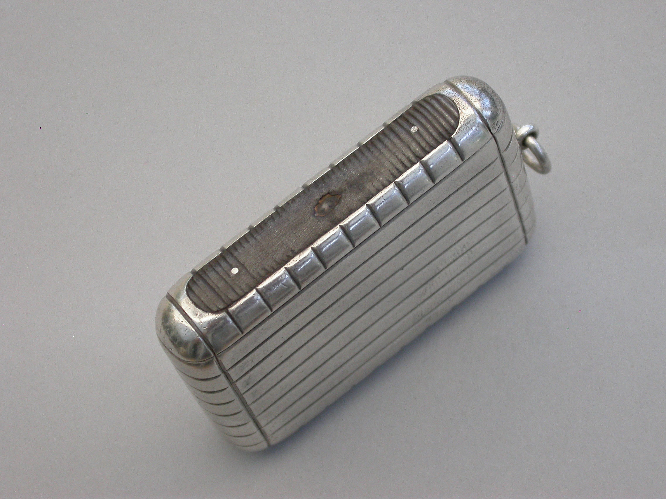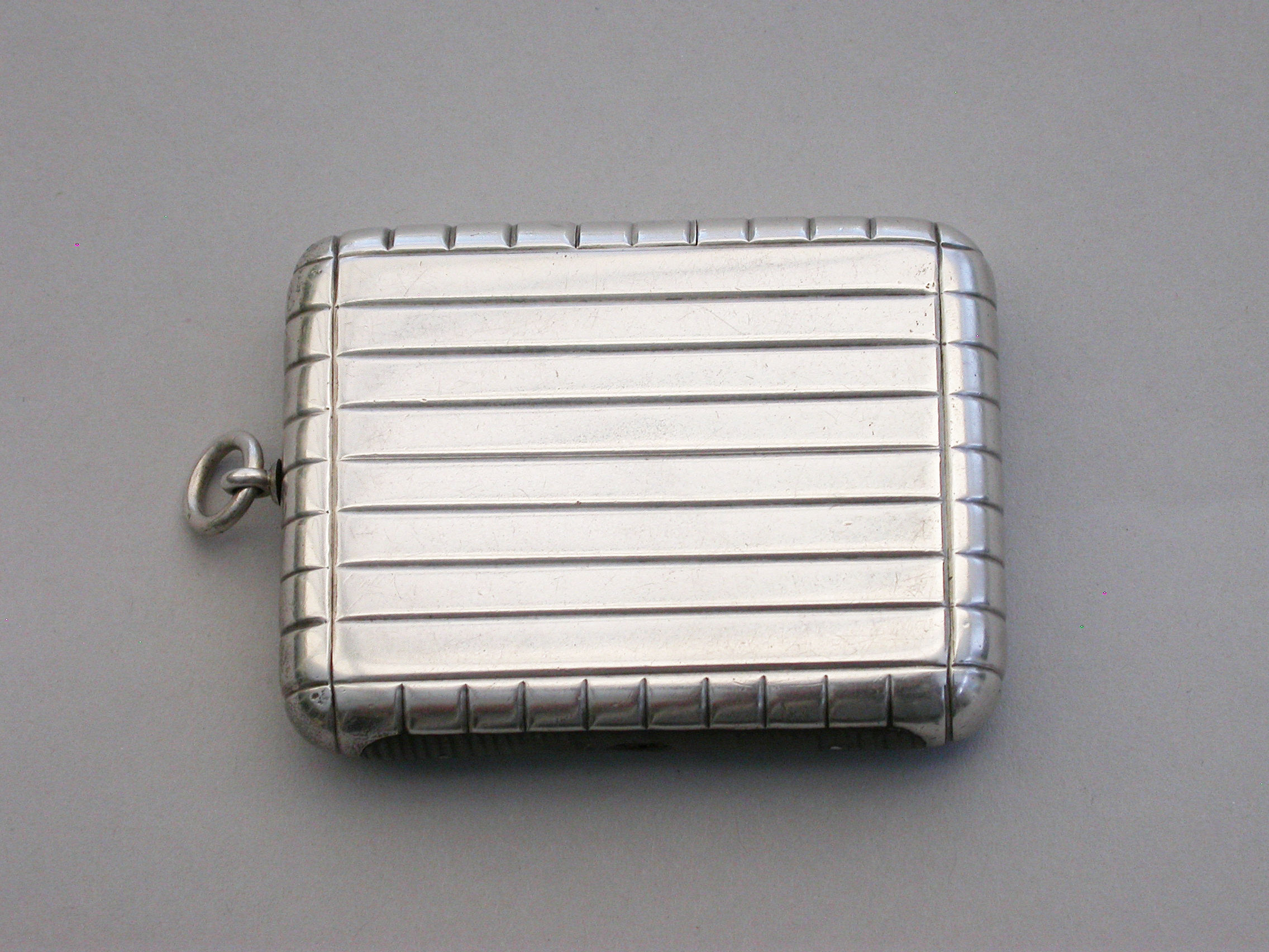 An unusual and good quality Edwardian silver Trick Opening Vesta Case, of plain rounded rectangular form with ribbed decoration and attached suspension ring. Initial inspection reveals no obvious opening device but there is a concealed sliding section to the middle of one side which pushes the lid partly open and reveals the interior. A metal striker to the opposite side.