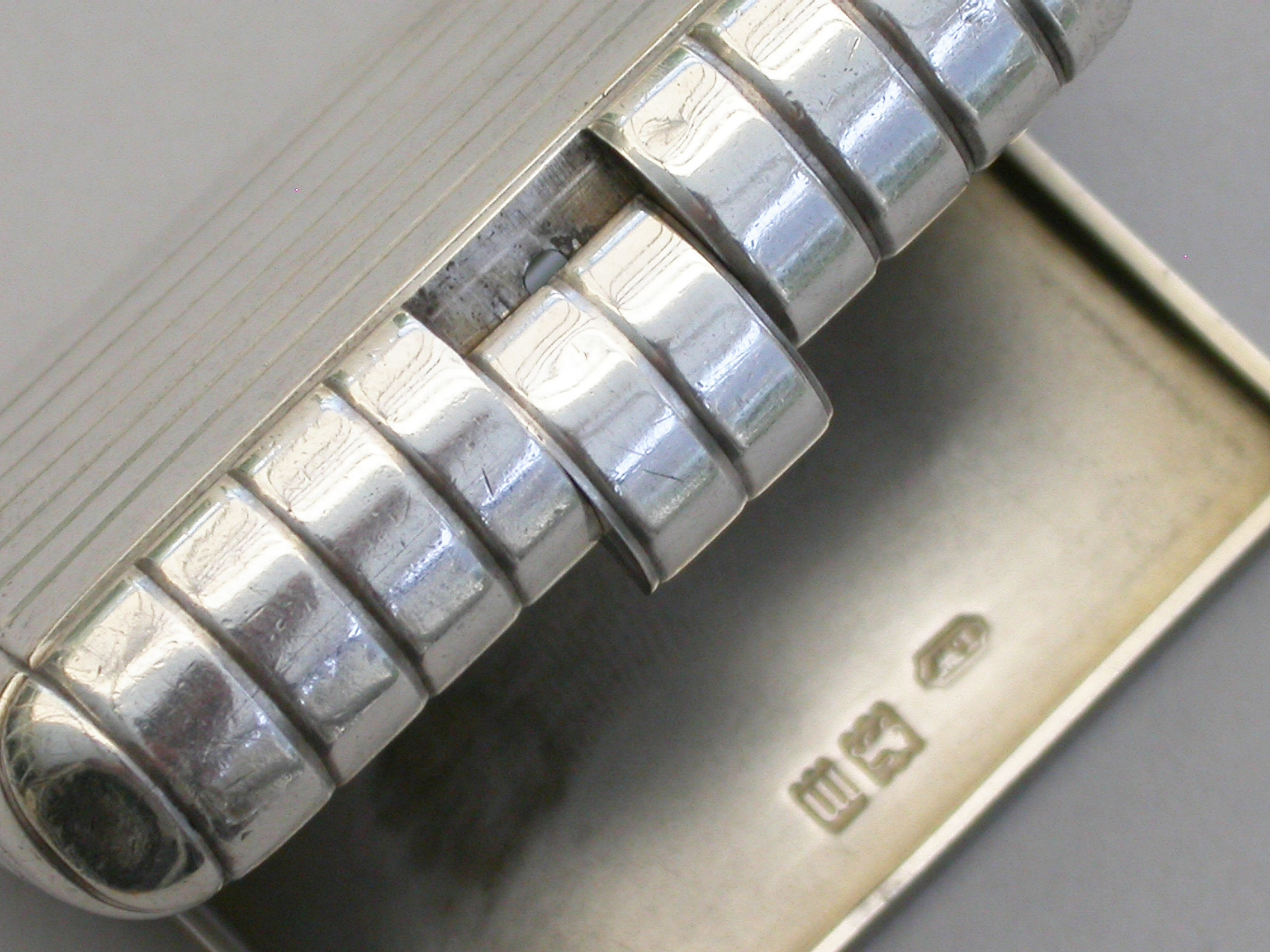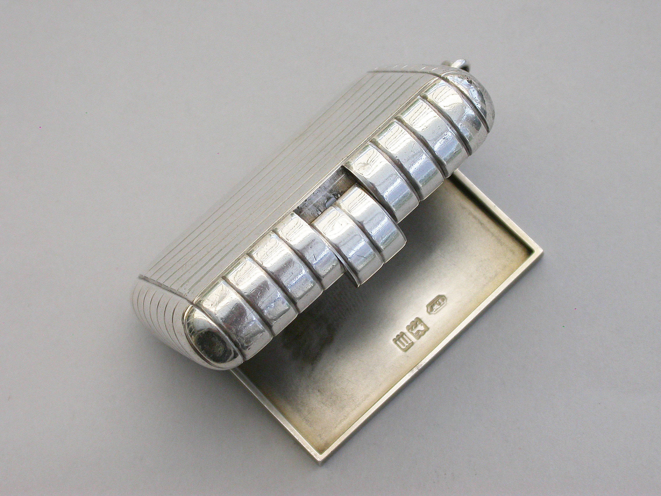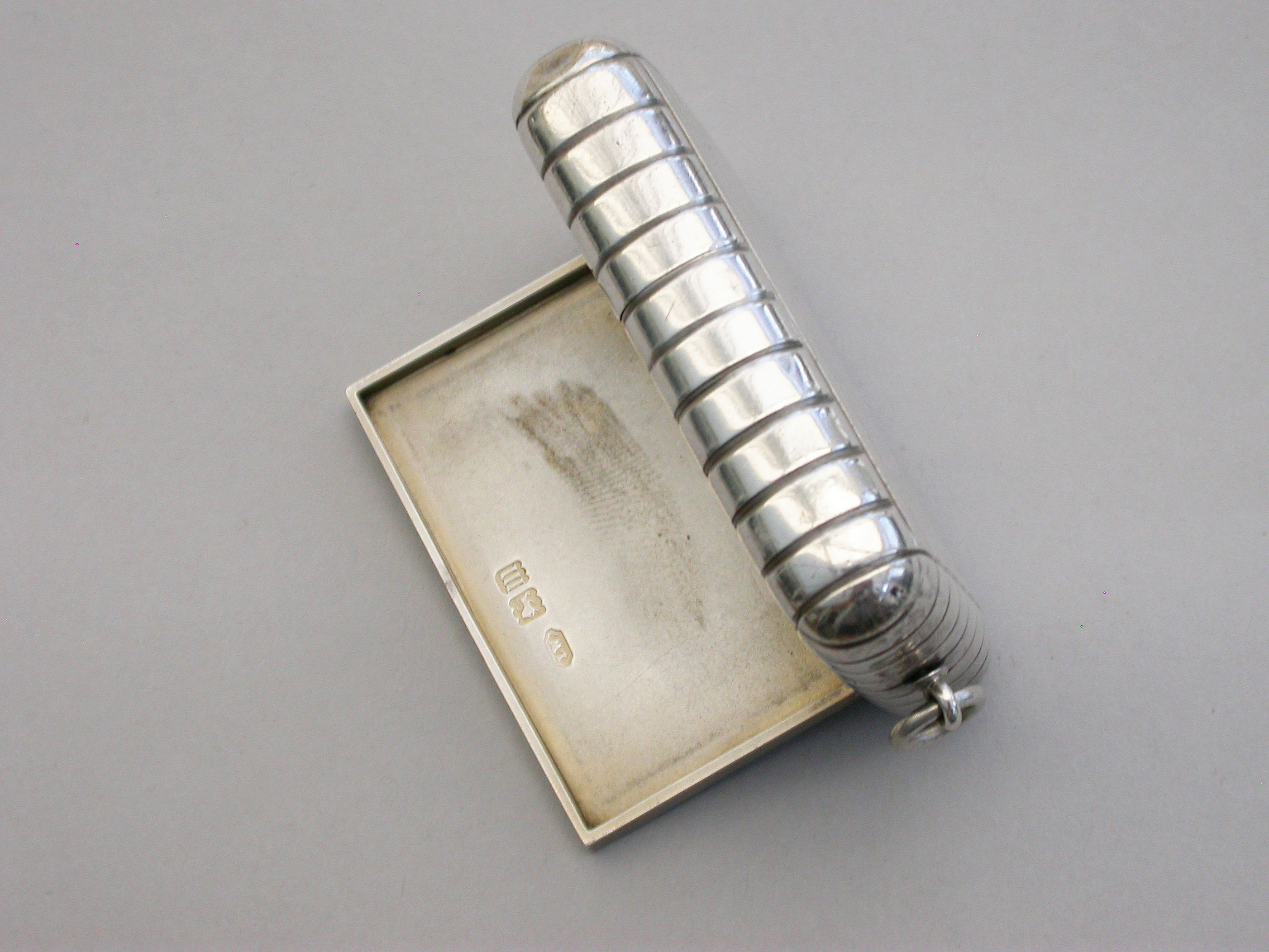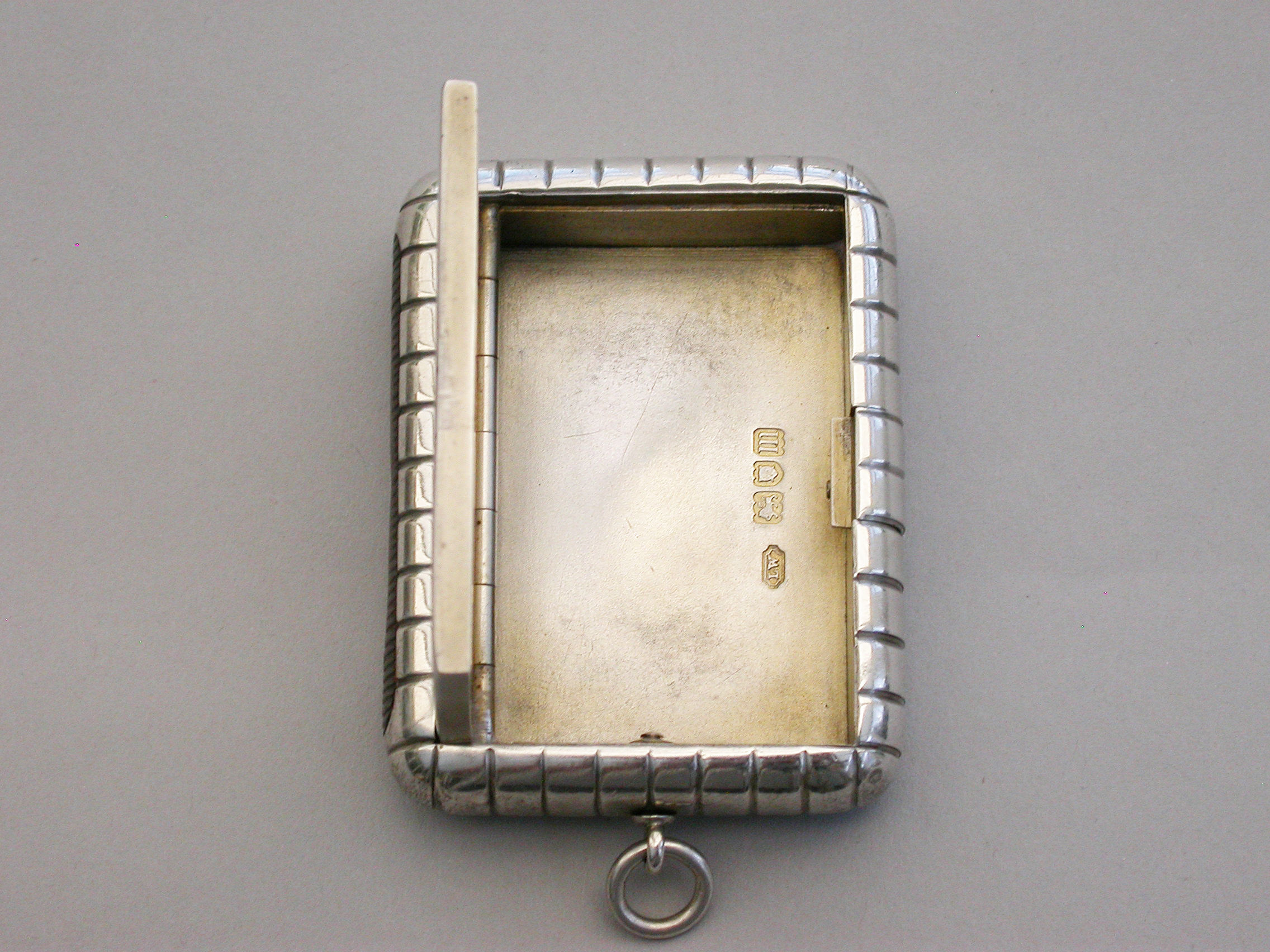 An unusual and good quality Edwardian silver Trick Opening Vesta Case, of plain rounded rectangular form with ribbed decoration and attached suspension ring. Initial inspection reveals no obvious opening device but there is a concealed sliding section to the middle of one side which pushes the lid partly open and reveals the interior. A metal striker to the opposite side.
